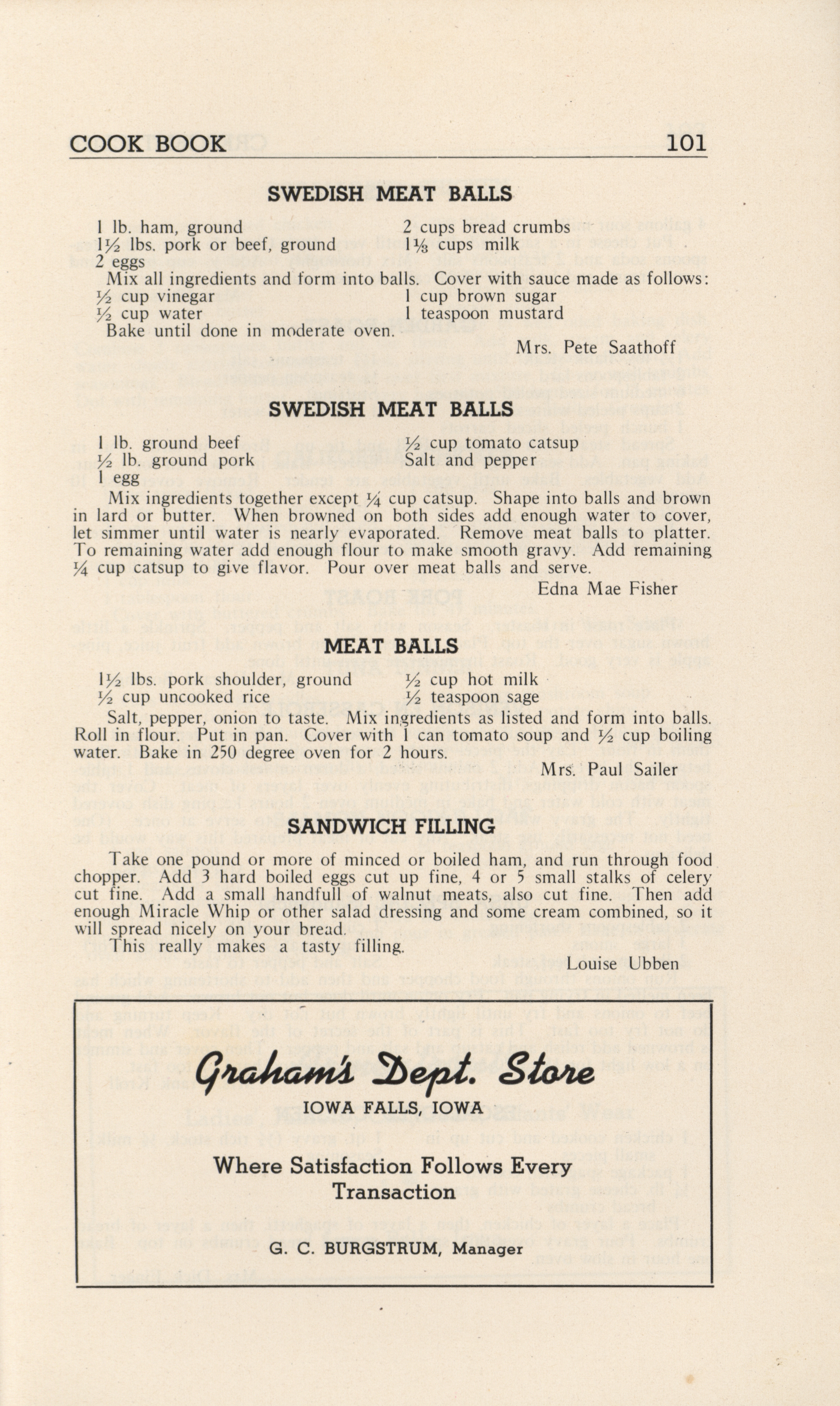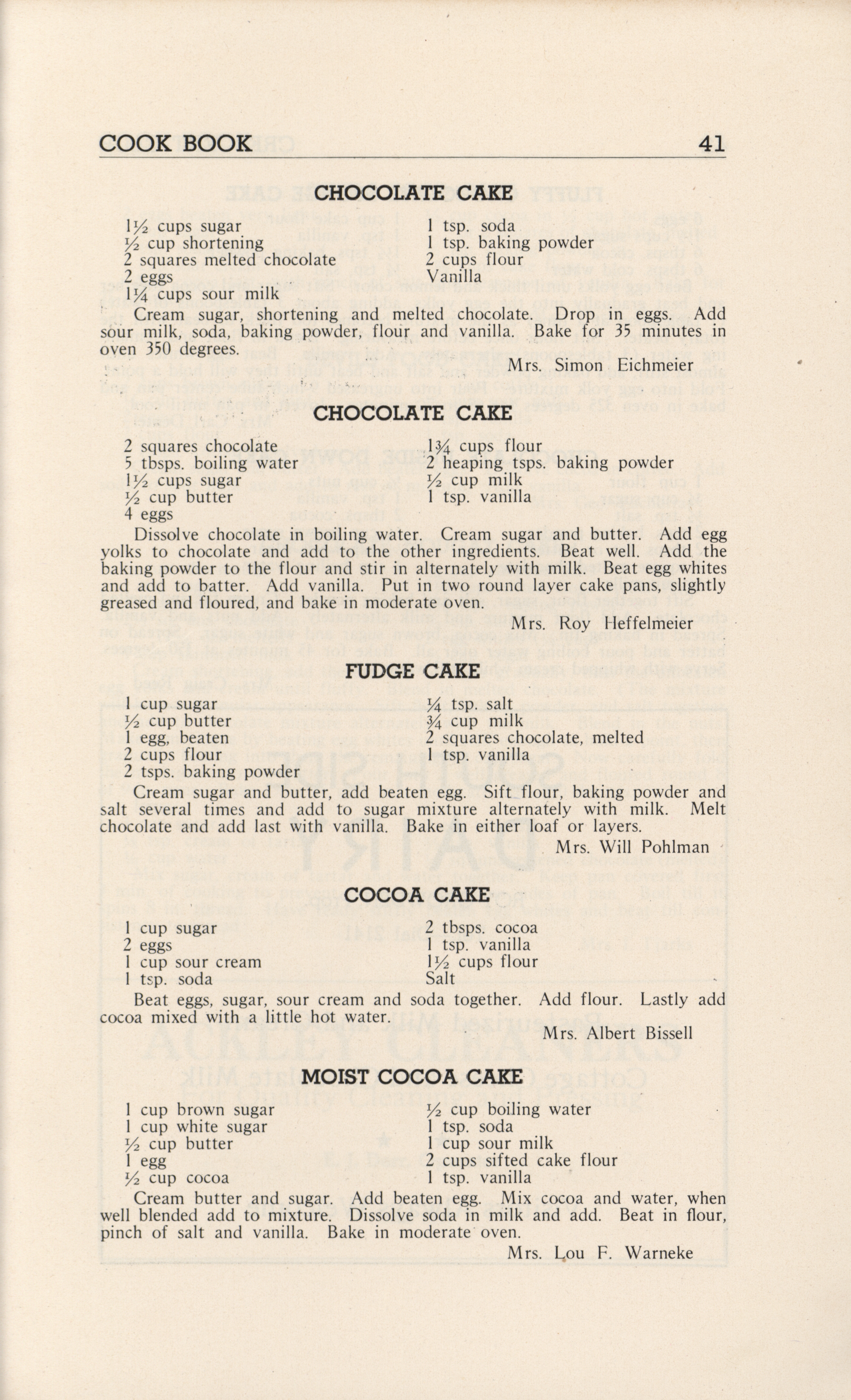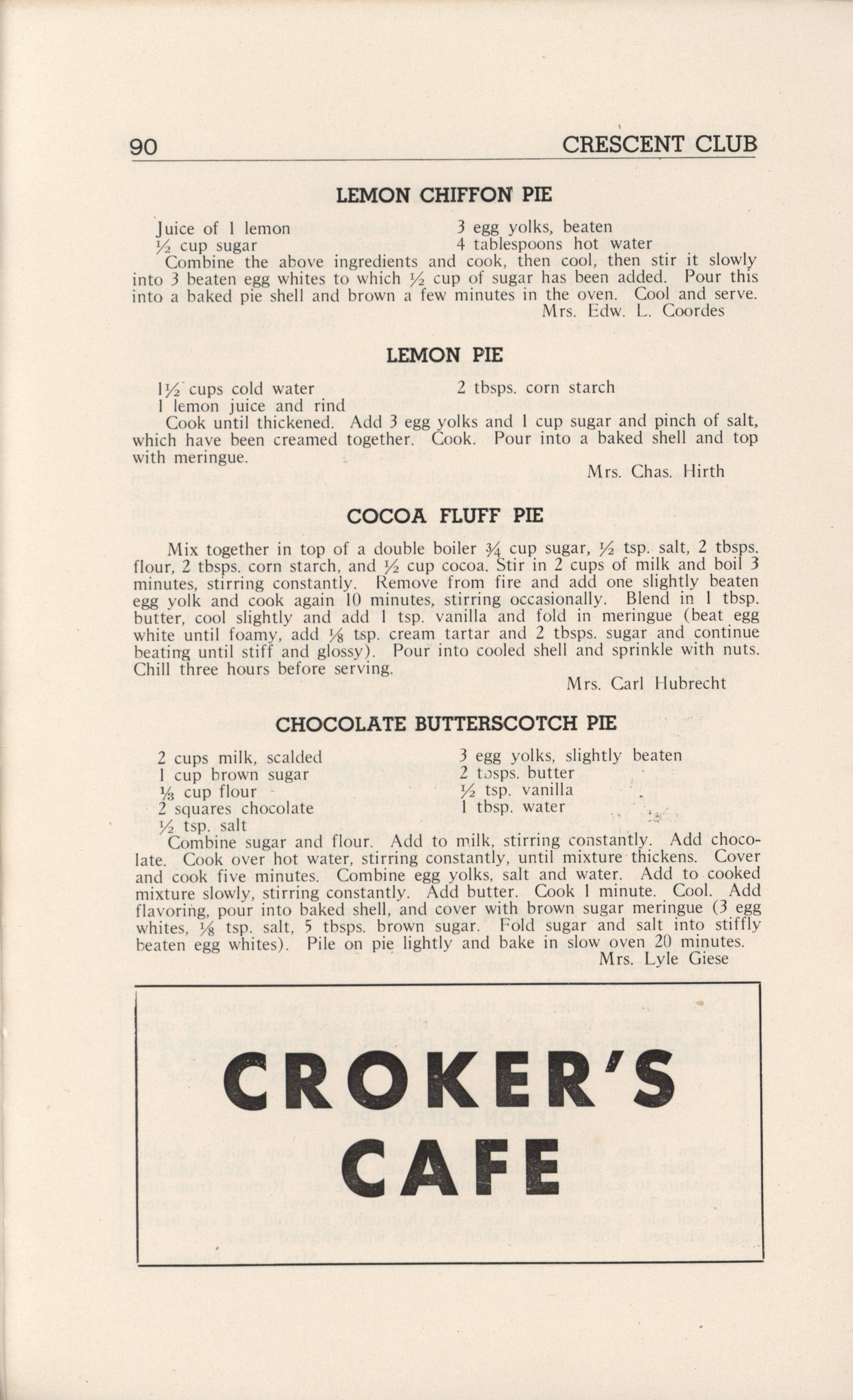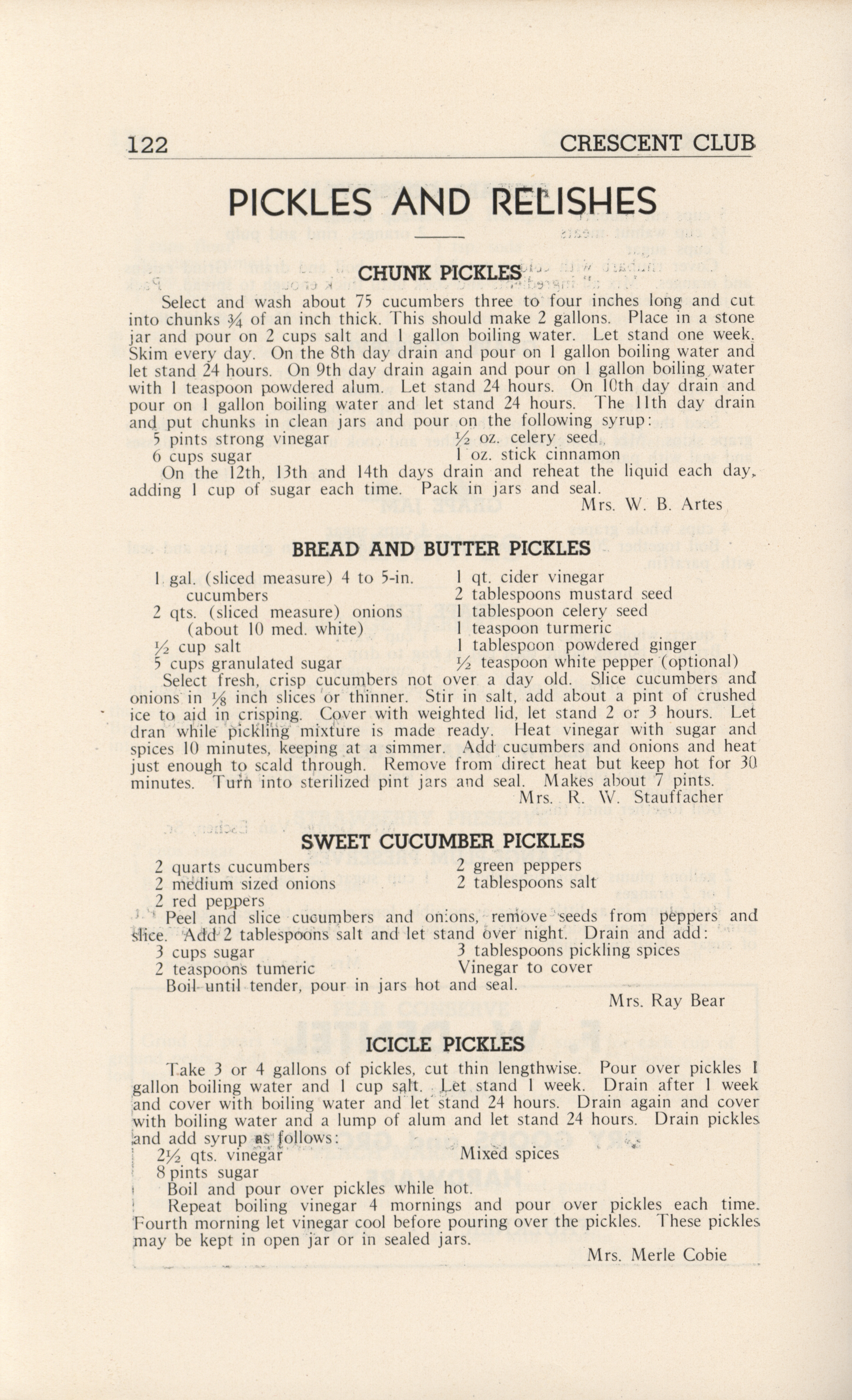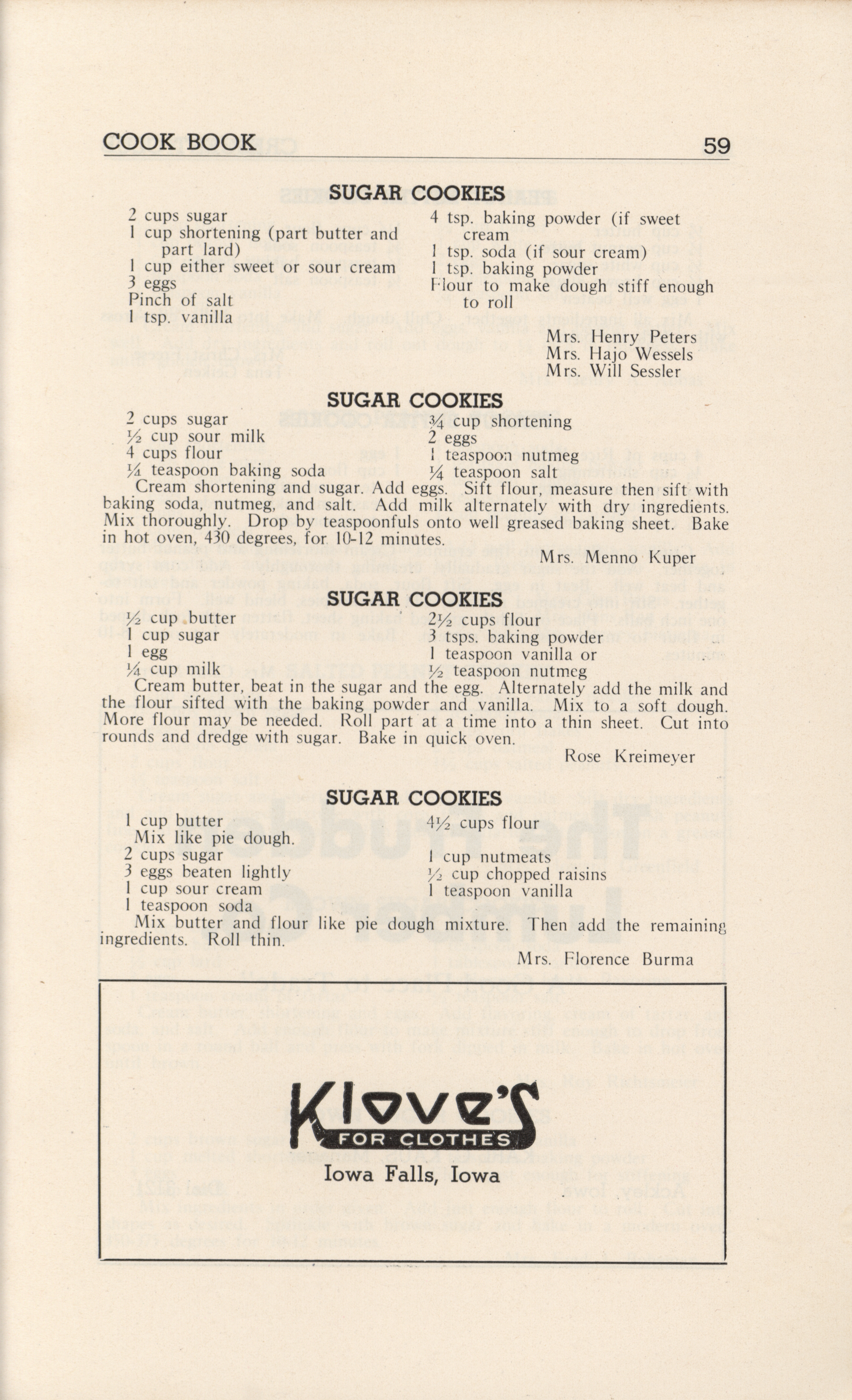 - A community cookbook compiled in 1946 by the Crescent Club of St. John’s Evangelical and Reformed Church in Ackley, Iowa. The book includes recipes contributed by club members and advertisements from local businesses.