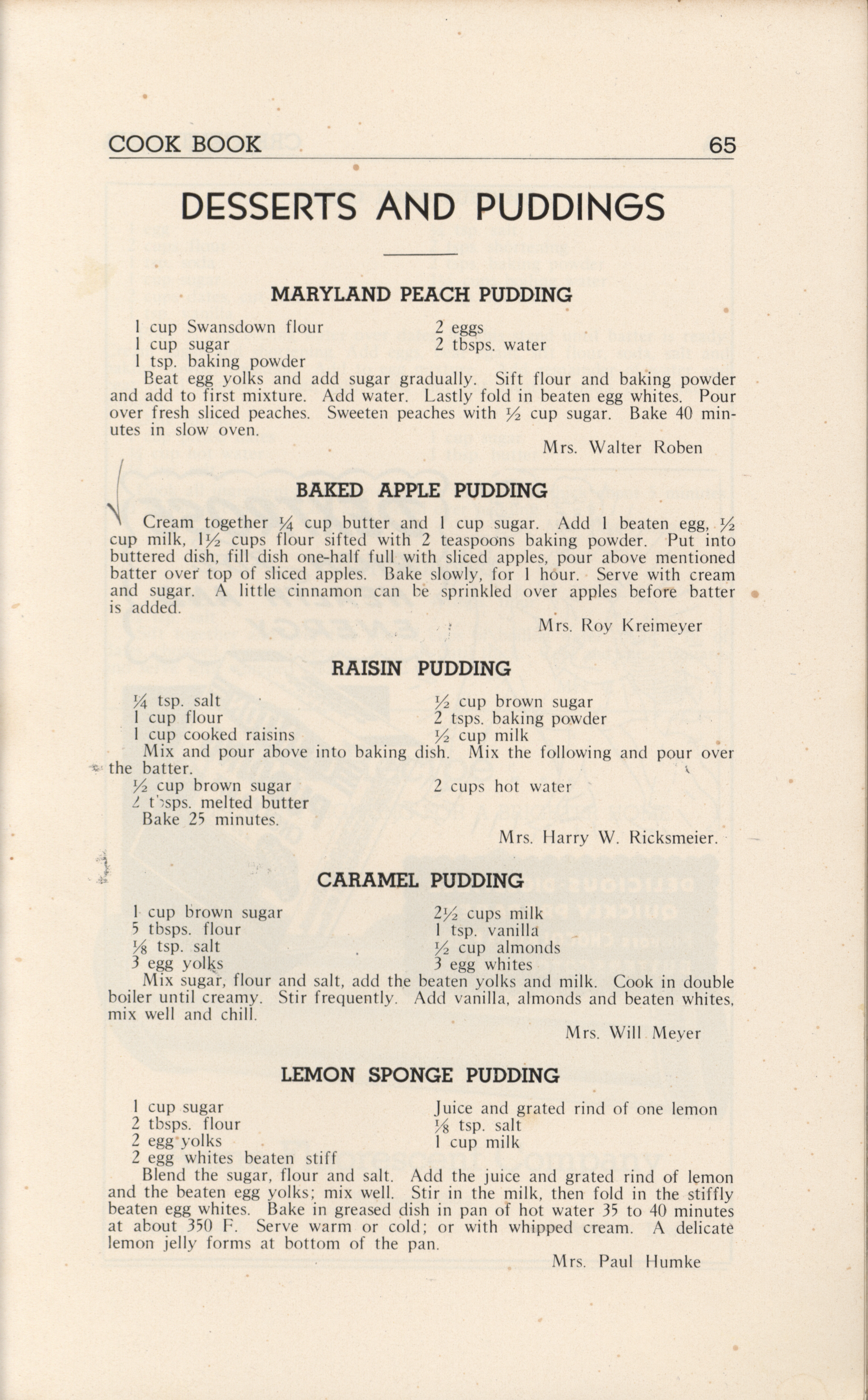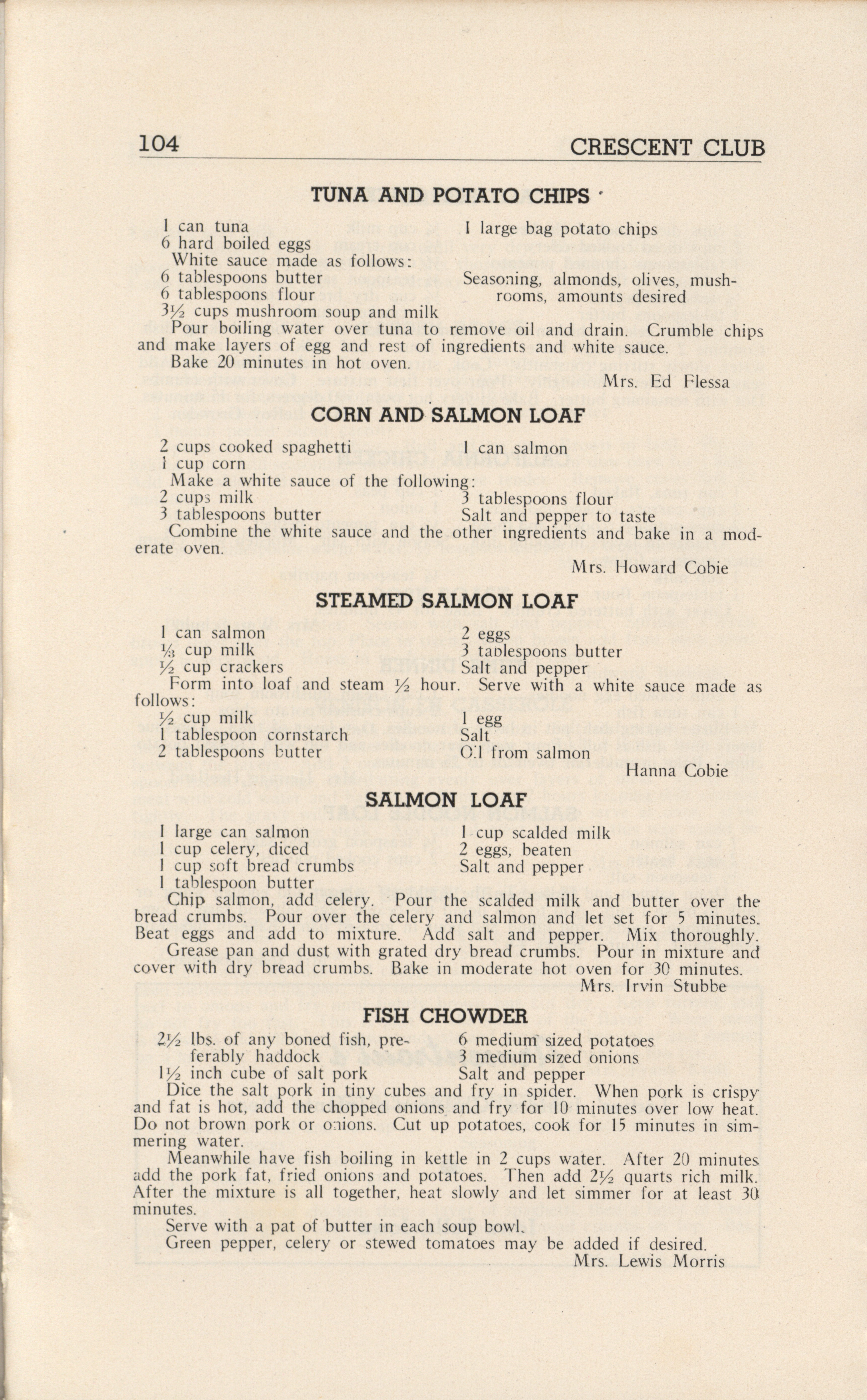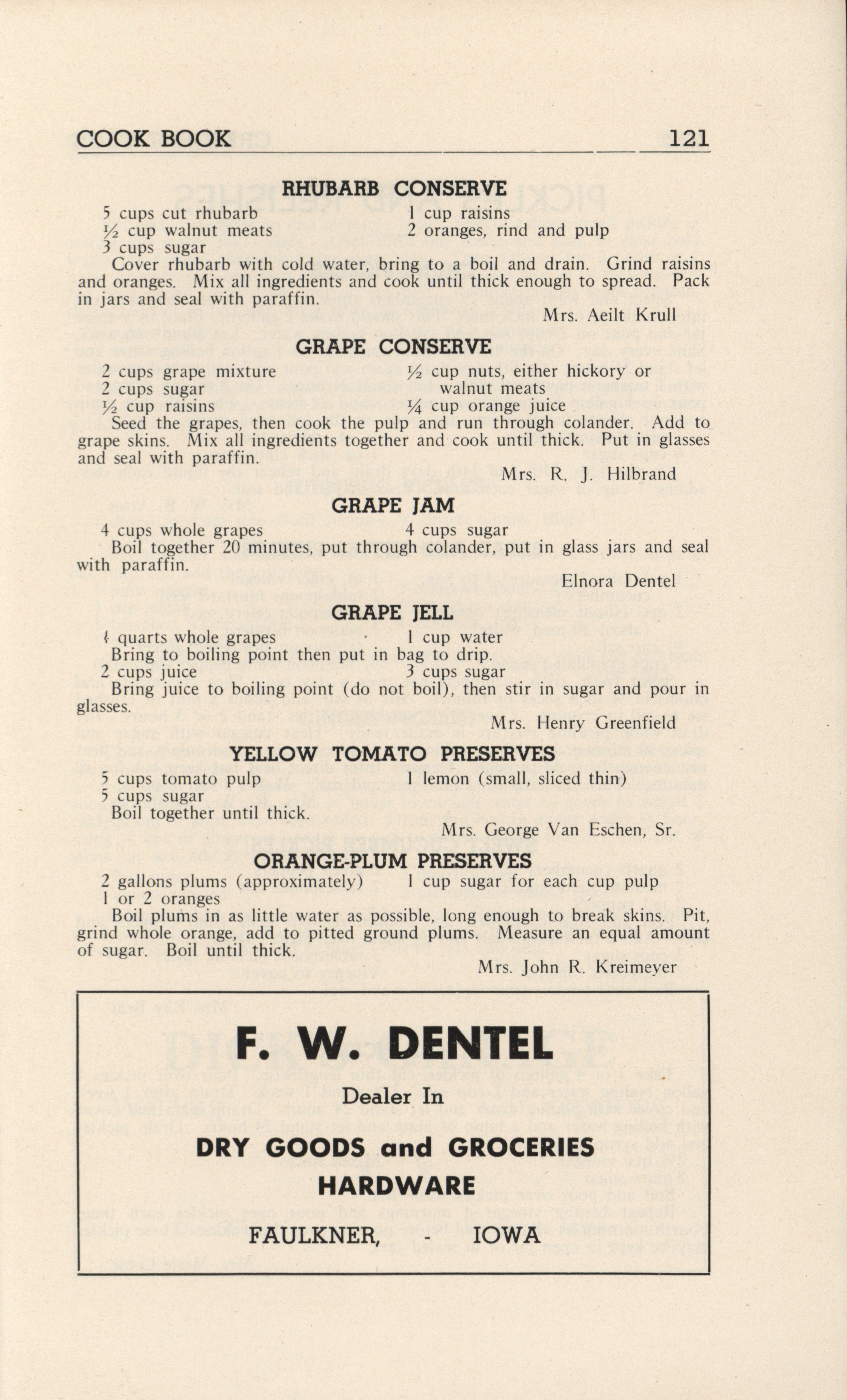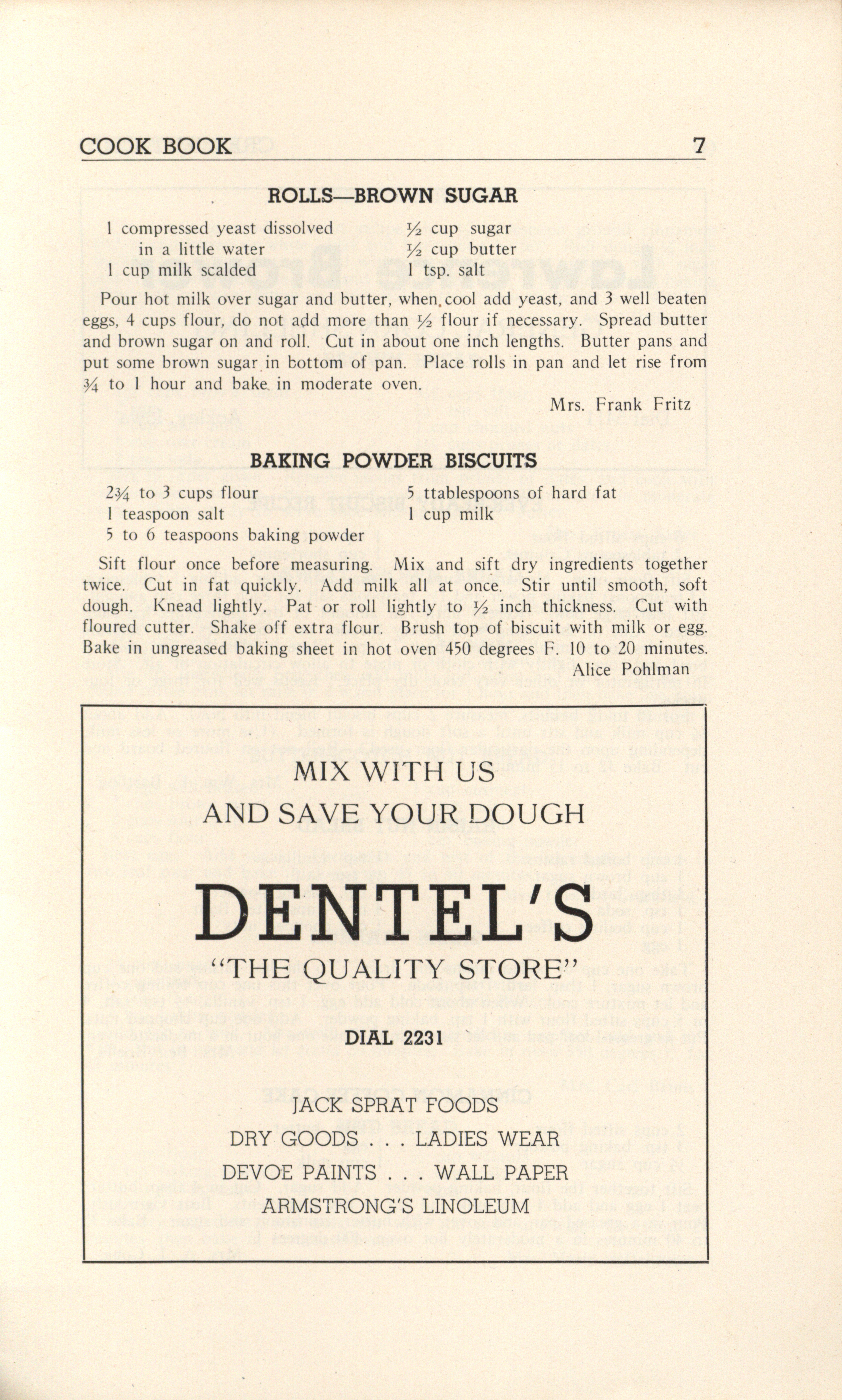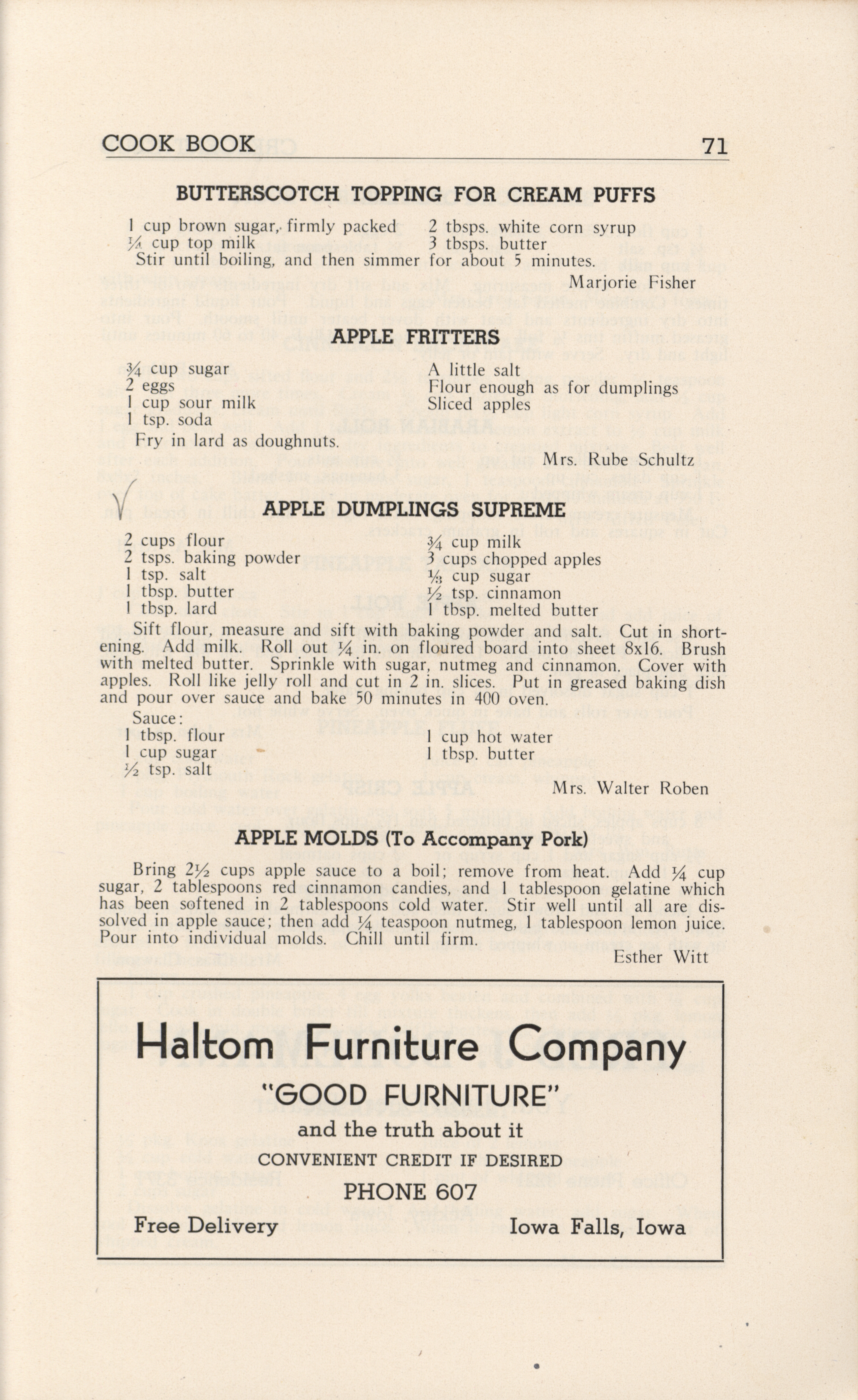 - A community cookbook compiled in 1946 by the Crescent Club of St. John’s Evangelical and Reformed Church in Ackley, Iowa. The book includes recipes contributed by club members and advertisements from local businesses.