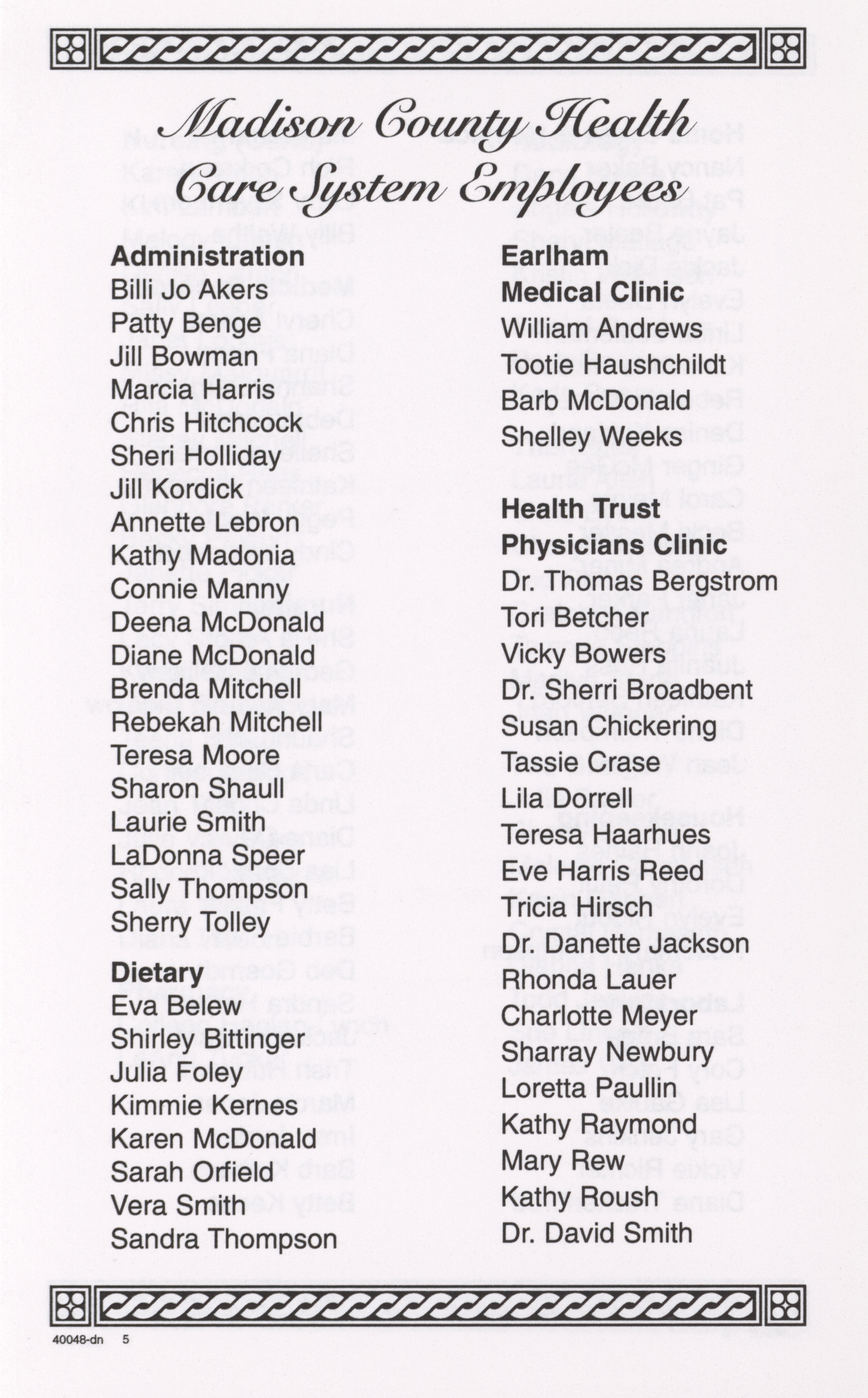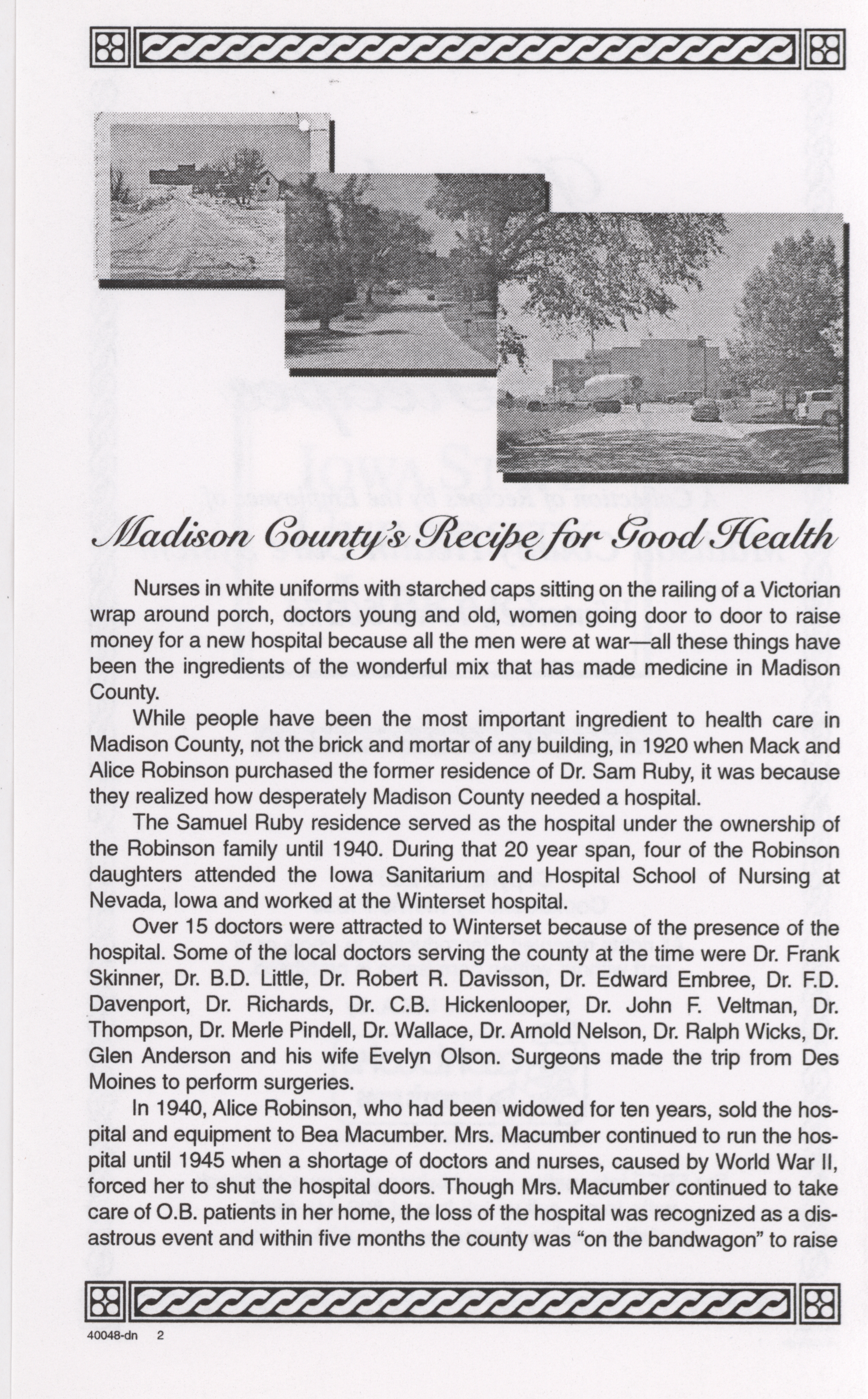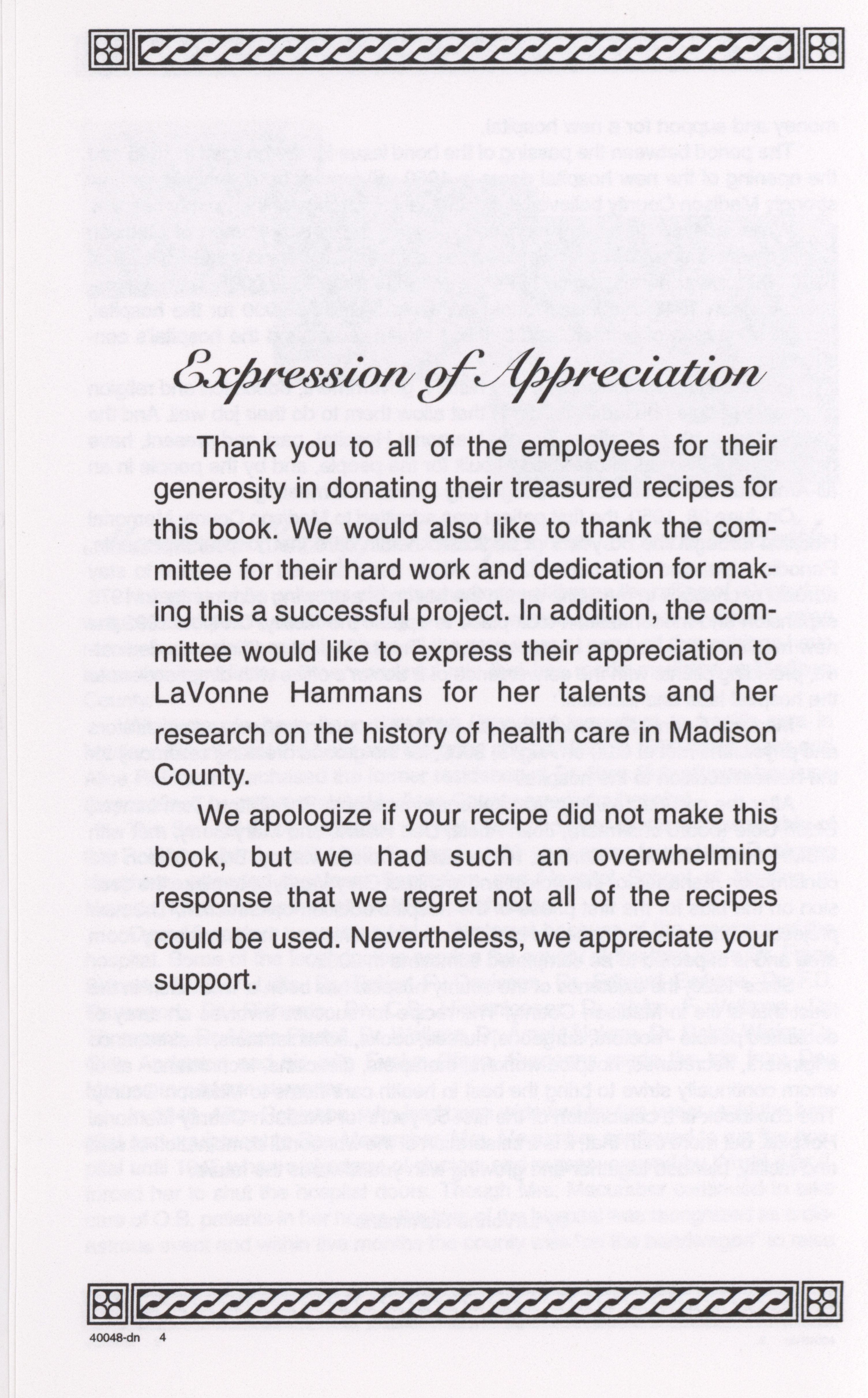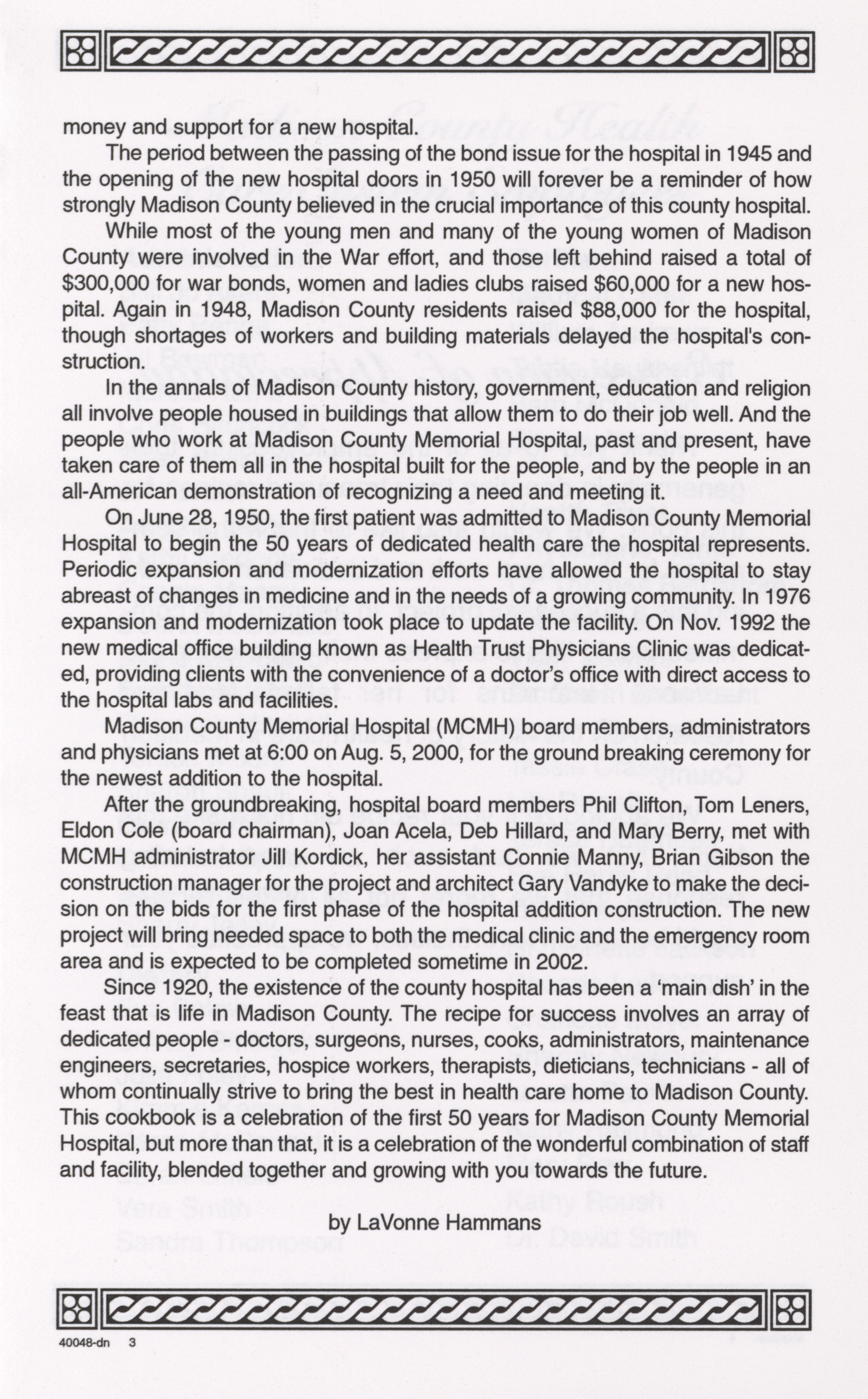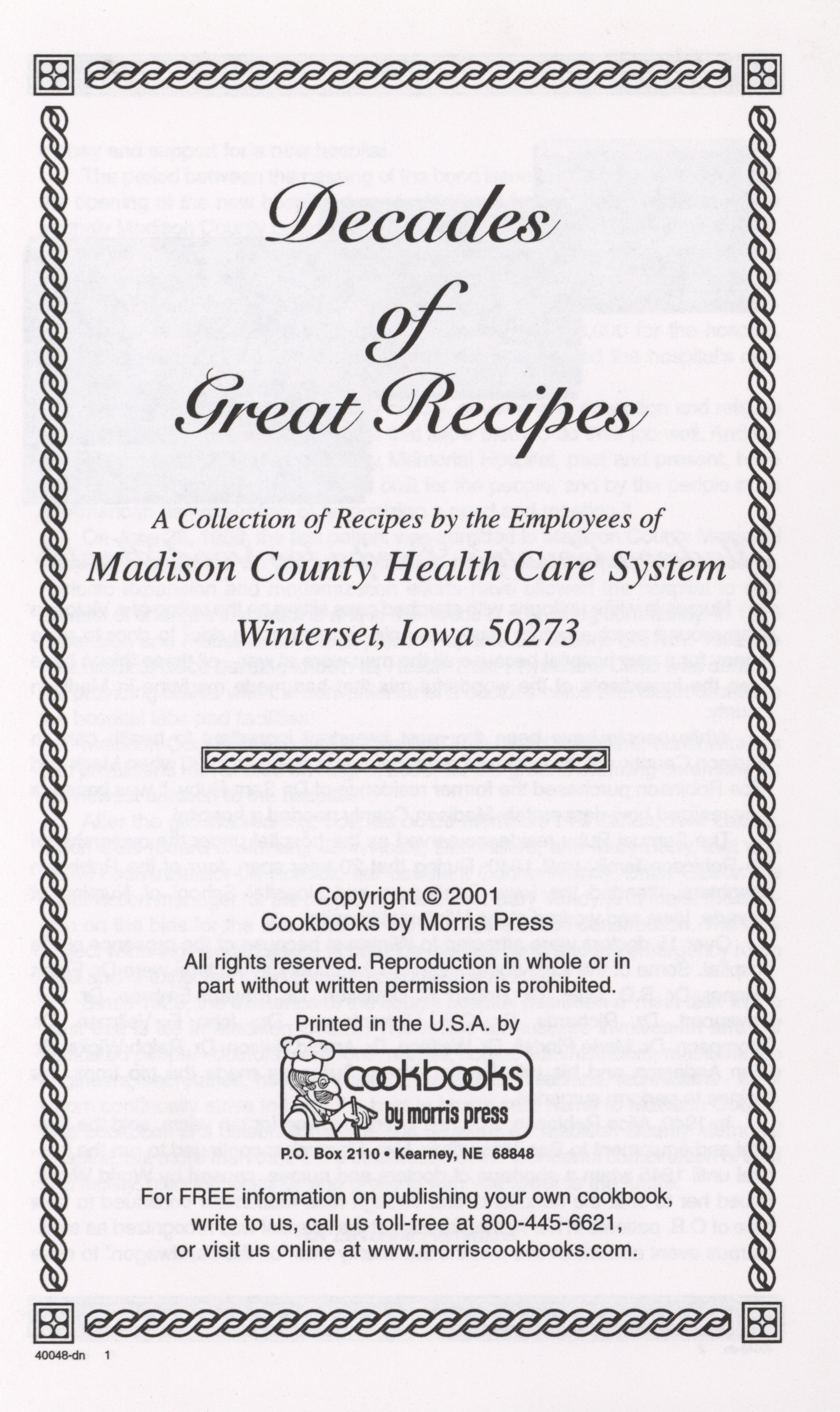 - This cookbook compiled by the Madison County Health Care System includes a history of the Madison County Memorial Hospital and household tips.