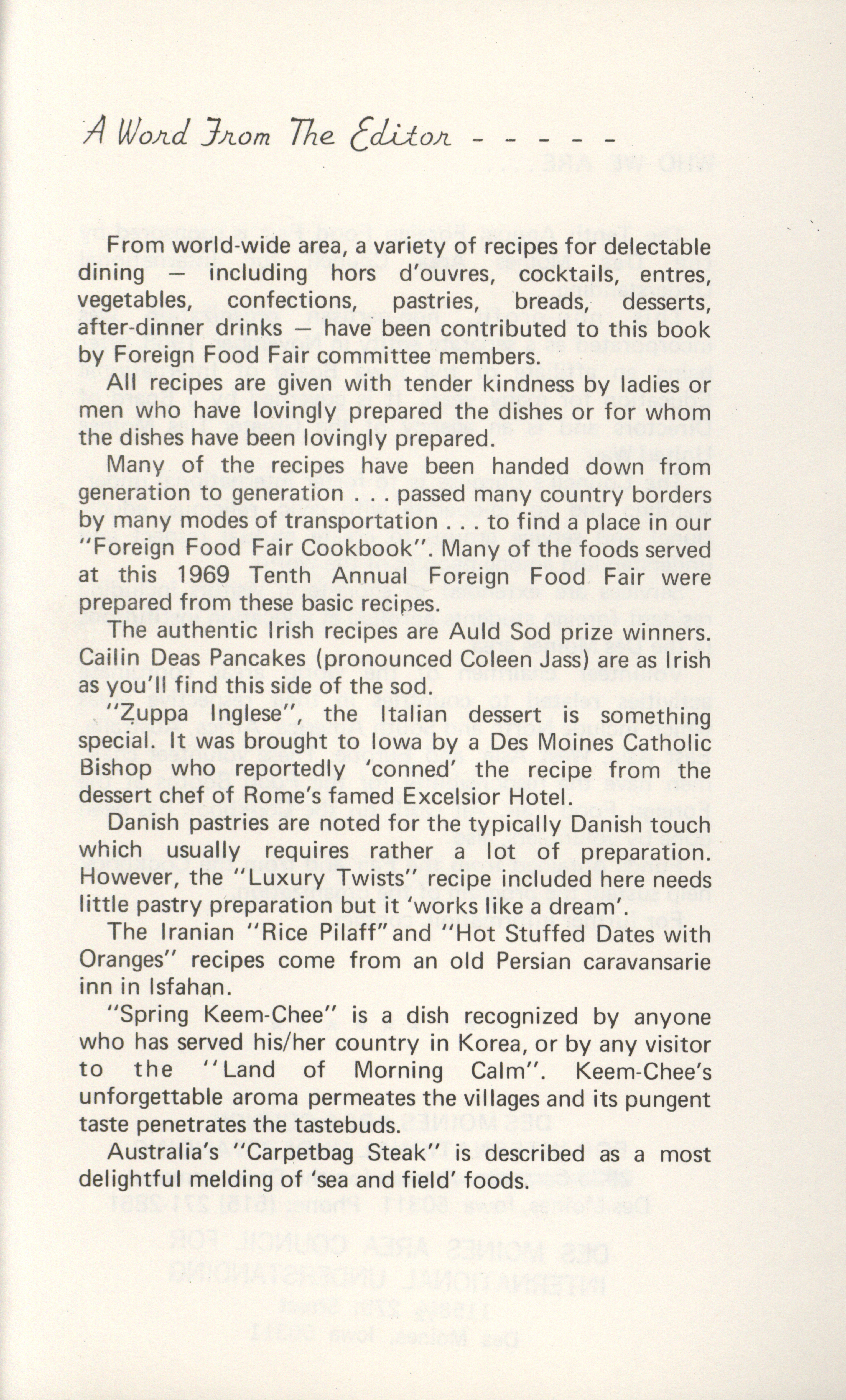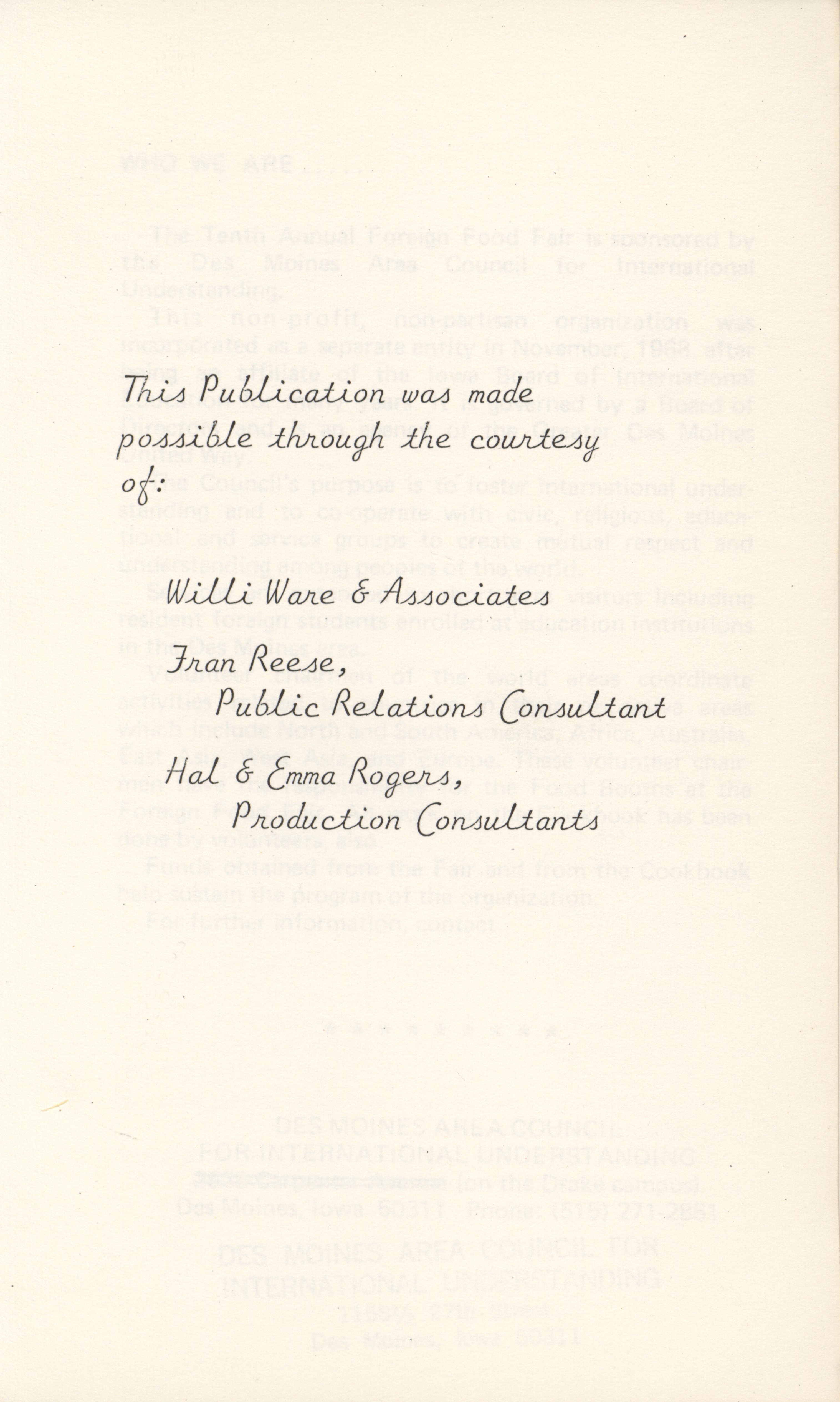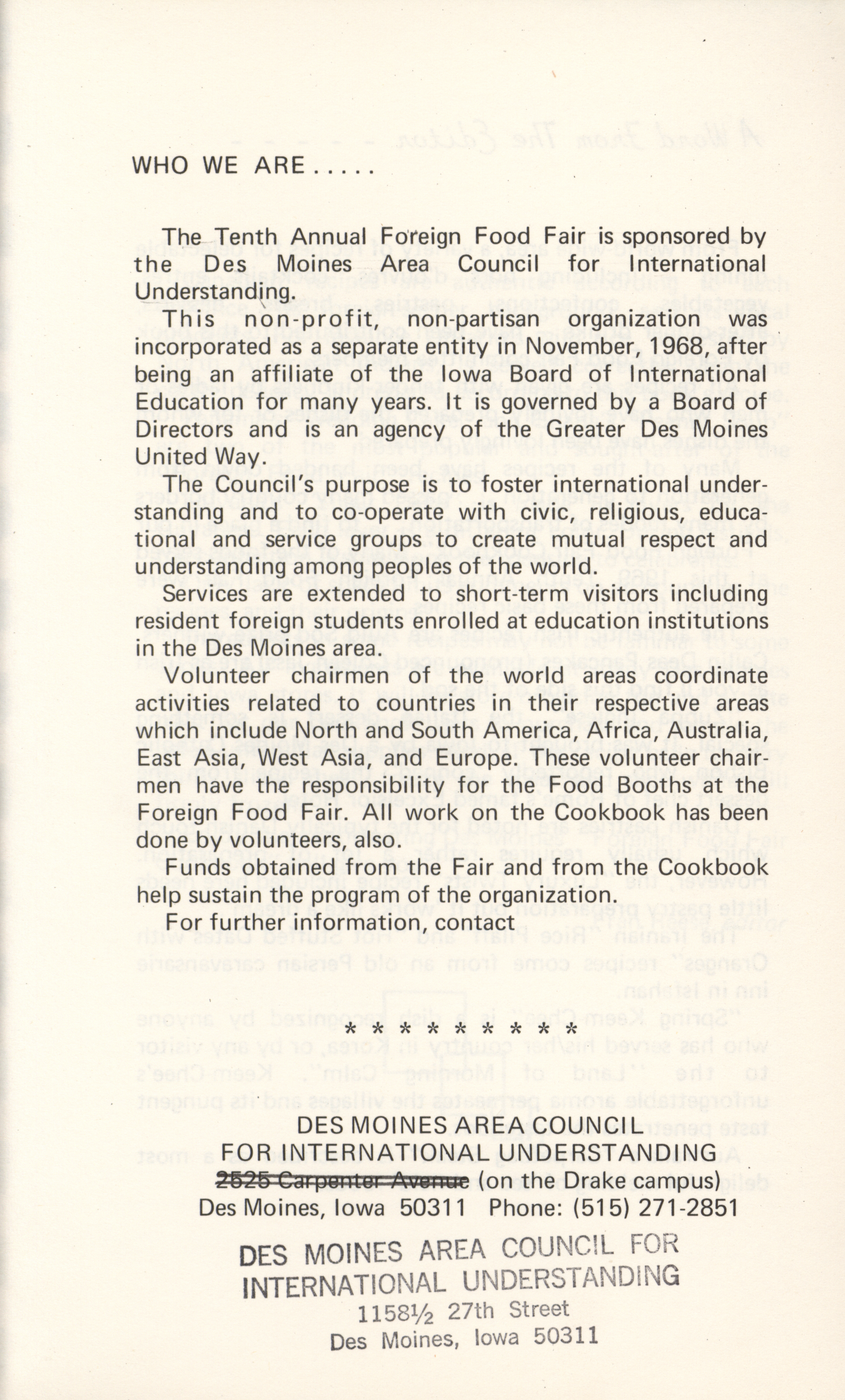 - This cookbook compiled by the Des Moines Area Council for International Understanding includes a history of the organization.