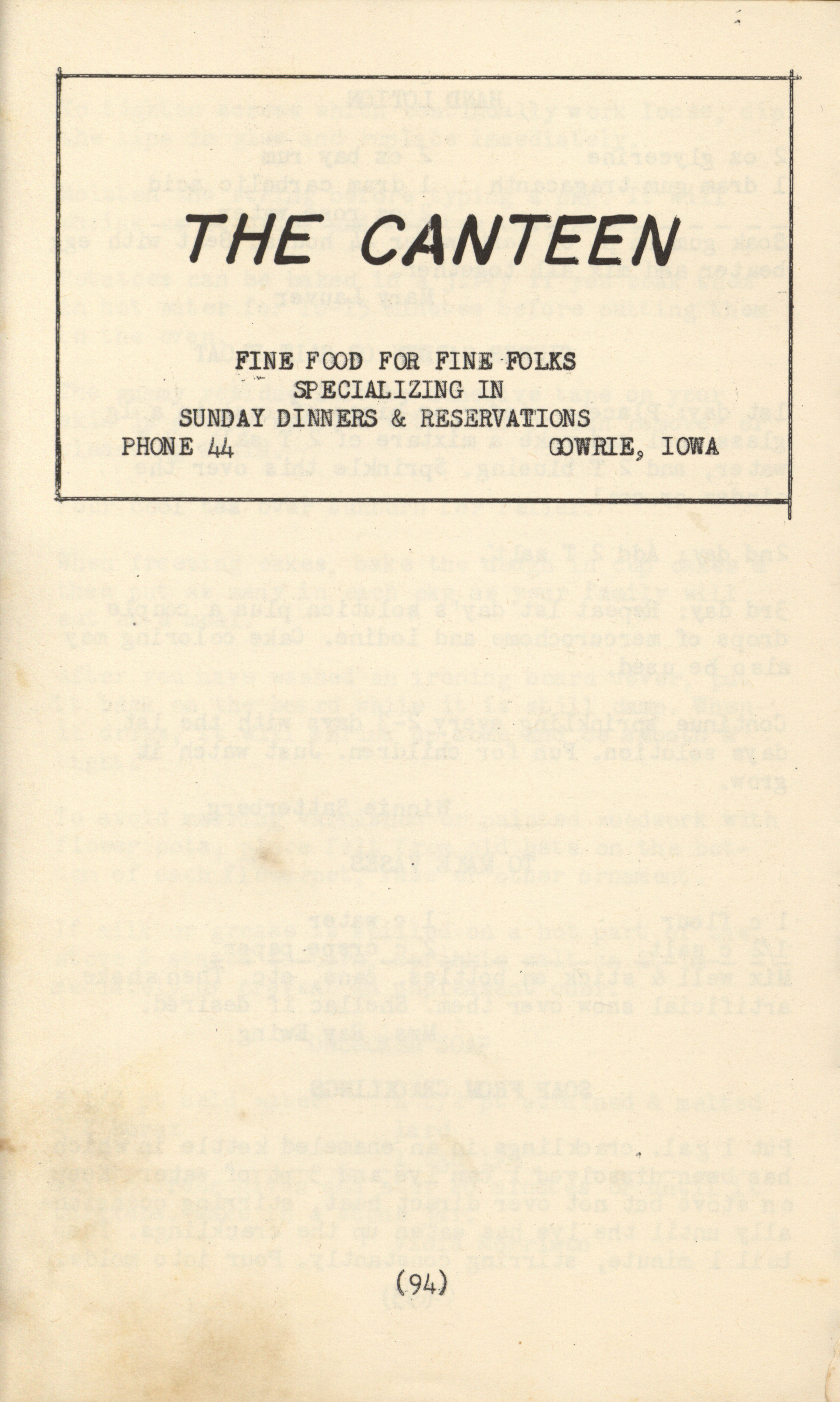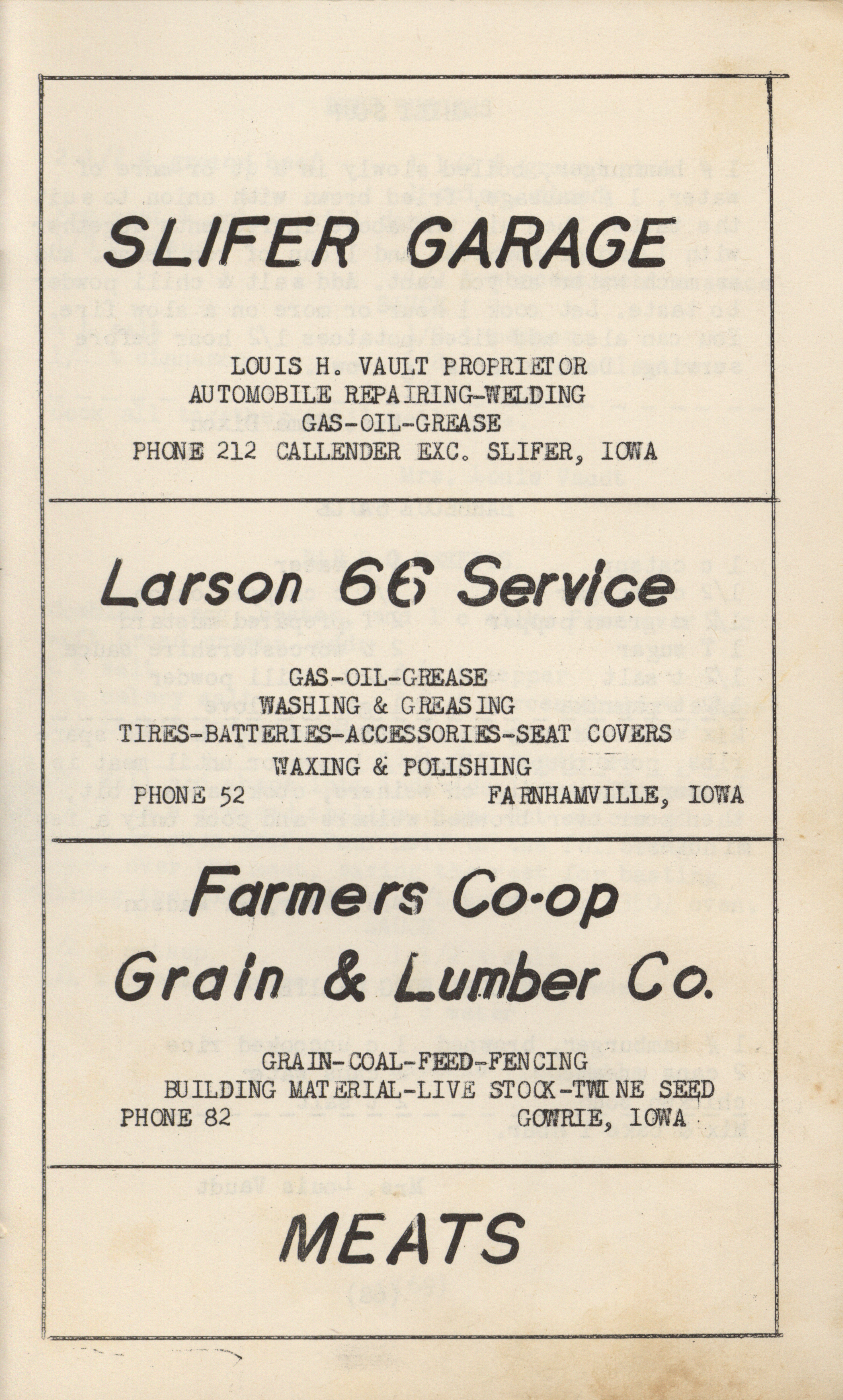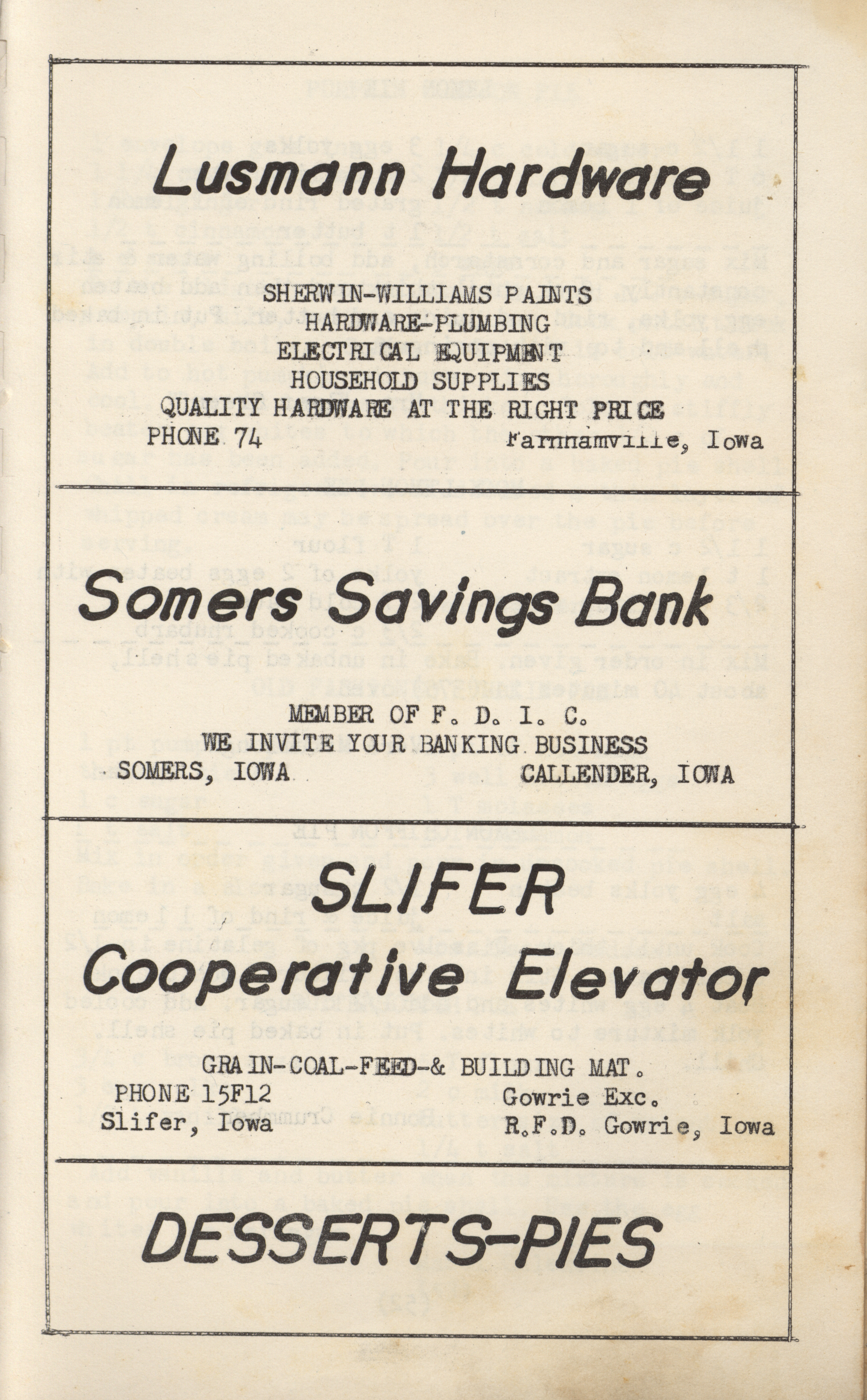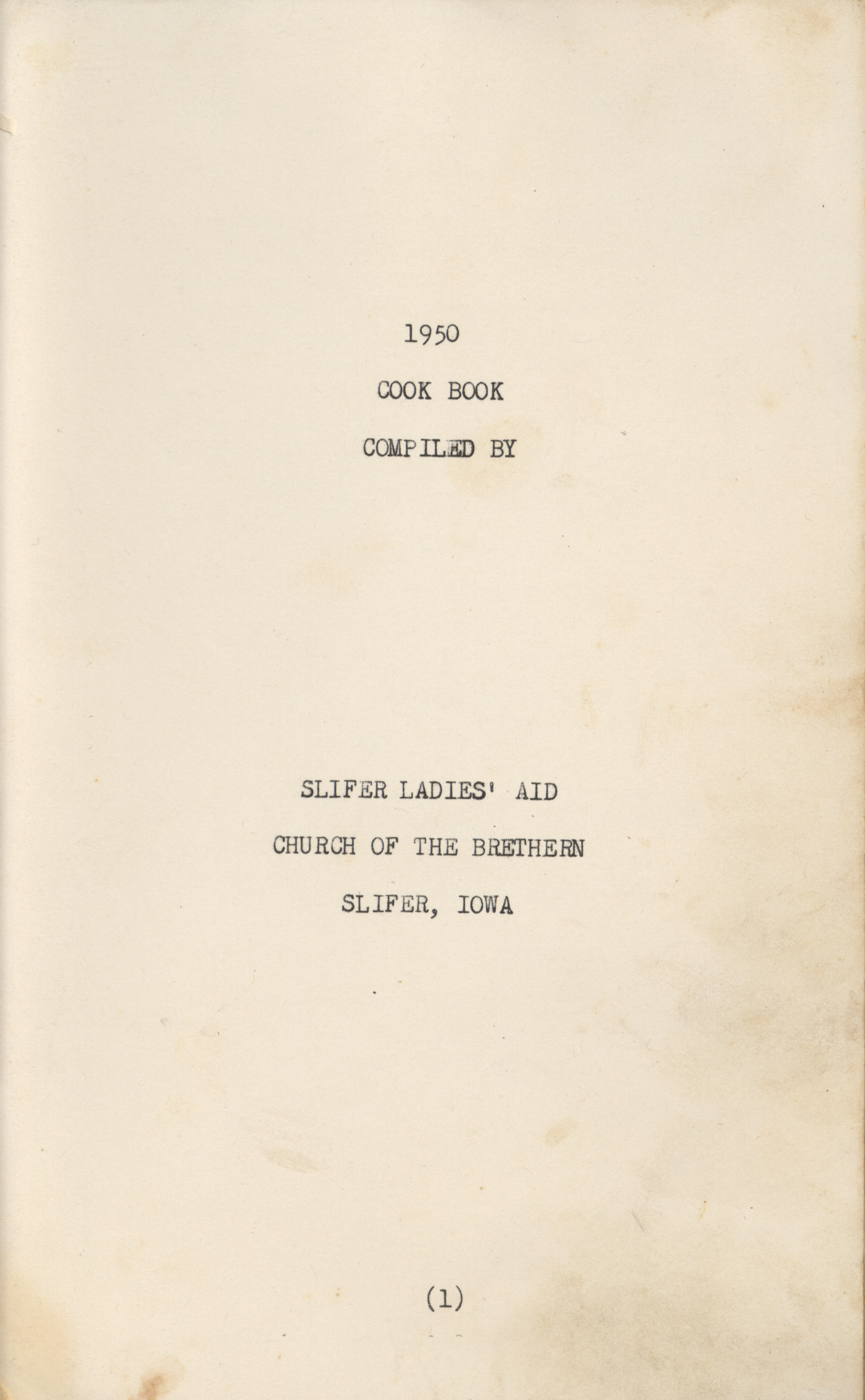 - A community cookbook compiled in 1950 by the Slifer Ladies’ Aid of the Church of the Brethren in Slifer, Iowa. Includes recipes contributed by local women and community advertisements.
