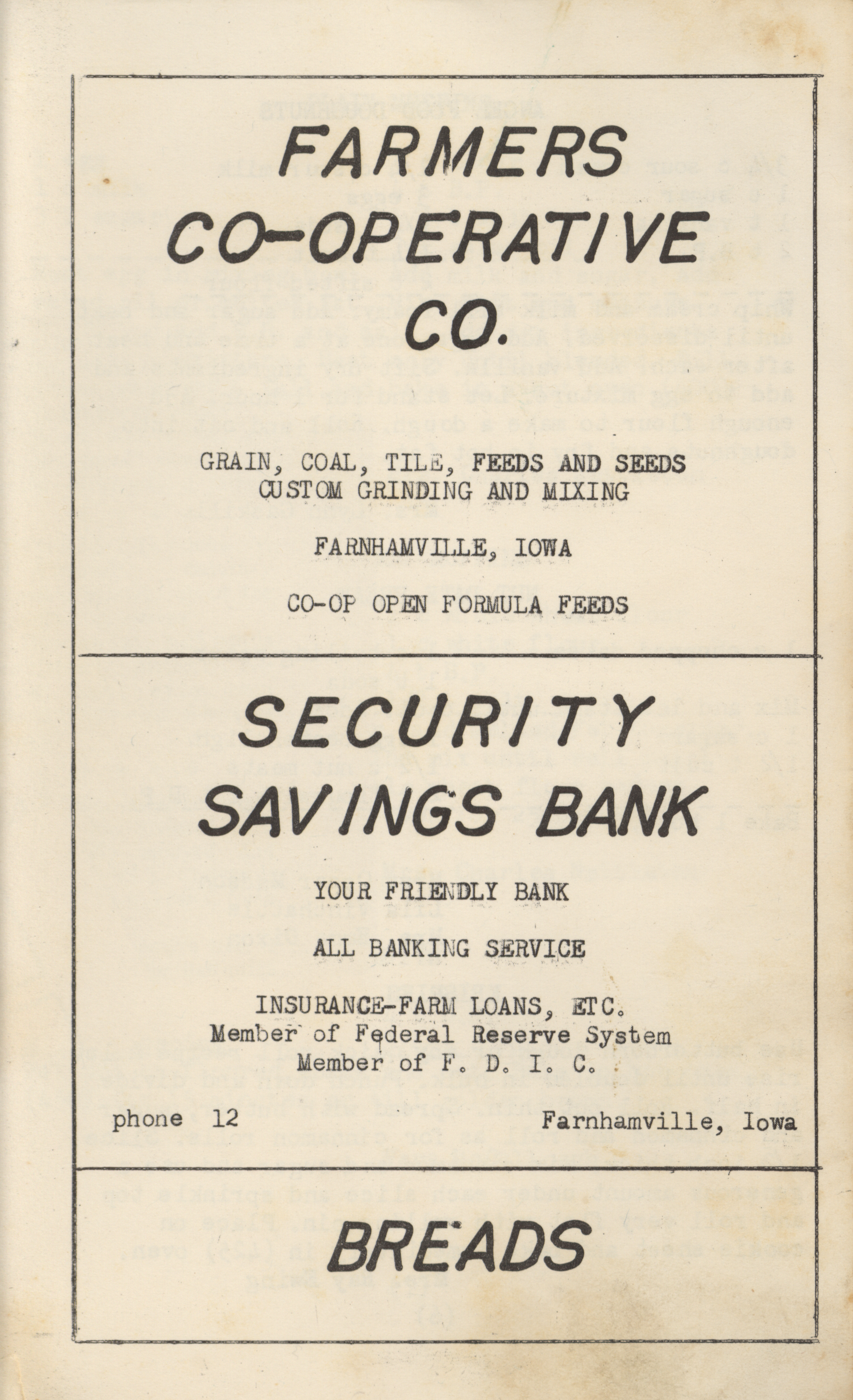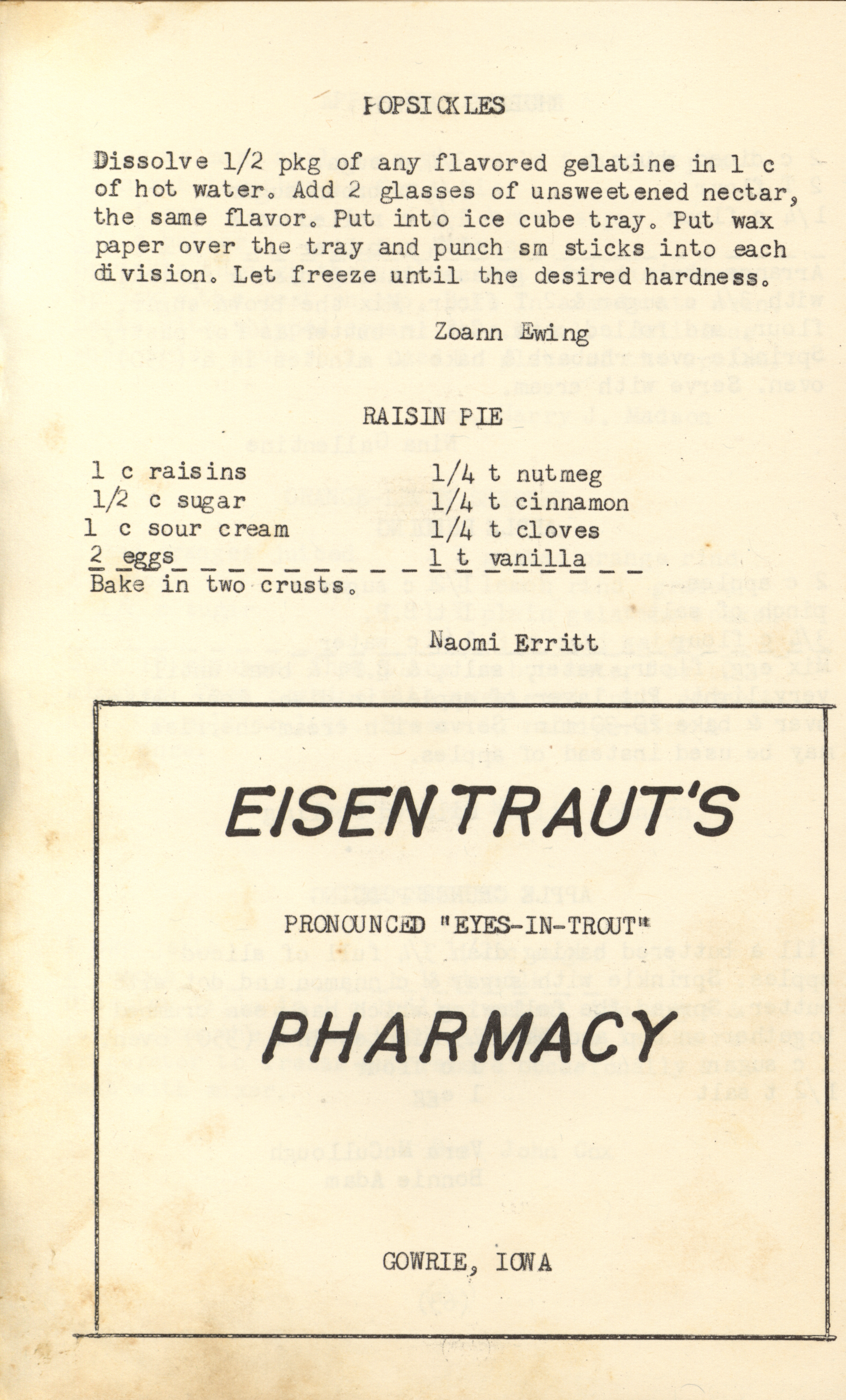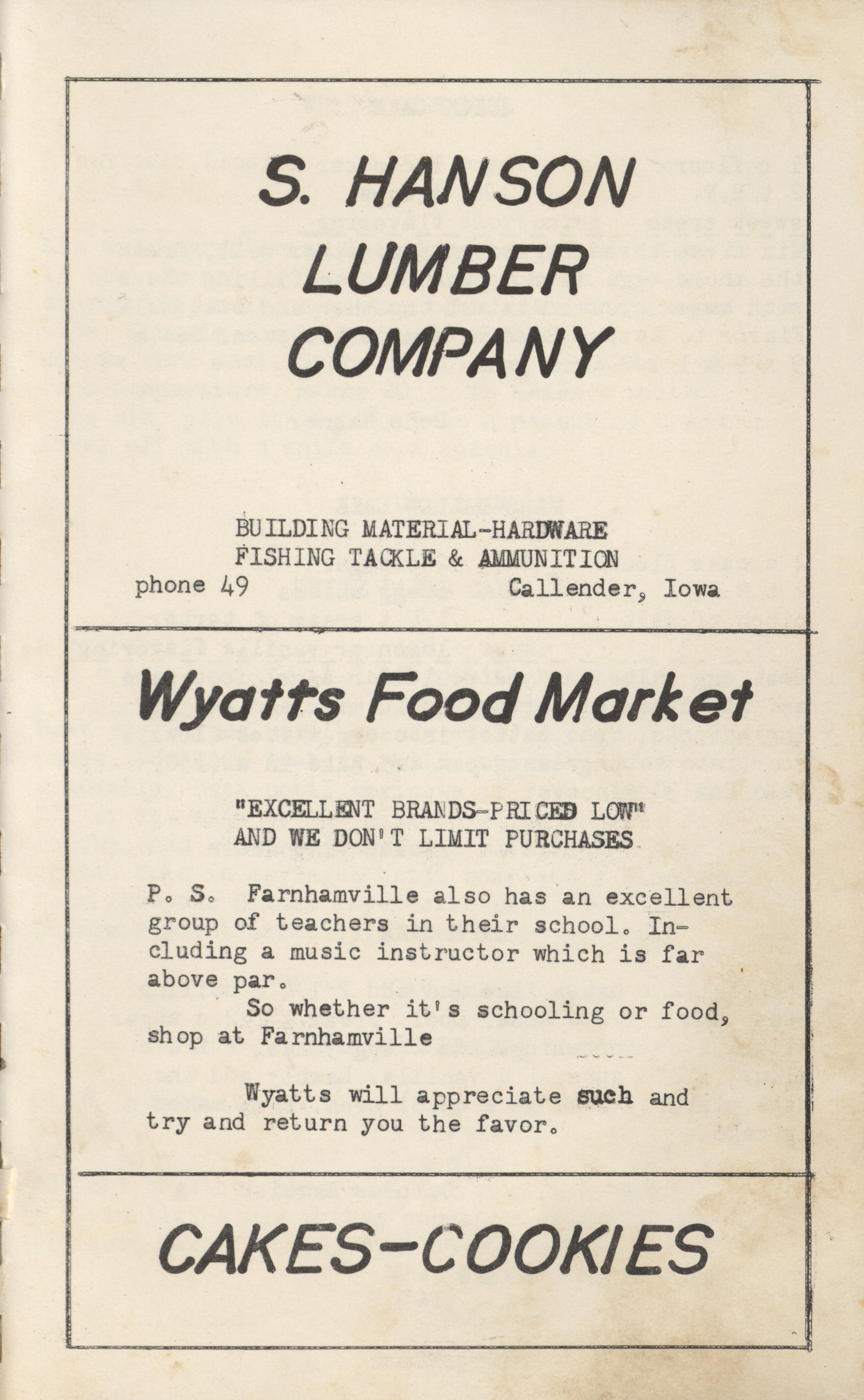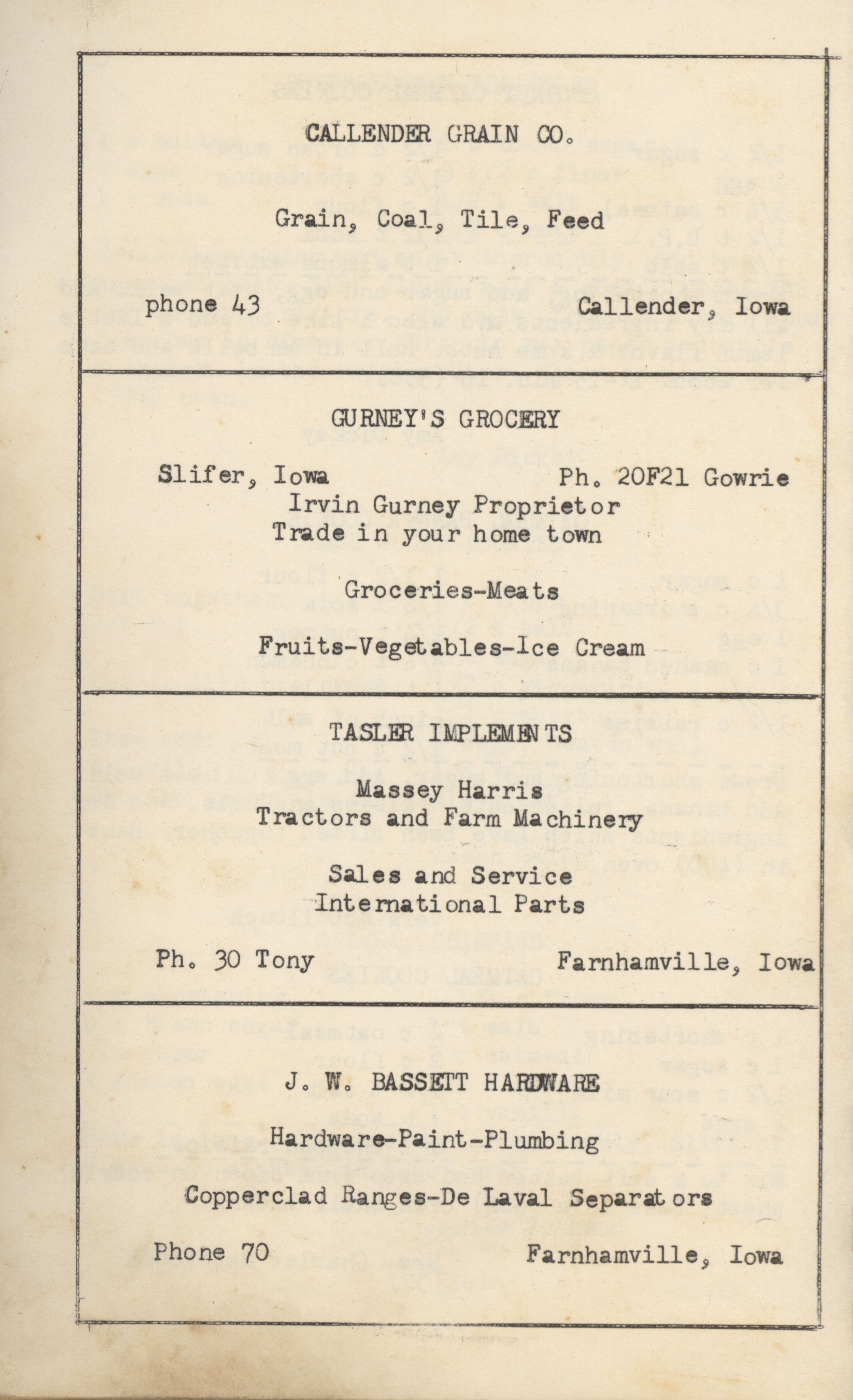 - A community cookbook compiled in 1950 by the Slifer Ladies’ Aid of the Church of the Brethren in Slifer, Iowa. Includes recipes contributed by local women and community advertisements.