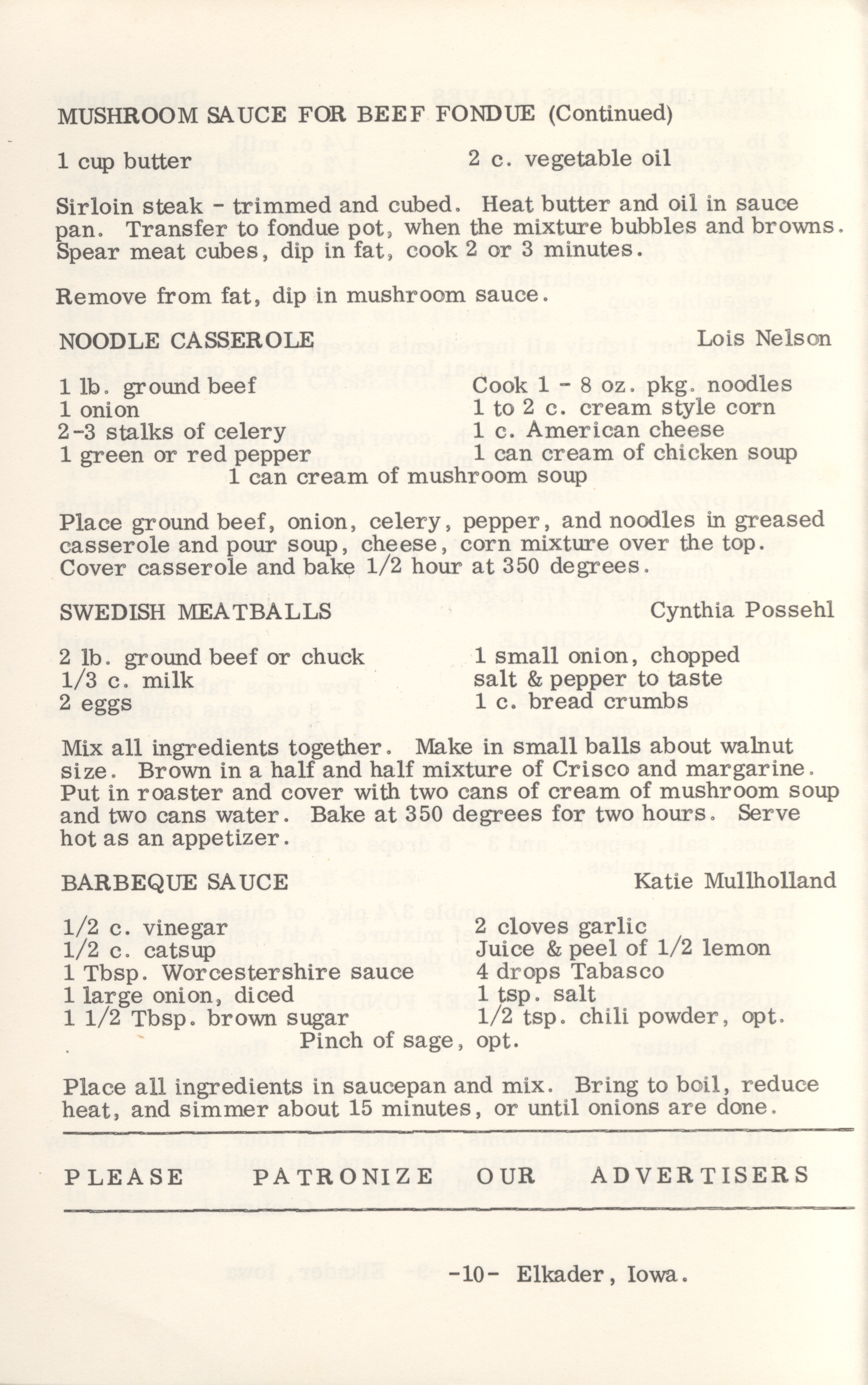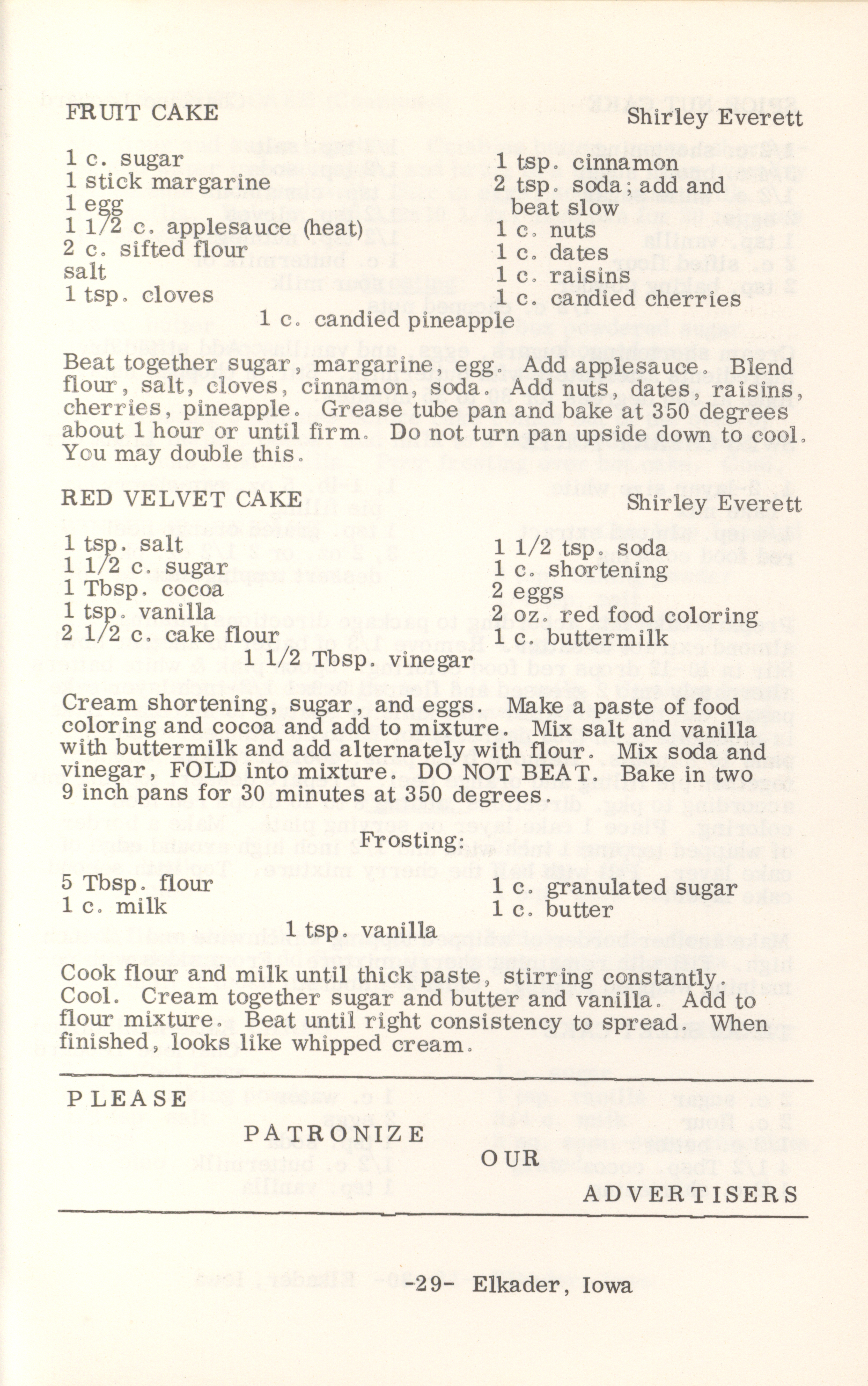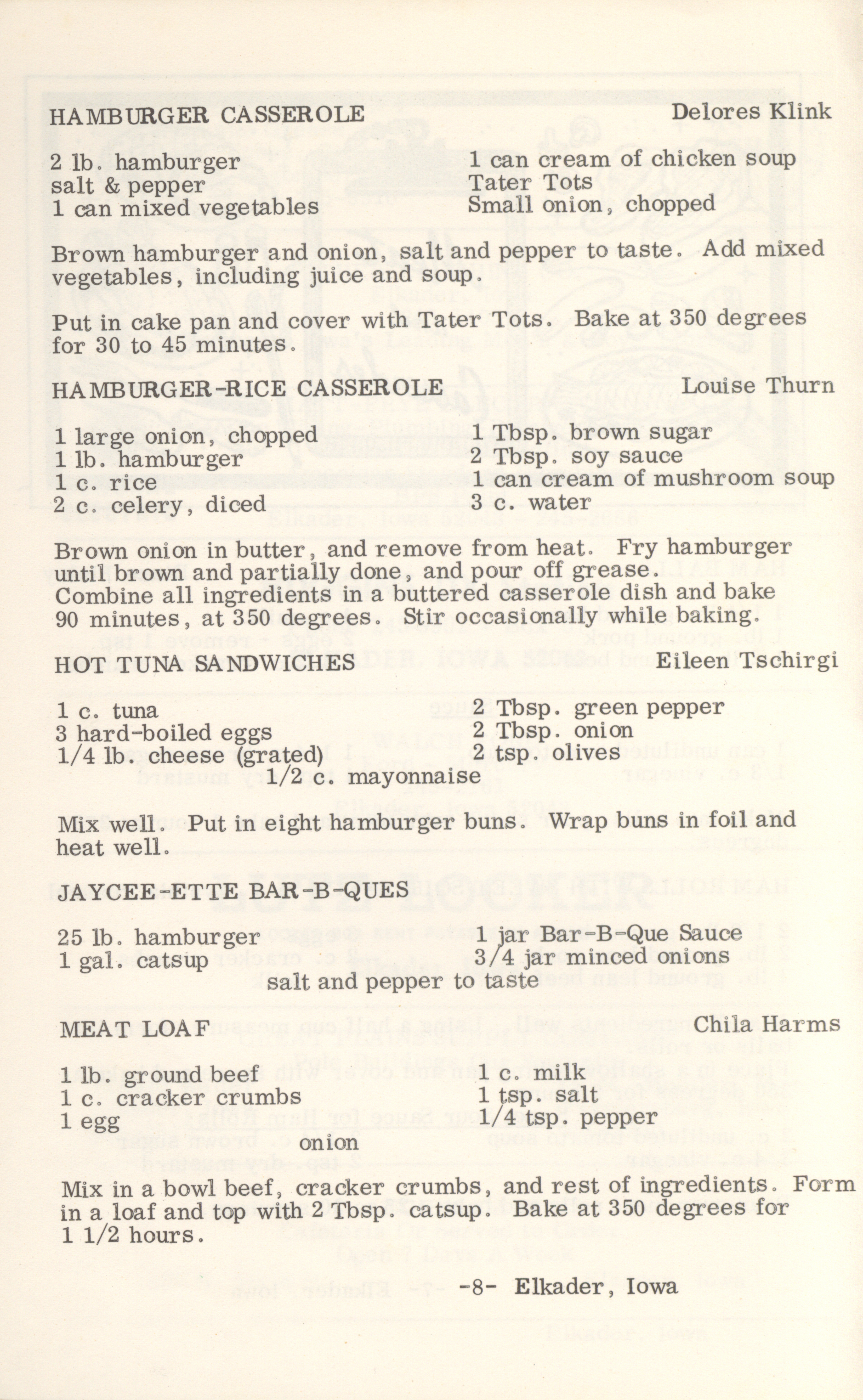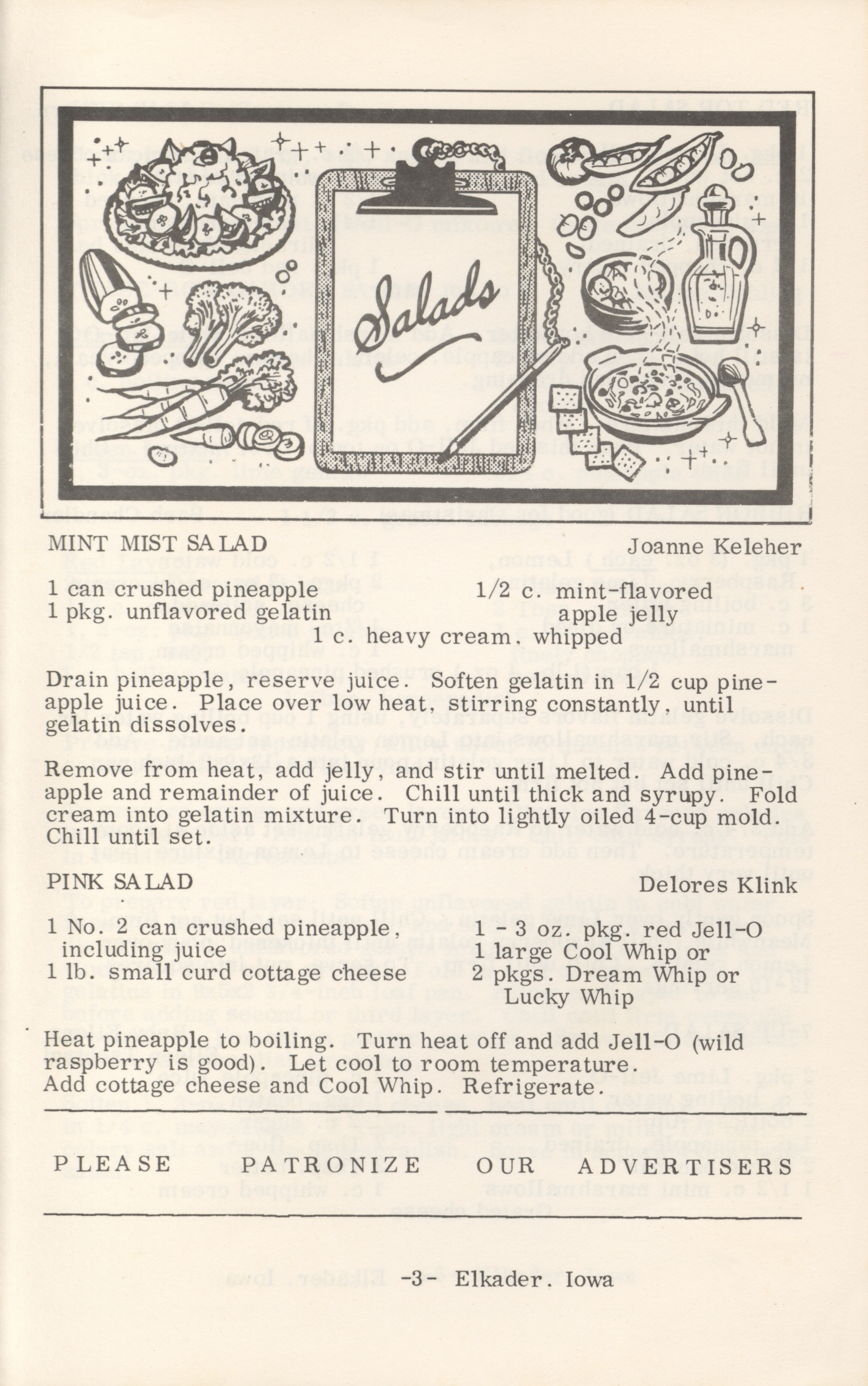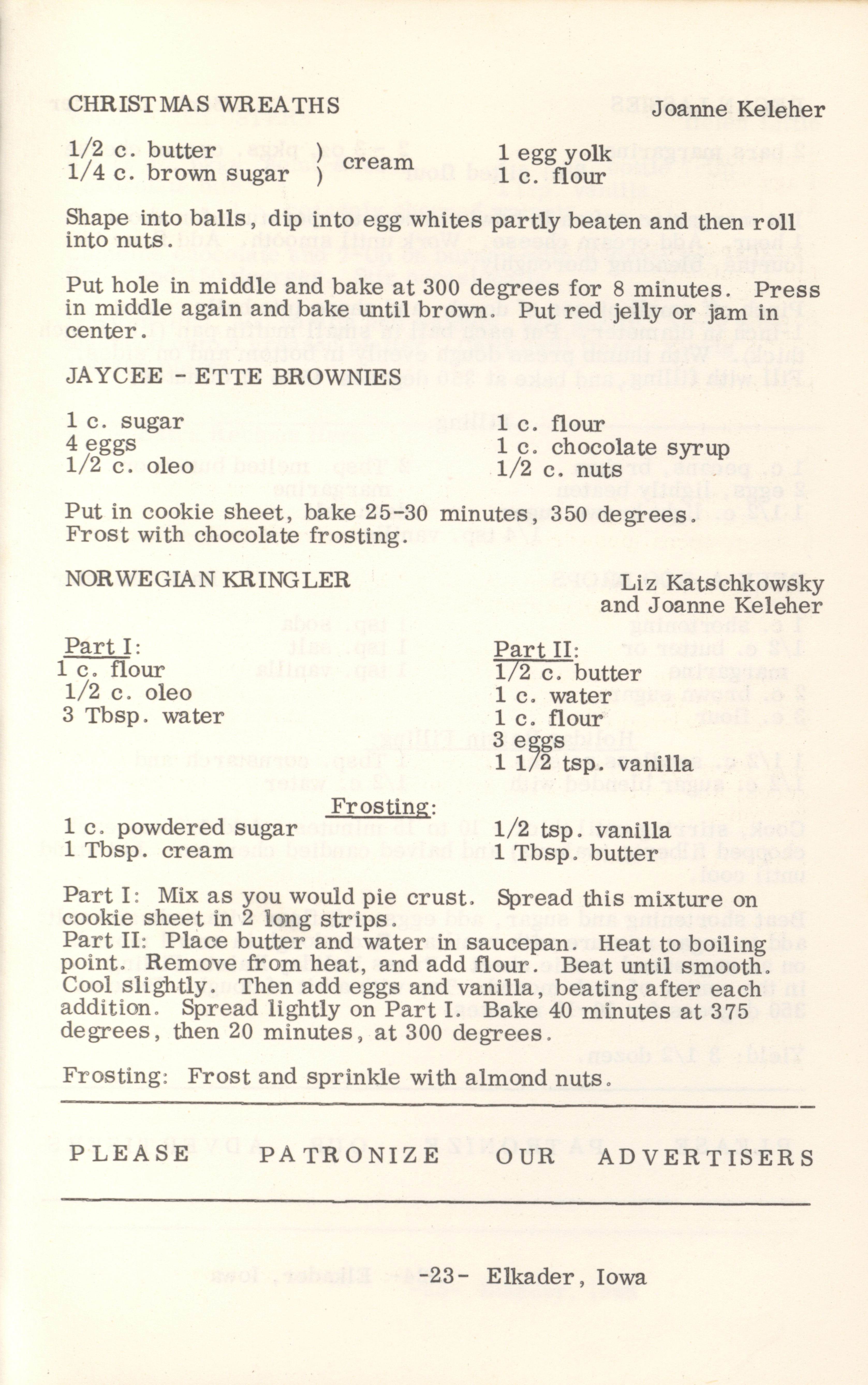 - This cookbook compiled by the Elkader Jaycee-ettes includes advertisements.