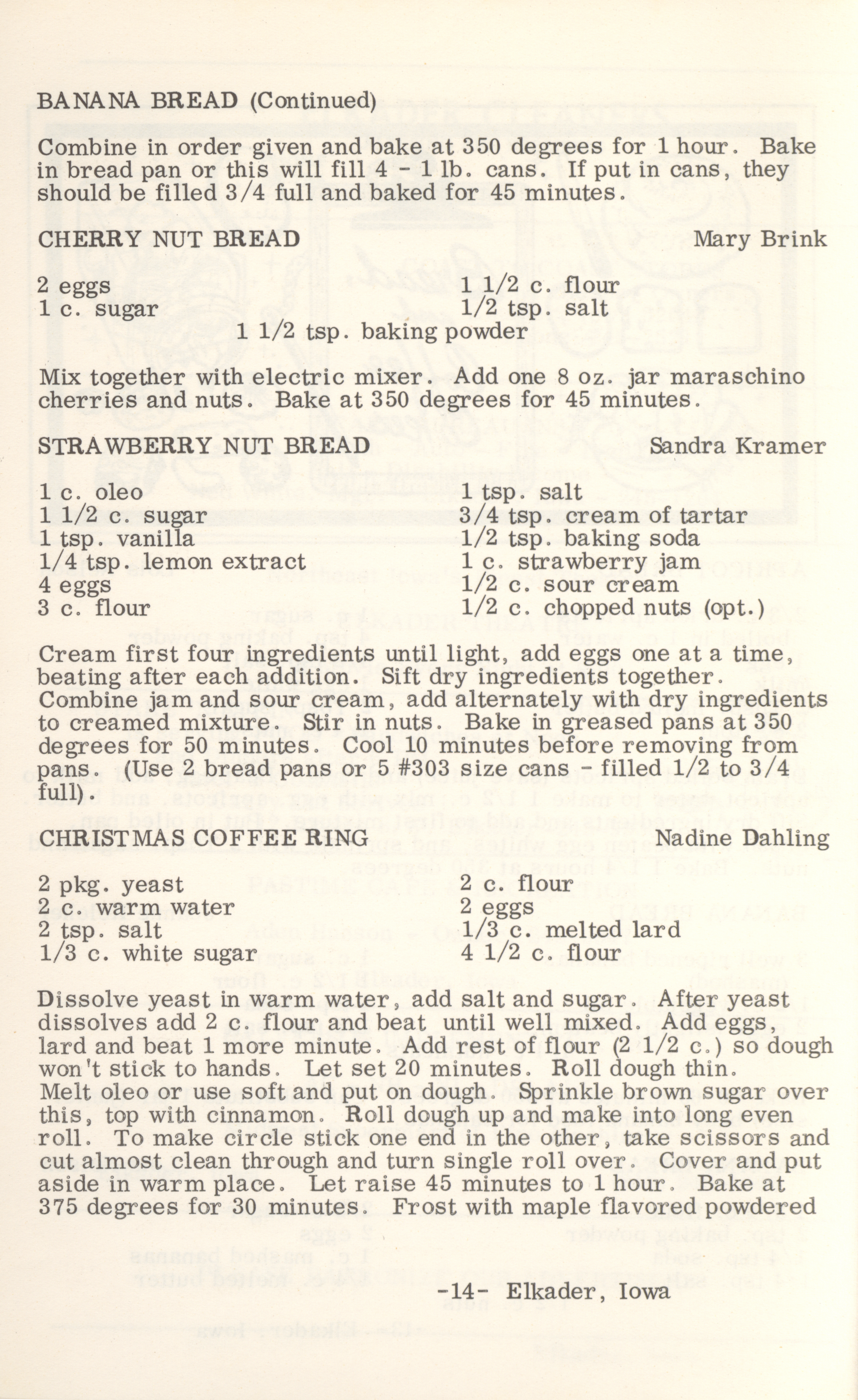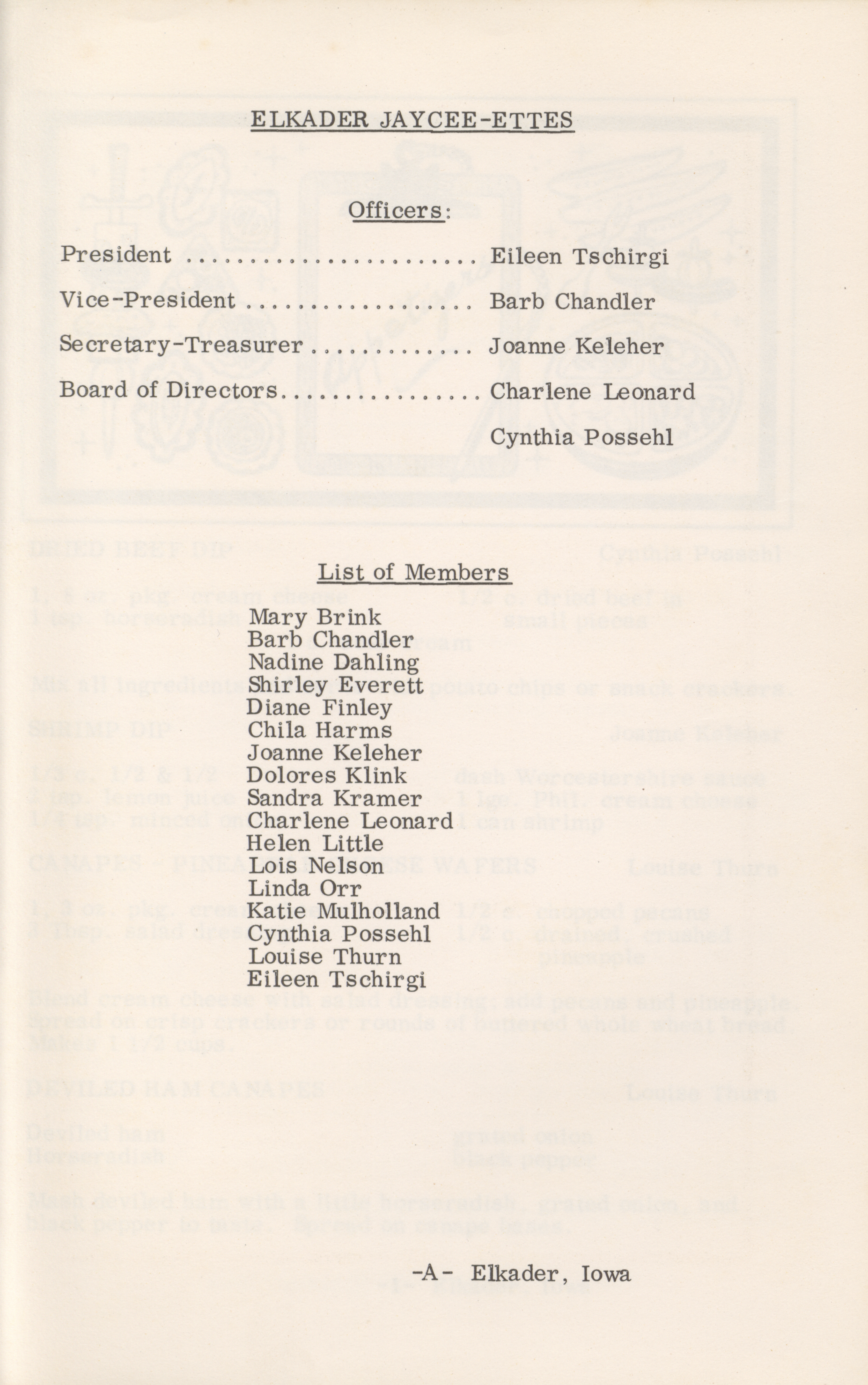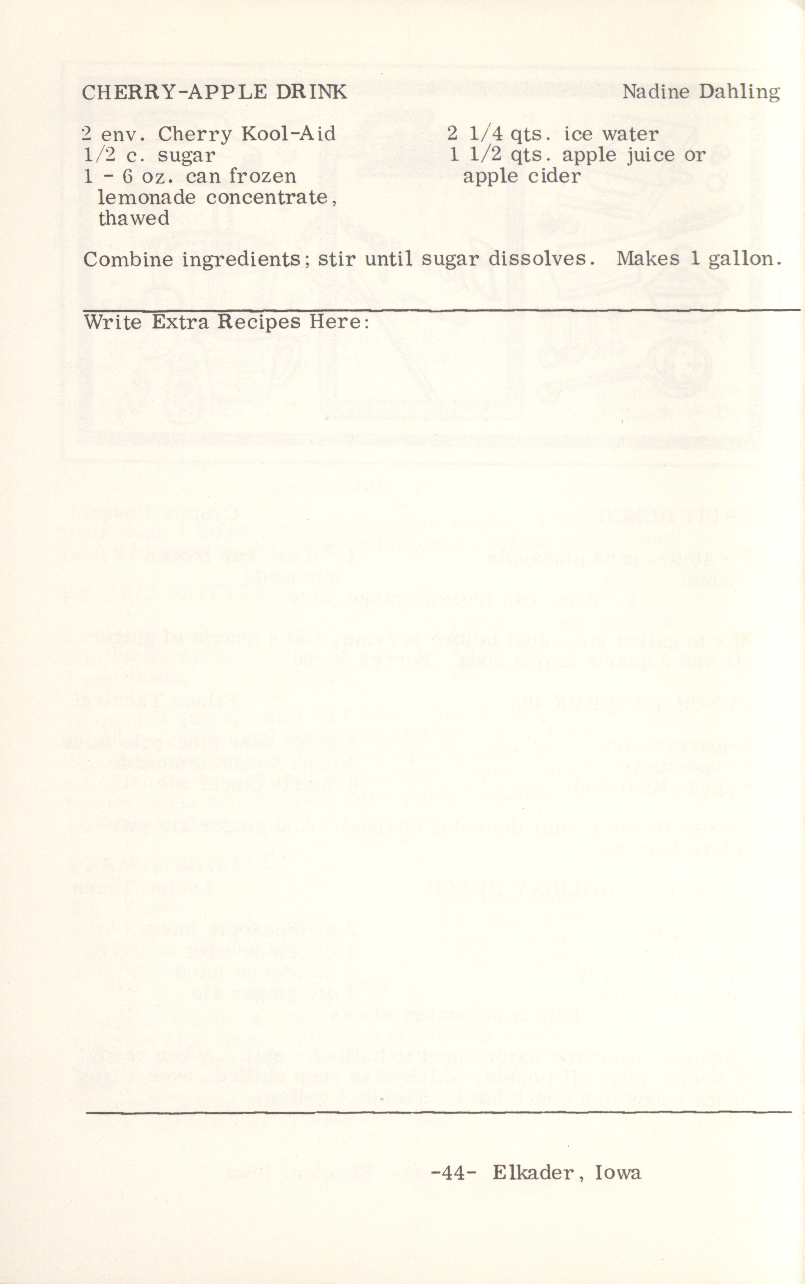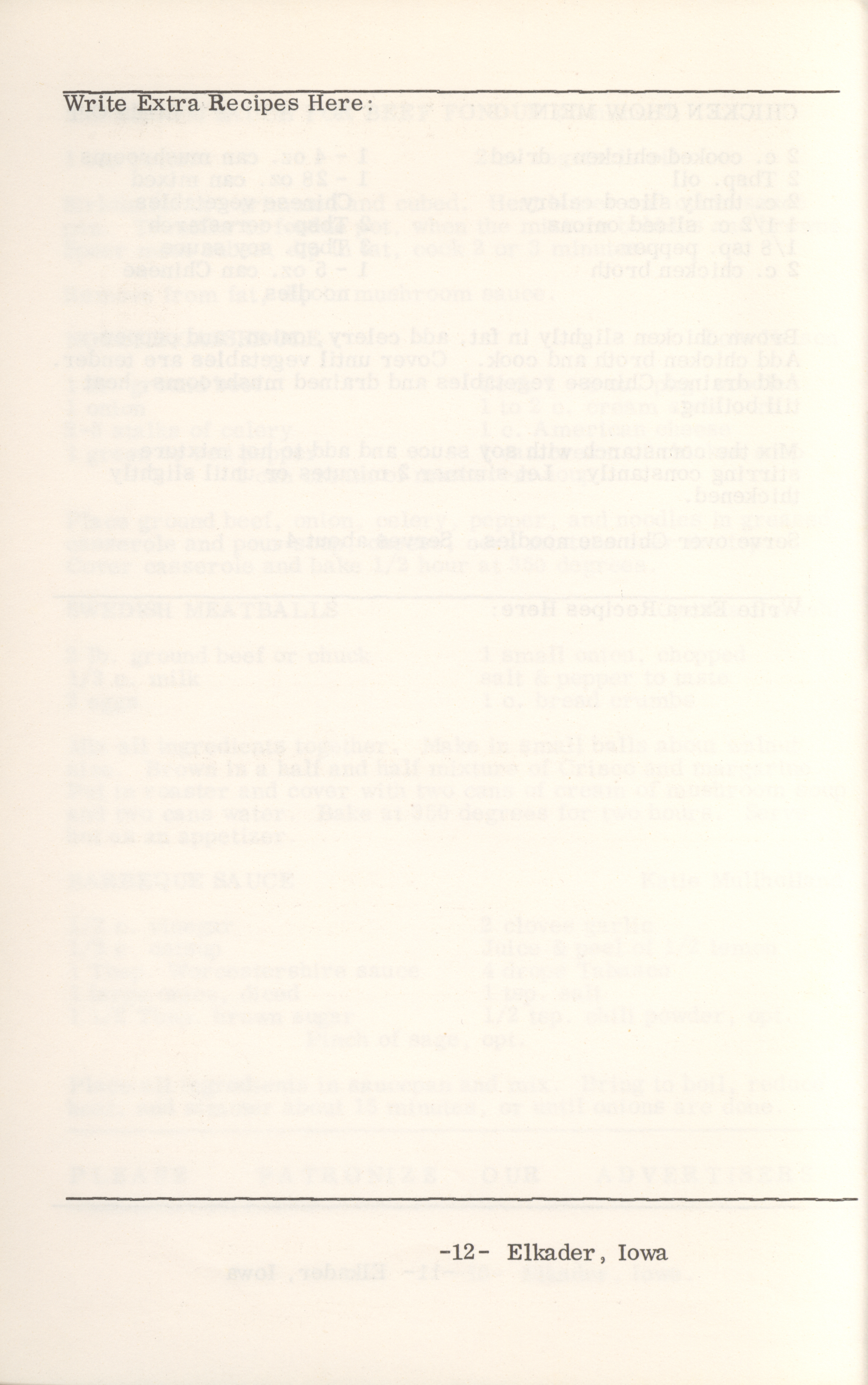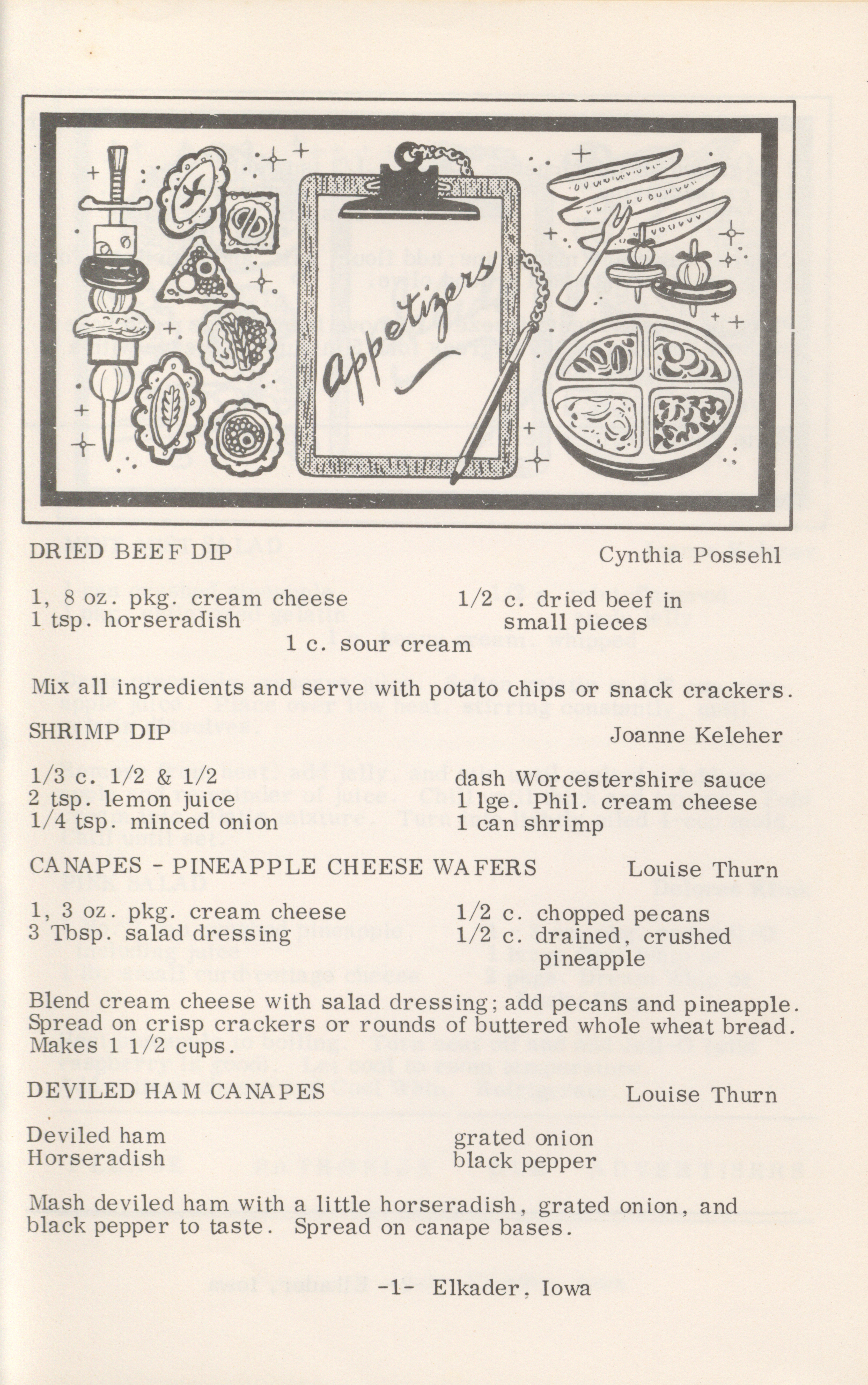 - This cookbook compiled by the Elkader Jaycee-ettes includes advertisements.