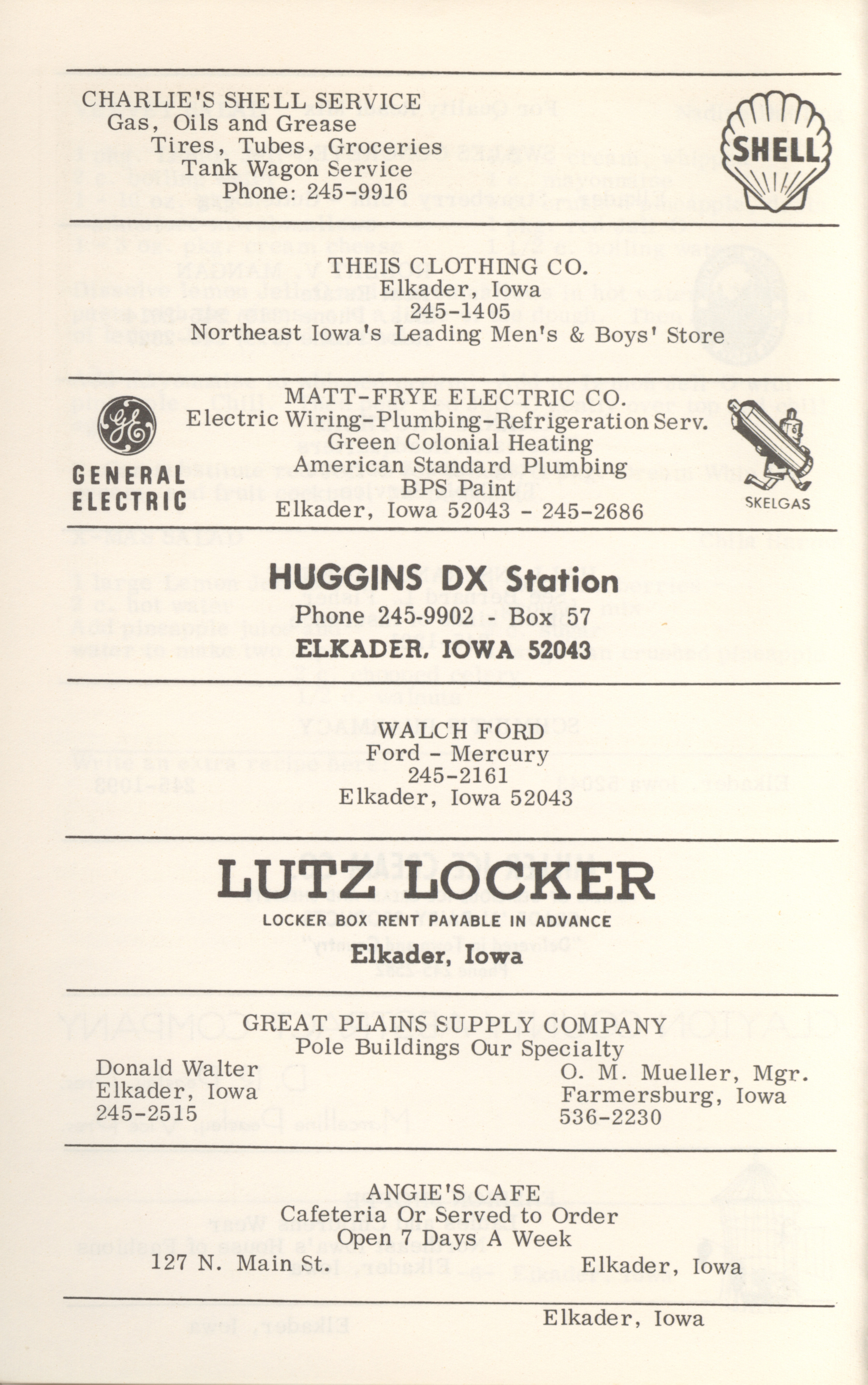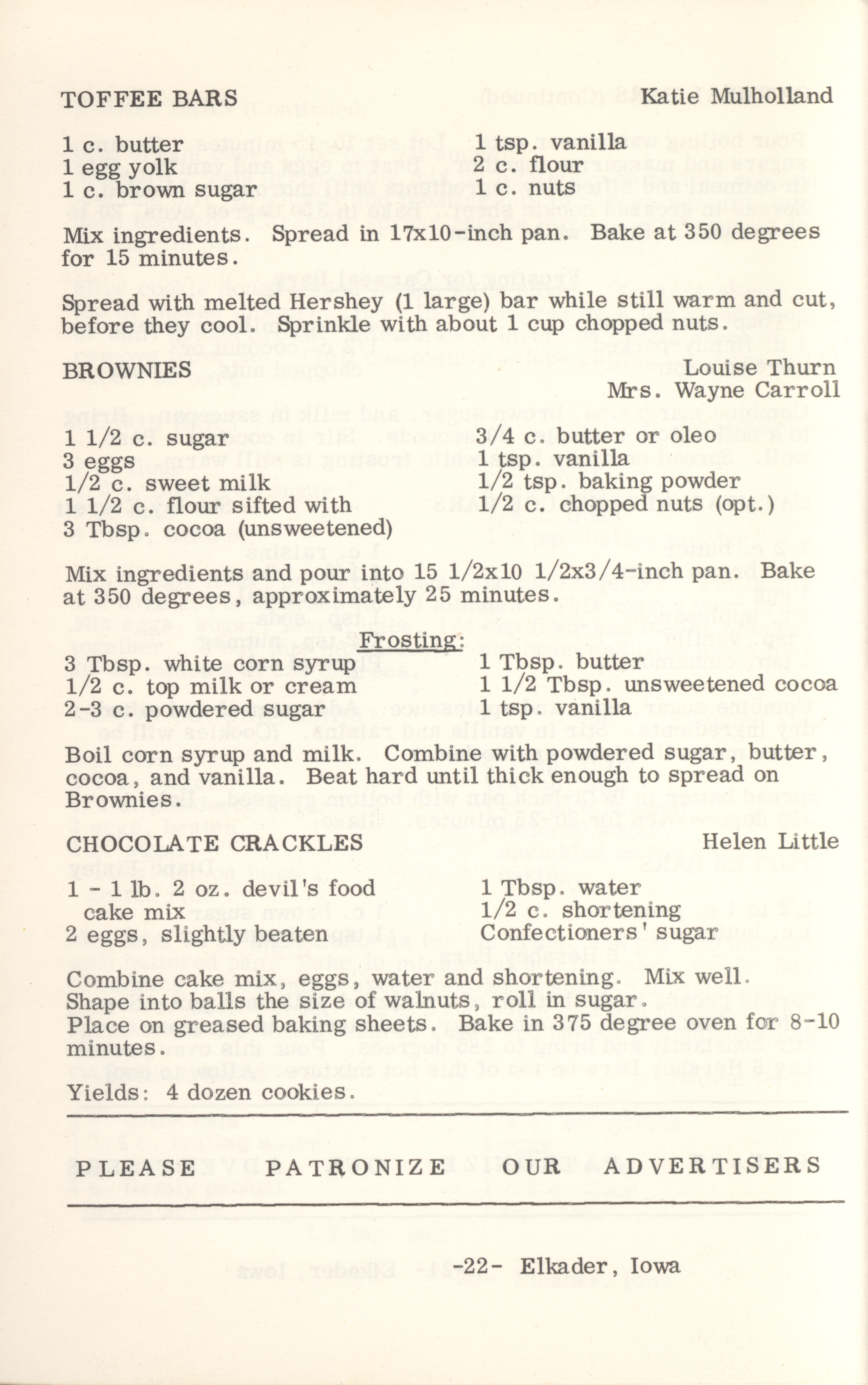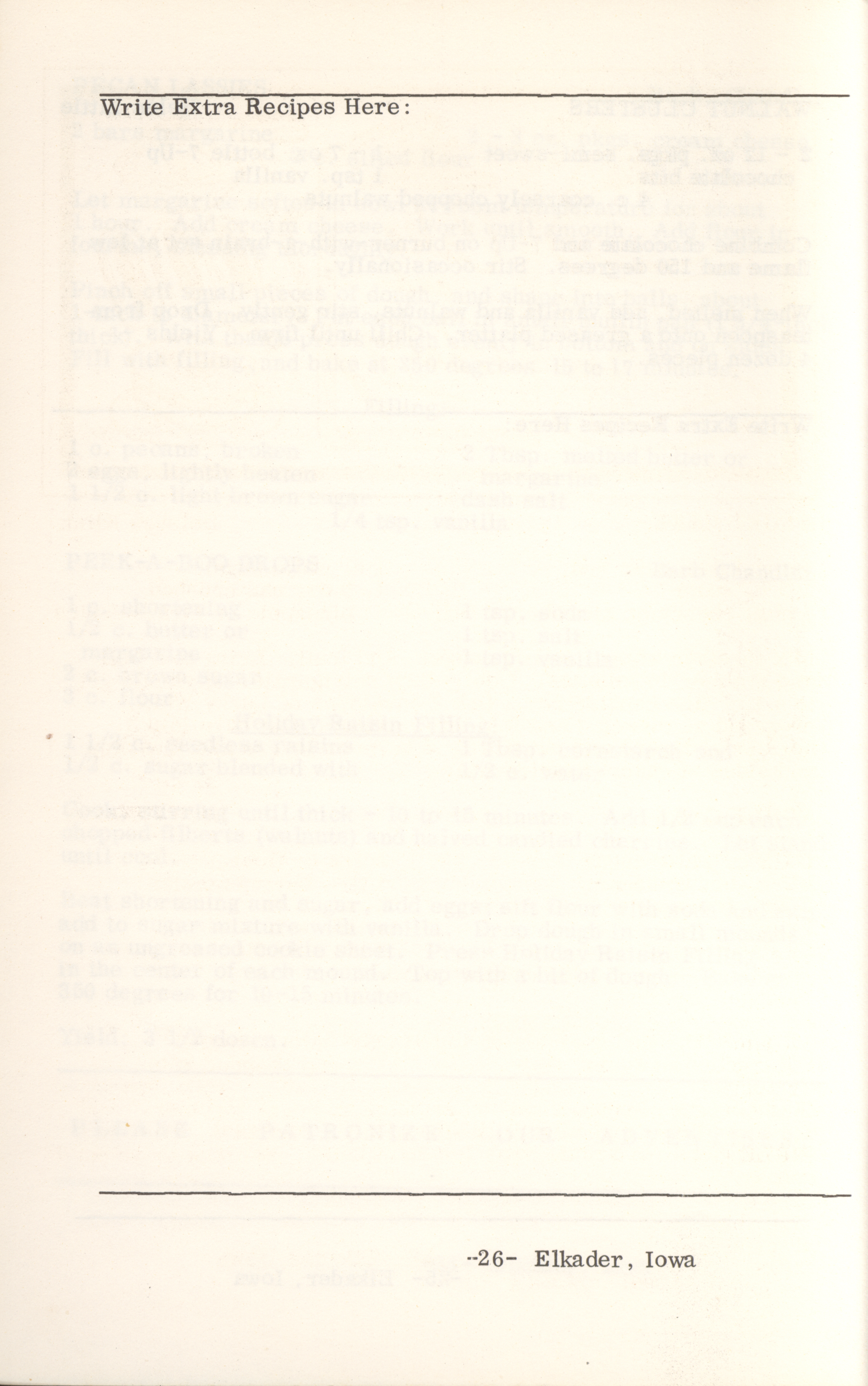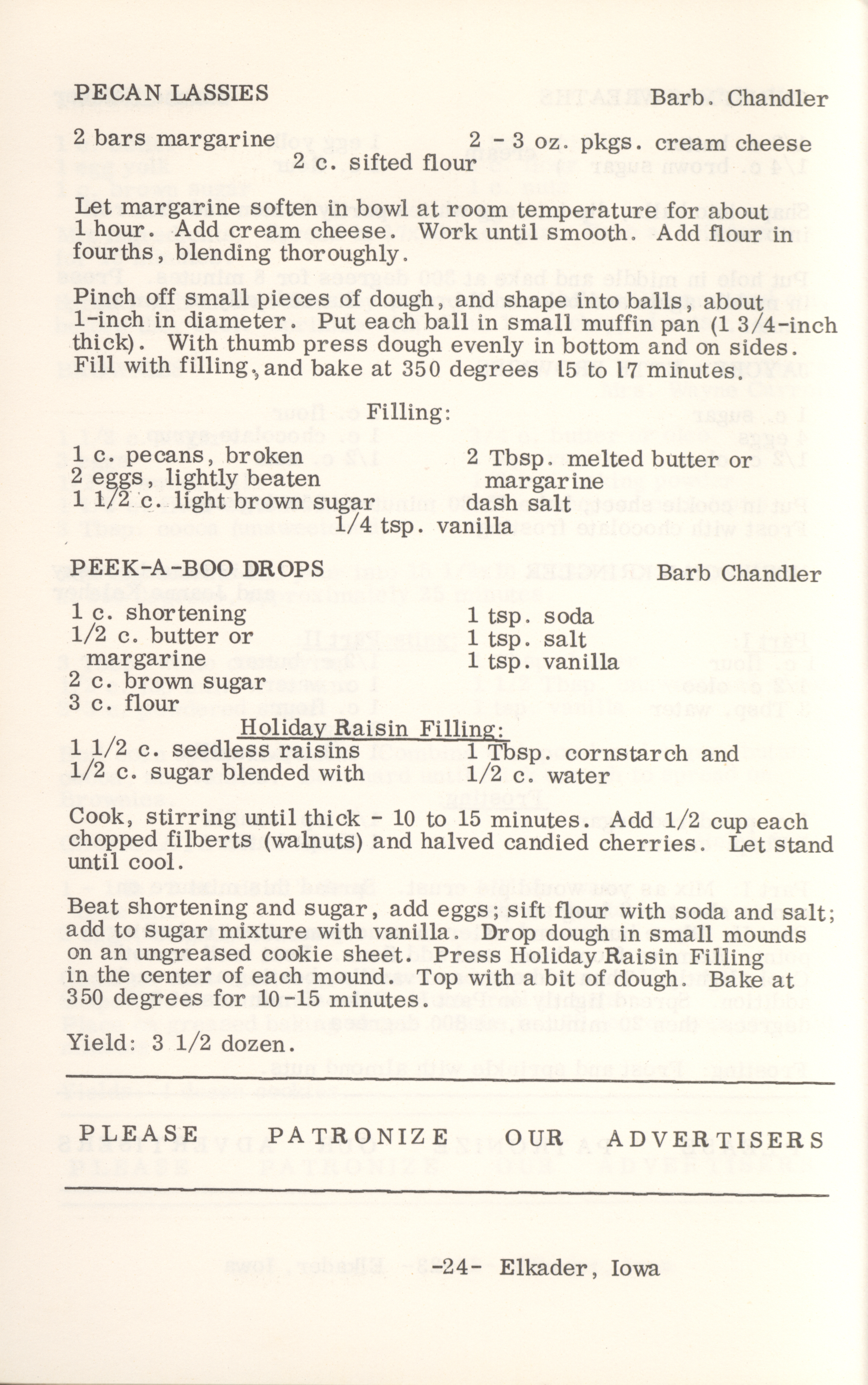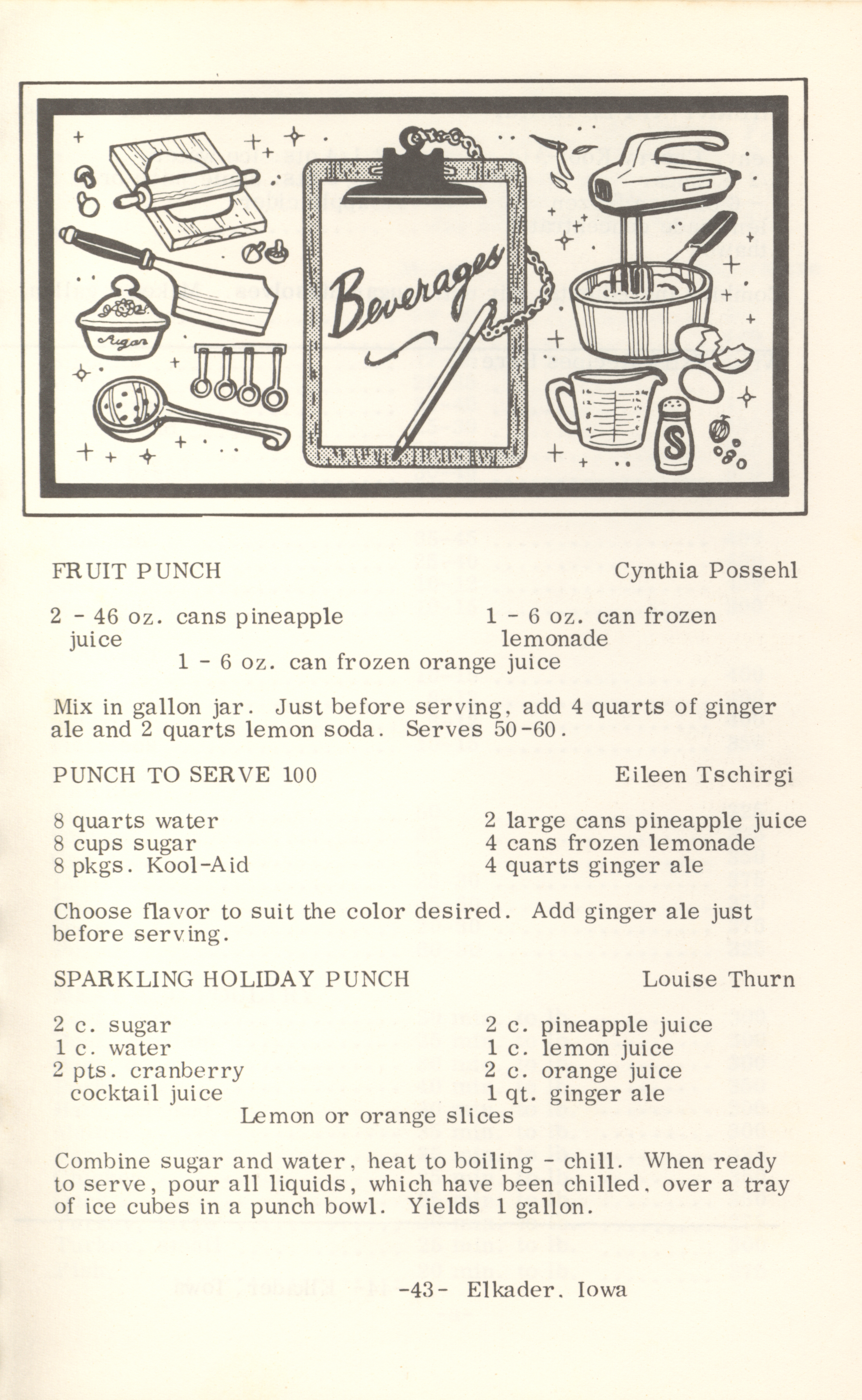 - This cookbook compiled by the Elkader Jaycee-ettes includes advertisements.