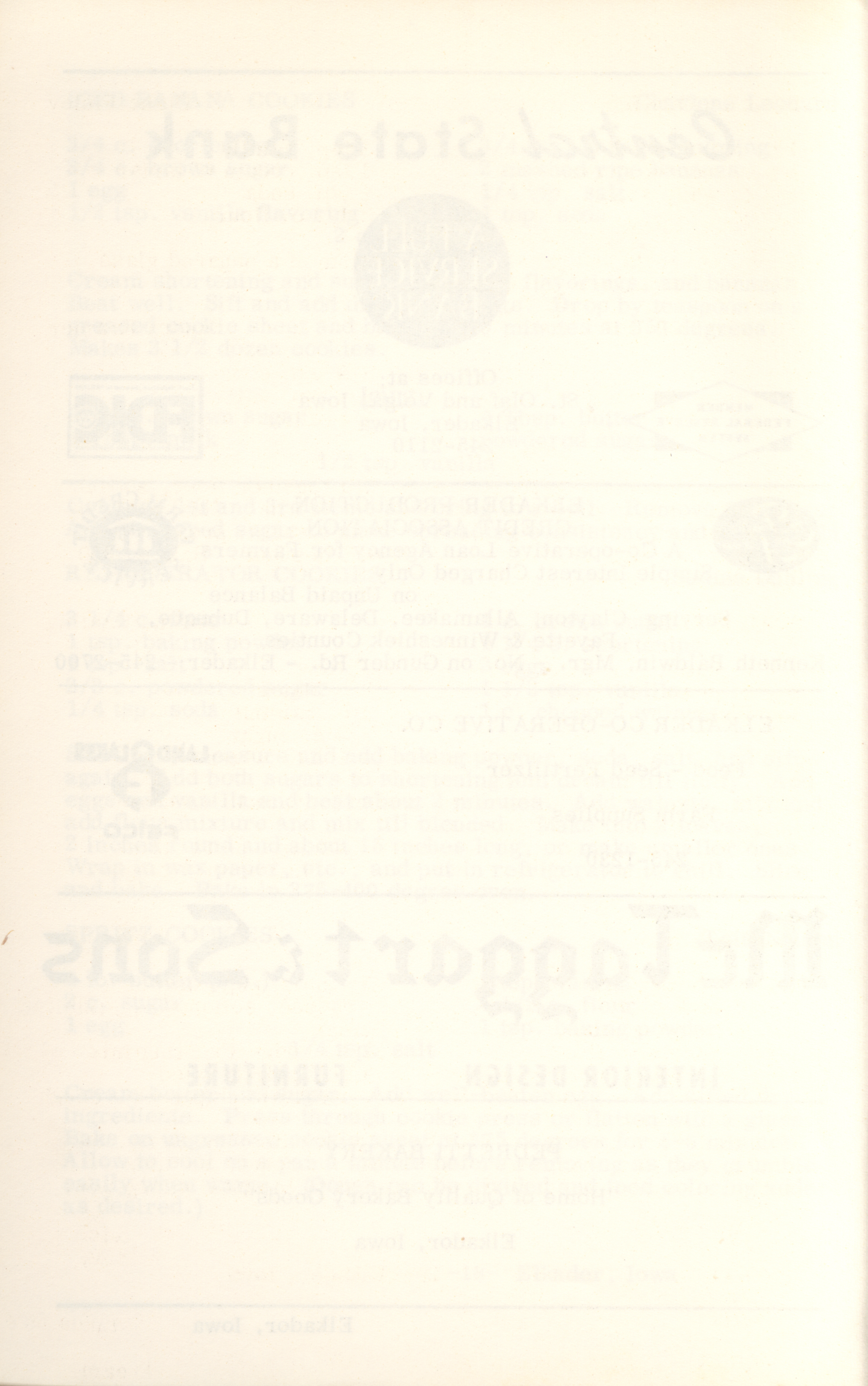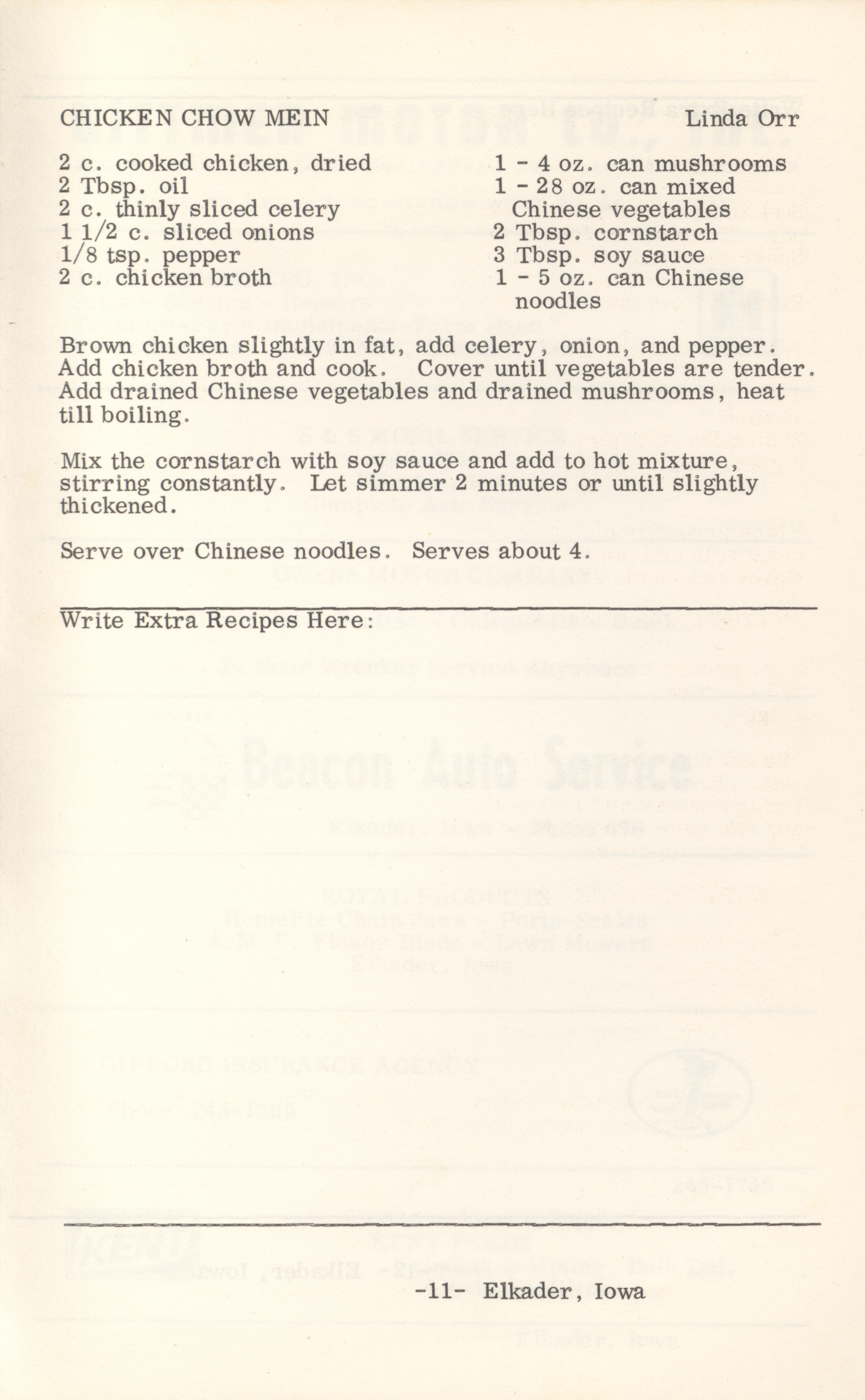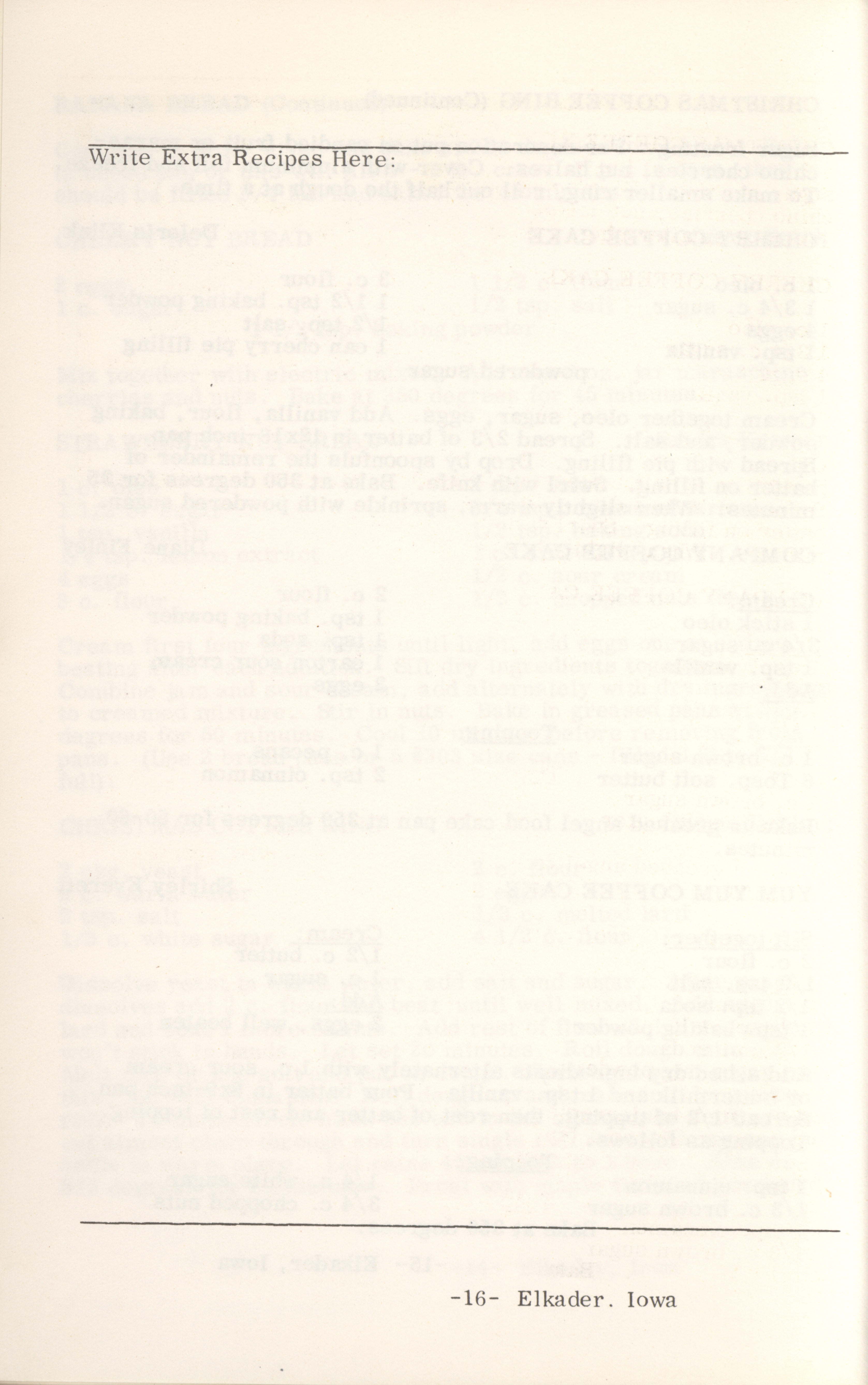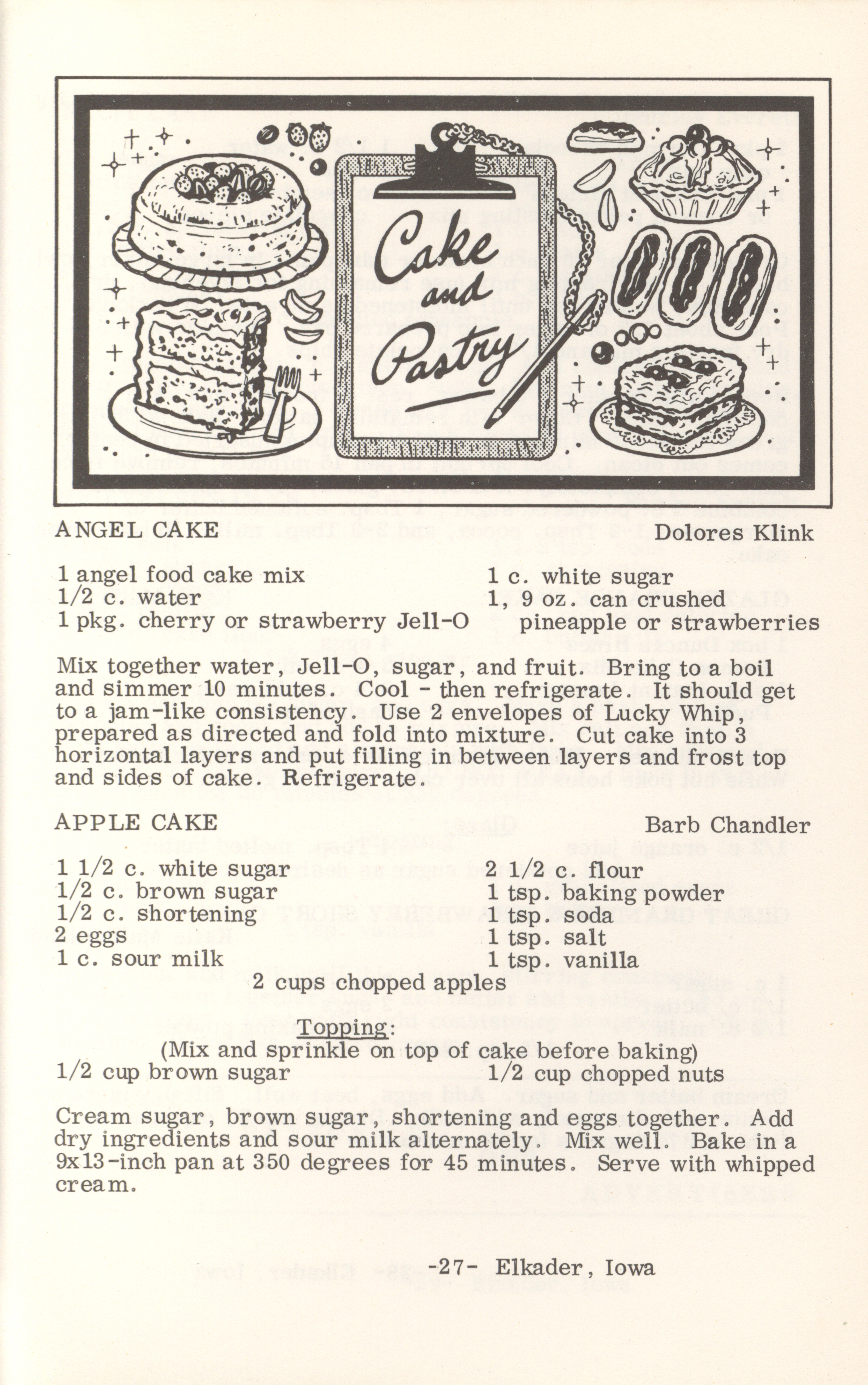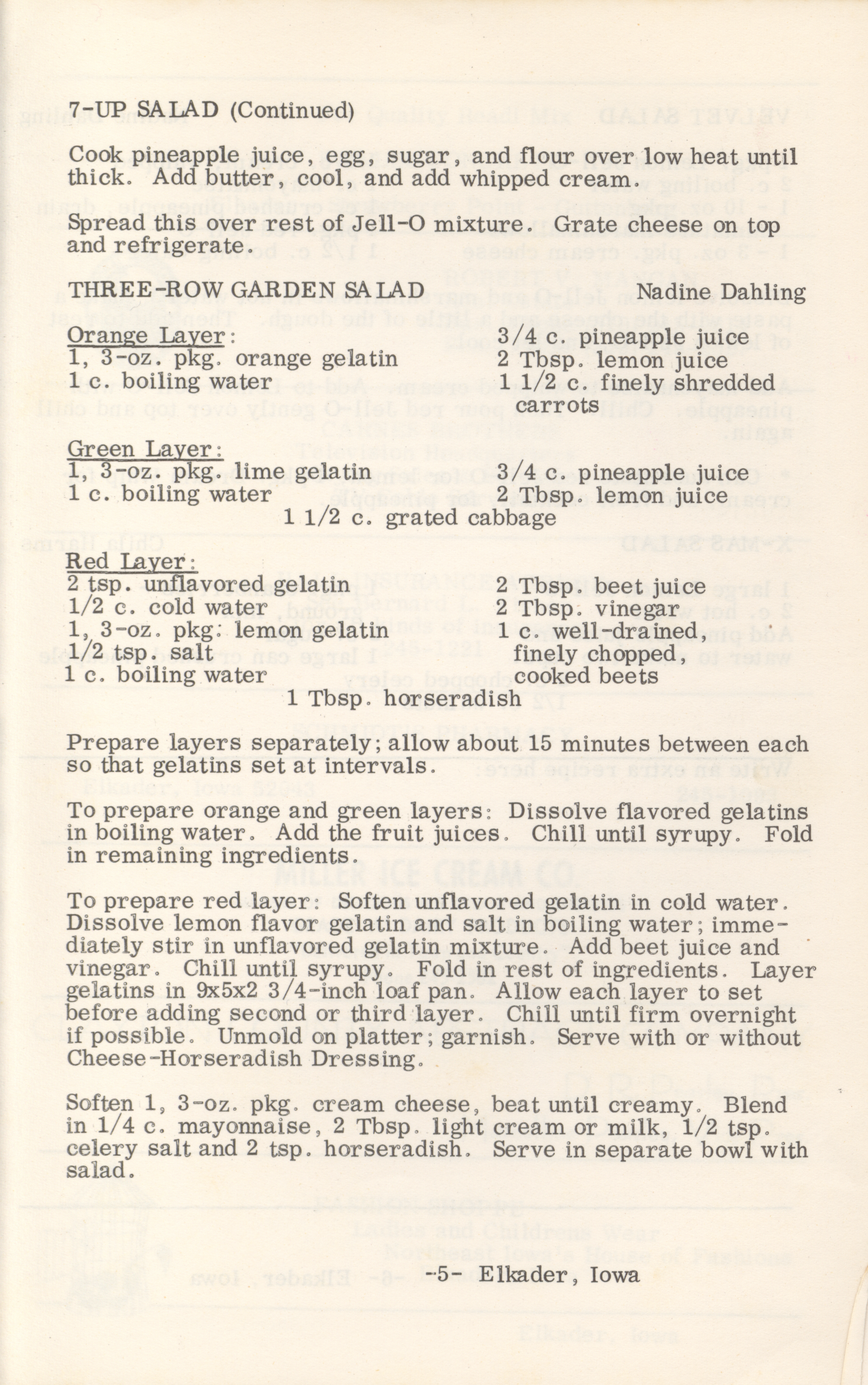 - This cookbook compiled by the Elkader Jaycee-ettes includes advertisements.