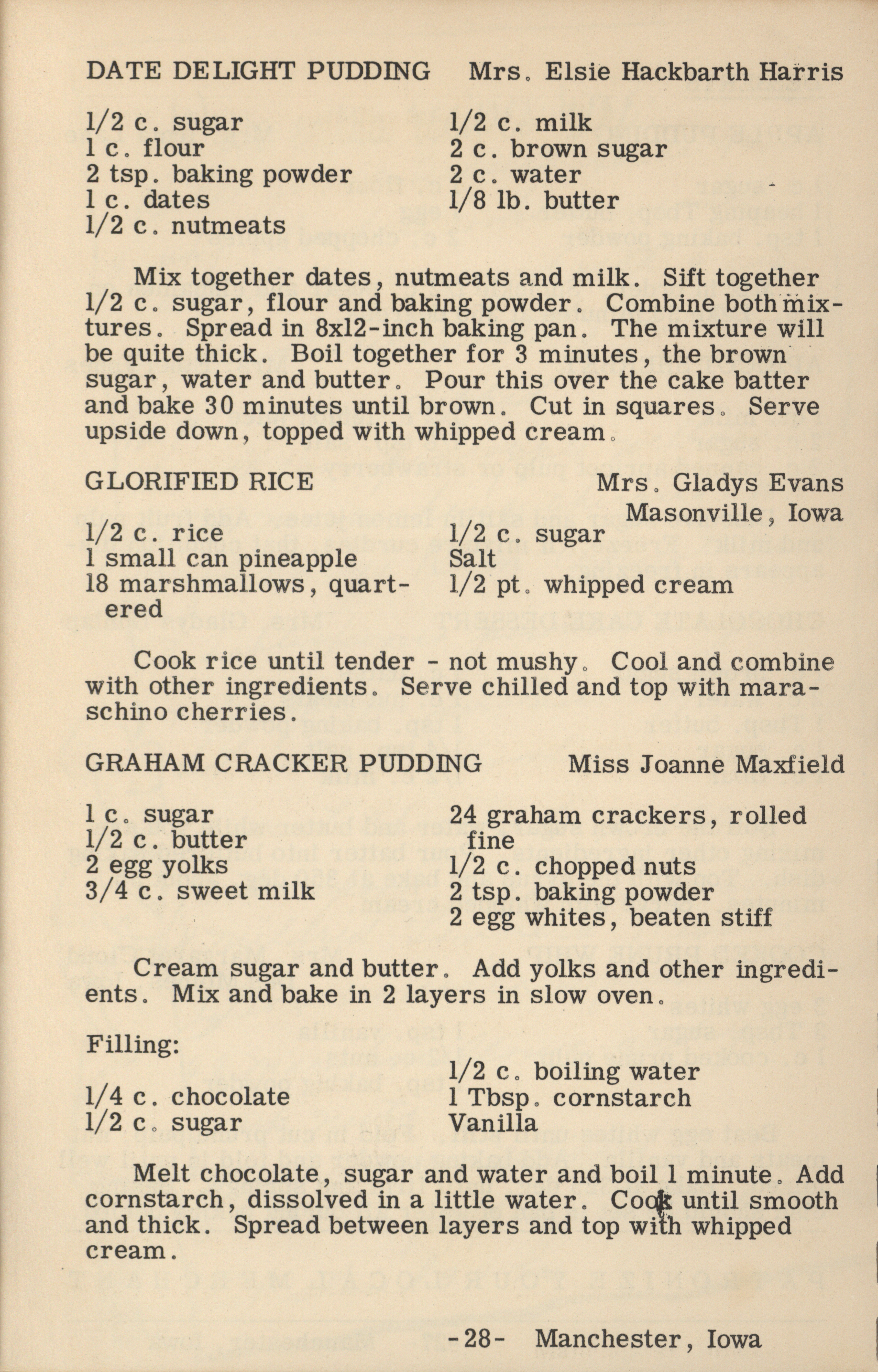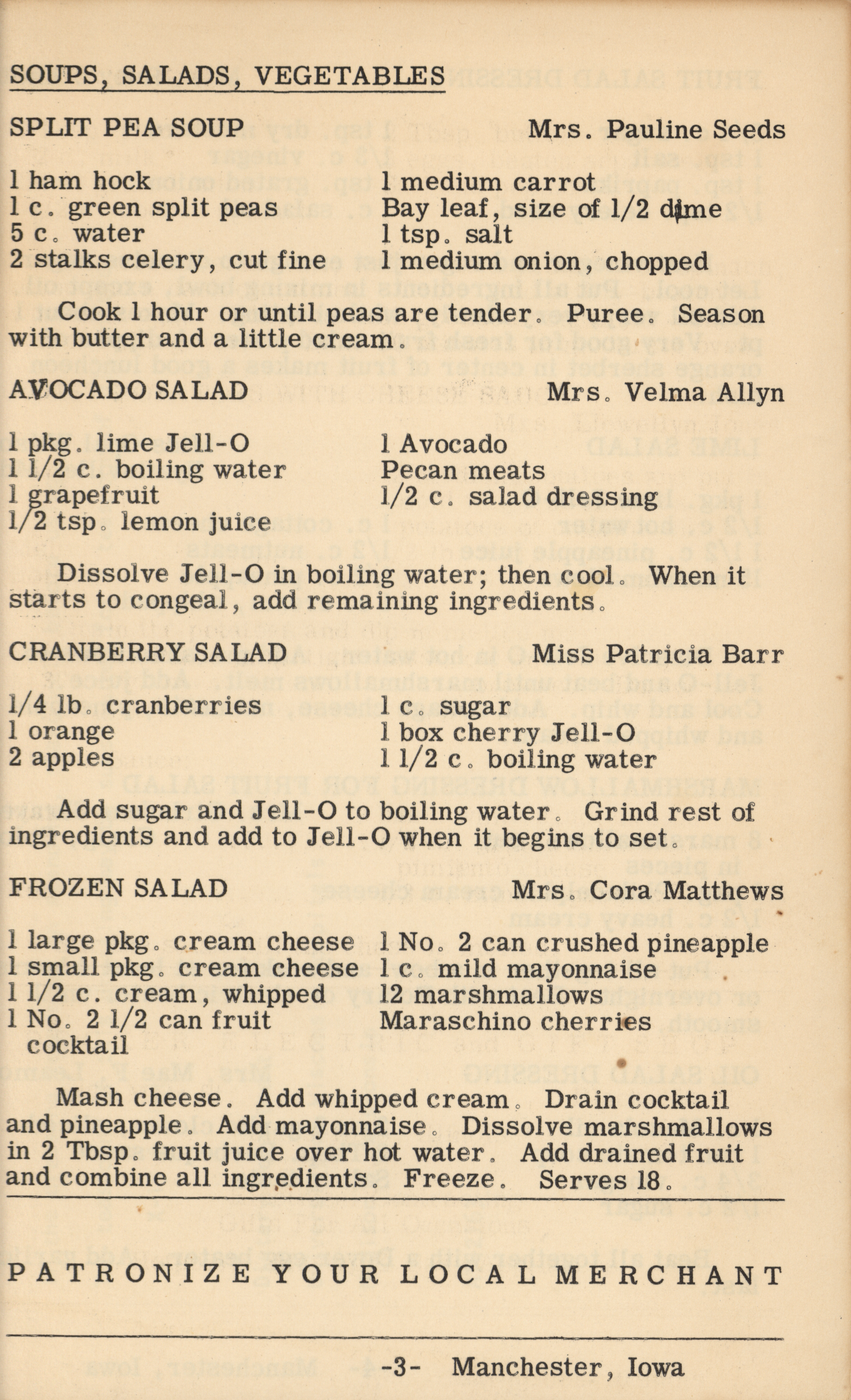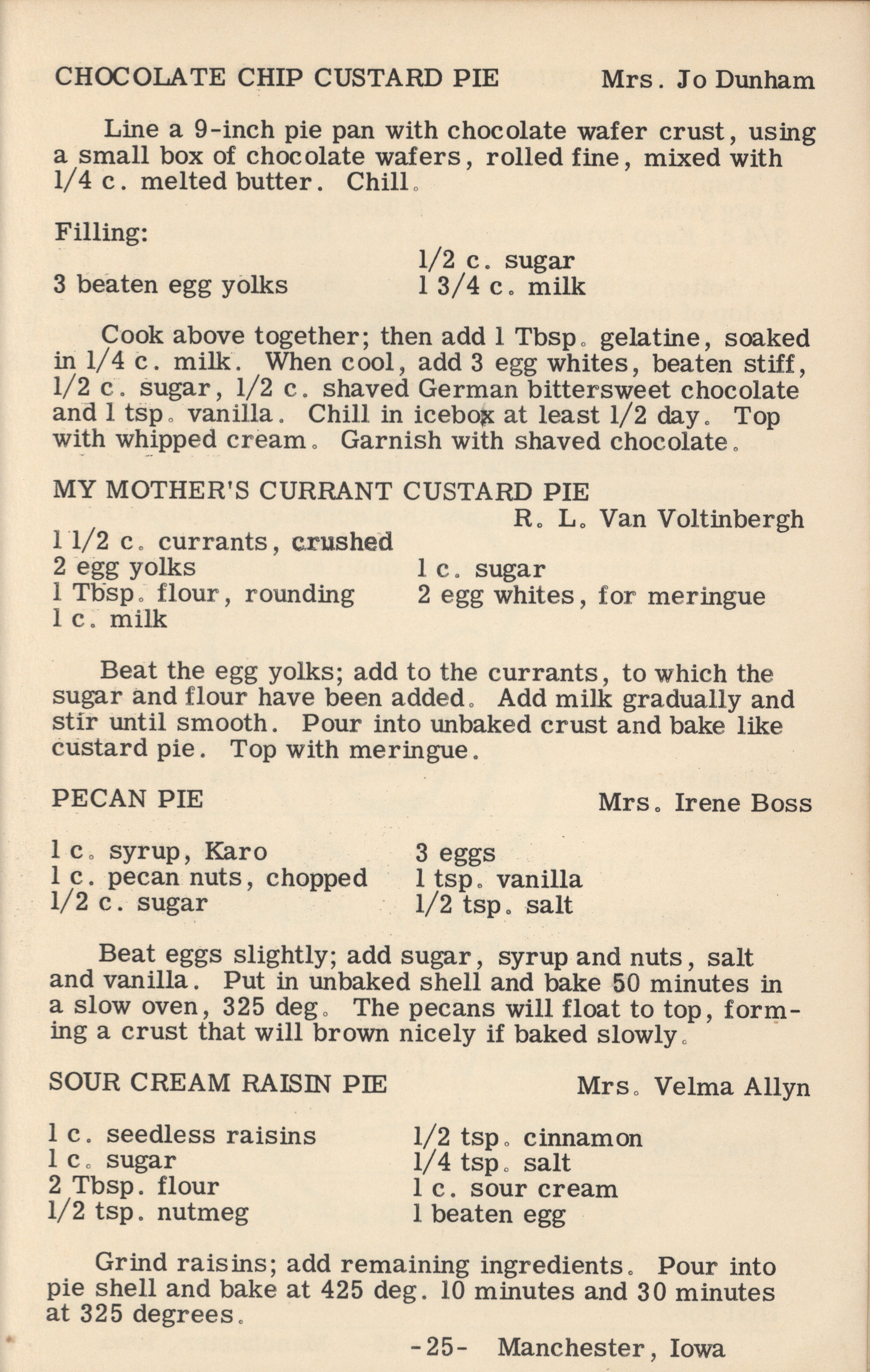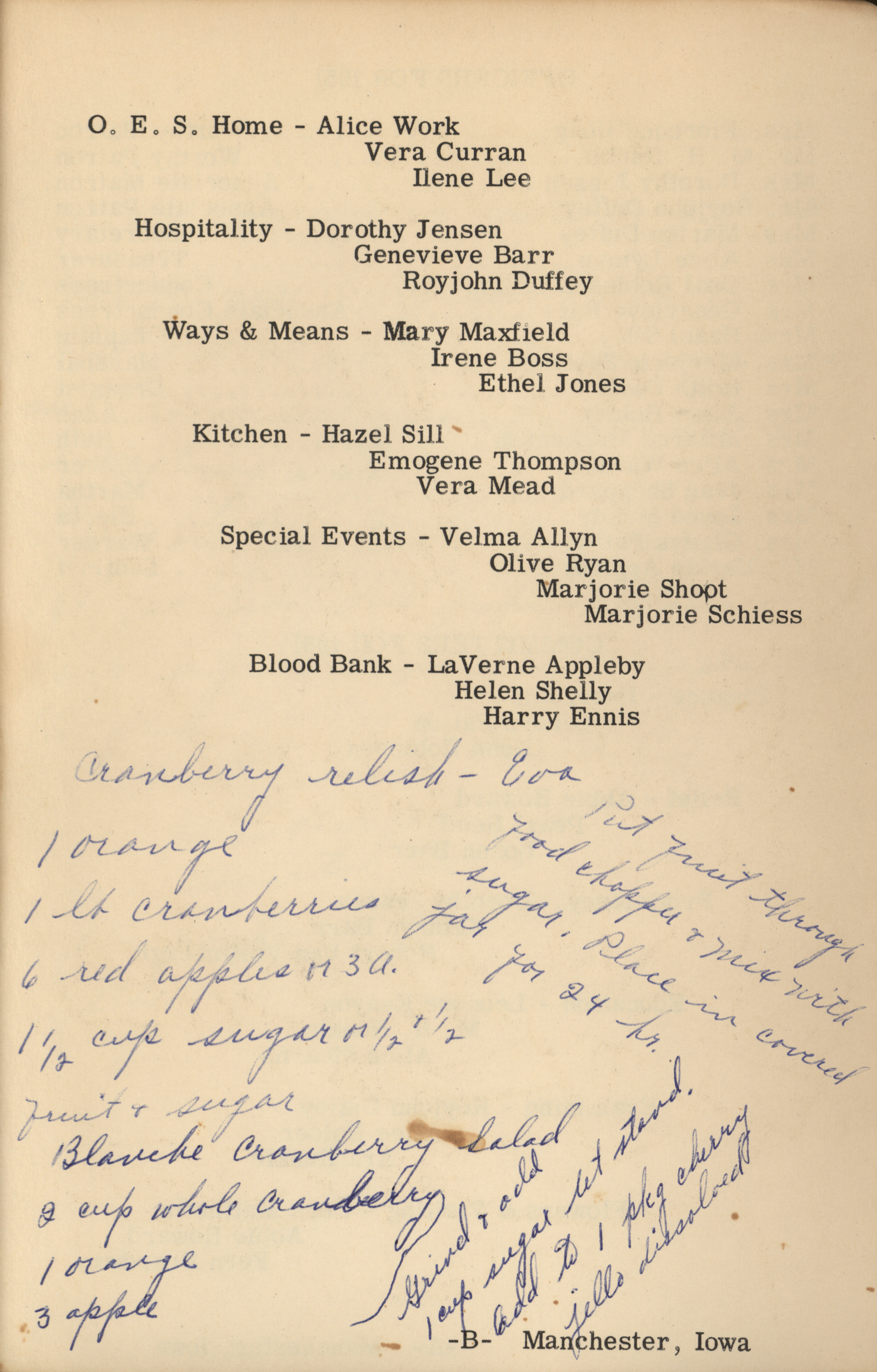 - A cookbook compiled by the Orient Chapter of the Order of the Eastern Star in Manchester, Iowa. Along with recipes, it includes sample menus for a variety of diets, a list of vegetable varieties that are good for freezing, hints on cooking frozen foods, and tips on cooking for large amounts of people. The book is also filled with handwritten and typed recipes that have been added by the owner, and a list of birthdays and Christmas card recipients.