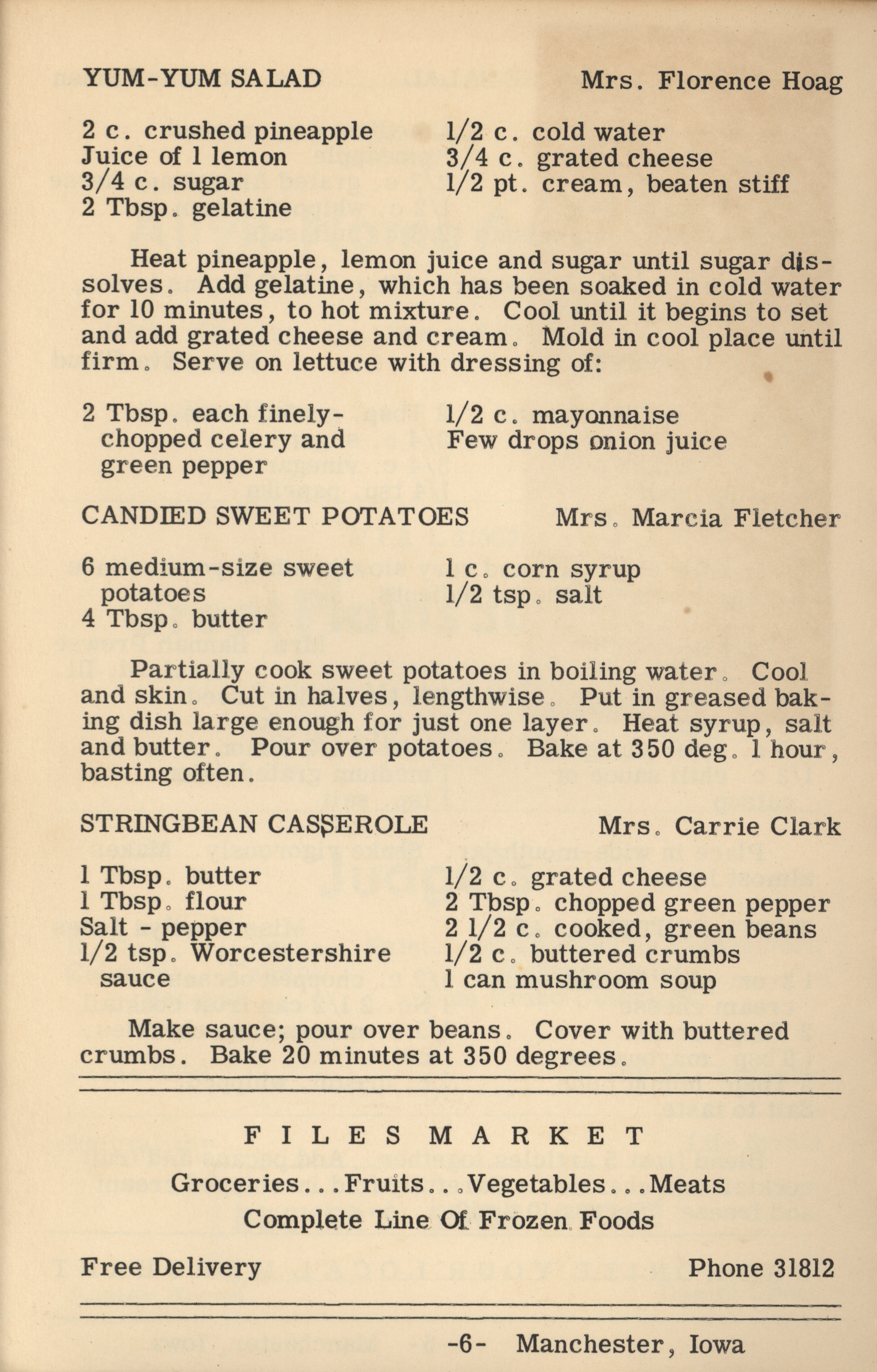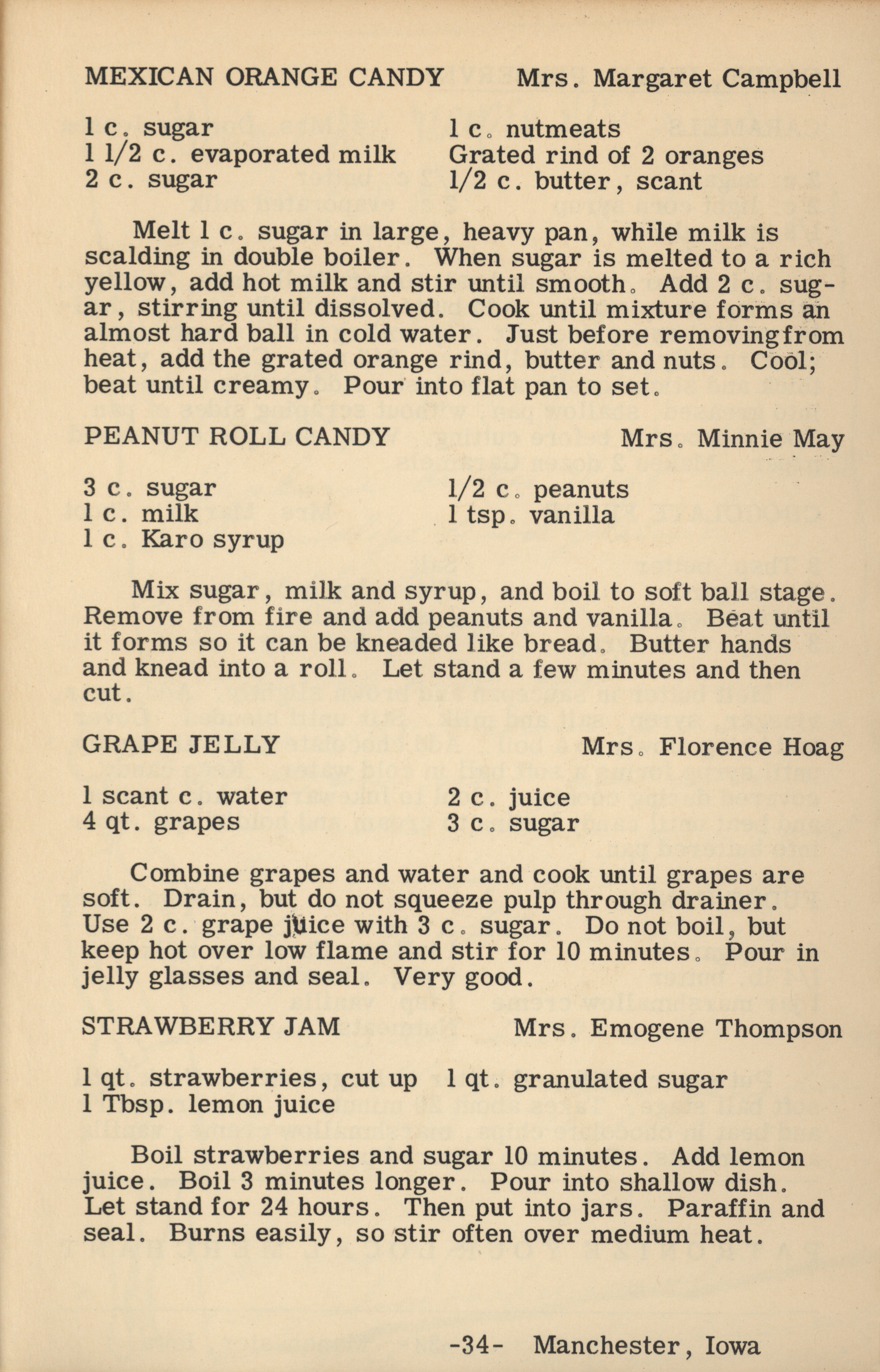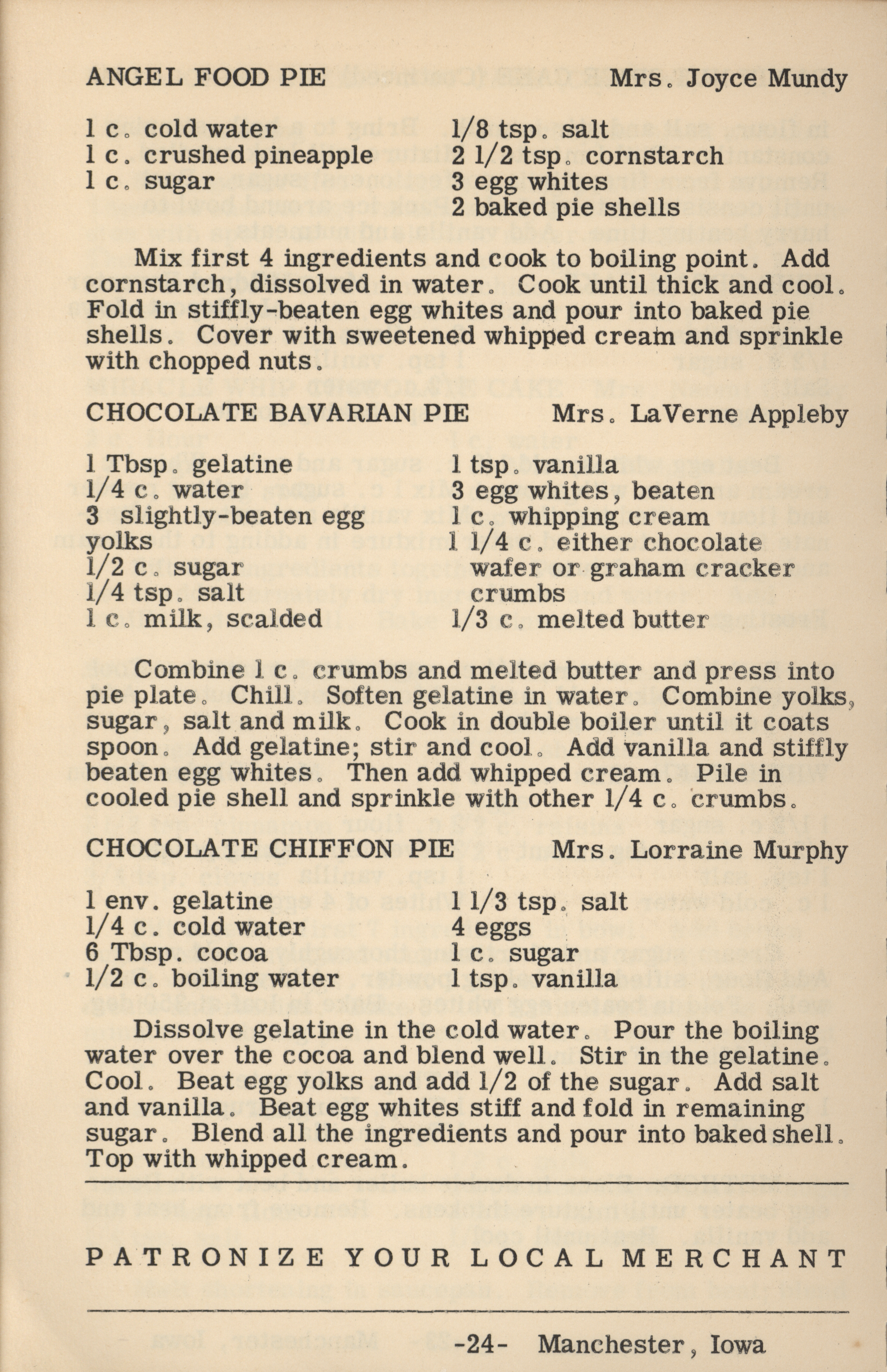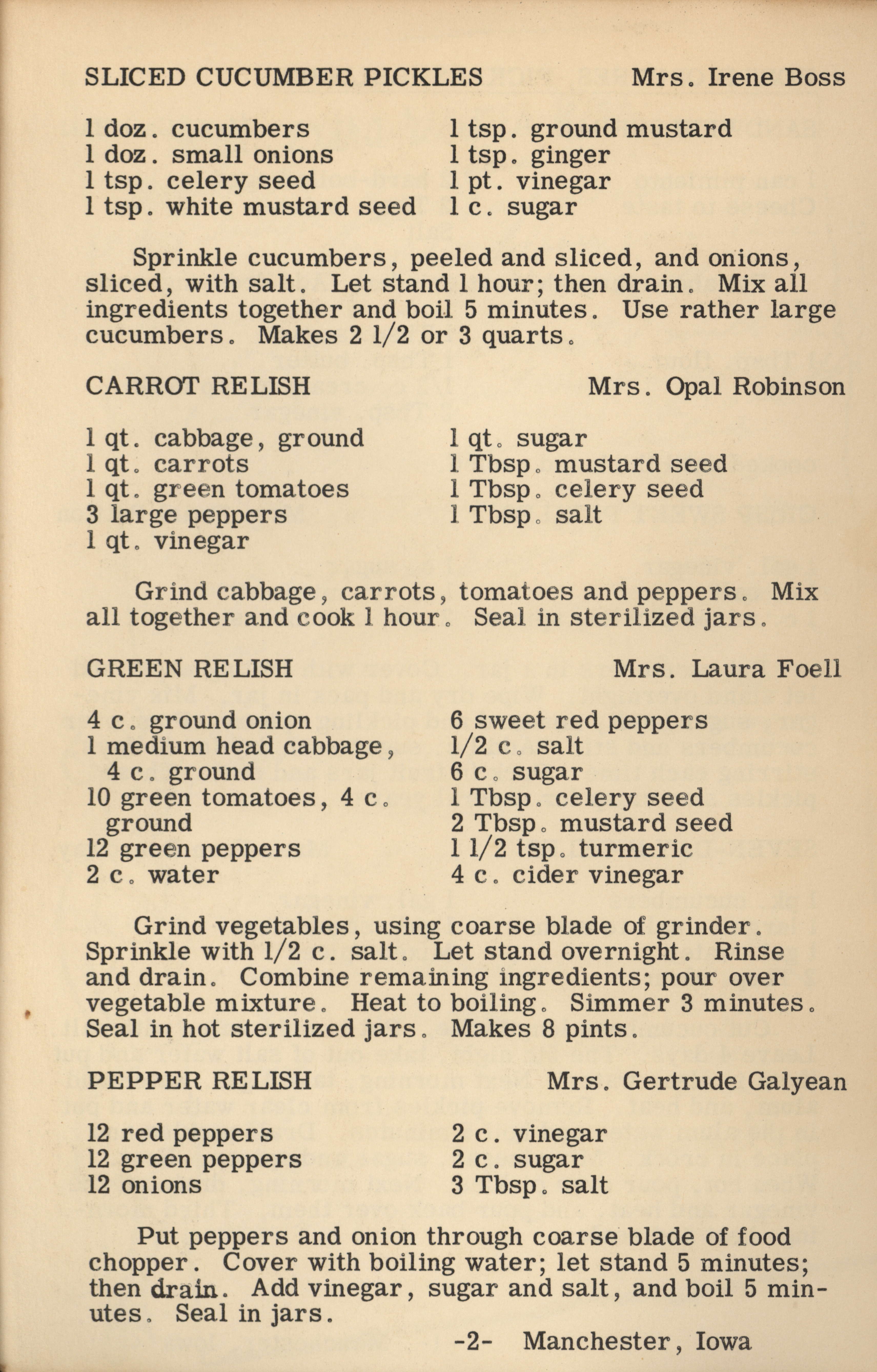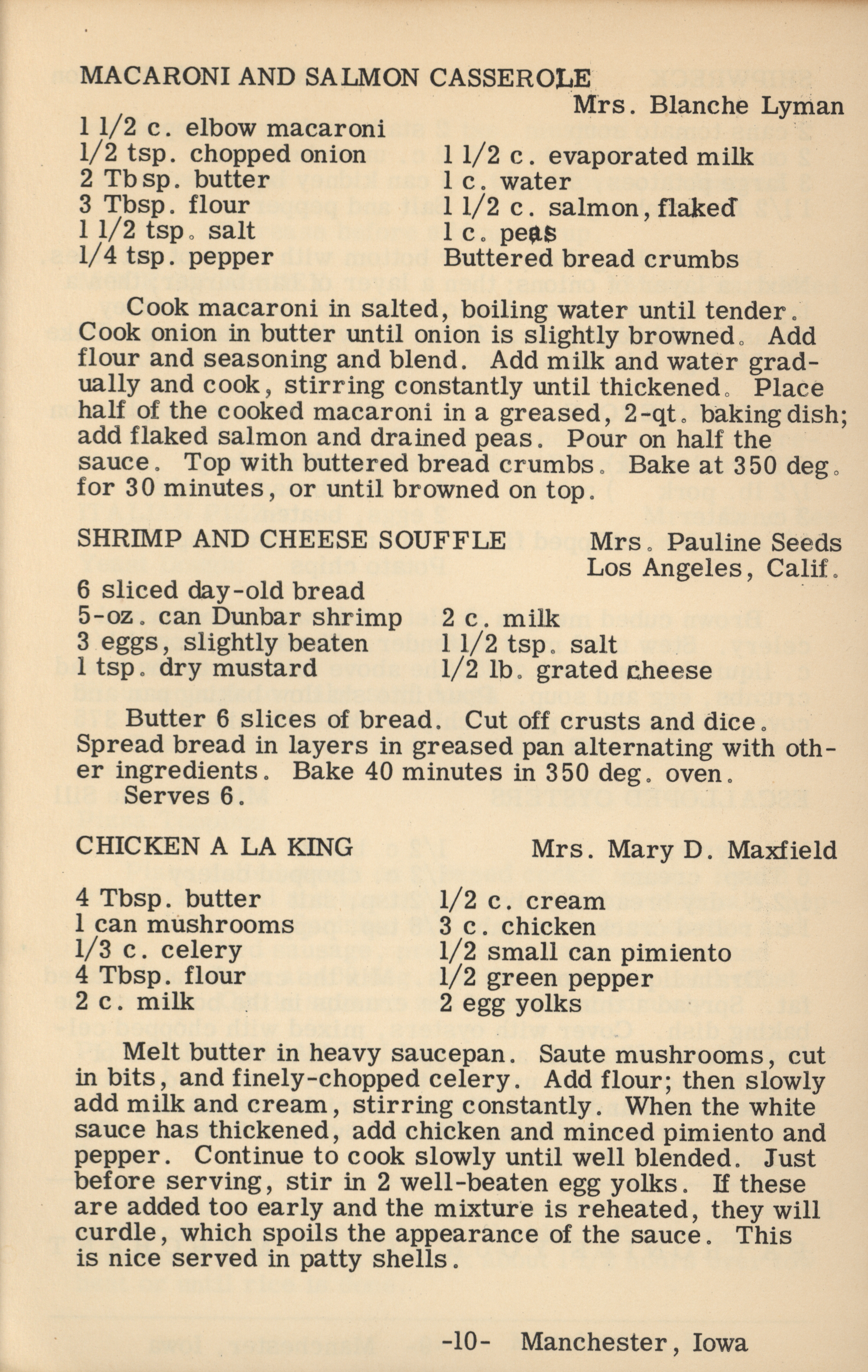- A cookbook compiled by the Orient Chapter of the Order of the Eastern Star in Manchester, Iowa. Along with recipes, it includes sample menus for a variety of diets, a list of vegetable varieties that are good for freezing, hints on cooking frozen foods, and tips on cooking for large amounts of people. The book is also filled with handwritten and typed recipes that have been added by the owner, and a list of birthdays and Christmas card recipients.