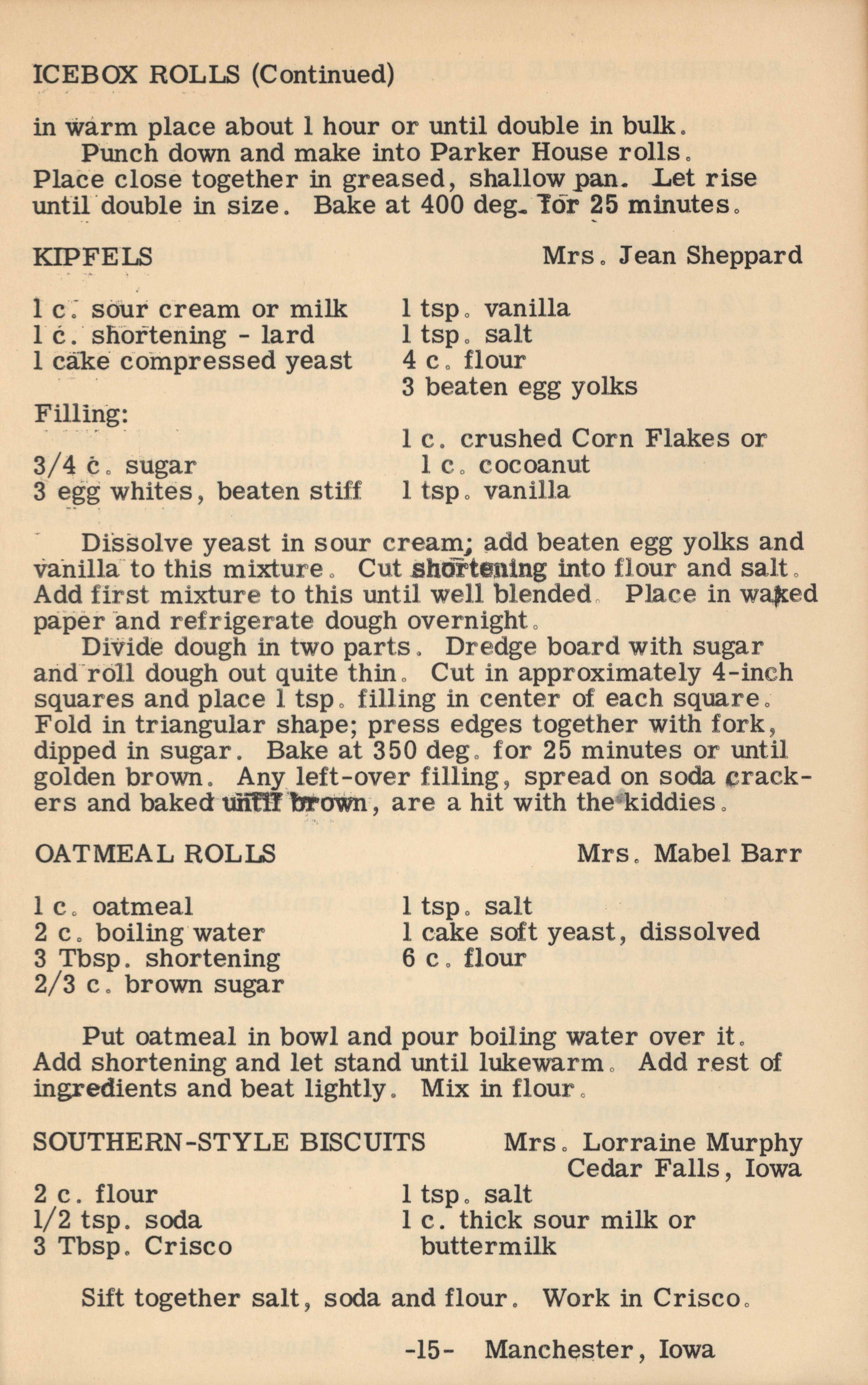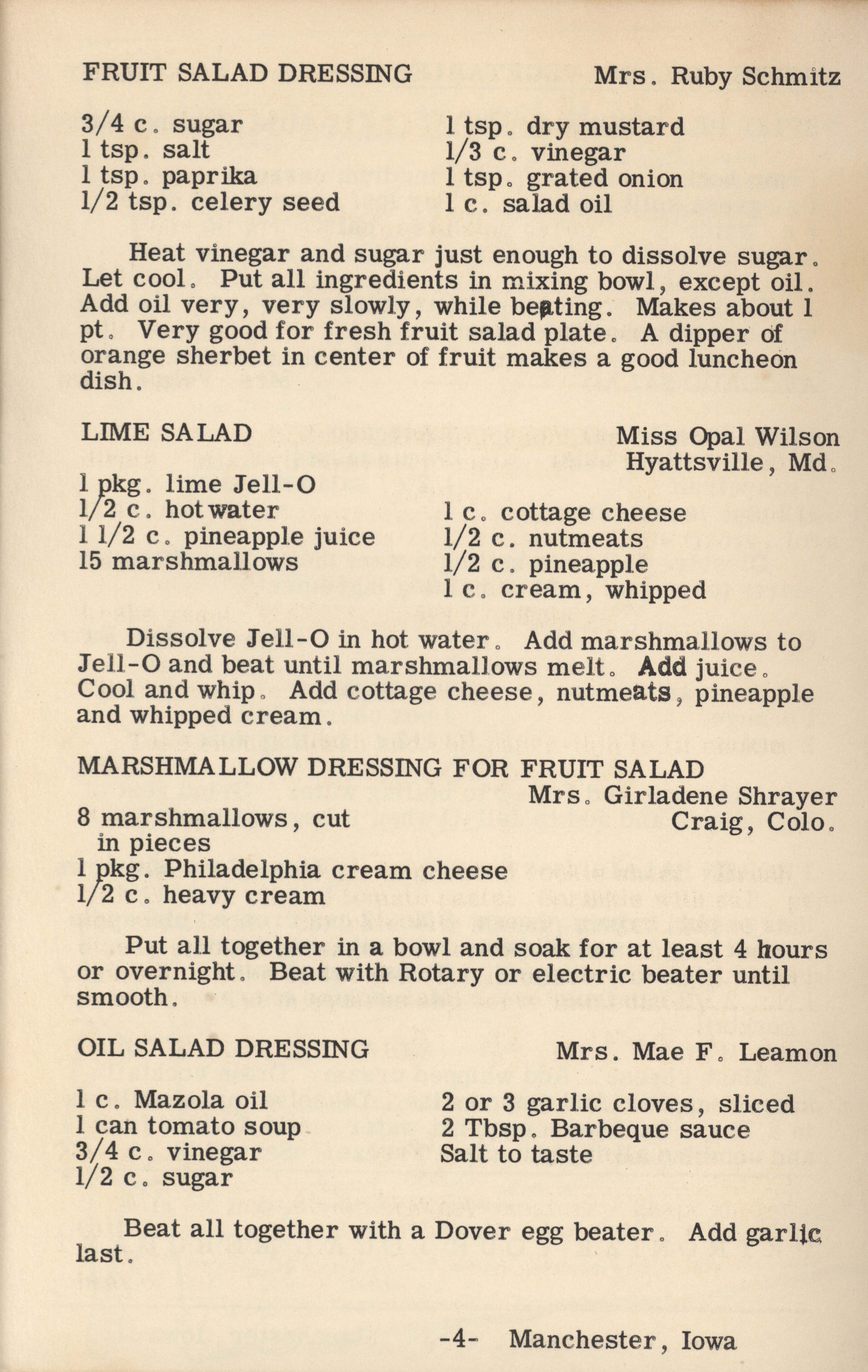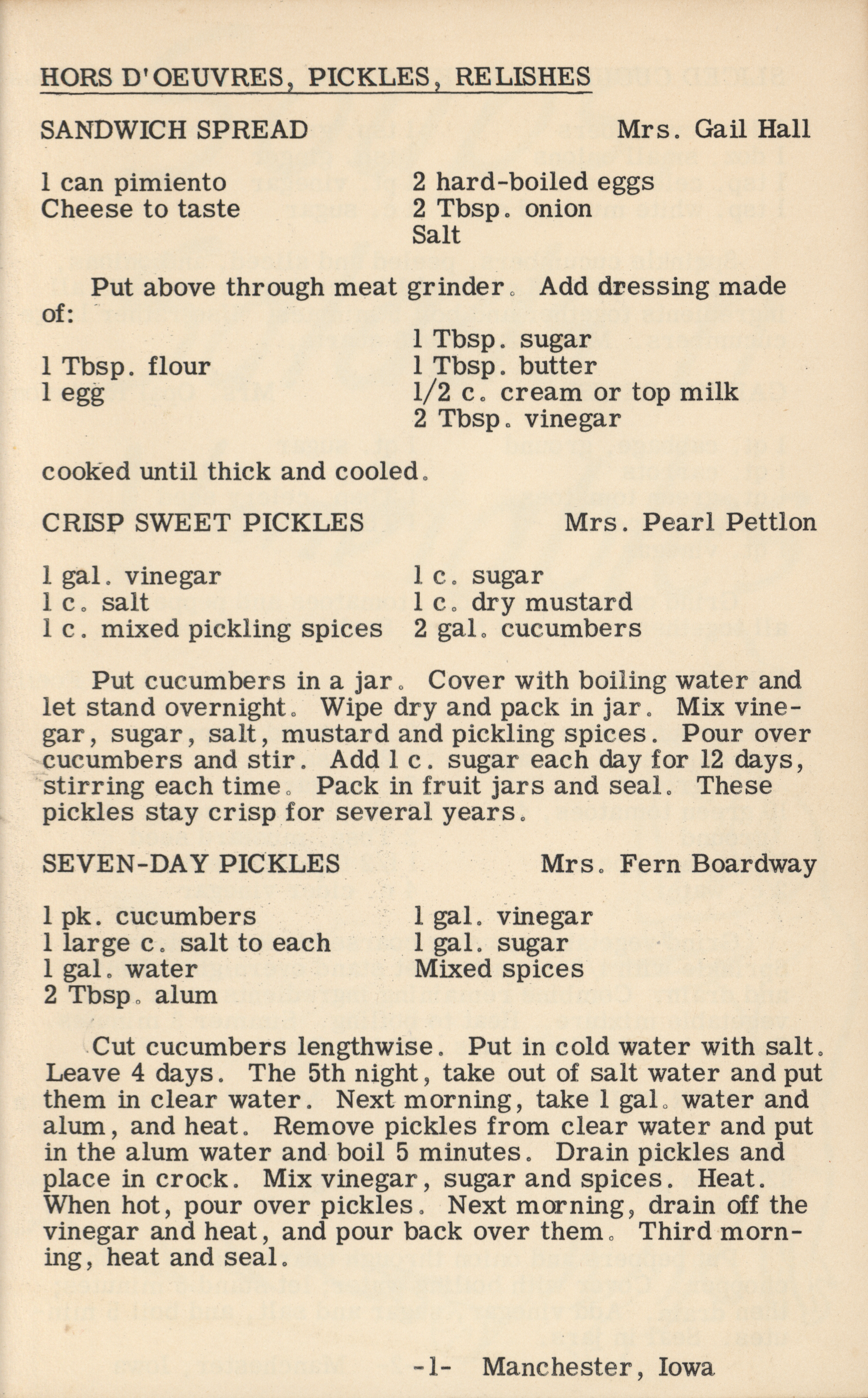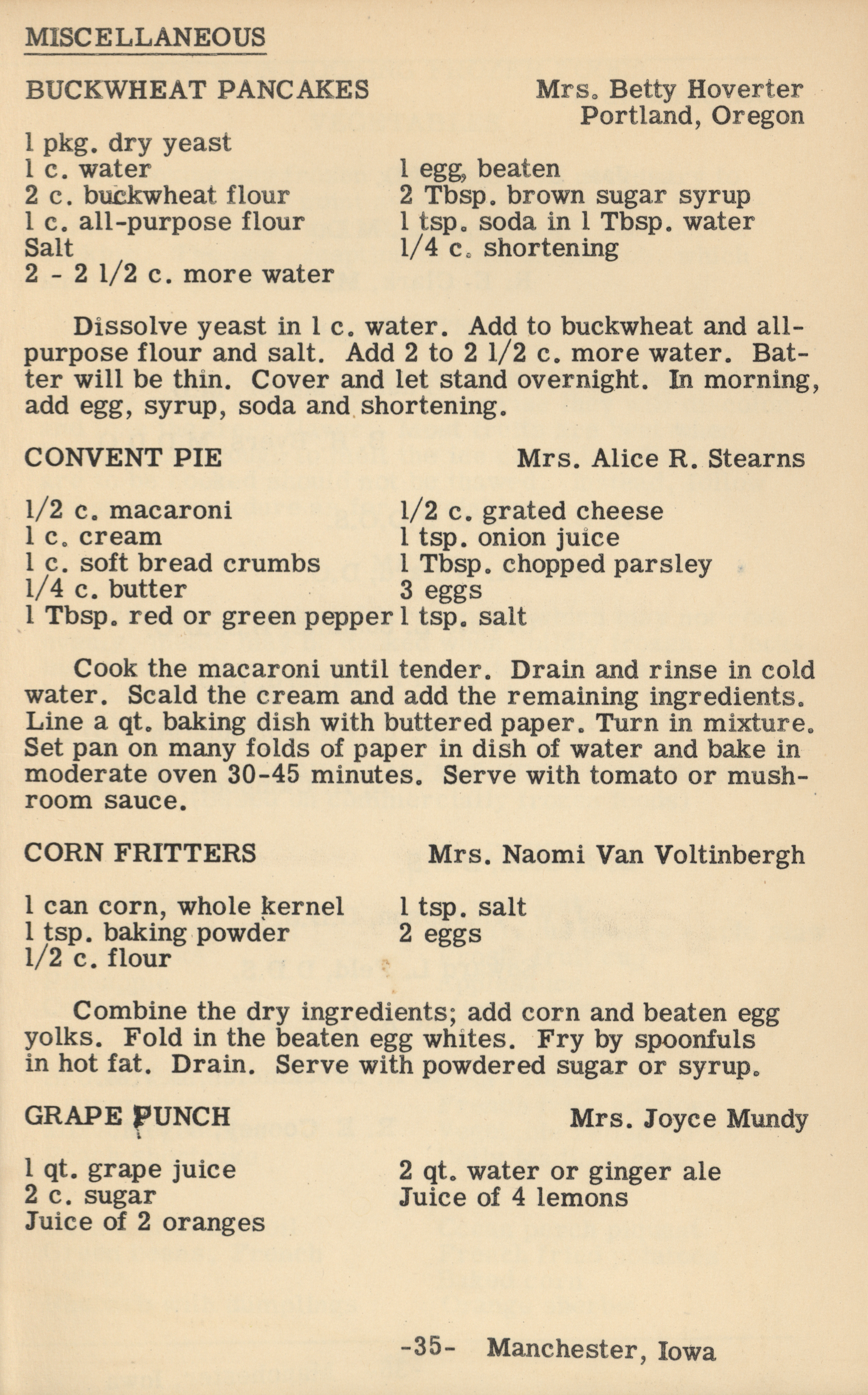 - A cookbook compiled by the Orient Chapter of the Order of the Eastern Star in Manchester, Iowa. Along with recipes, it includes sample menus for a variety of diets, a list of vegetable varieties that are good for freezing, hints on cooking frozen foods, and tips on cooking for large amounts of people. The book is also filled with handwritten and typed recipes that have been added by the owner, and a list of birthdays and Christmas card recipients.
