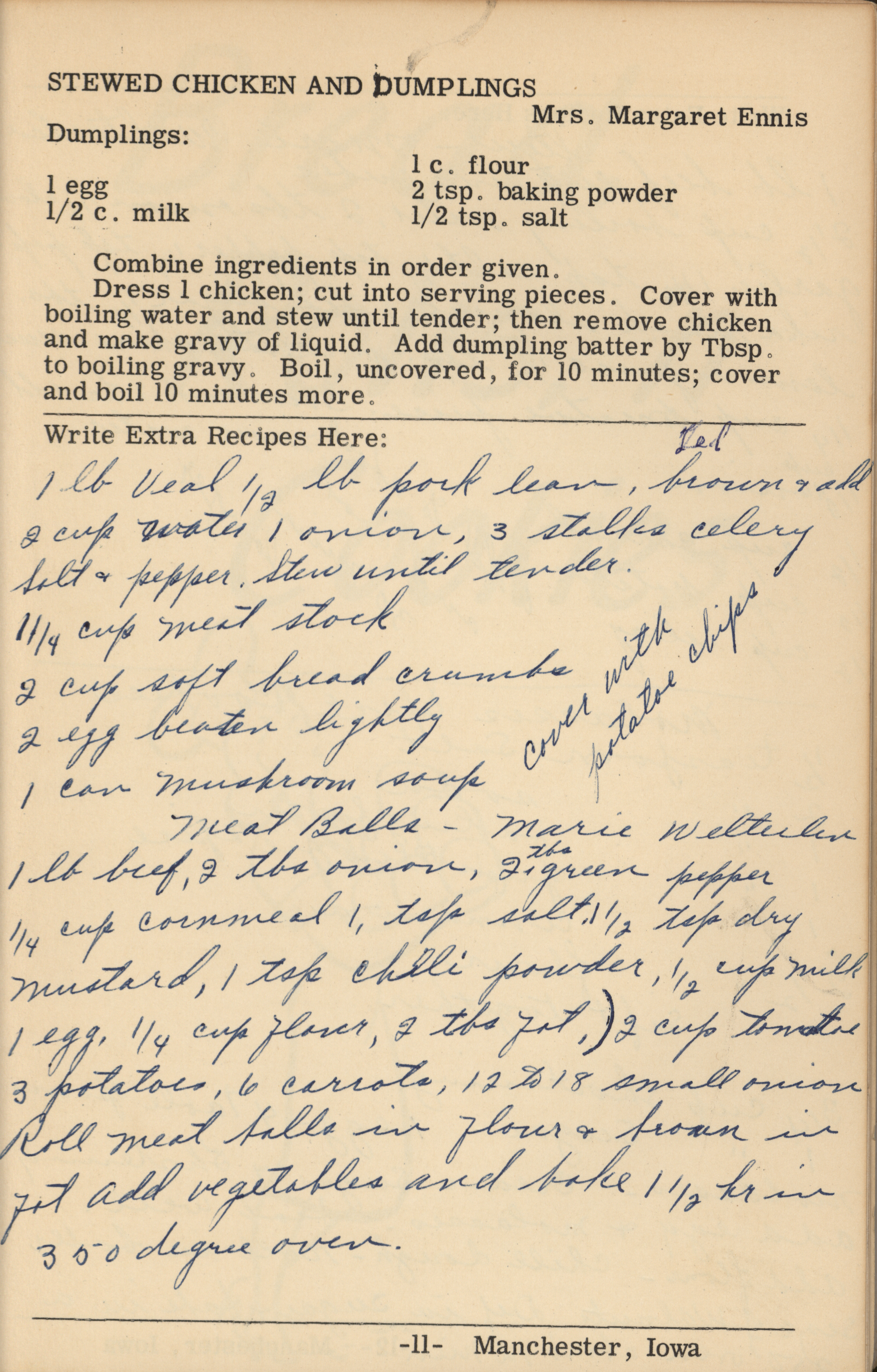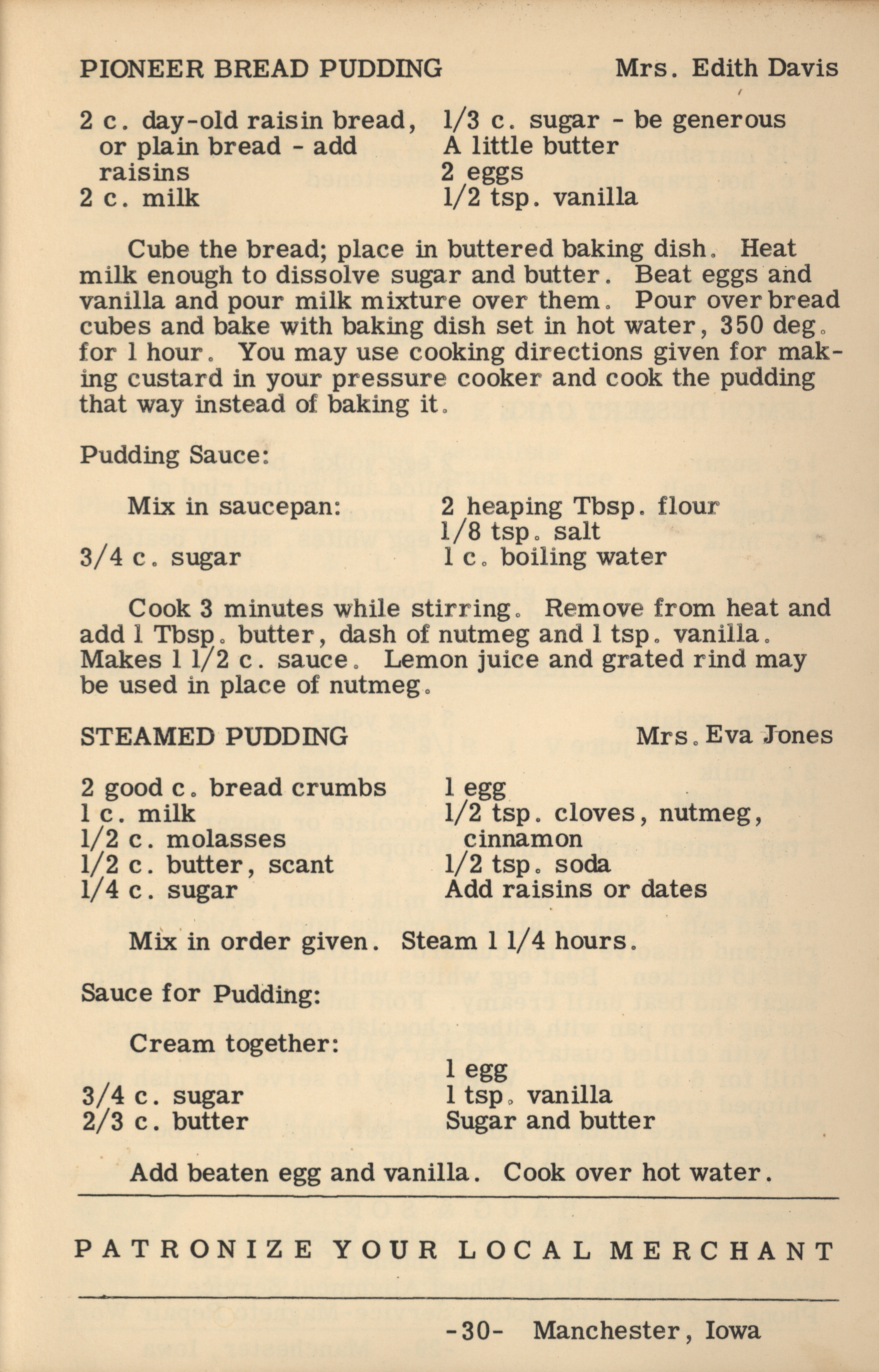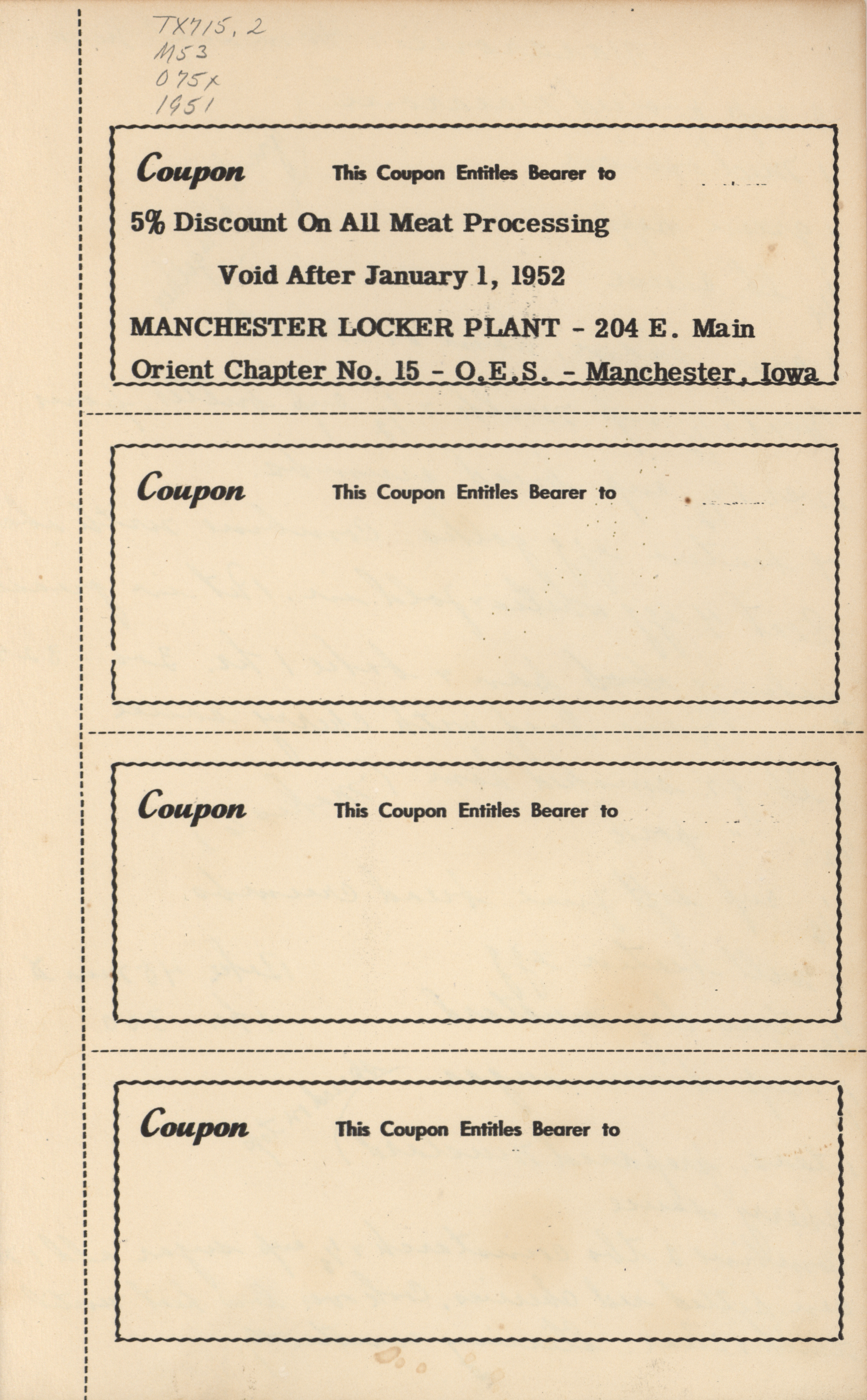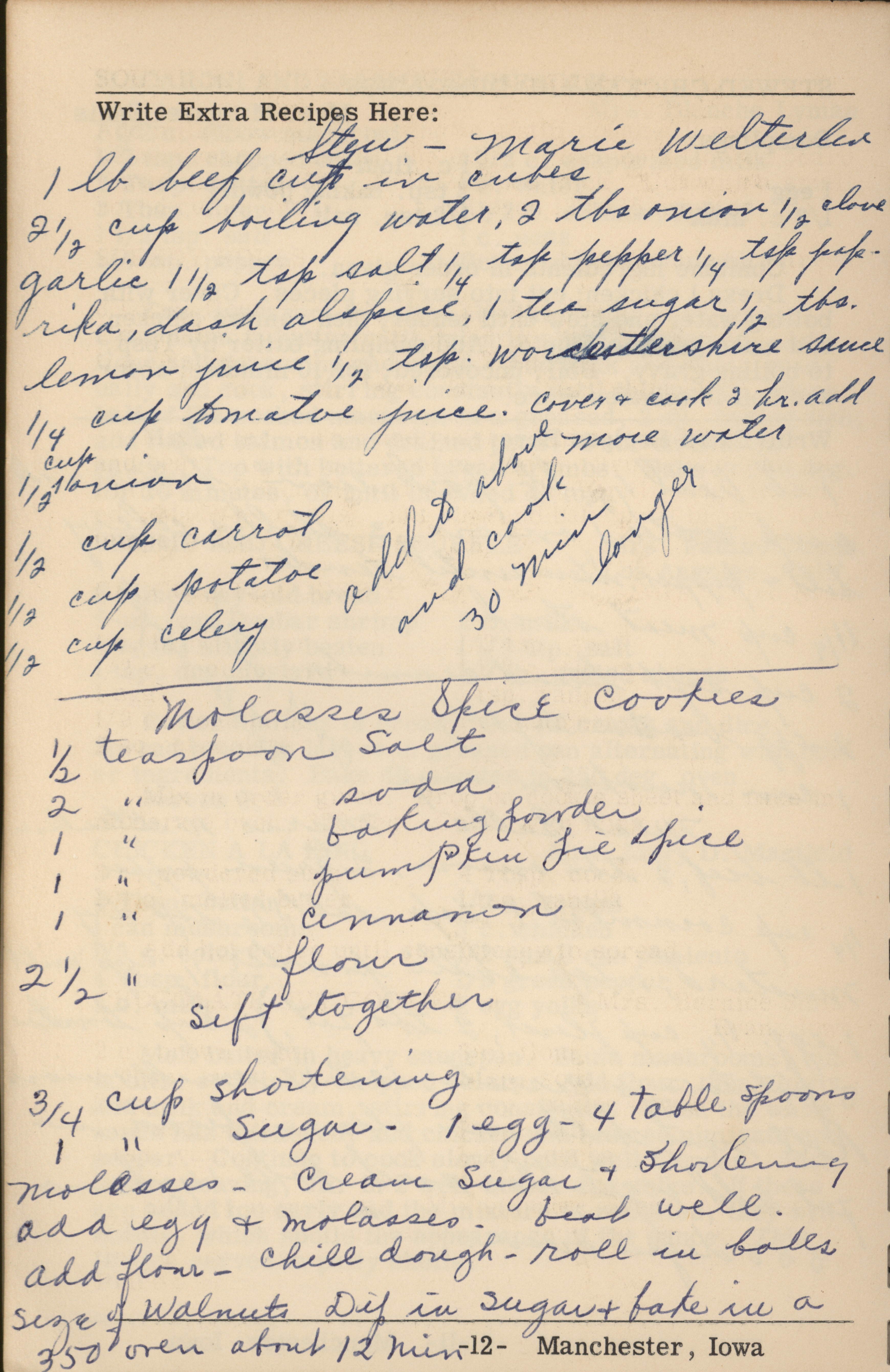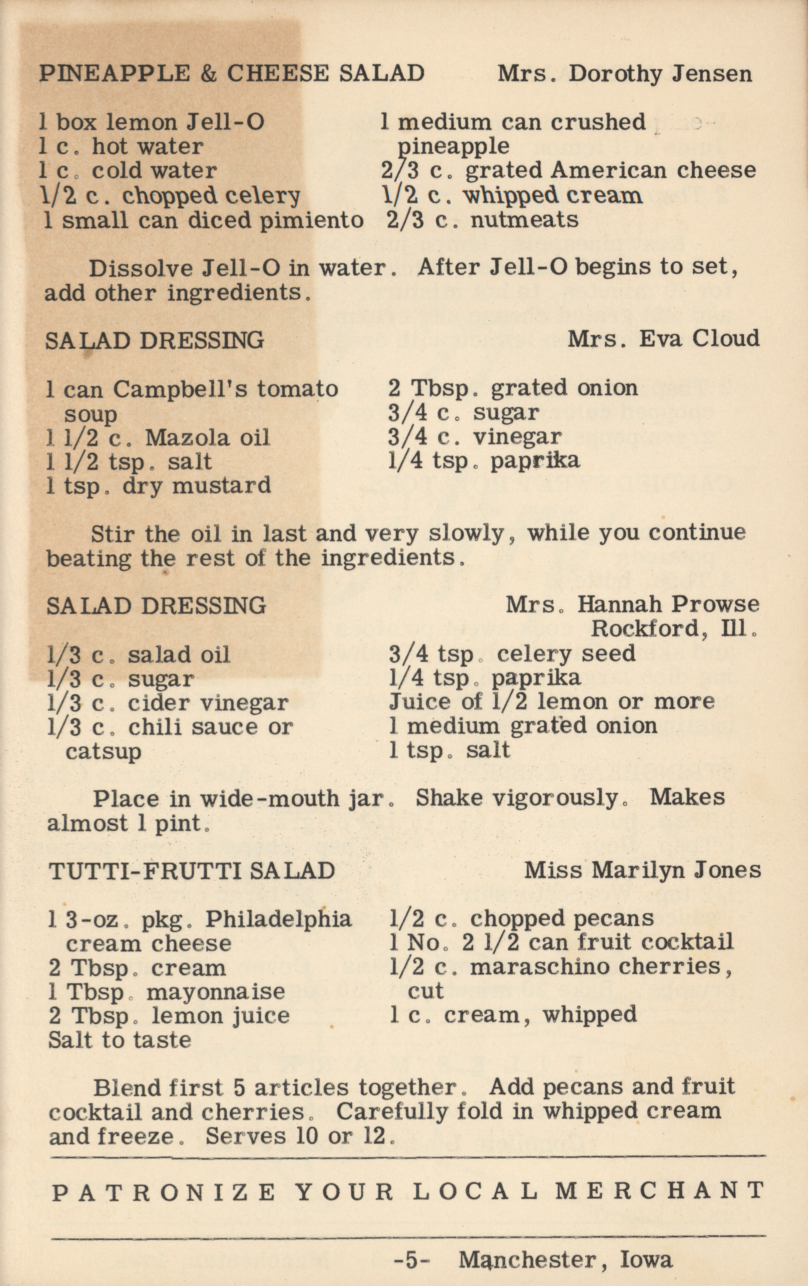 - A cookbook compiled by the Orient Chapter of the Order of the Eastern Star in Manchester, Iowa. Along with recipes, it includes sample menus for a variety of diets, a list of vegetable varieties that are good for freezing, hints on cooking frozen foods, and tips on cooking for large amounts of people. The book is also filled with handwritten and typed recipes that have been added by the owner, and a list of birthdays and Christmas card recipients.
