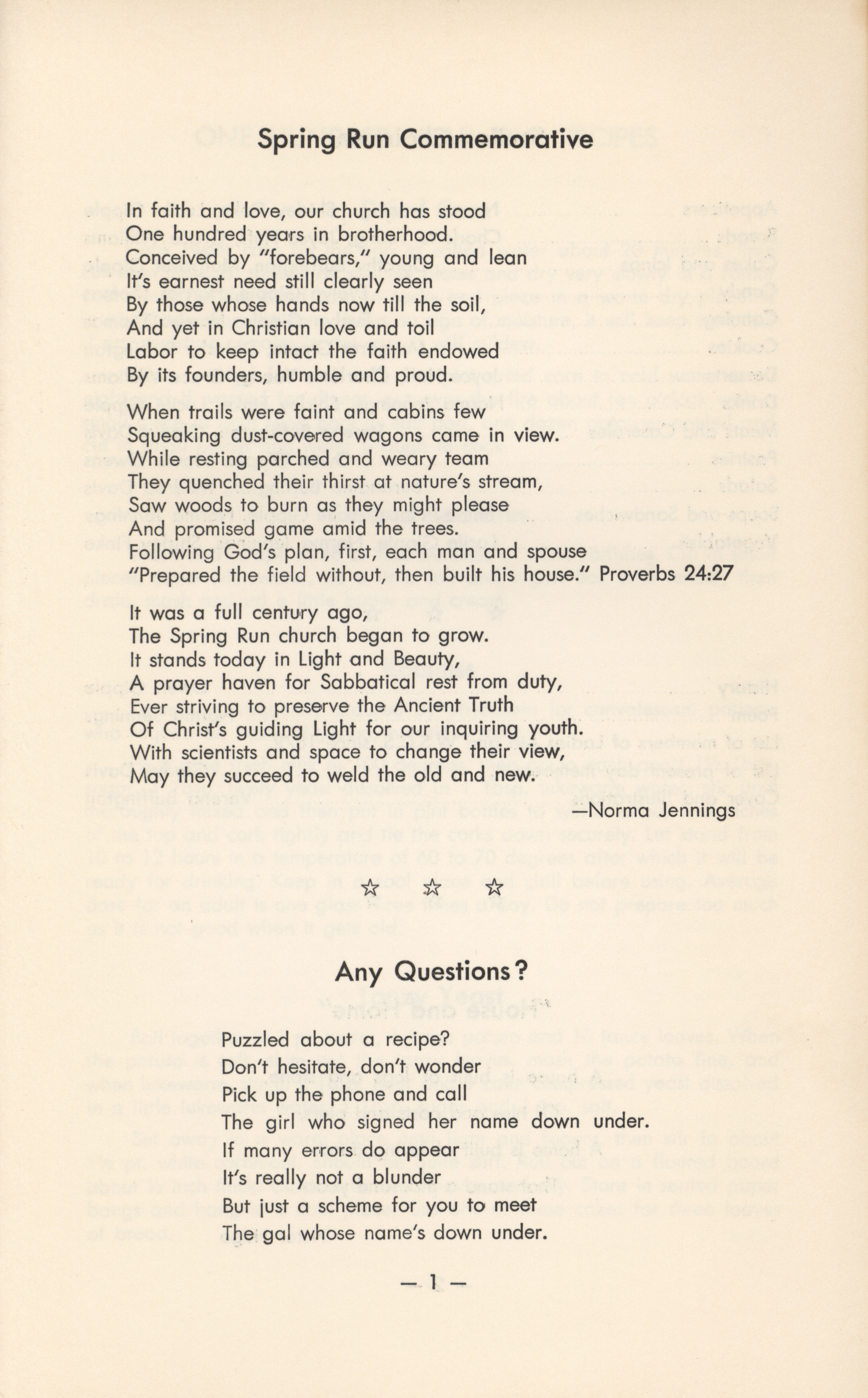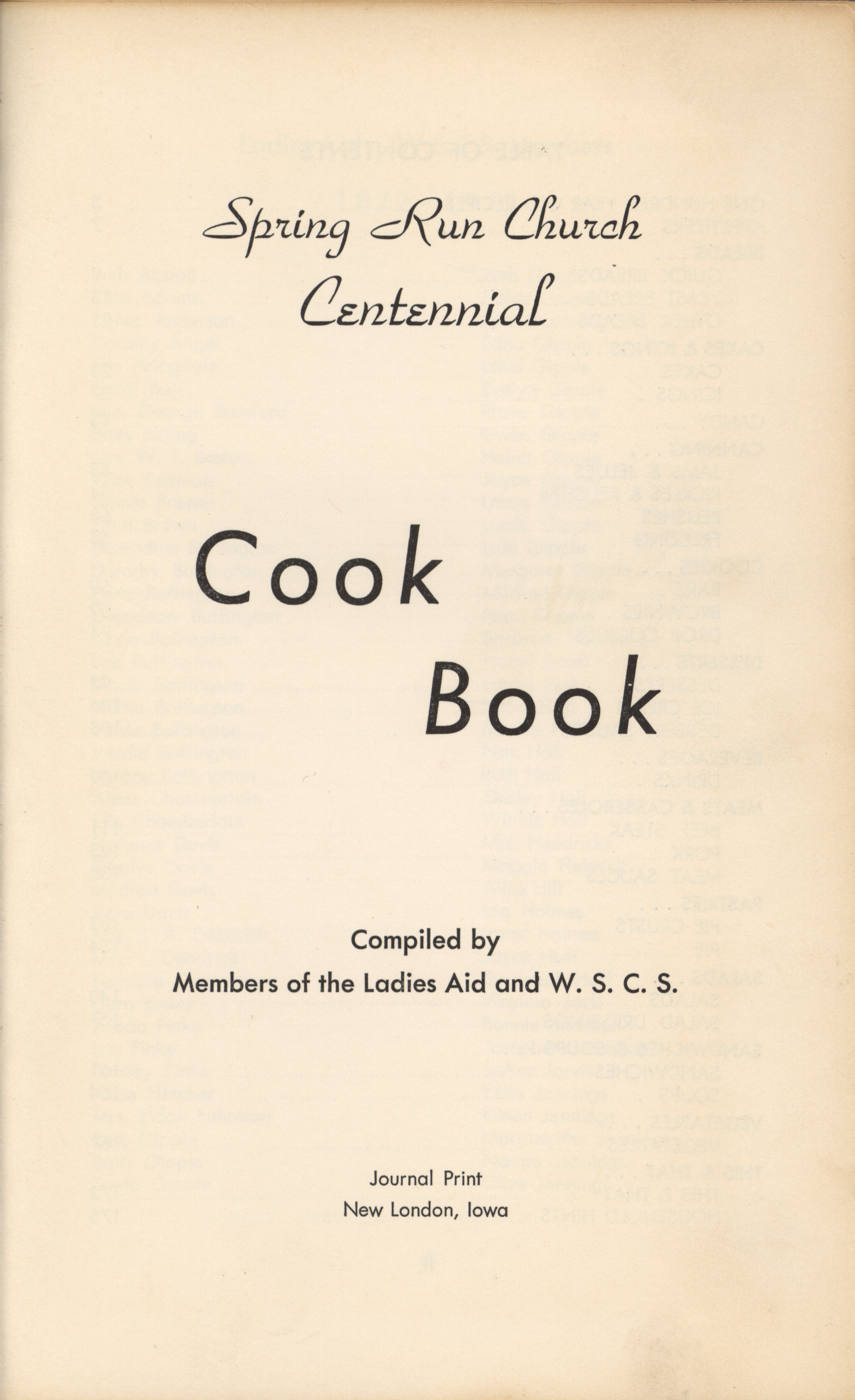 - "Spring Run church centennial cook book, 1872-1972", Cookbook Collection, Iowa State University Library Digital Collections