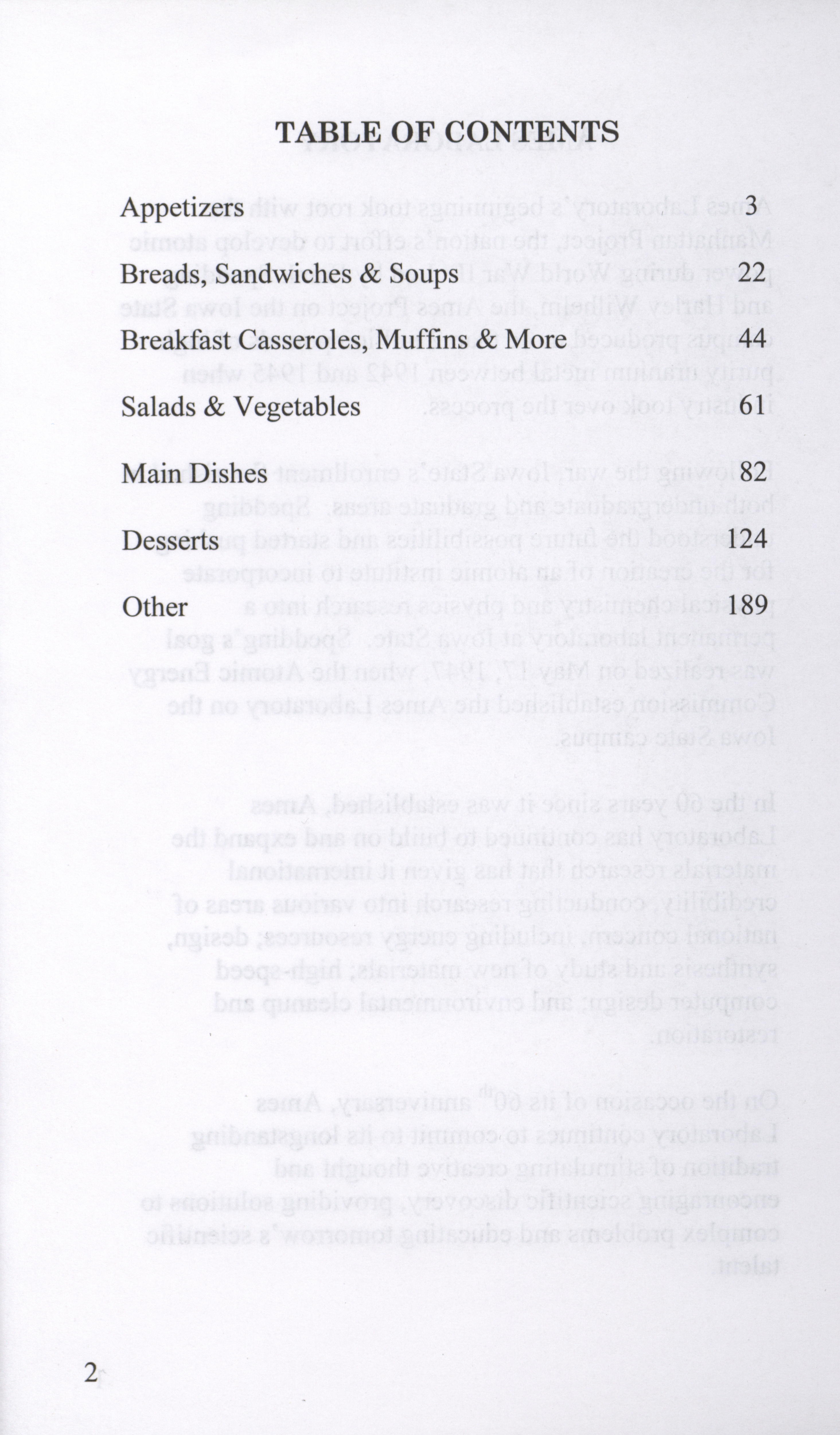 - A commemorative cookbook compiled to celebrate the 60th anniversary of the Ames Laboratory, featuring recipes contributed by staff and affiliates. The cookbook is organized into sections by recipe type, such as appetizers, main dishes, desserts, and more.