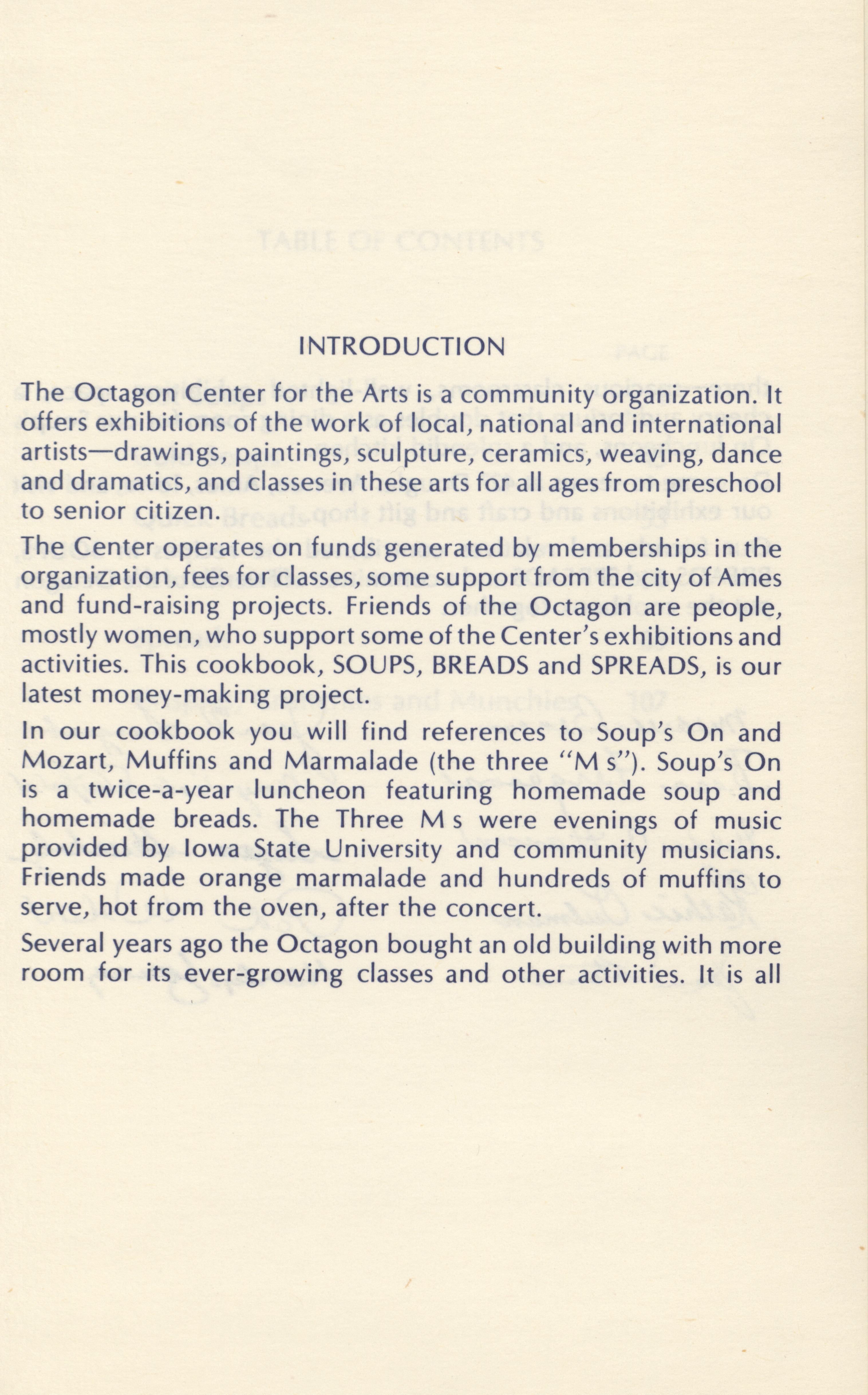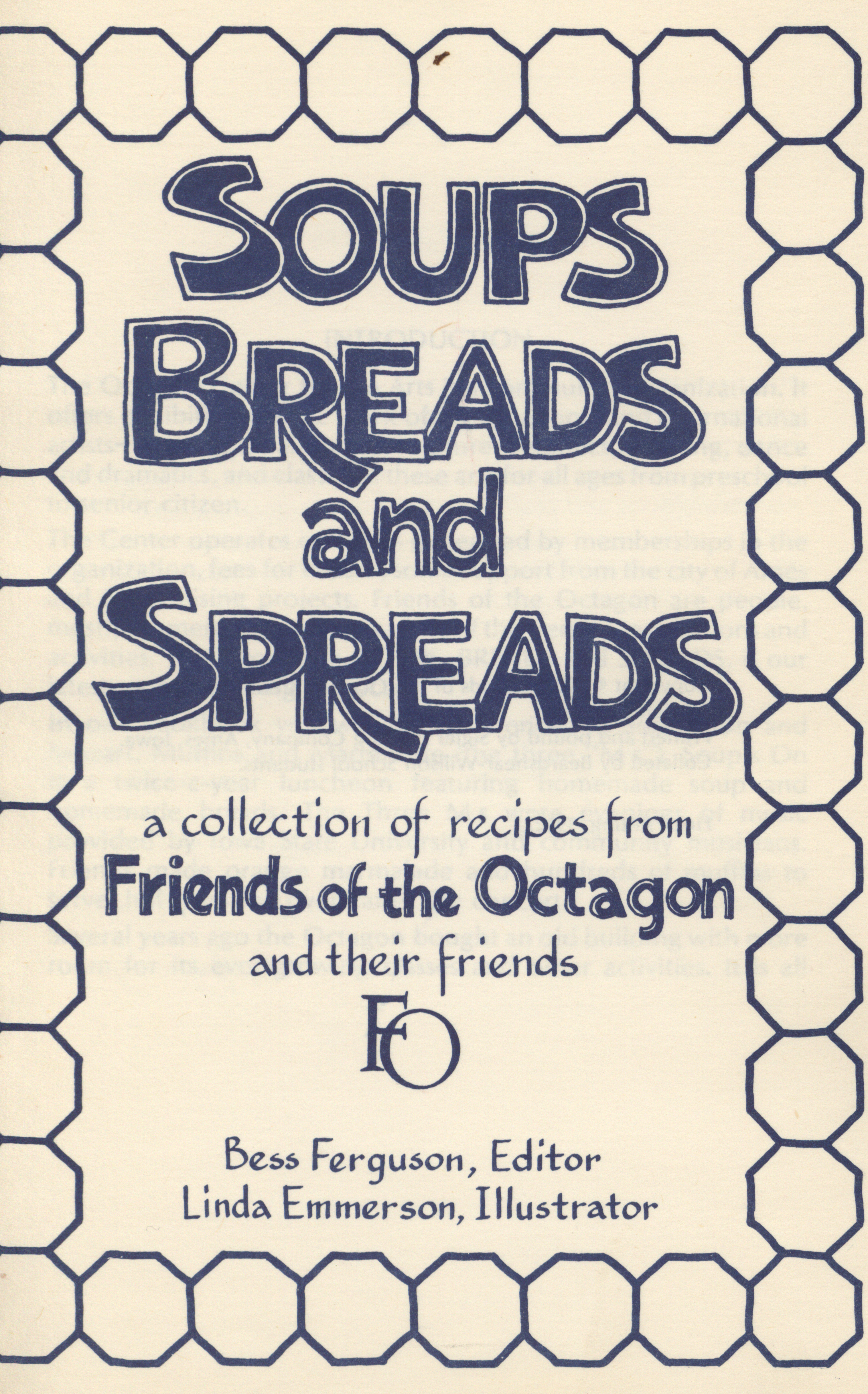 - This cookbook was created by the Friends of the Octagon Center of the Arts to raise funds. It includes recipes for hot and cold soups, breads, spreads, and snacks.
