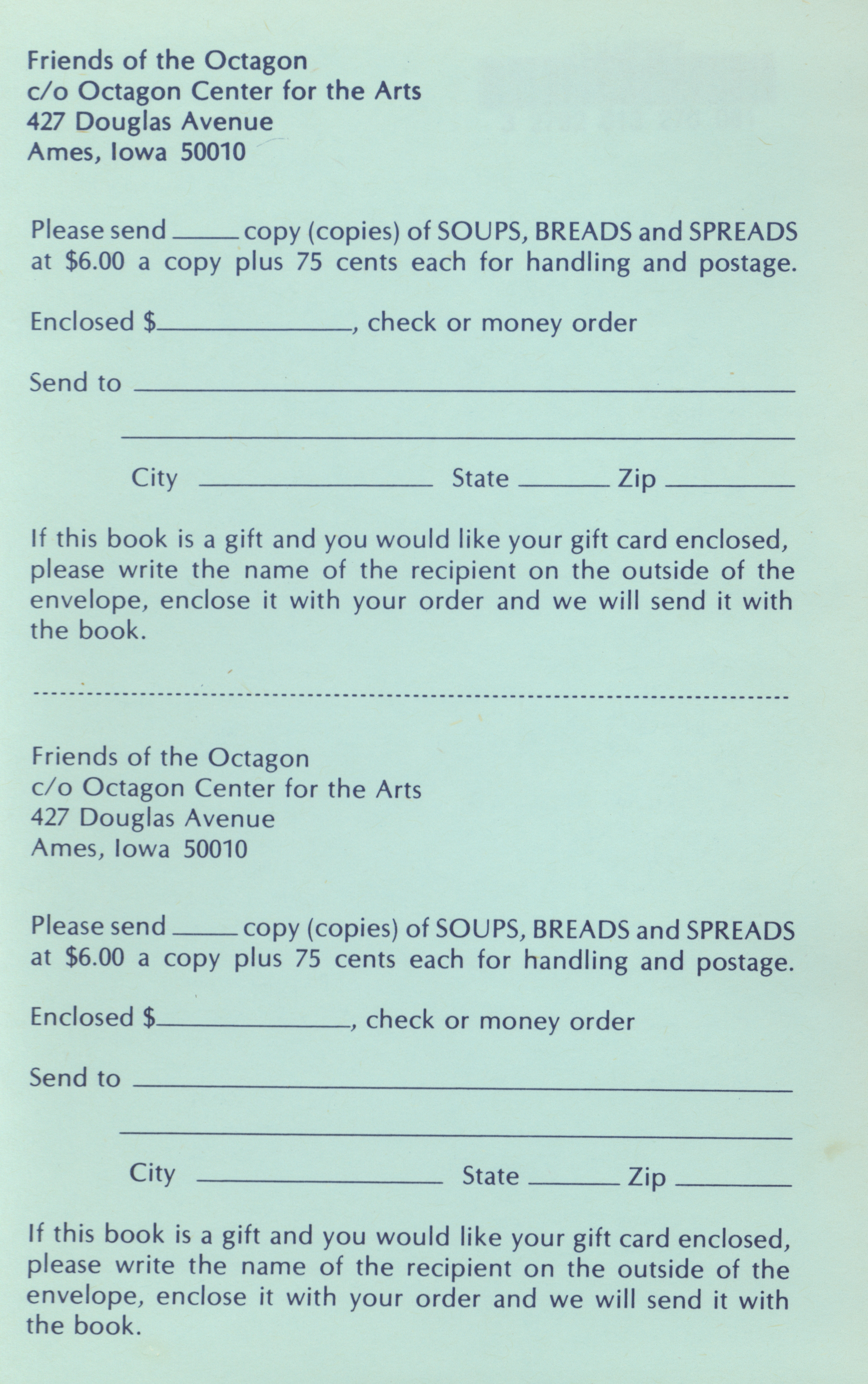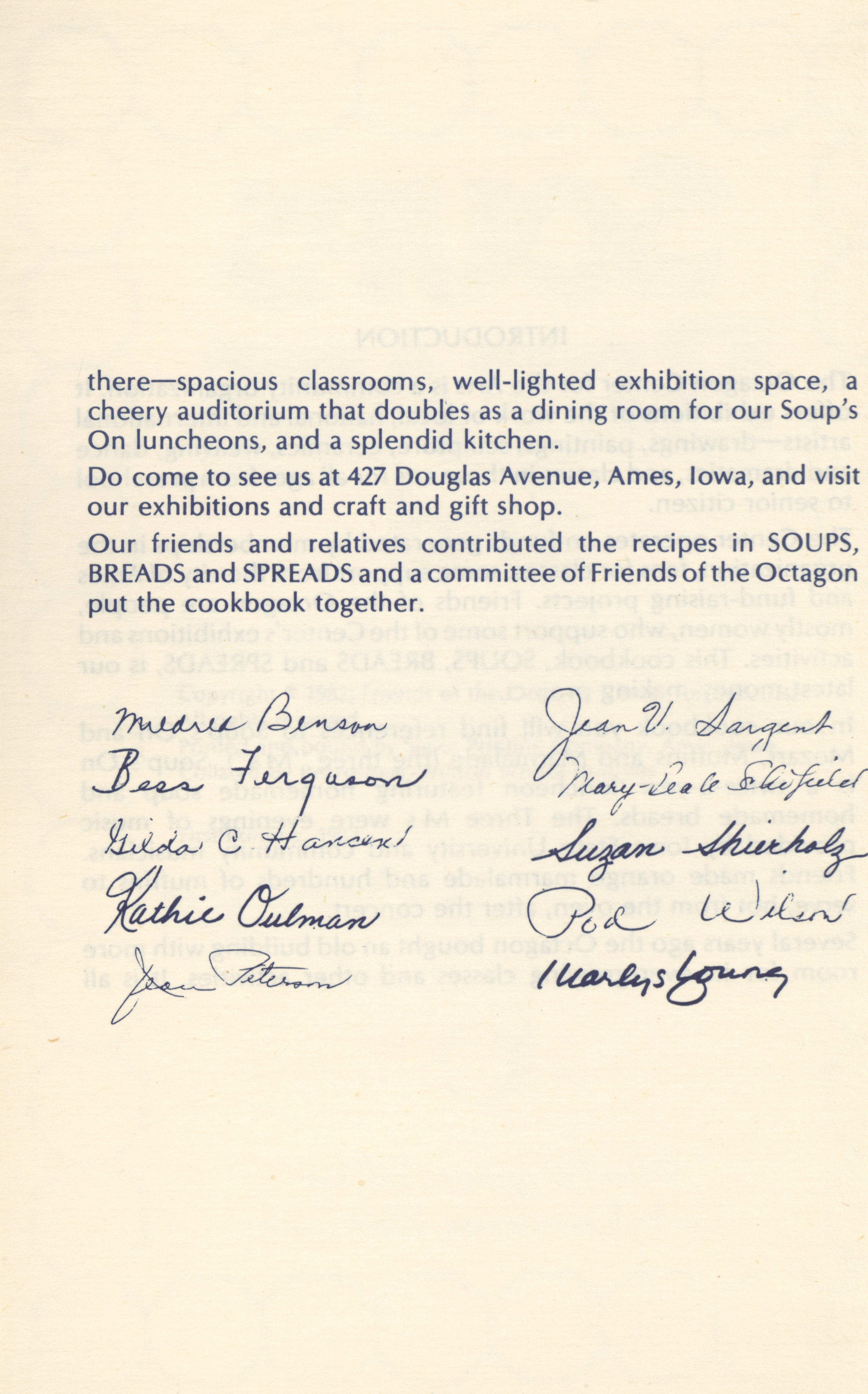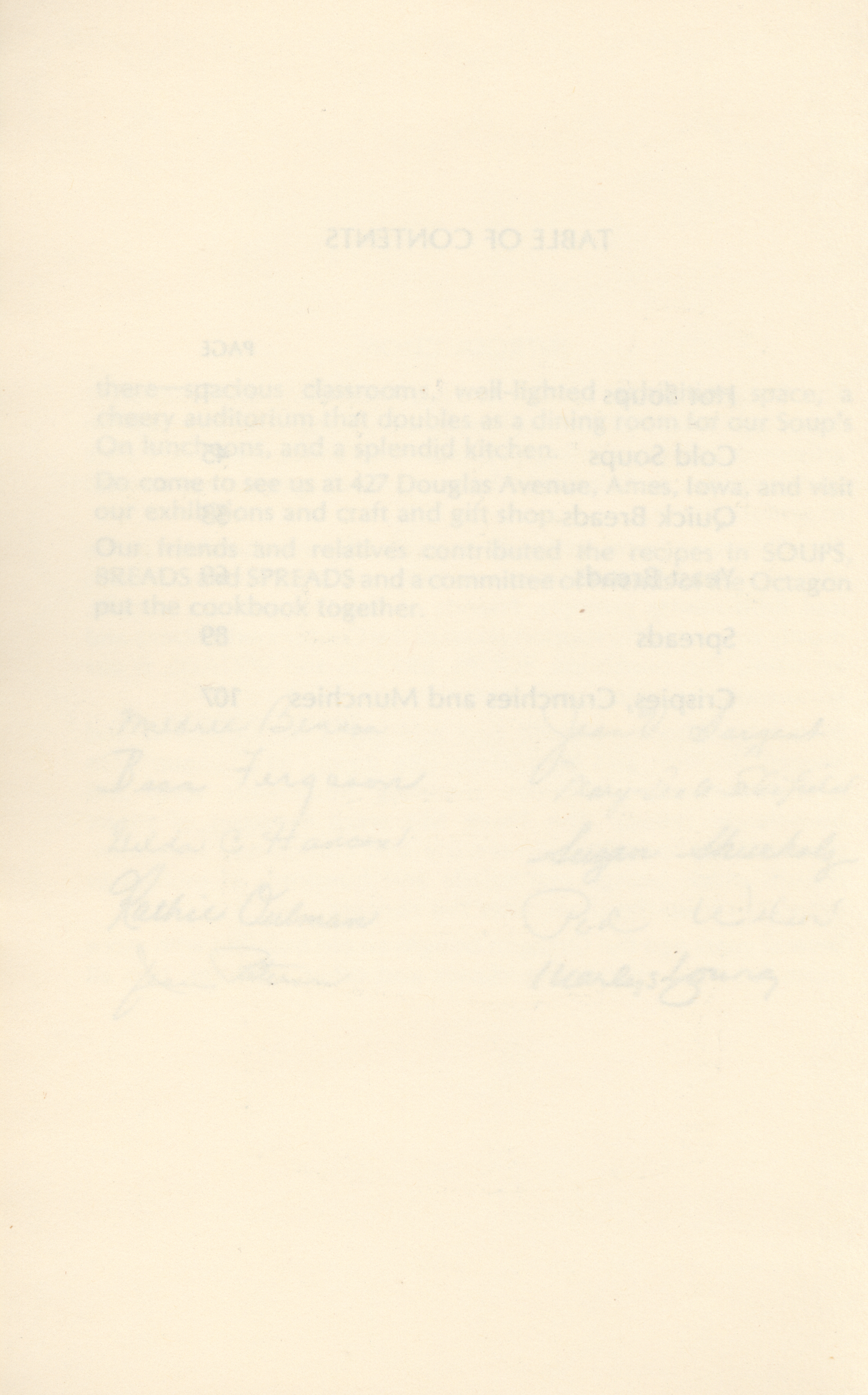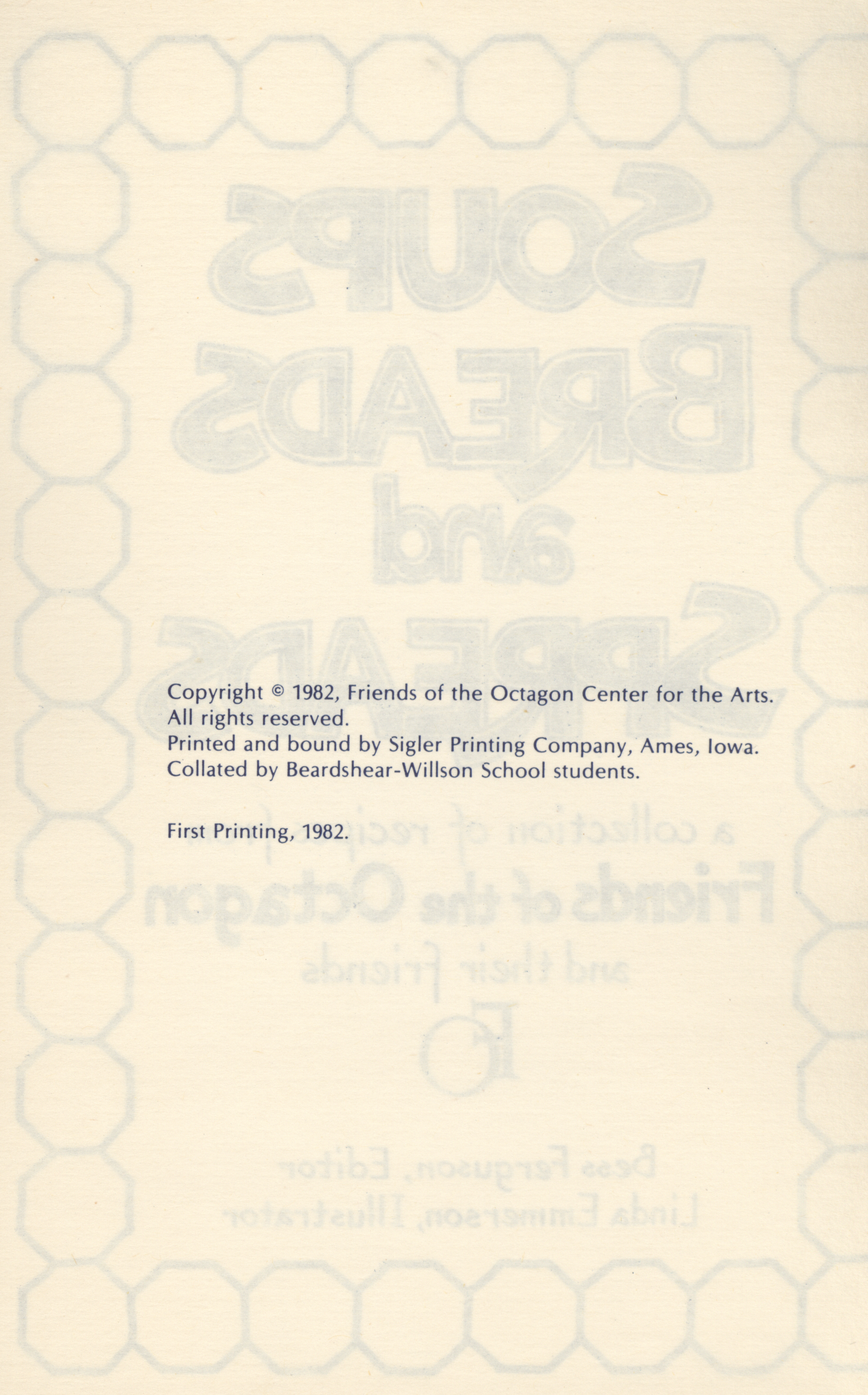 - "Soups breads and spreads: a collection of recipes from Friends of the Octagon and their friends", Cookbook Collection, Iowa State University Library Digital Collections