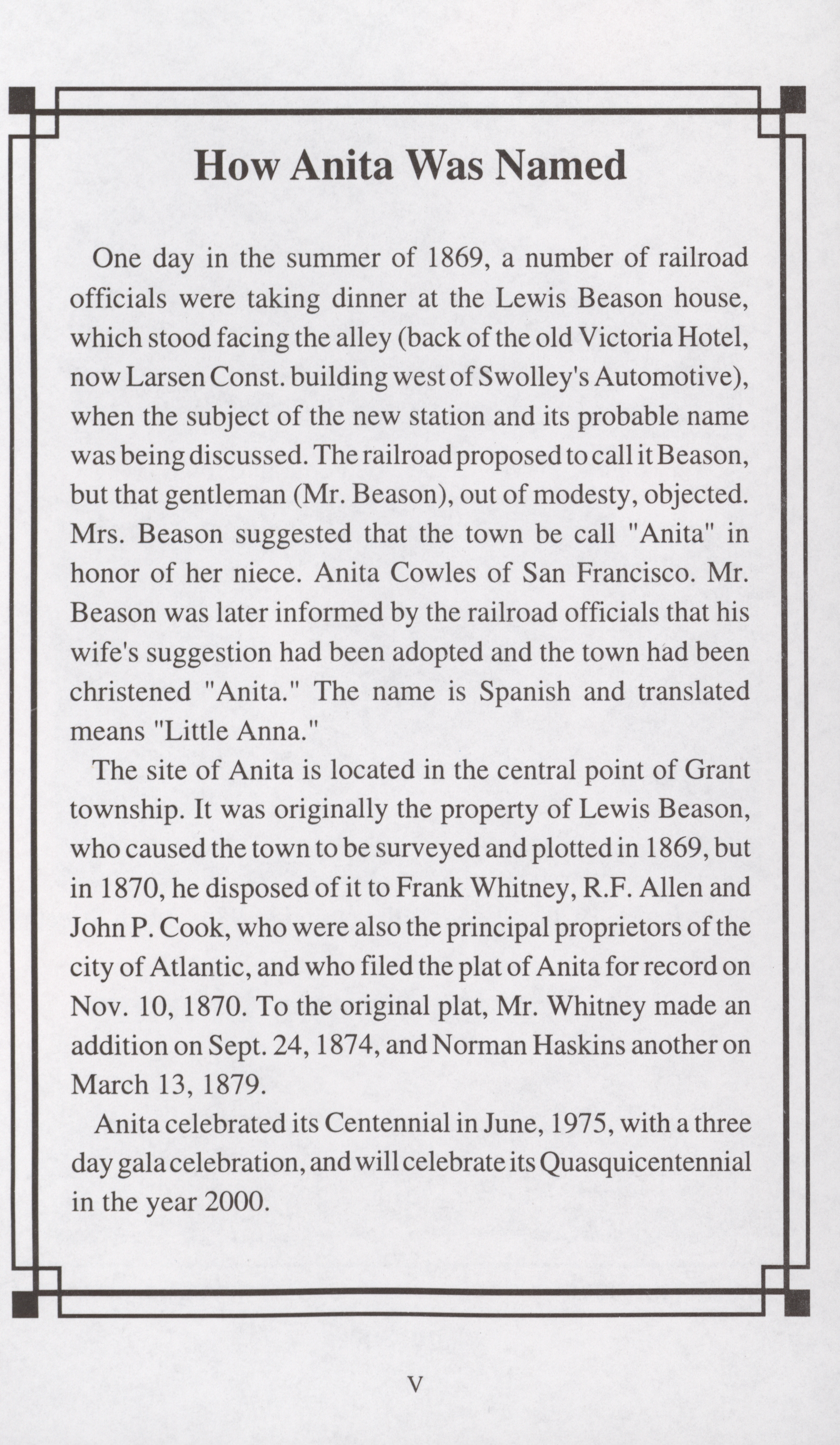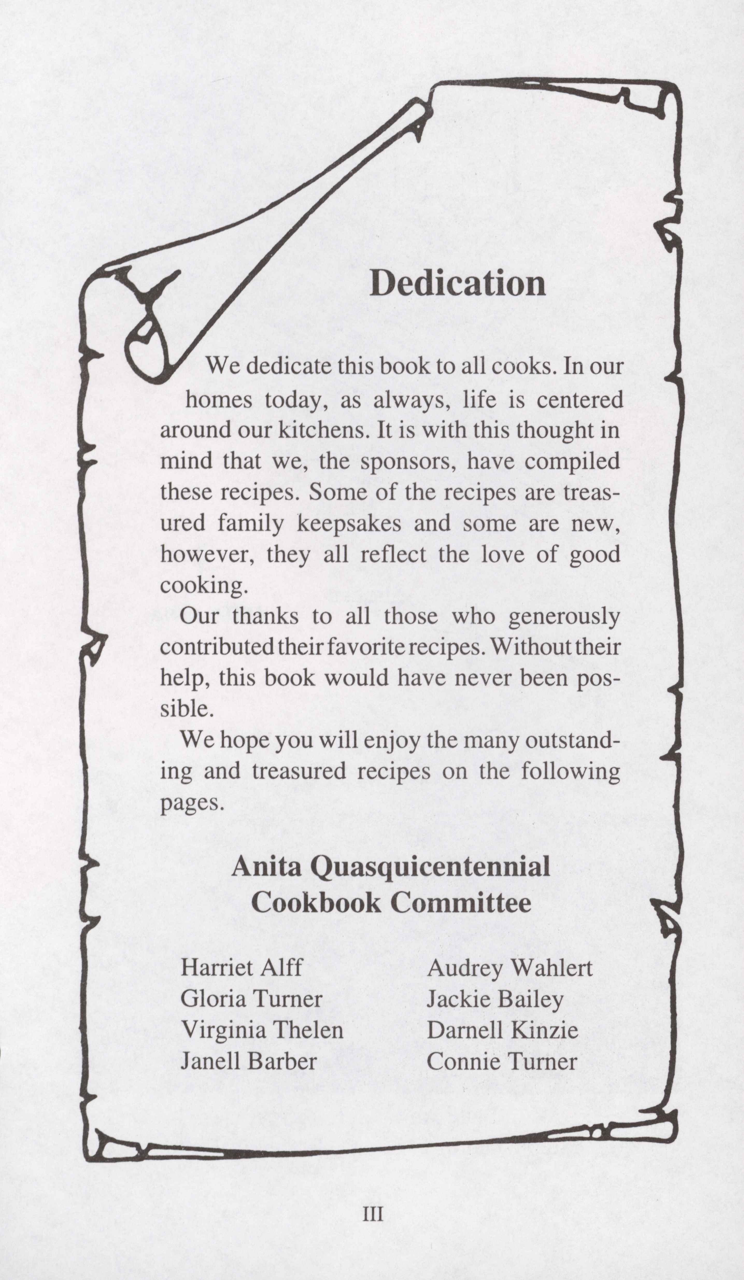 - "Anita quasquicentennial cookbook, 1875-2000", Cookbook Collection, Iowa State University Library Digital Collections
