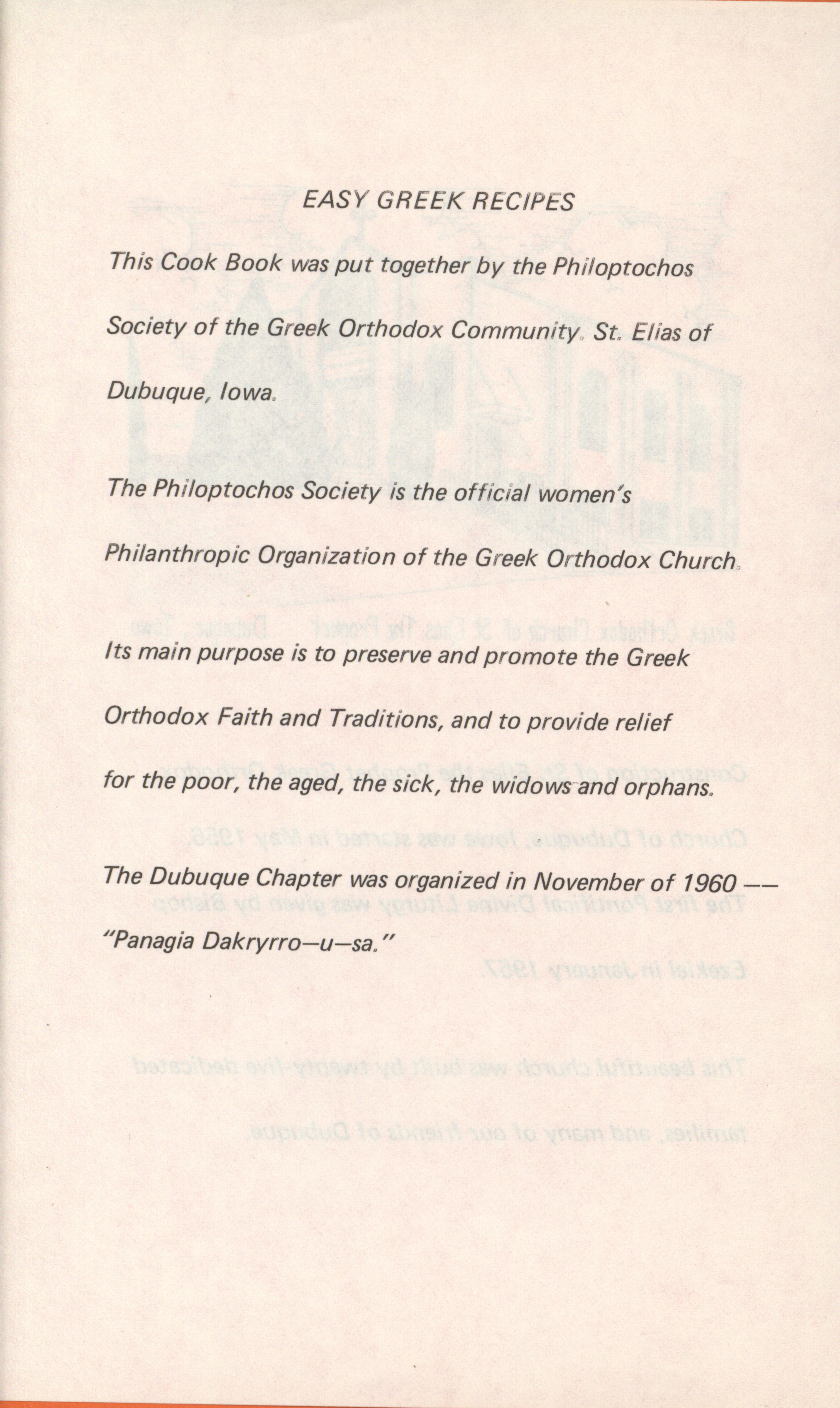 - This book of easy Greek recipes was compiled by the Philoptochos Society of the Greek Orthodox Church of St. Elias the Prophet. It includes Greek recipes for main dishes, soups, appetizers, salads, and desserts.