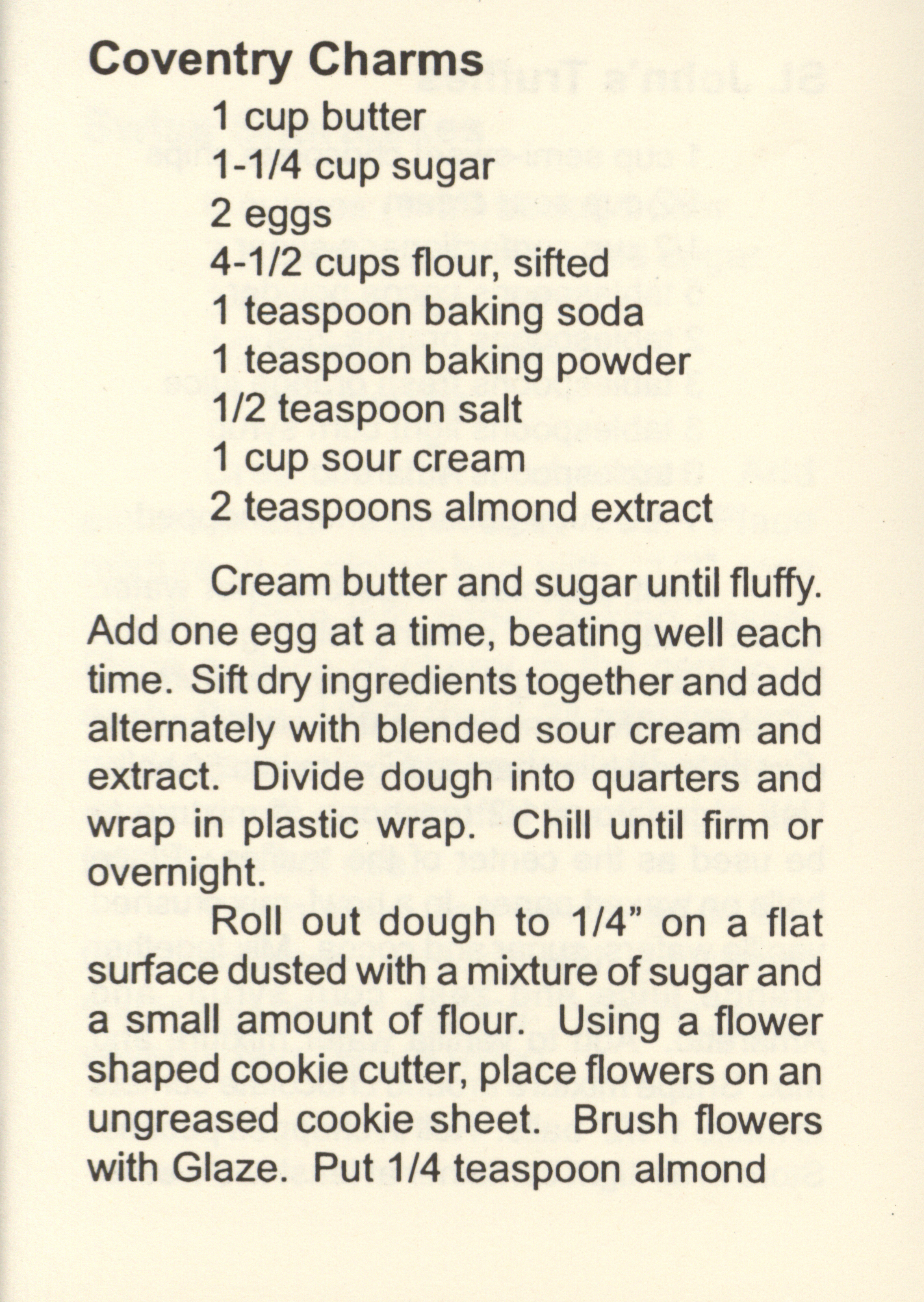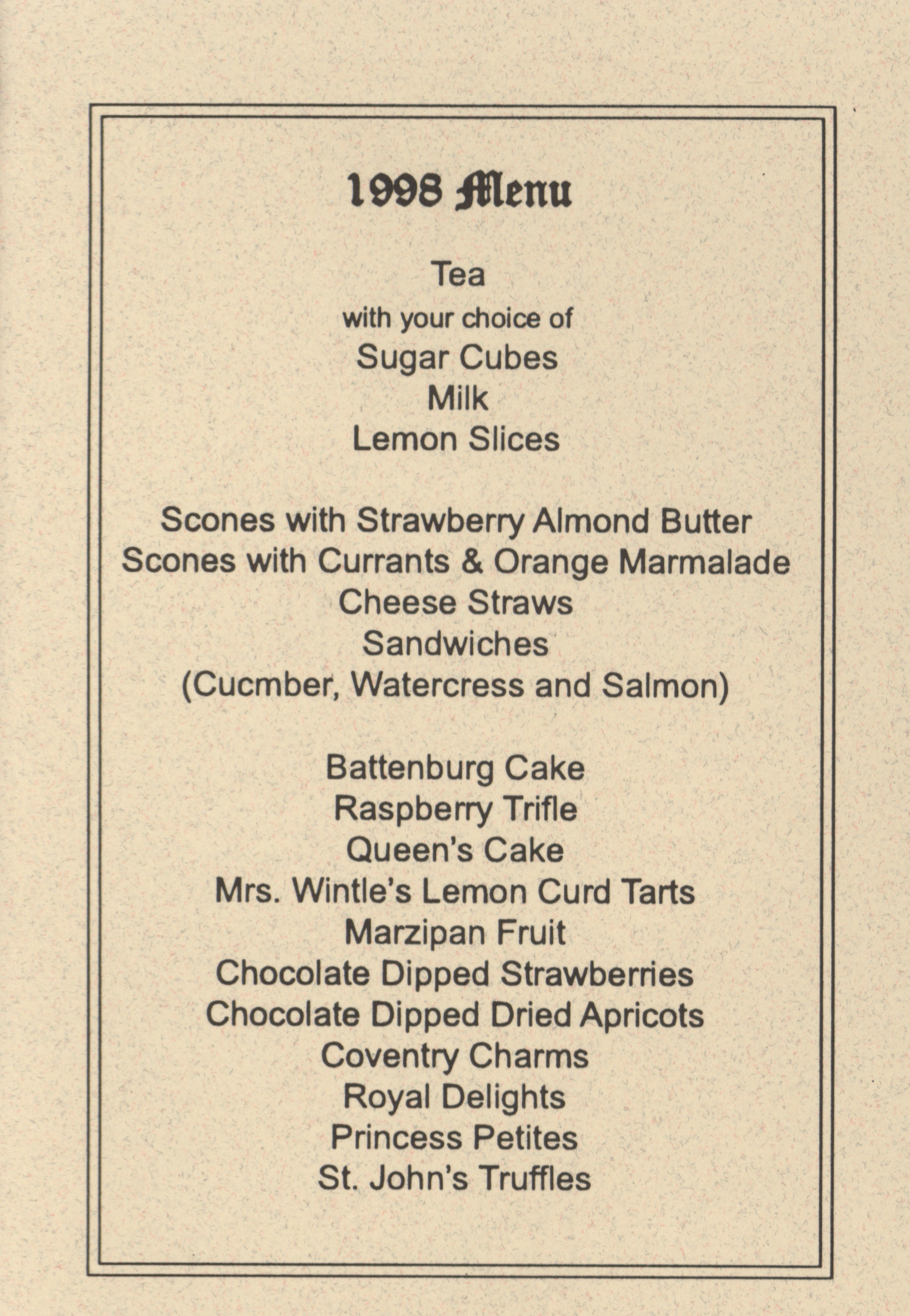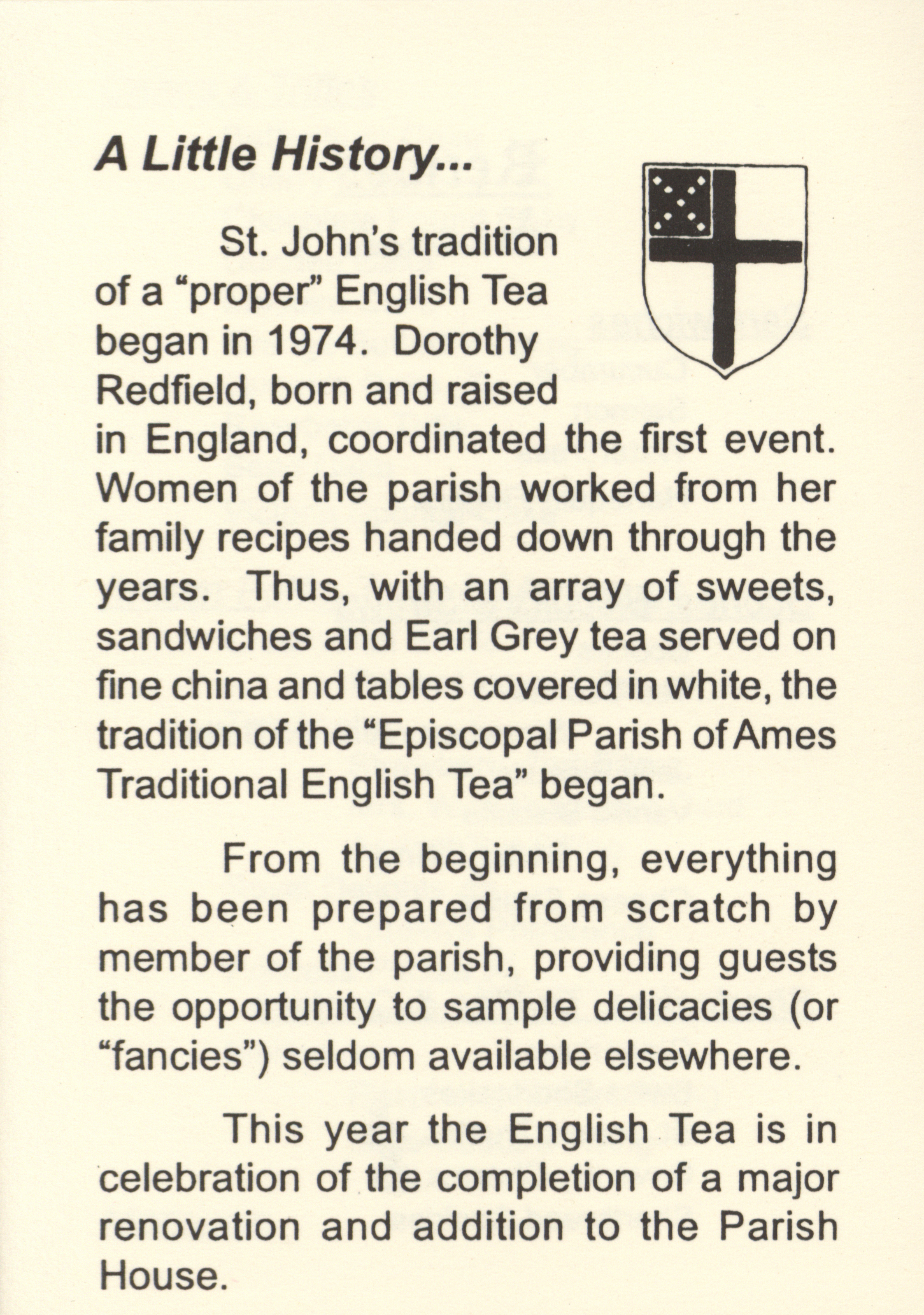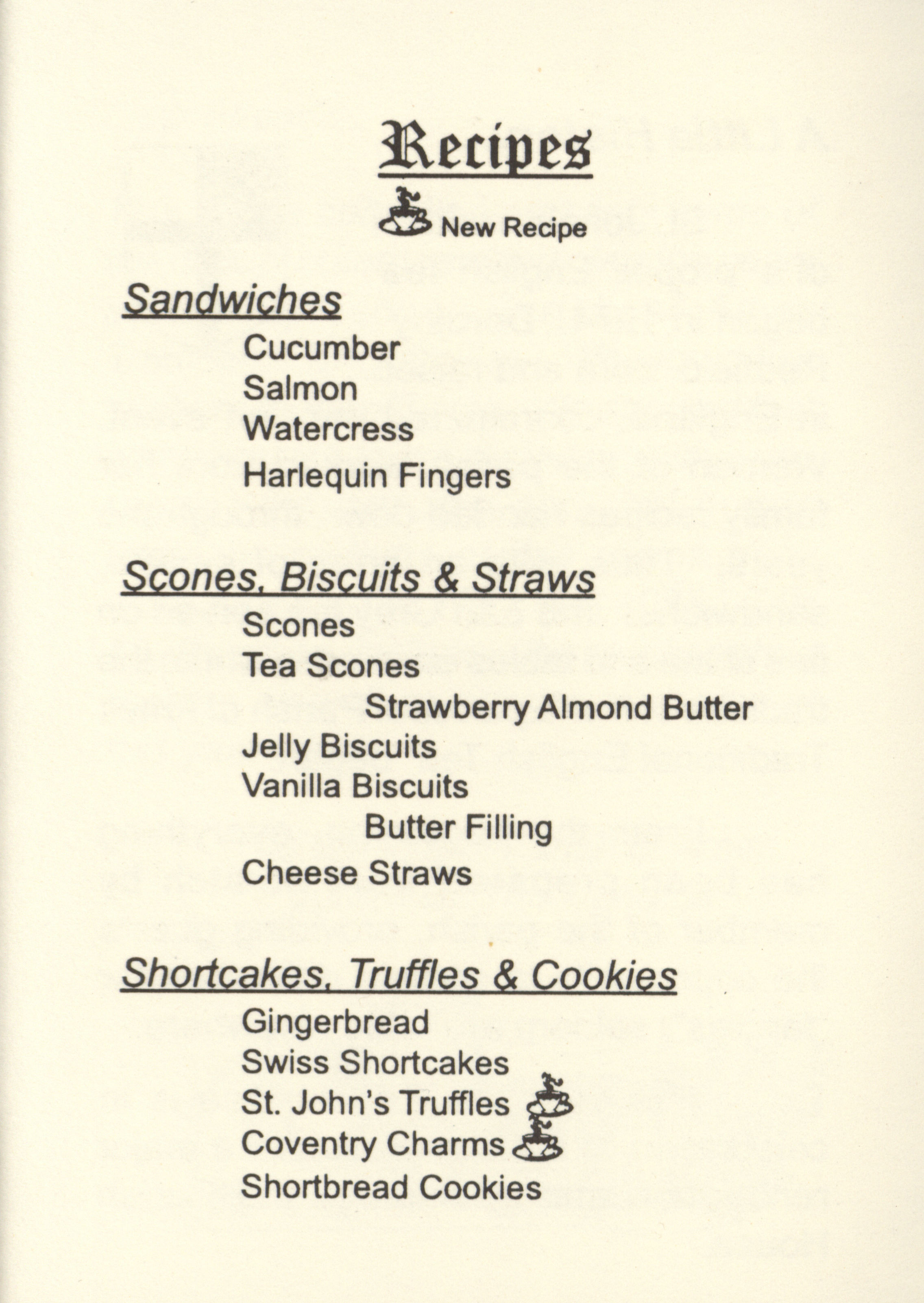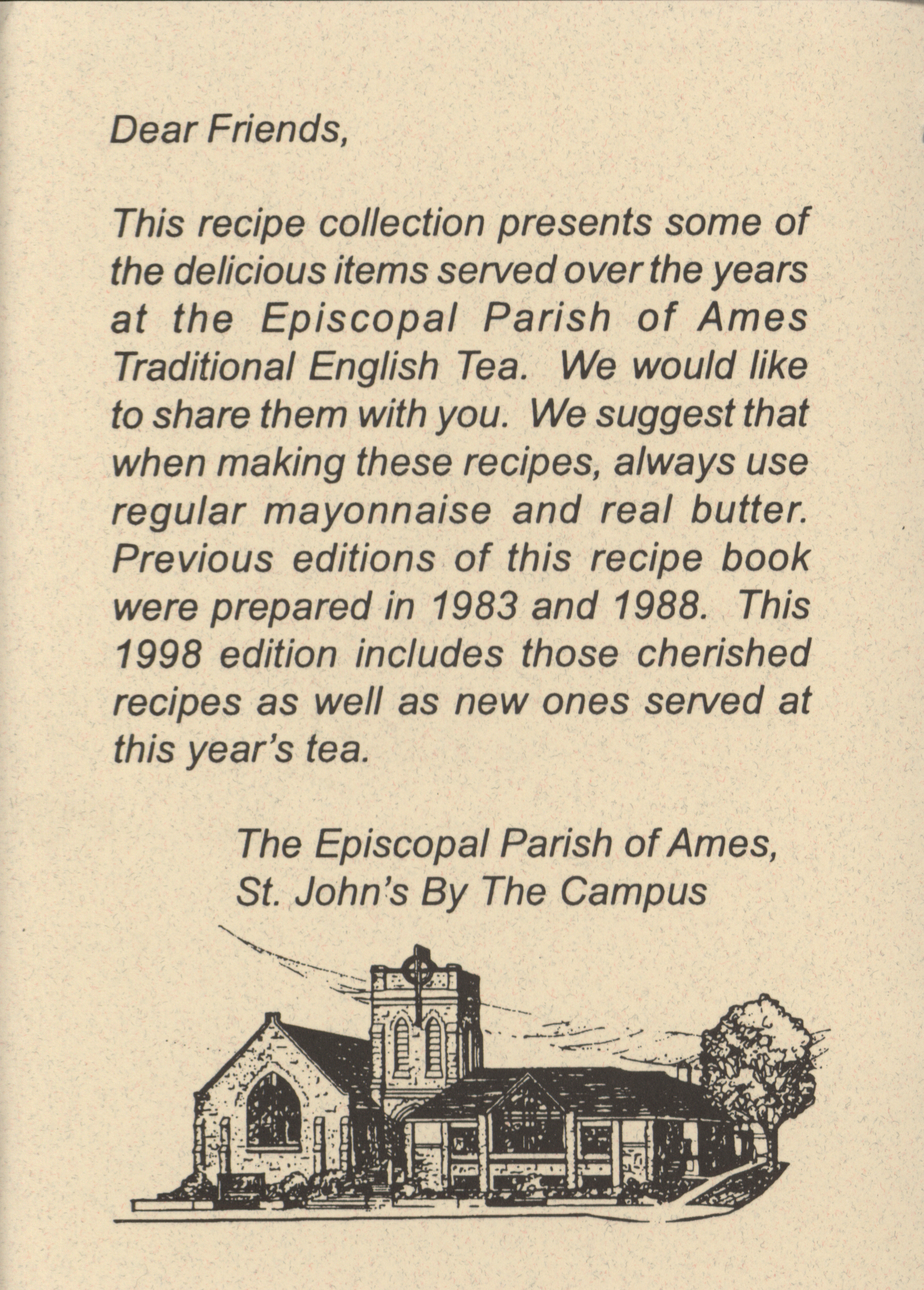 - This cookbook contains the recipes used for the 1998 traditional English tea hosted by St. John's by the Campus. It includes recipes for the sandwiches, cookies, pastries, and cakes served at the event.