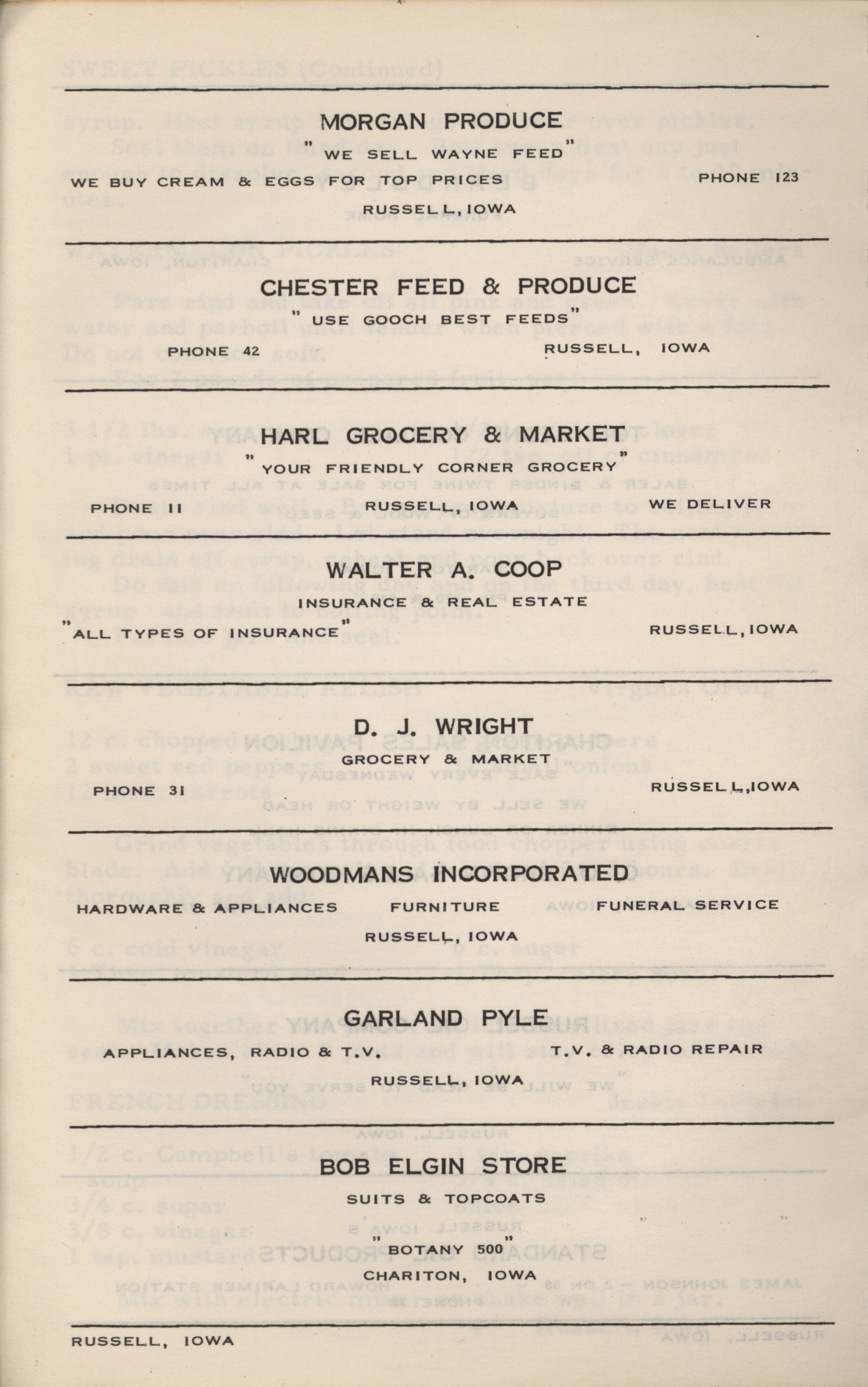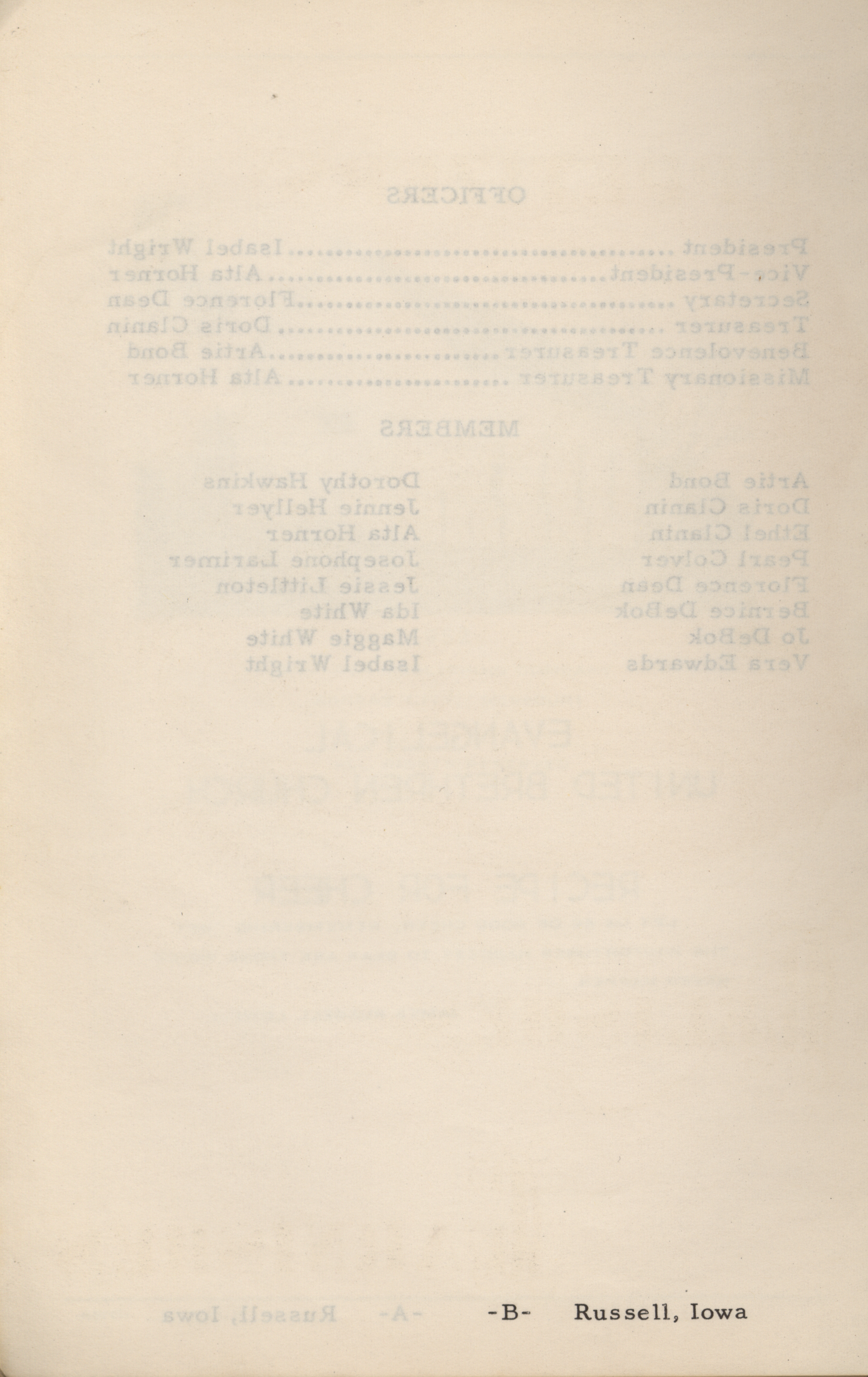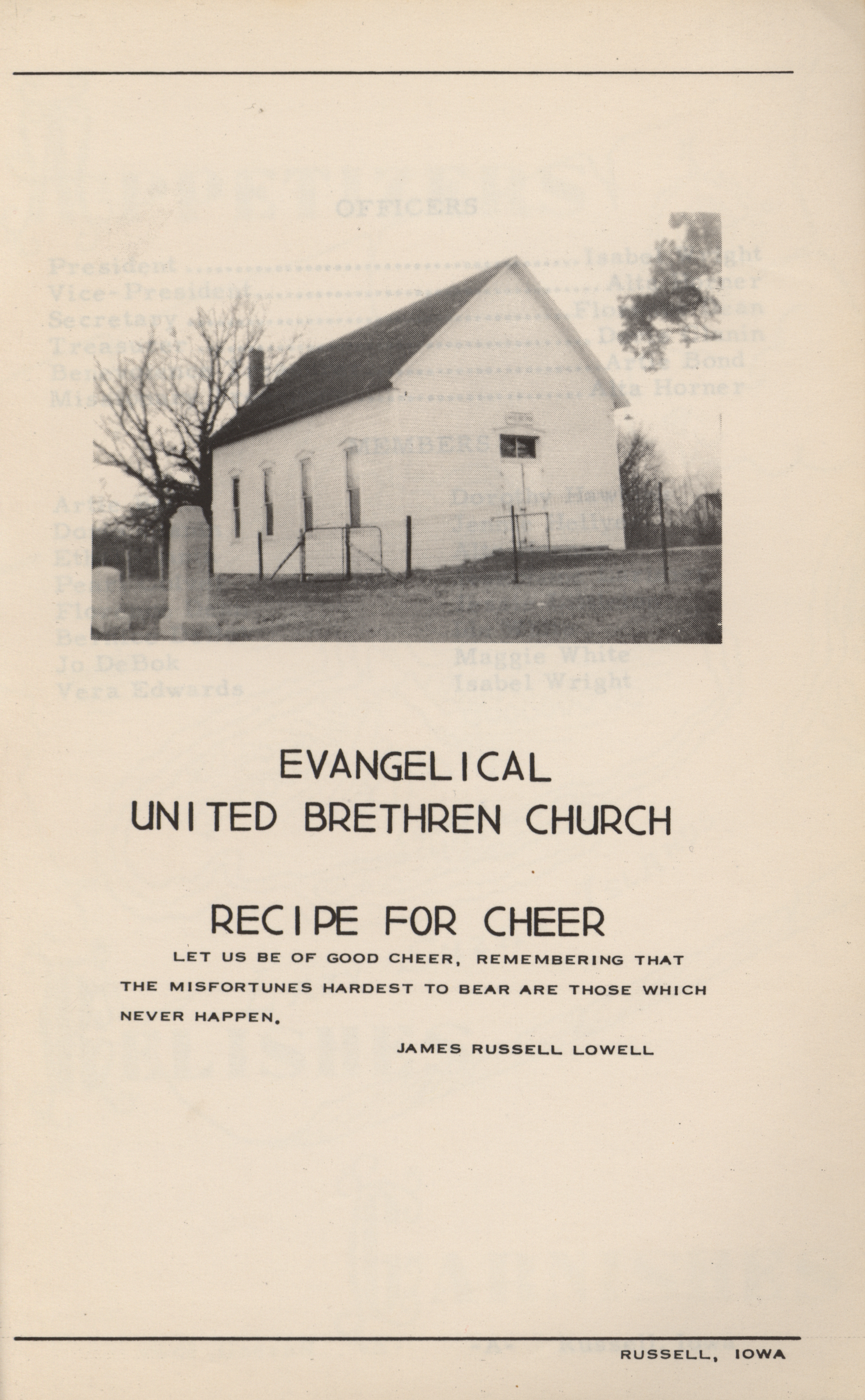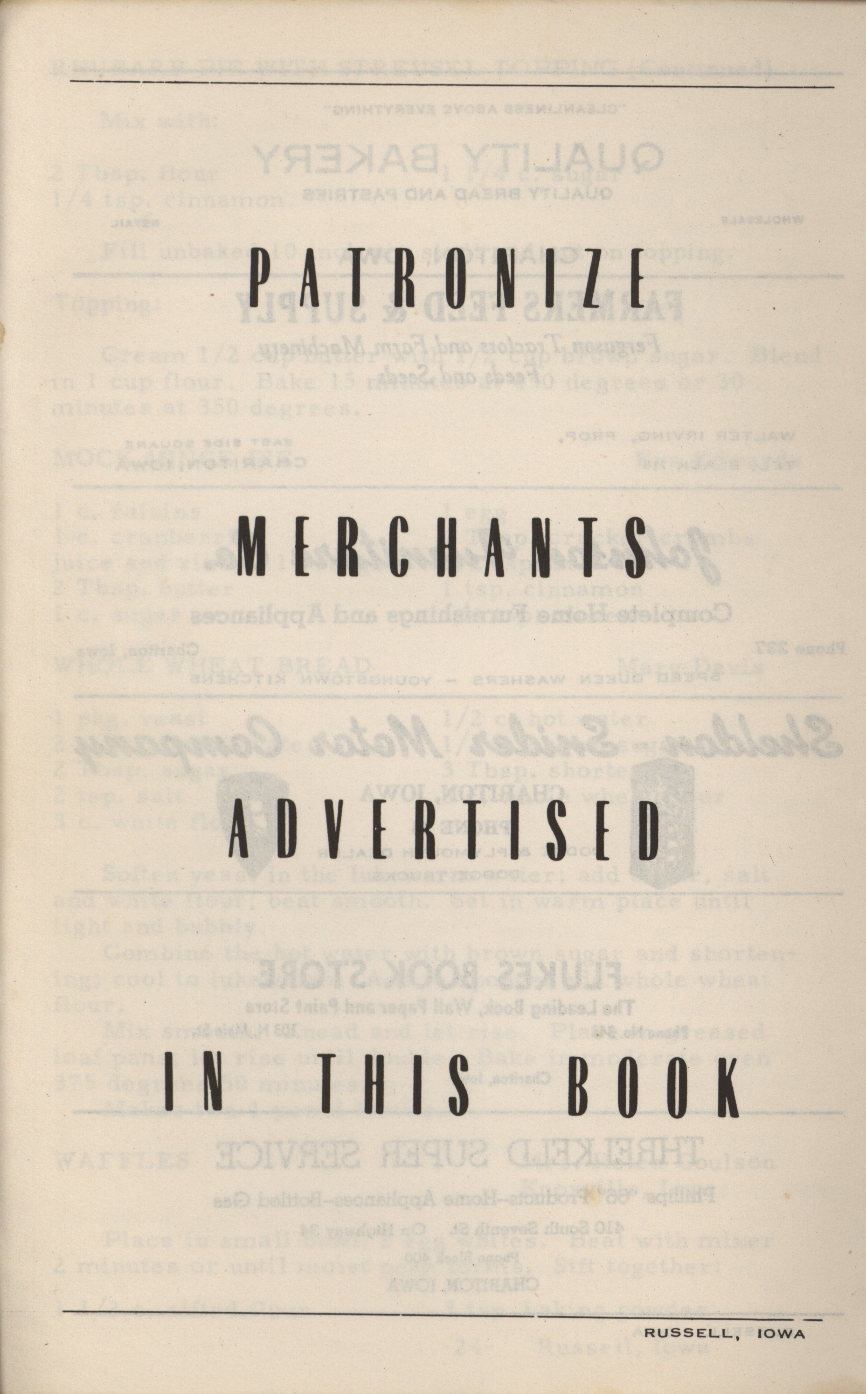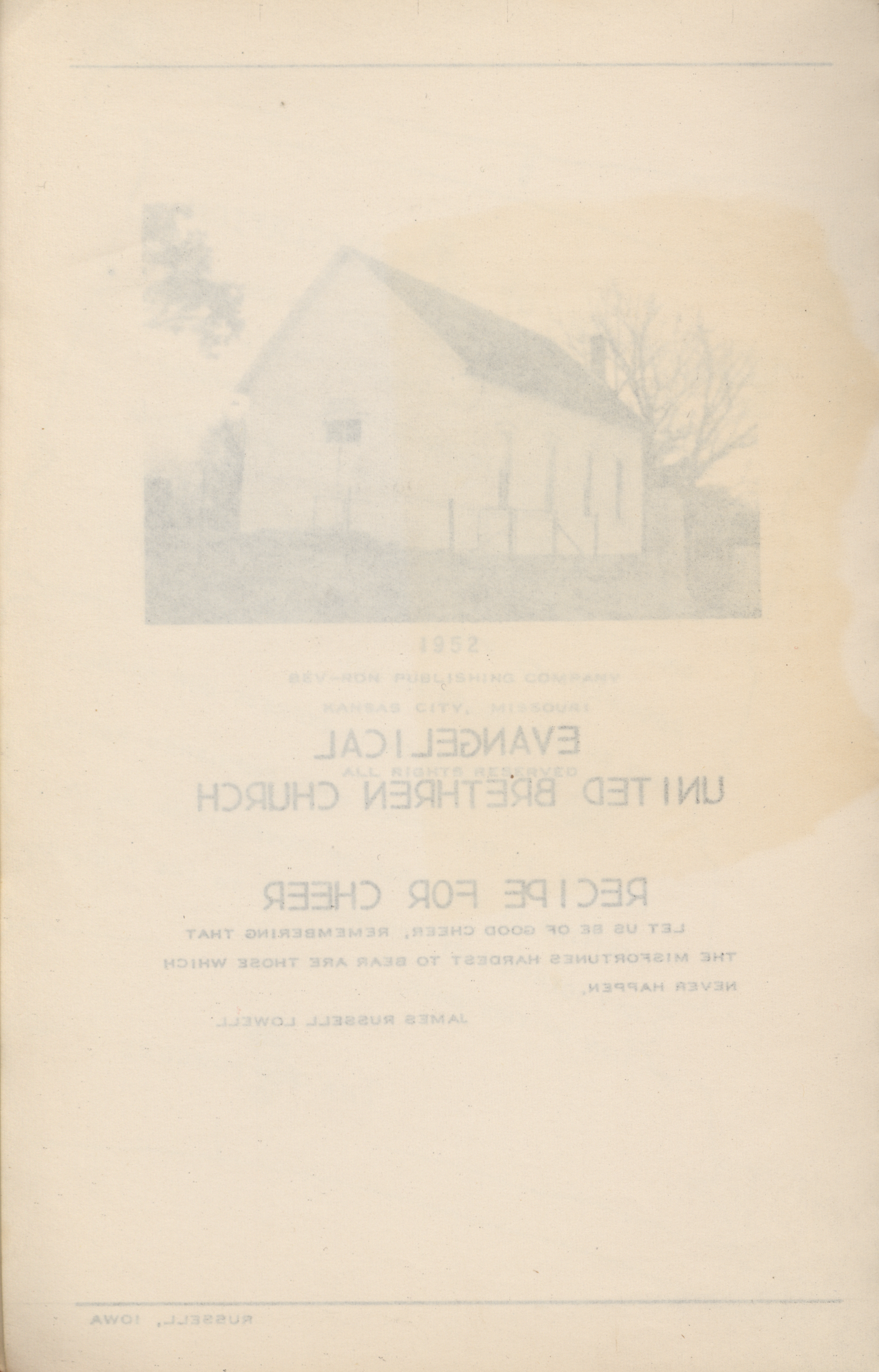 - A community cookbook compiled in 1952 by the Bethel Aid Society of the Evangelical United Brethren Church in Russell, Iowa. This volume features a diverse array of recipes contributed by church members, highlighting local culinary traditions, particularly those involving preserved foods and wild game recipes. It also features advertisements from local businesses, reflecting mid-century rural life in southern Iowa.
