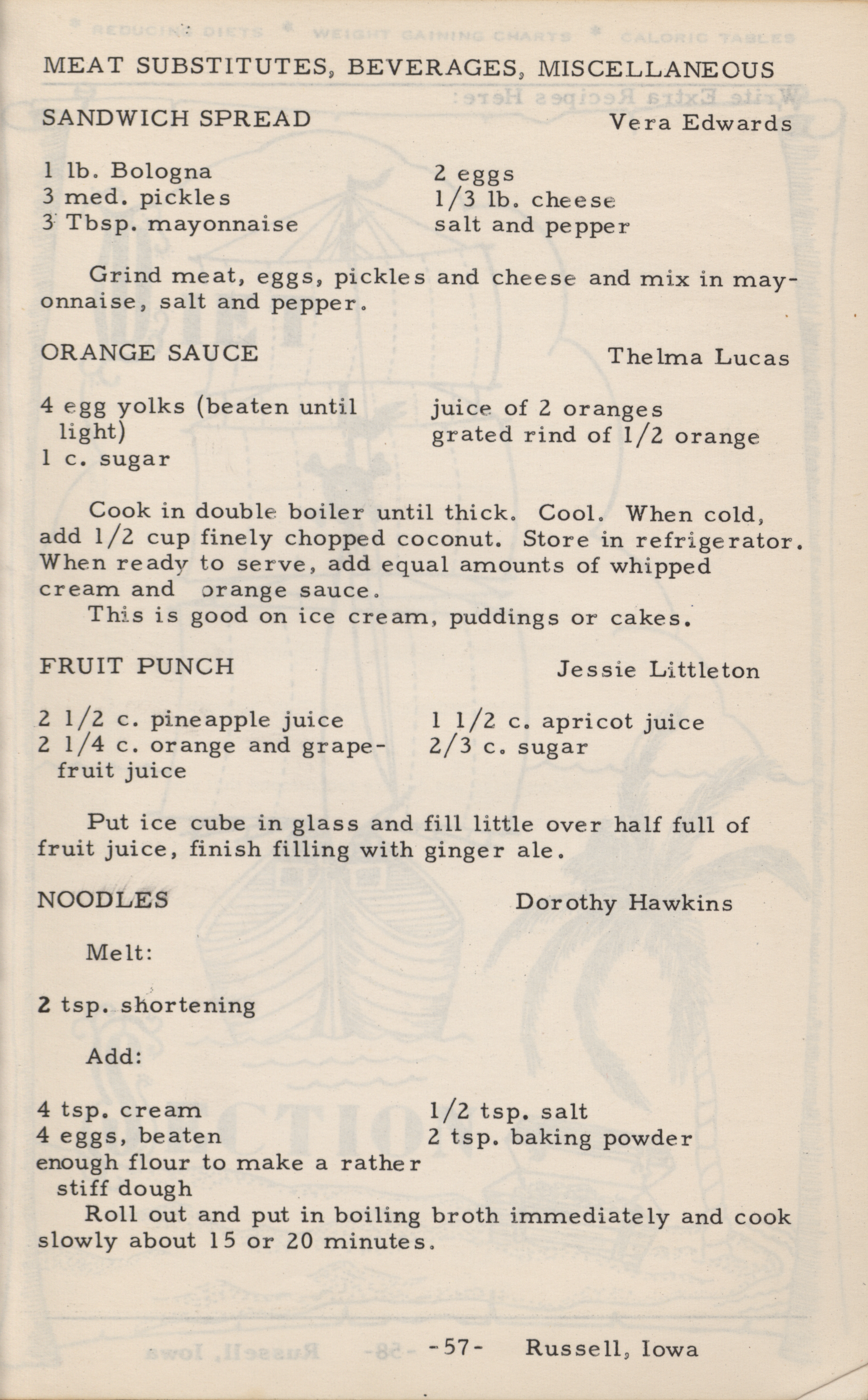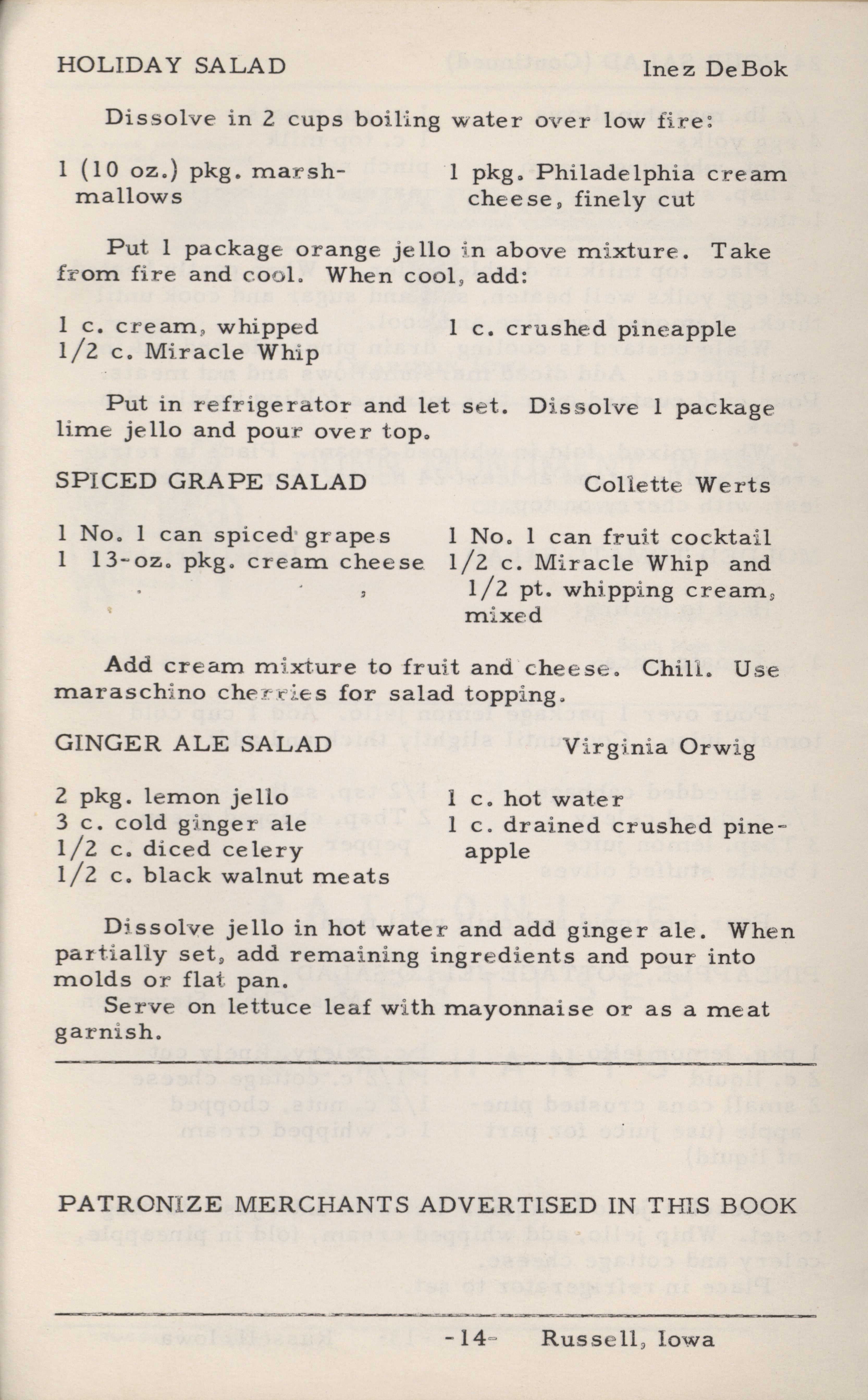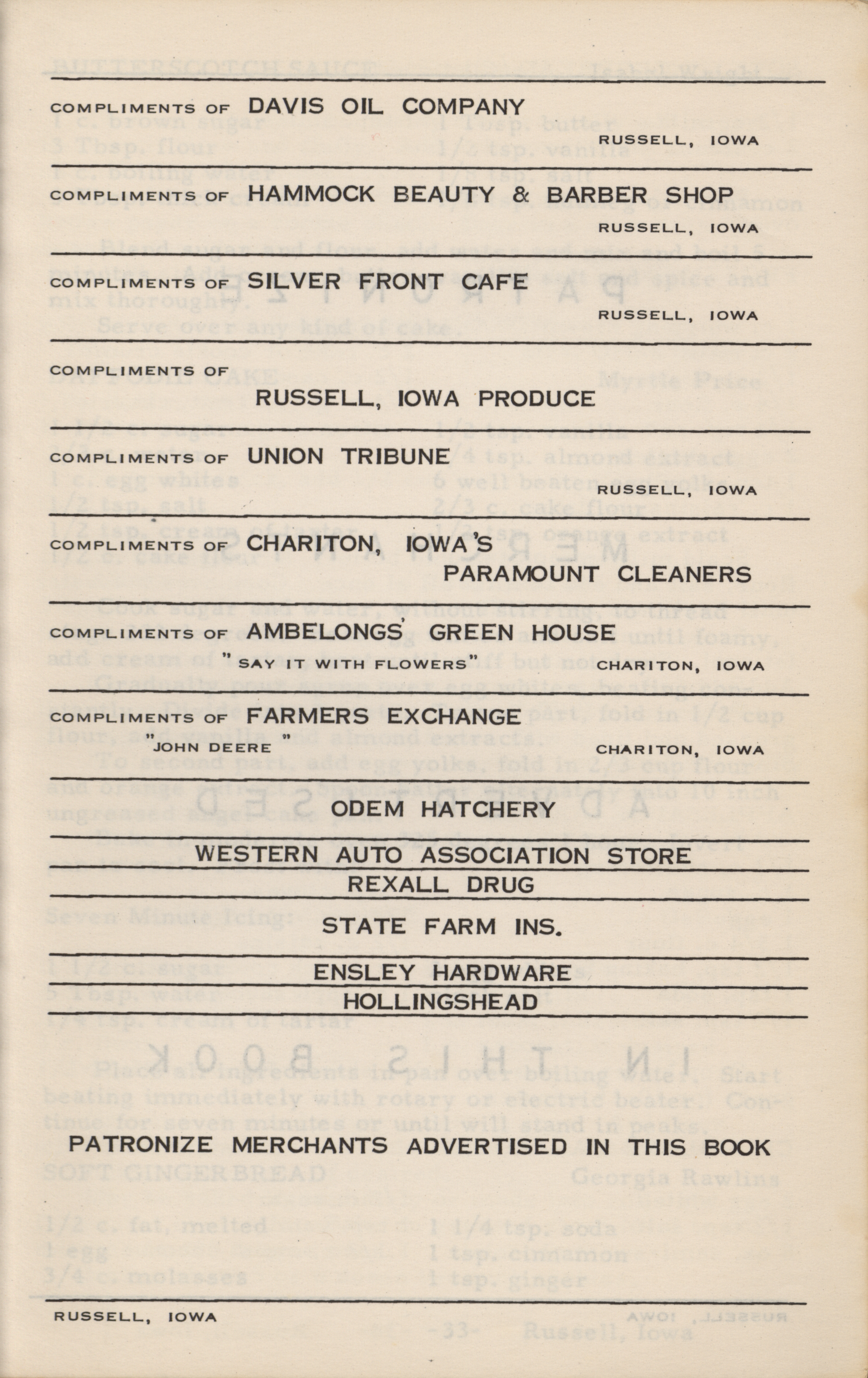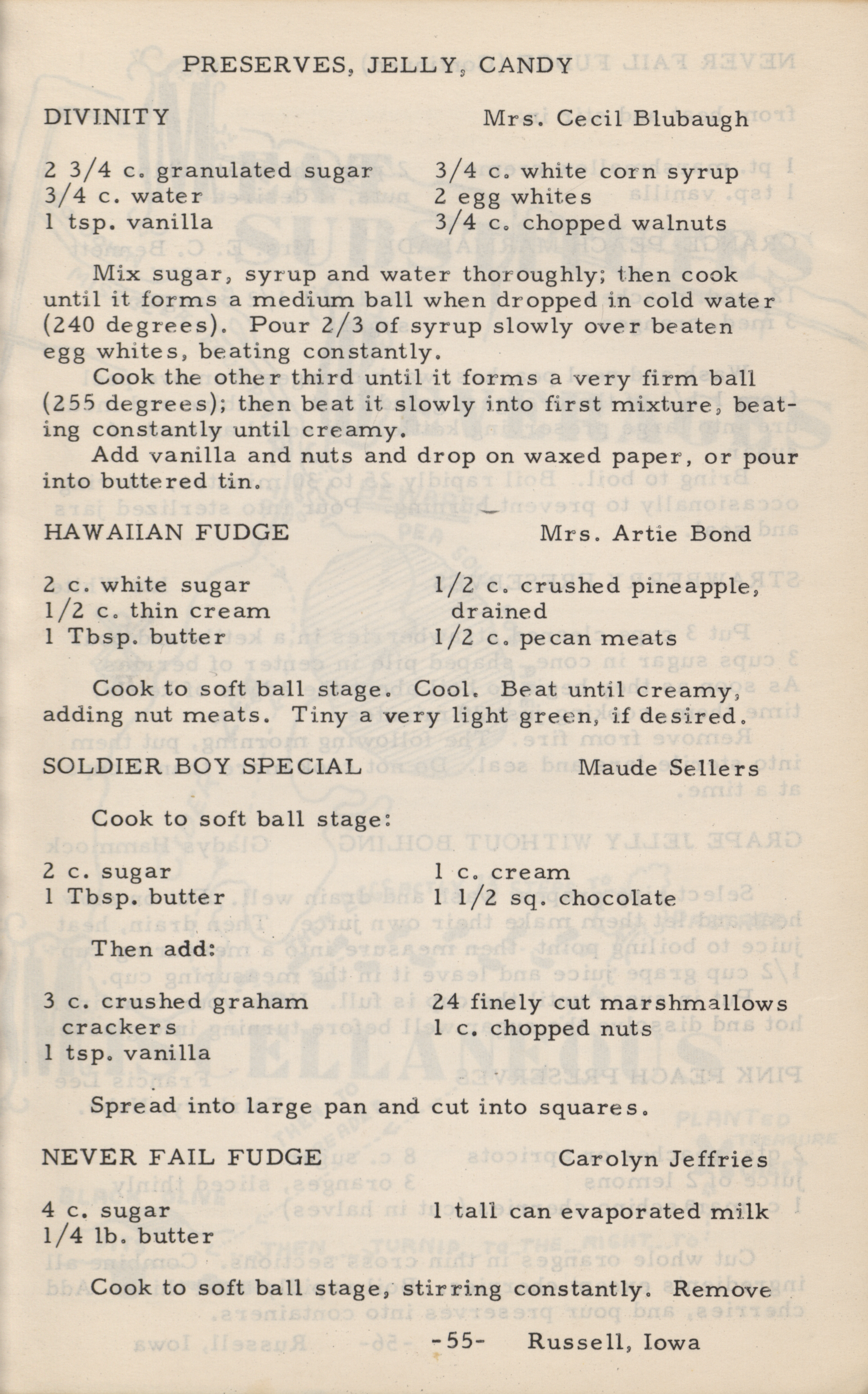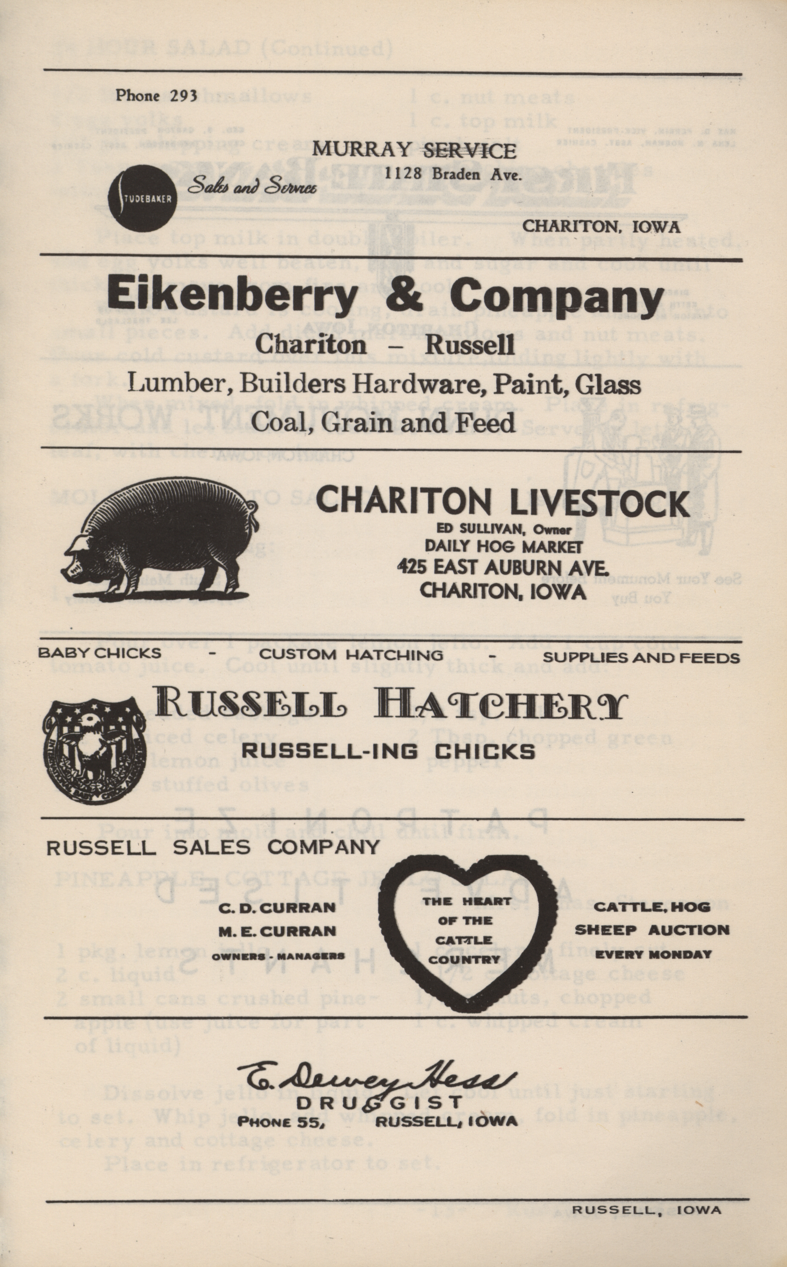 - A community cookbook compiled in 1952 by the Bethel Aid Society of the Evangelical United Brethren Church in Russell, Iowa. This volume features a diverse array of recipes contributed by church members, highlighting local culinary traditions, particularly those involving preserved foods and wild game recipes. It also features advertisements from local businesses, reflecting mid-century rural life in southern Iowa.