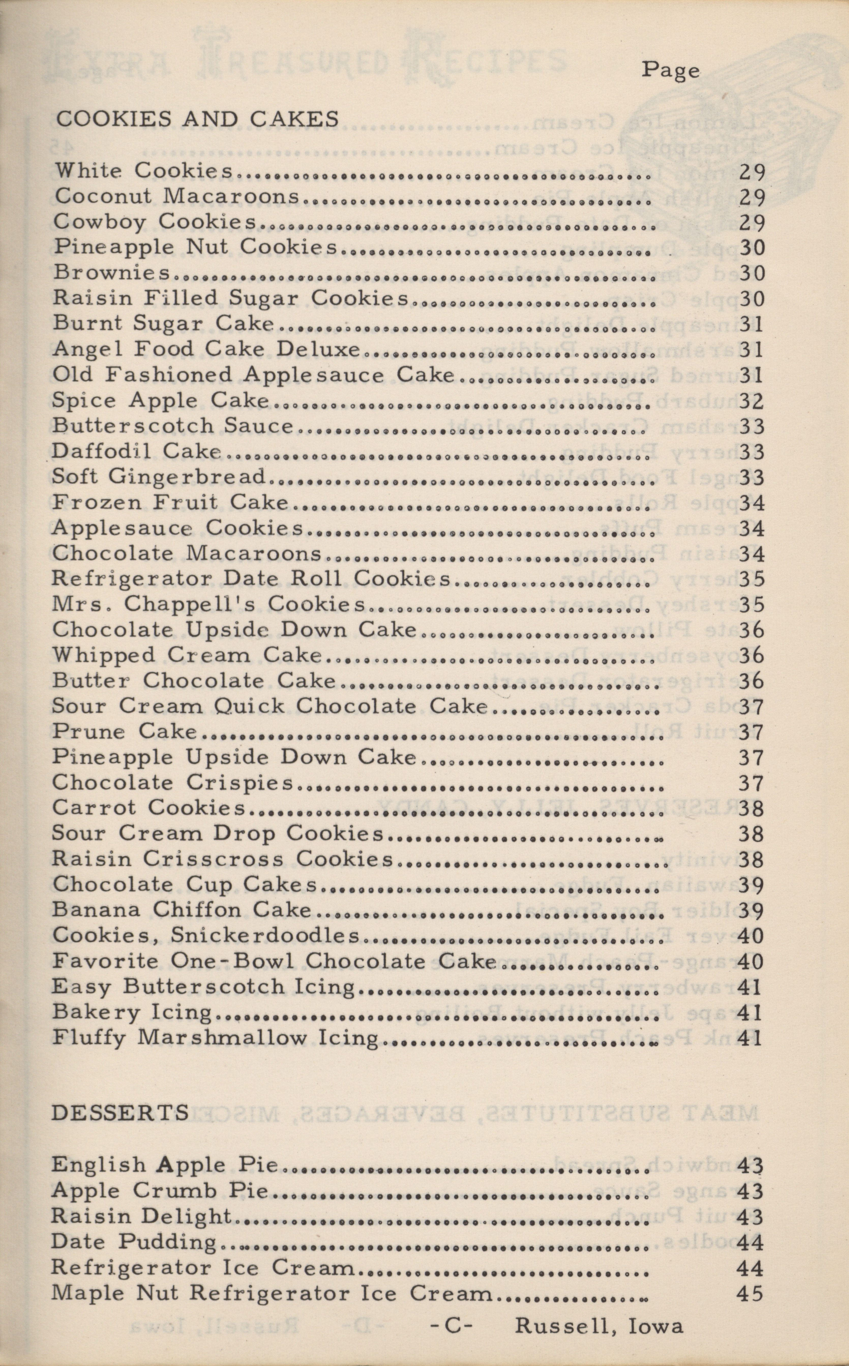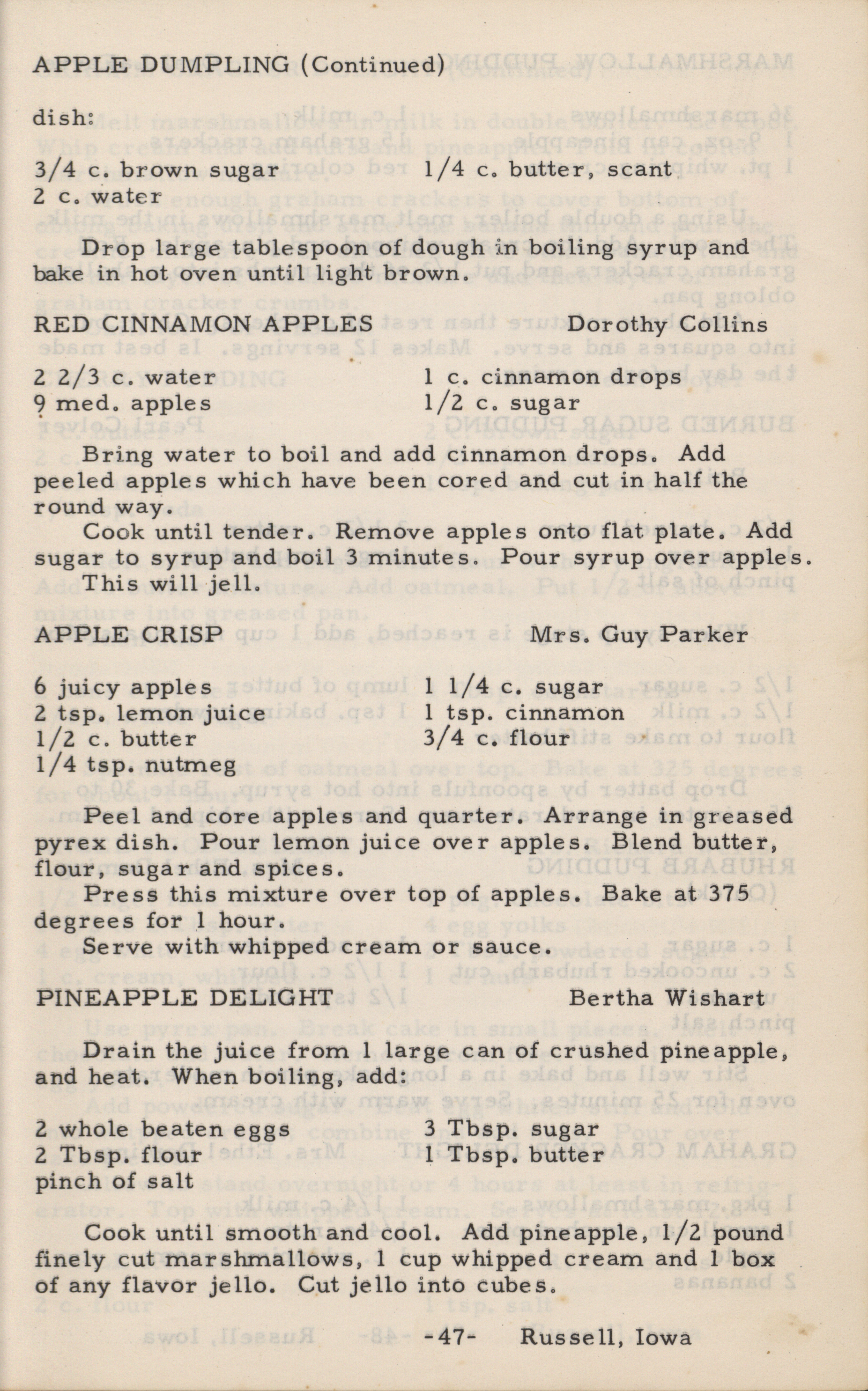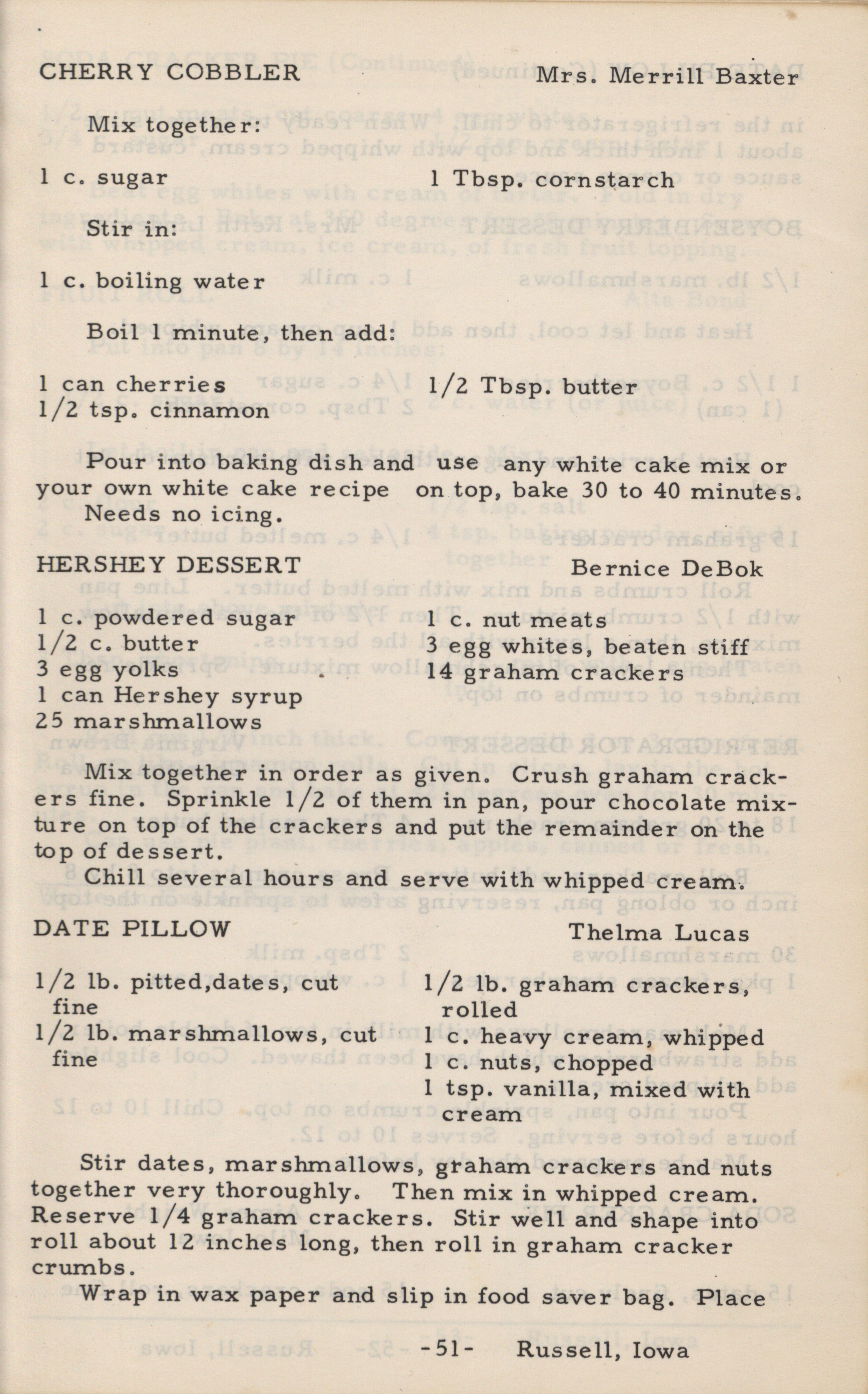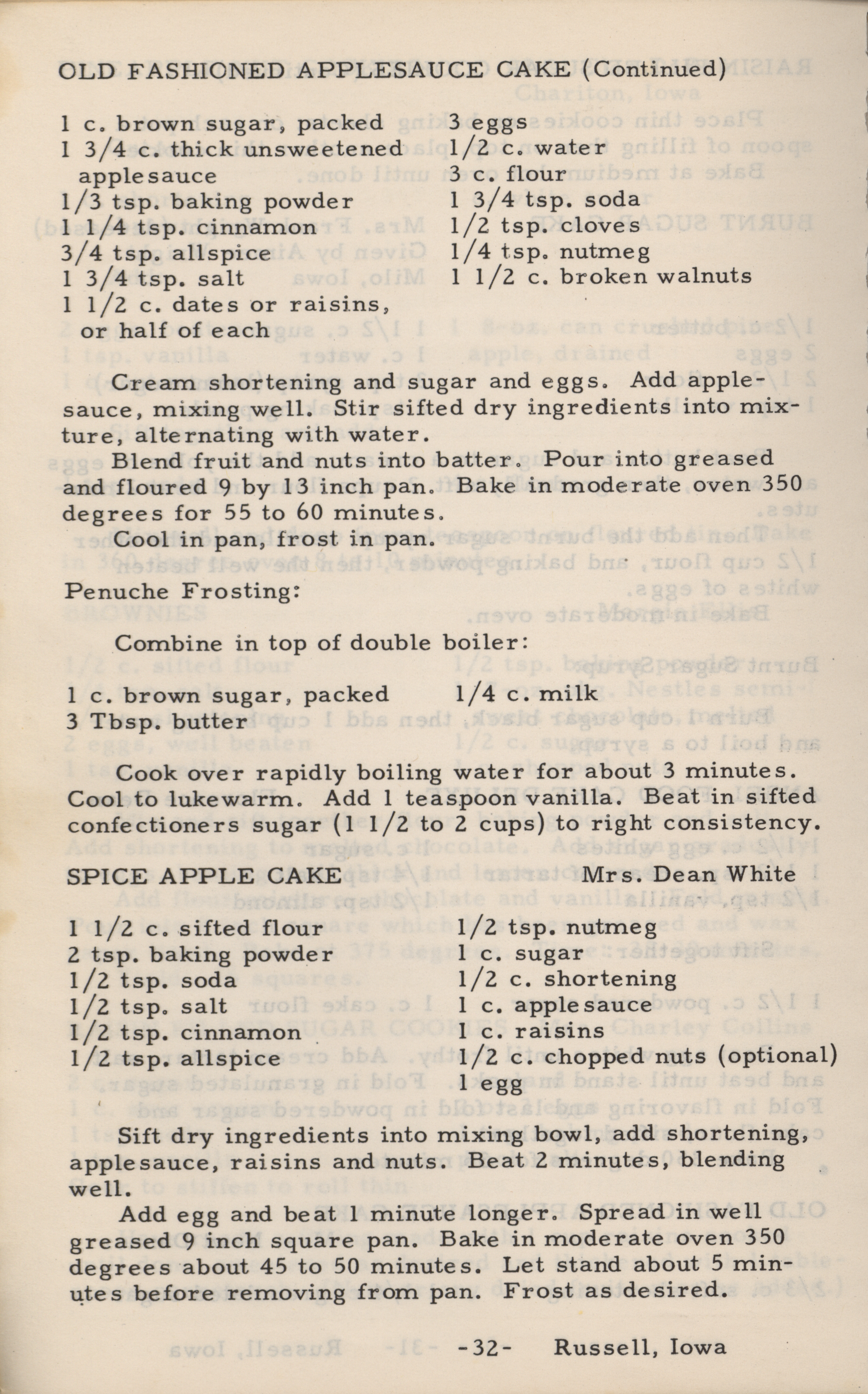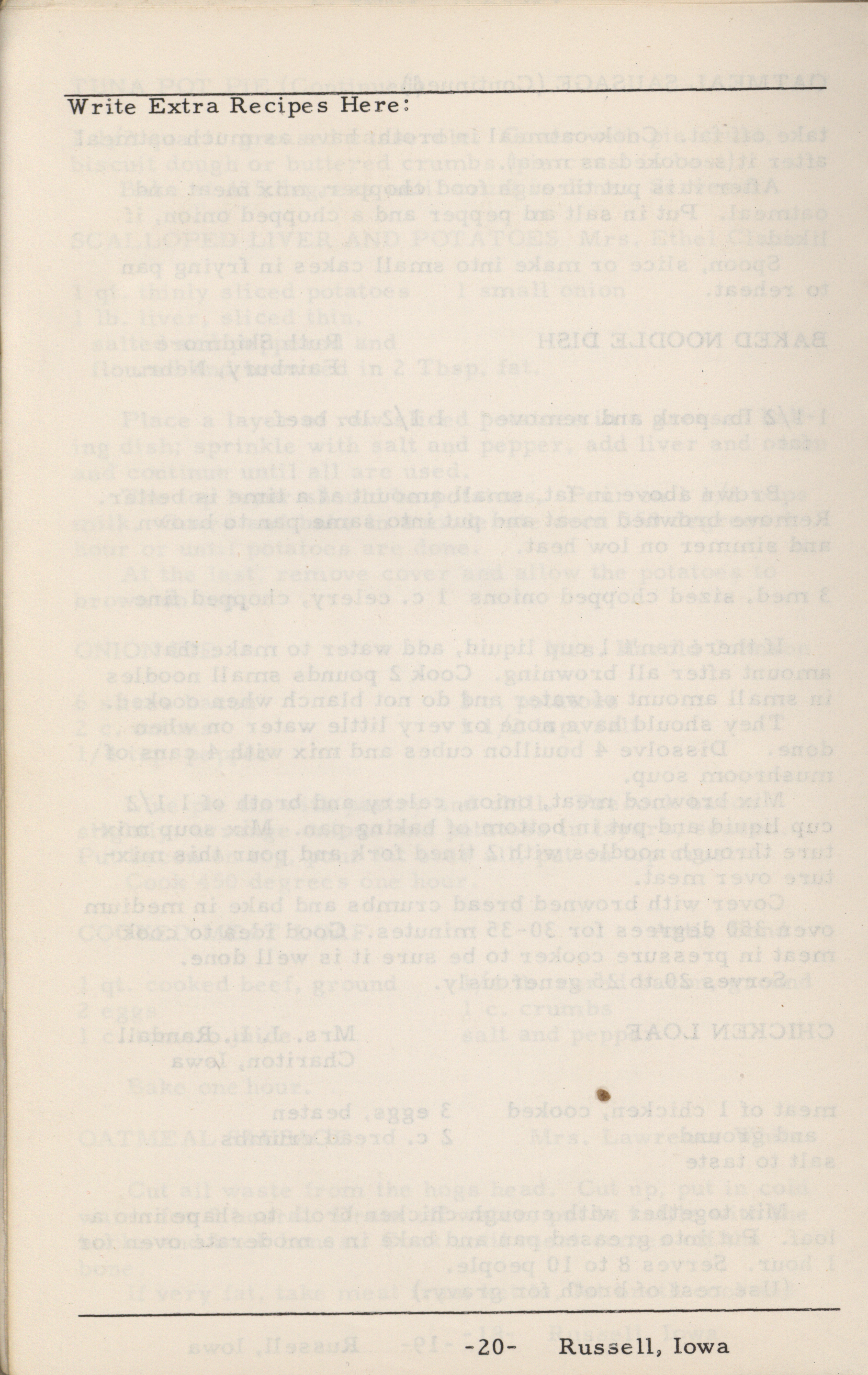 - A community cookbook compiled in 1952 by the Bethel Aid Society of the Evangelical United Brethren Church in Russell, Iowa. This volume features a diverse array of recipes contributed by church members, highlighting local culinary traditions, particularly those involving preserved foods and wild game recipes. It also features advertisements from local businesses, reflecting mid-century rural life in southern Iowa.
