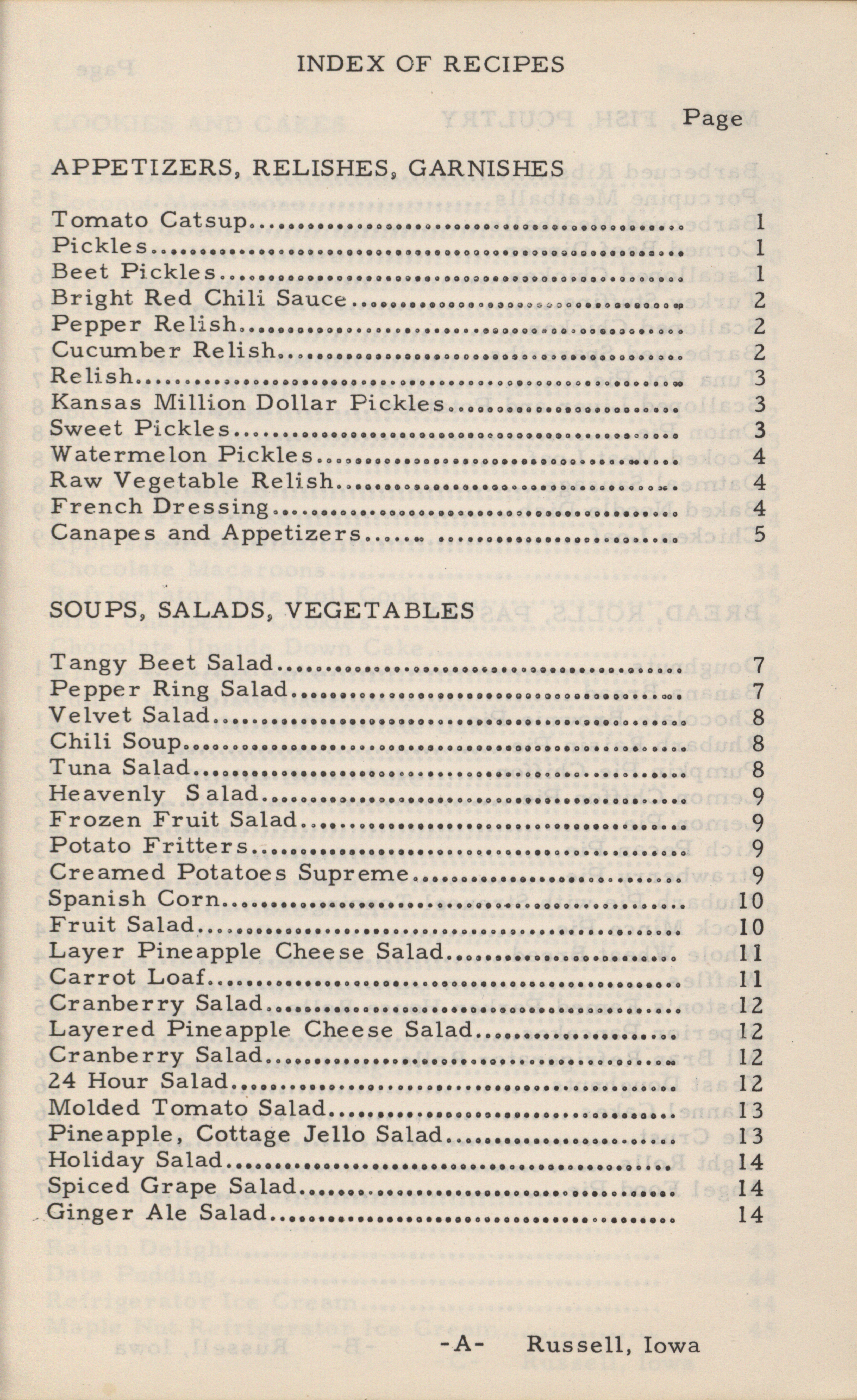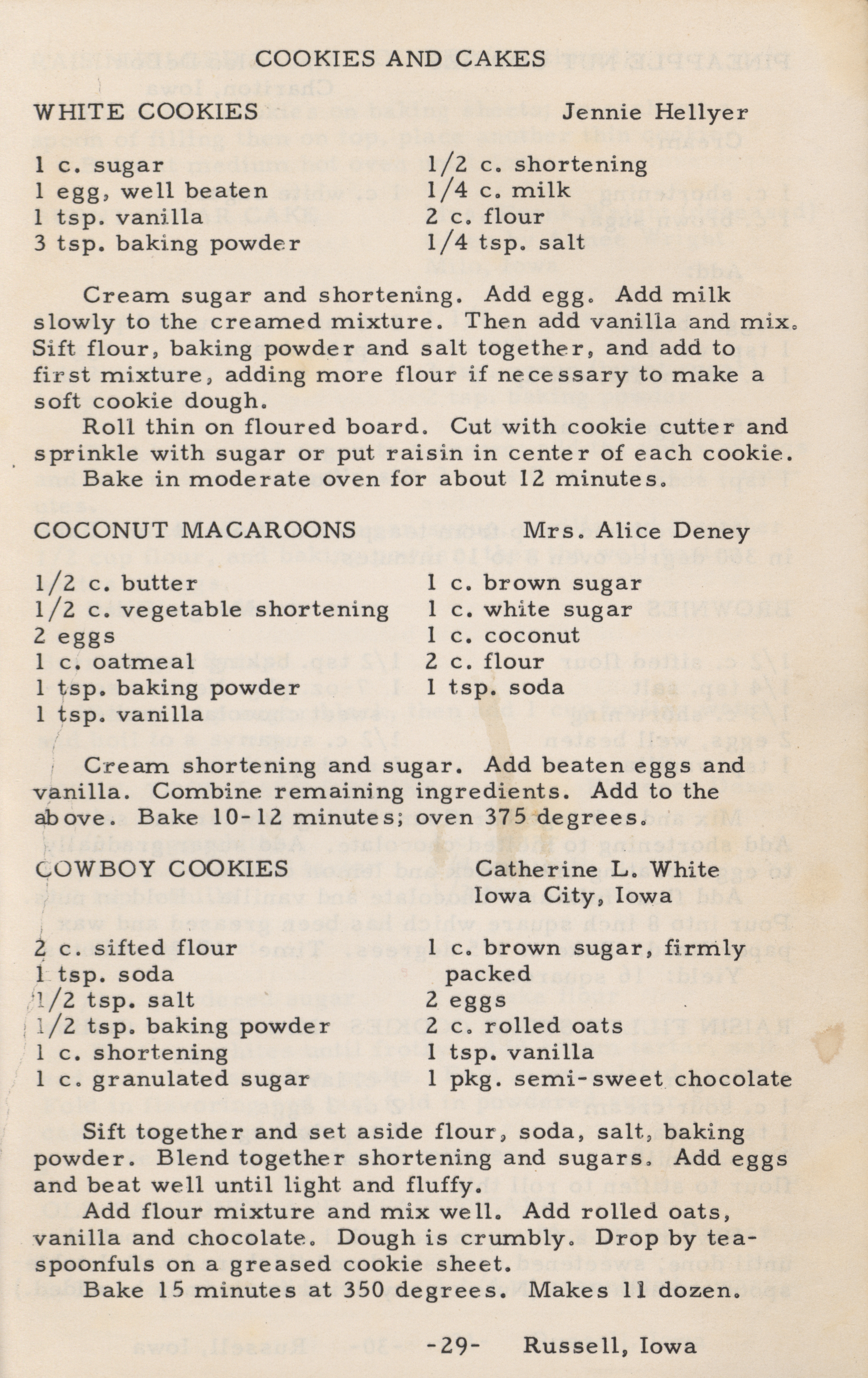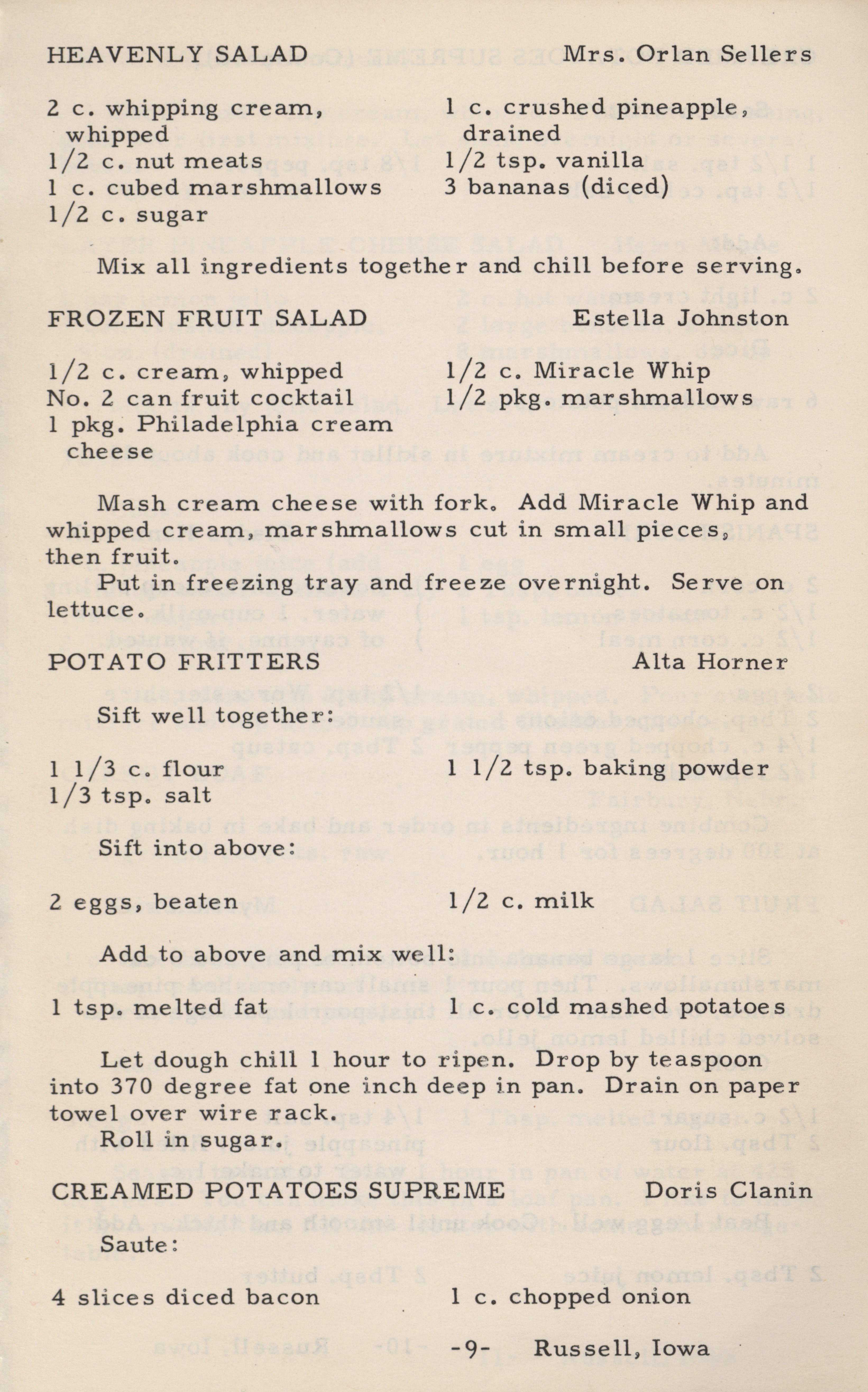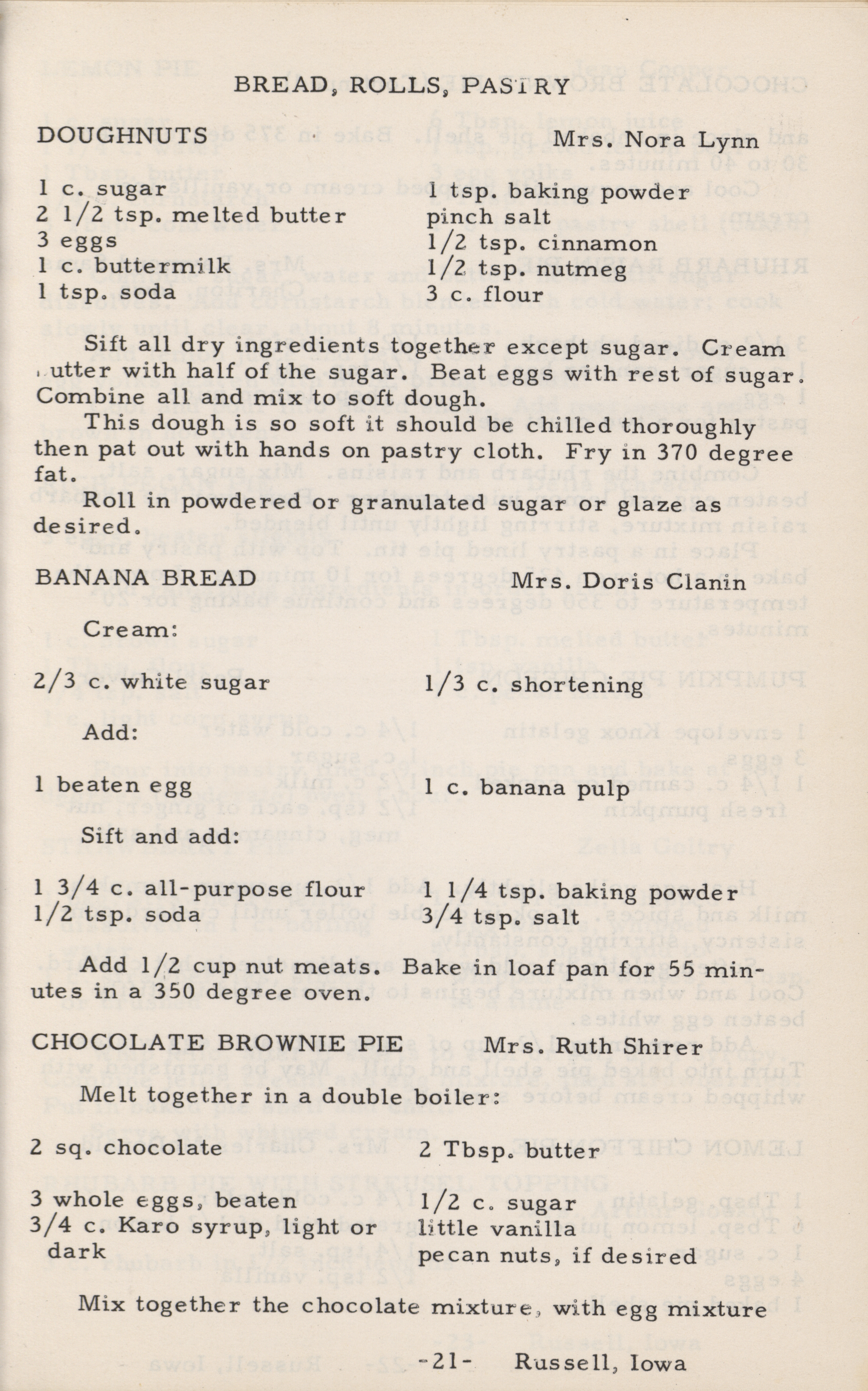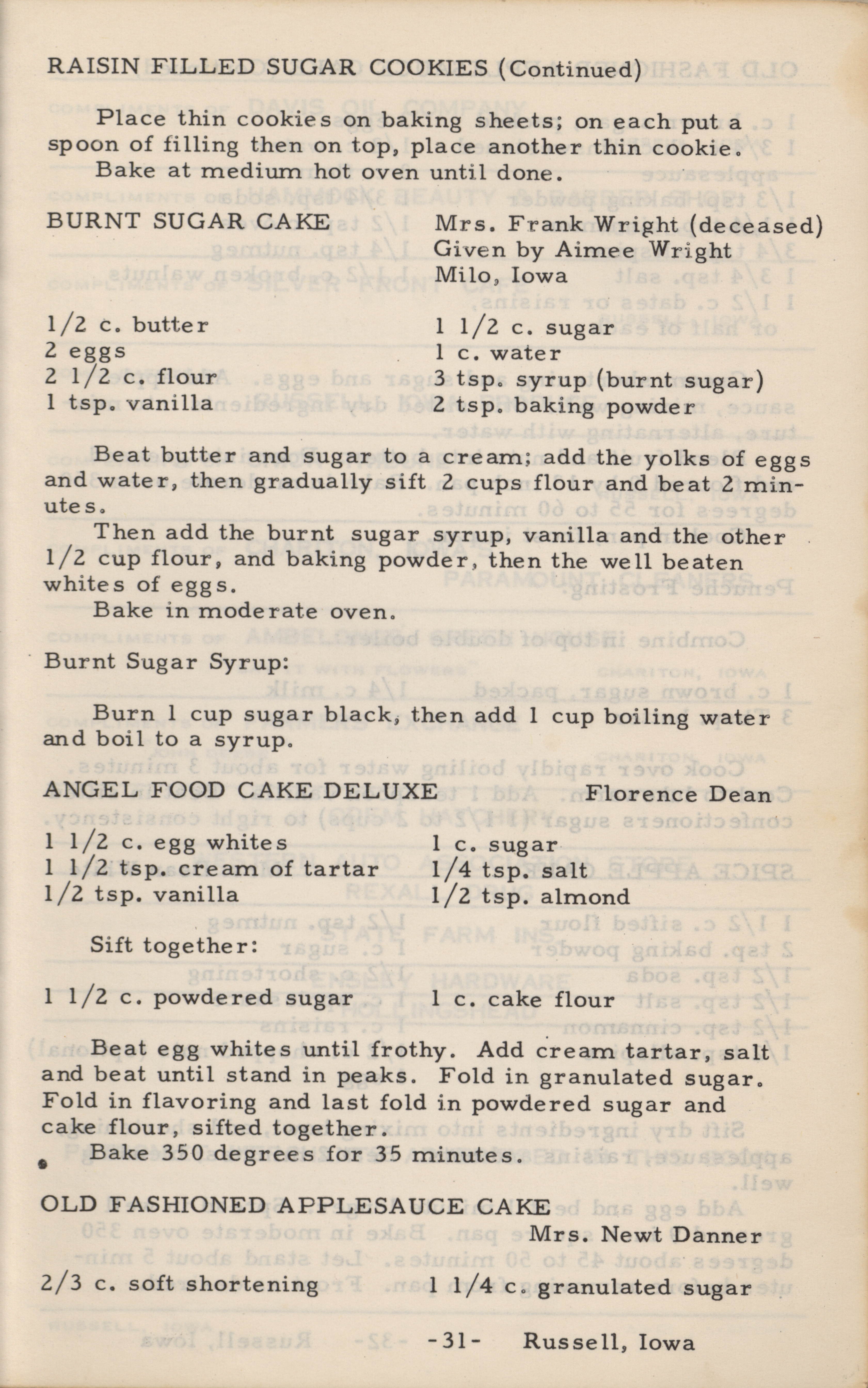 - A community cookbook compiled in 1952 by the Bethel Aid Society of the Evangelical United Brethren Church in Russell, Iowa. This volume features a diverse array of recipes contributed by church members, highlighting local culinary traditions, particularly those involving preserved foods and wild game recipes. It also features advertisements from local businesses, reflecting mid-century rural life in southern Iowa.