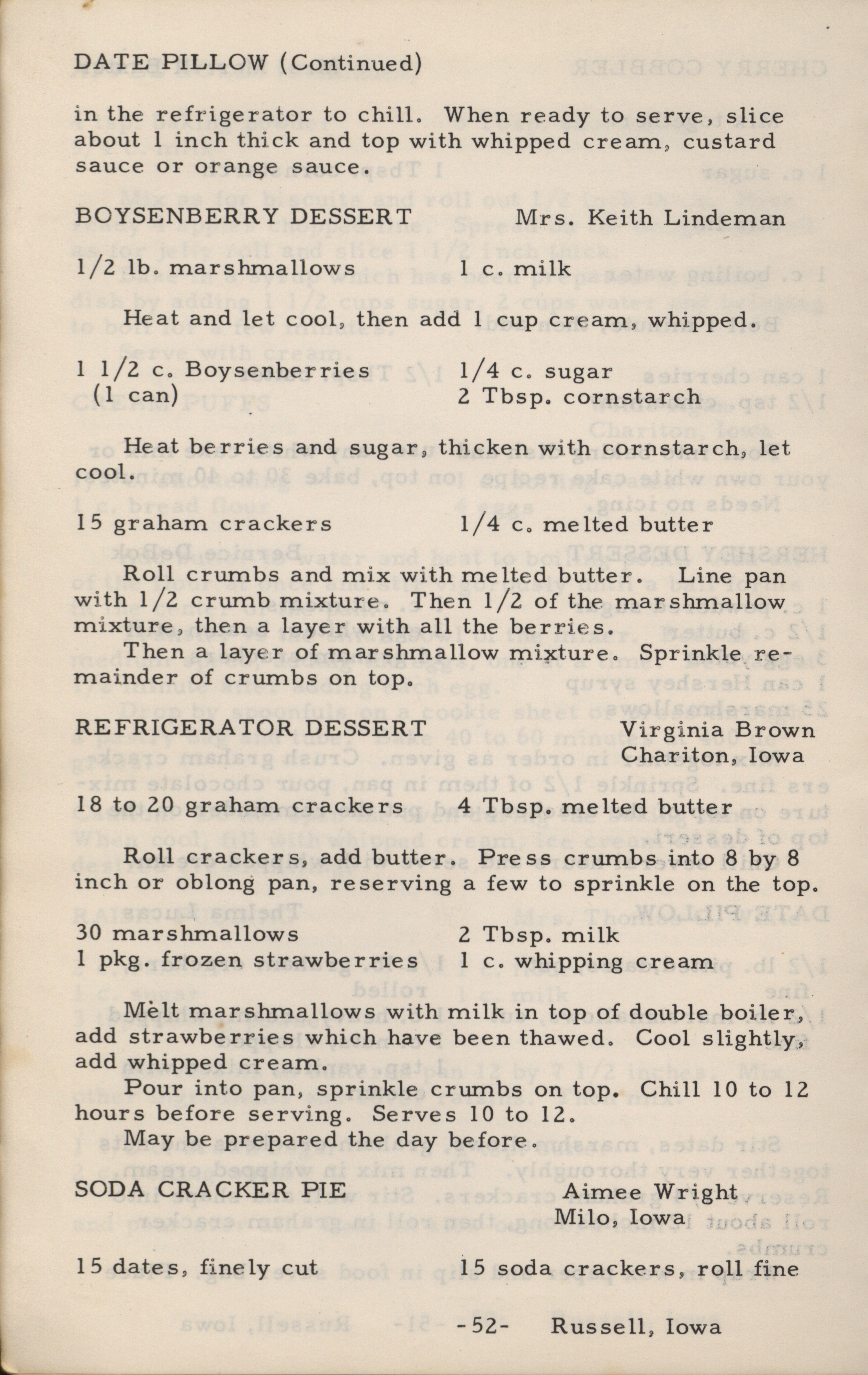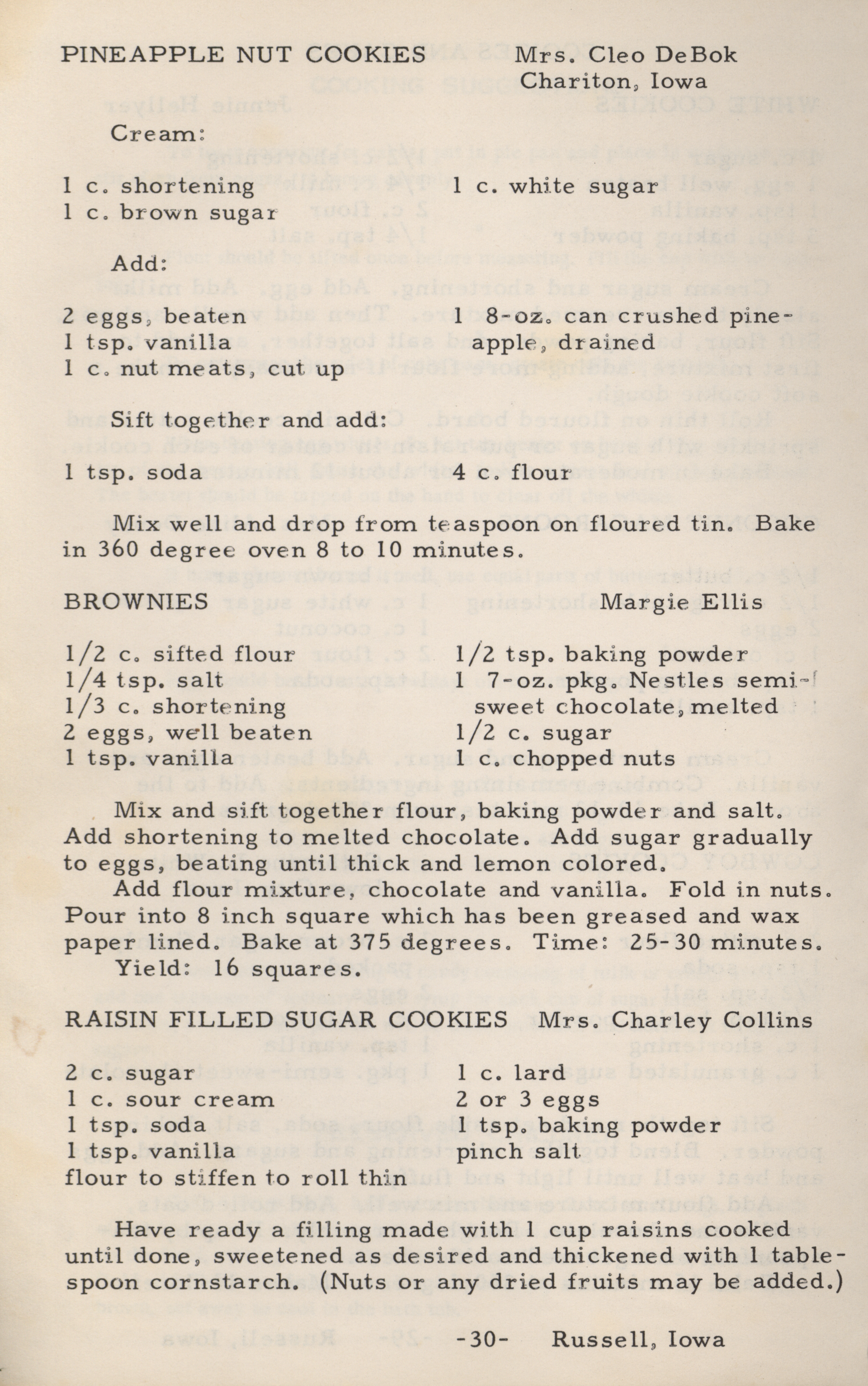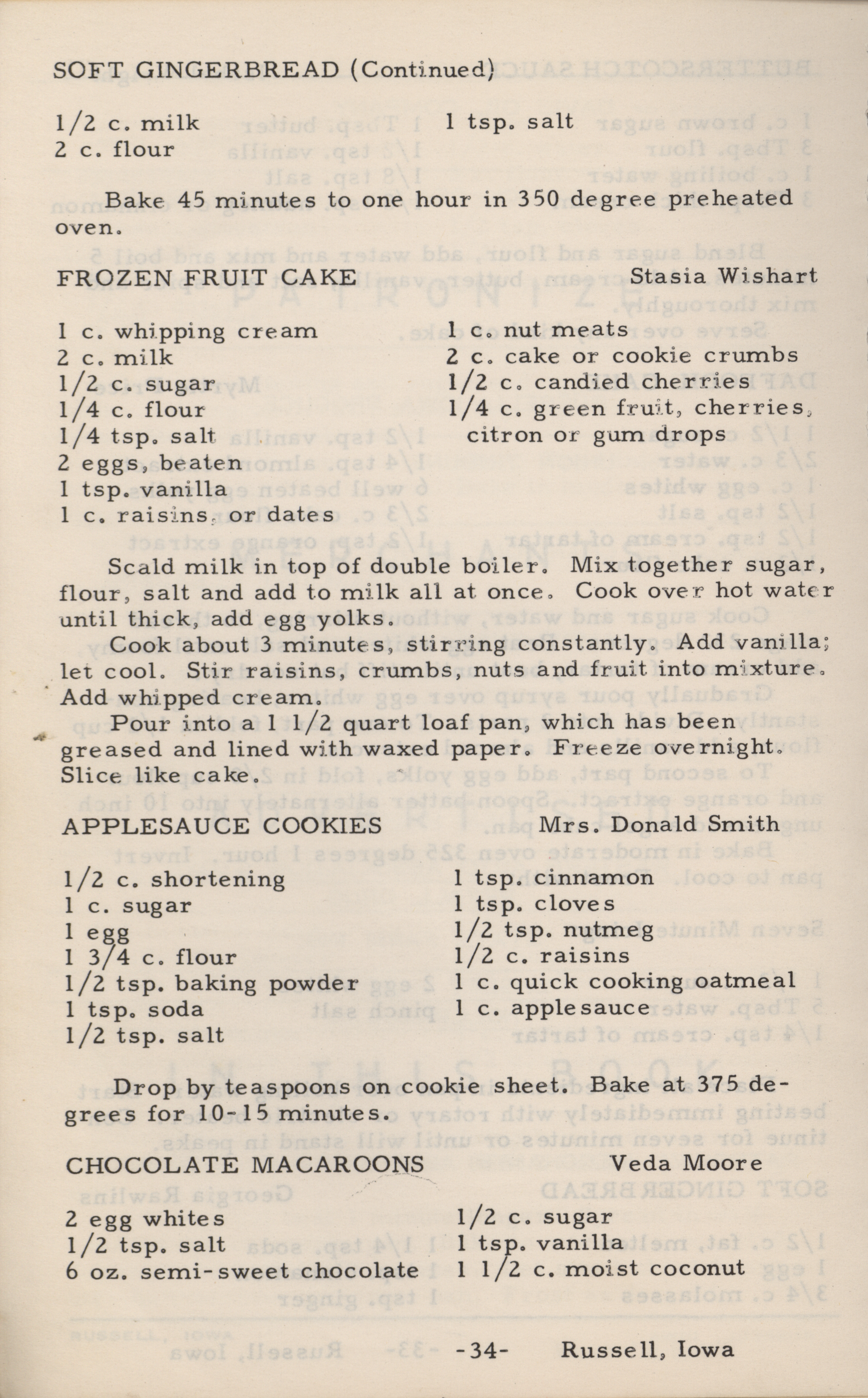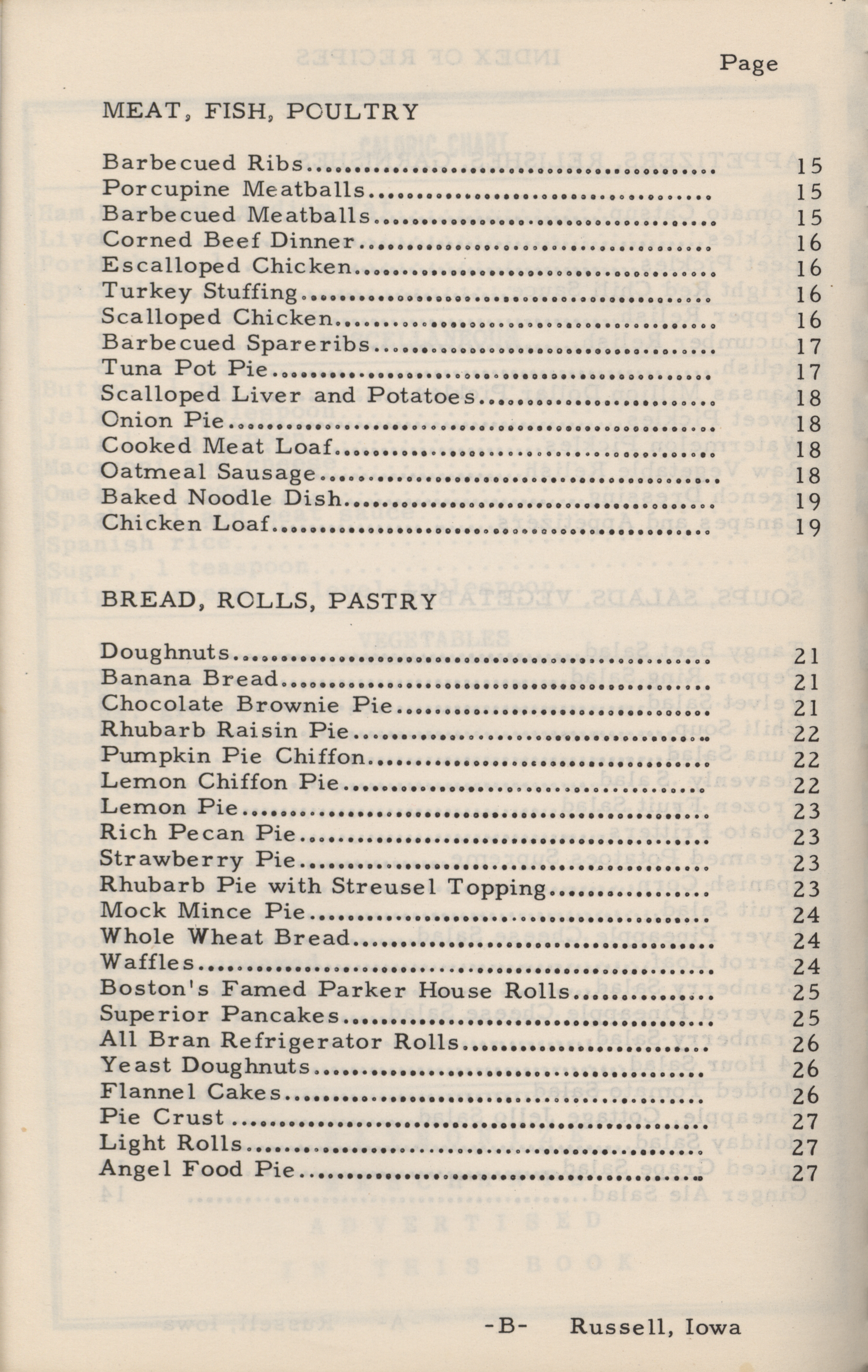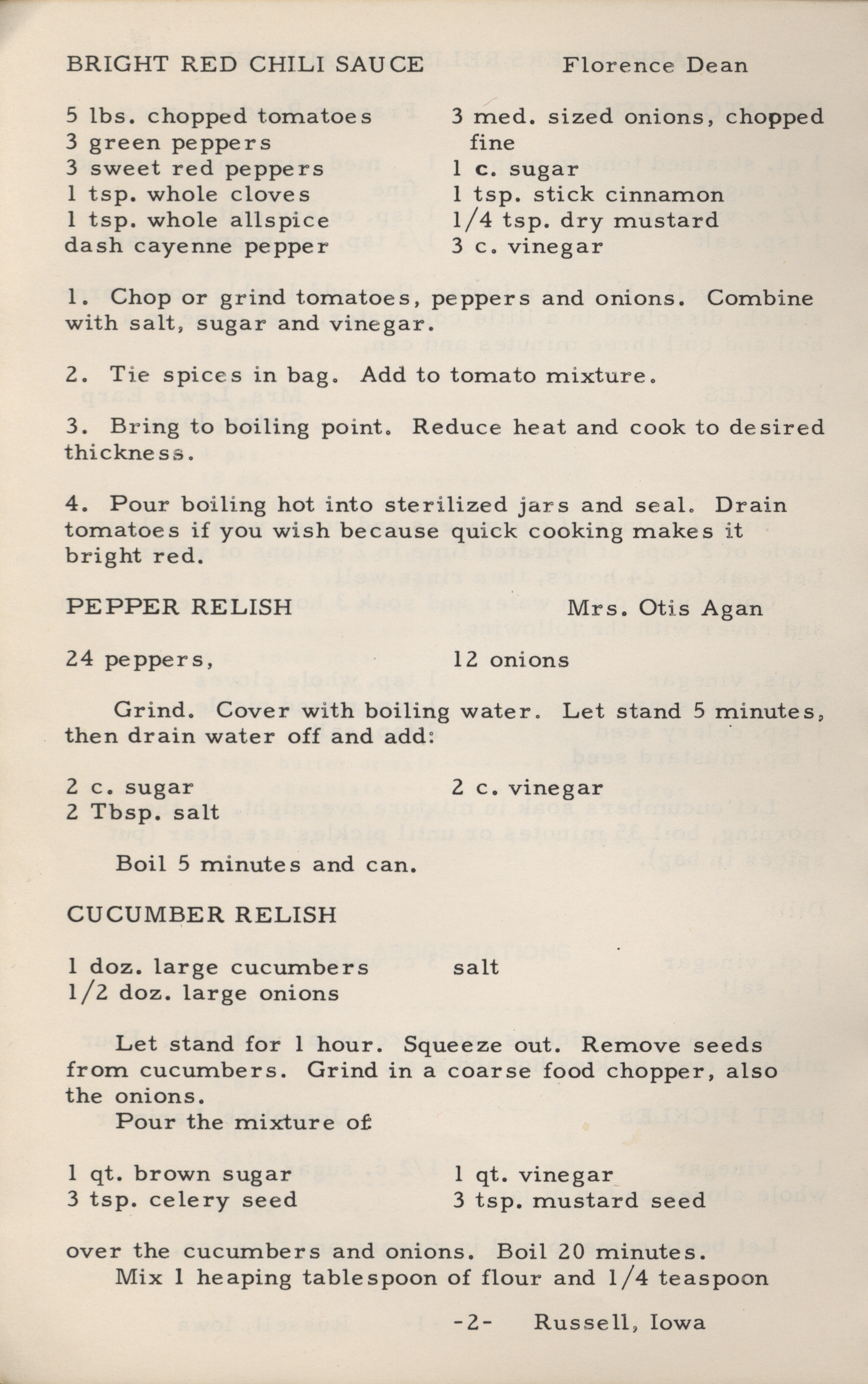 - A community cookbook compiled in 1952 by the Bethel Aid Society of the Evangelical United Brethren Church in Russell, Iowa. This volume features a diverse array of recipes contributed by church members, highlighting local culinary traditions, particularly those involving preserved foods and wild game recipes. It also features advertisements from local businesses, reflecting mid-century rural life in southern Iowa.