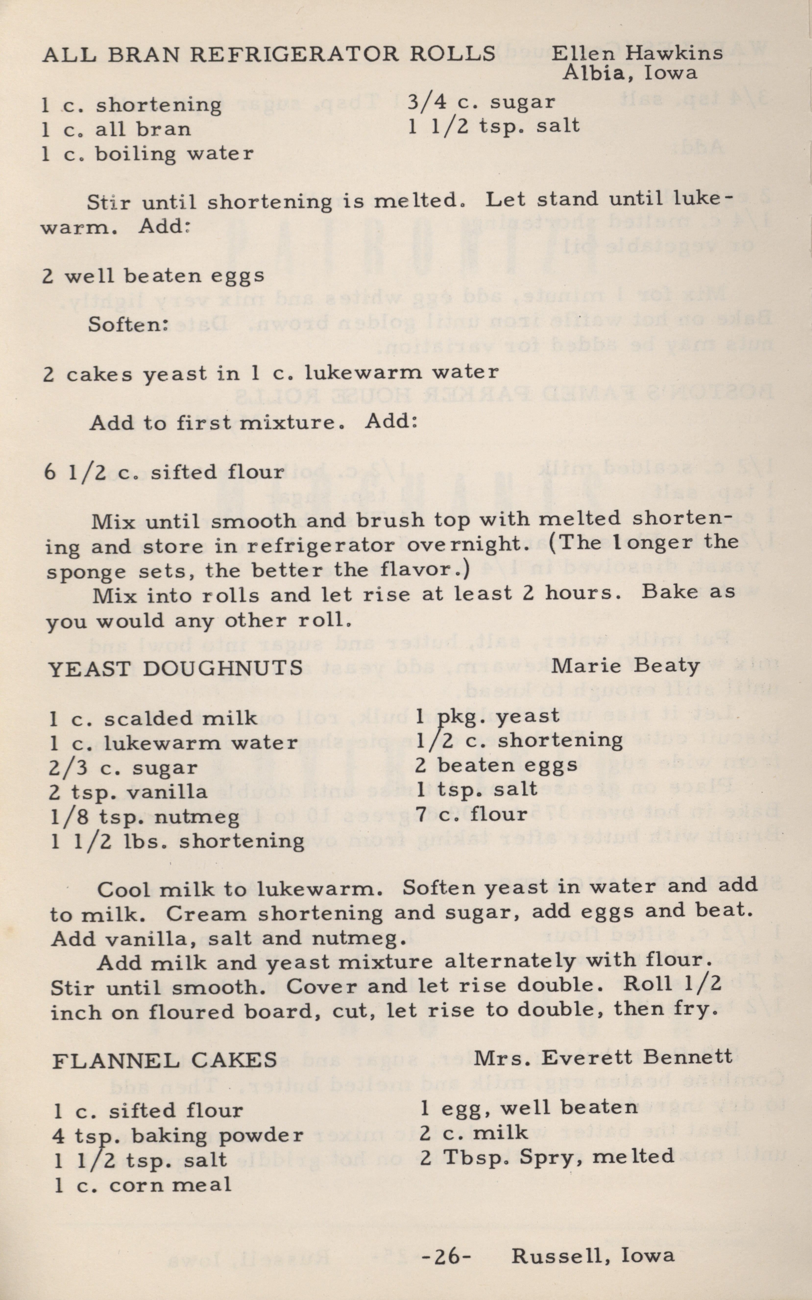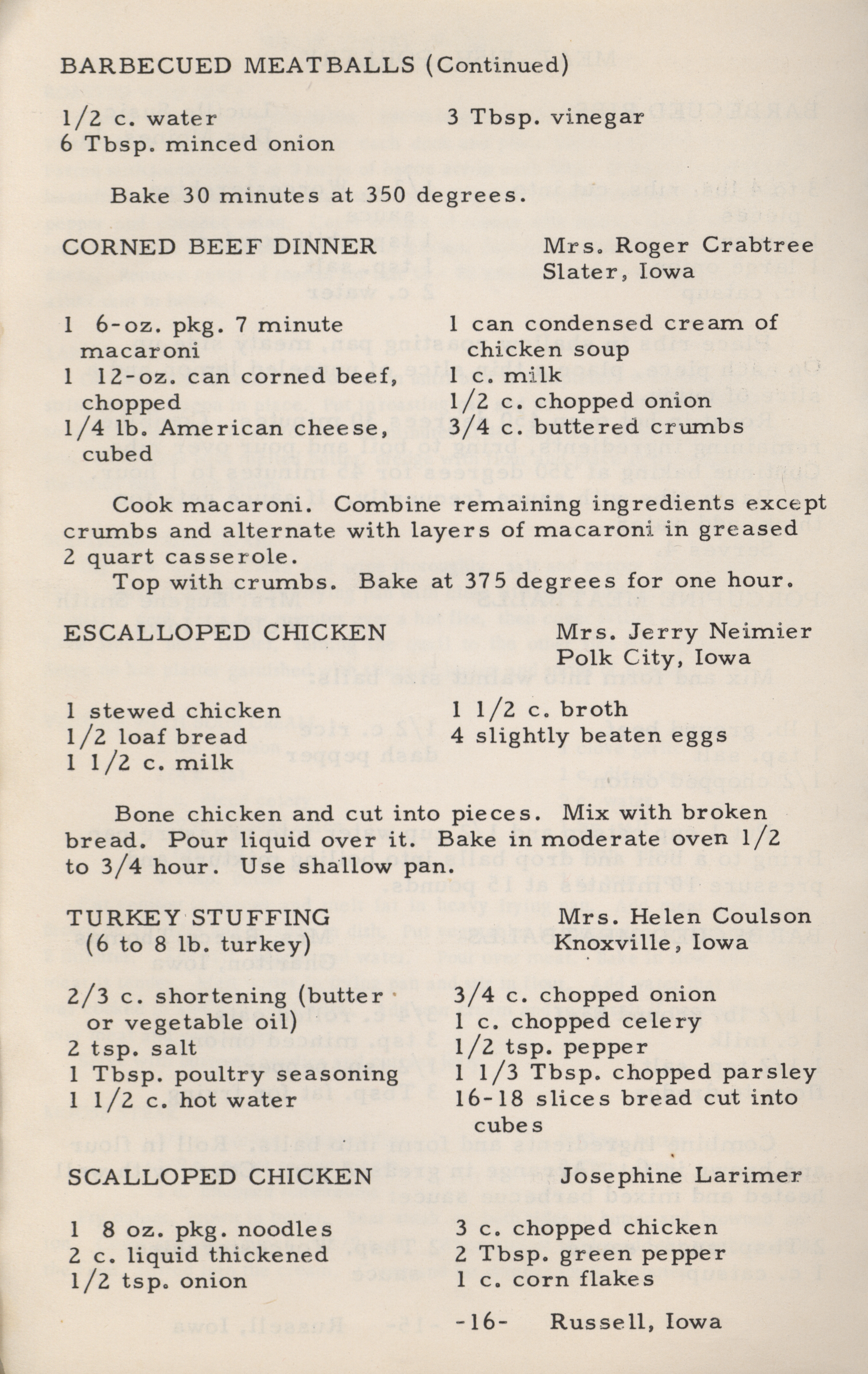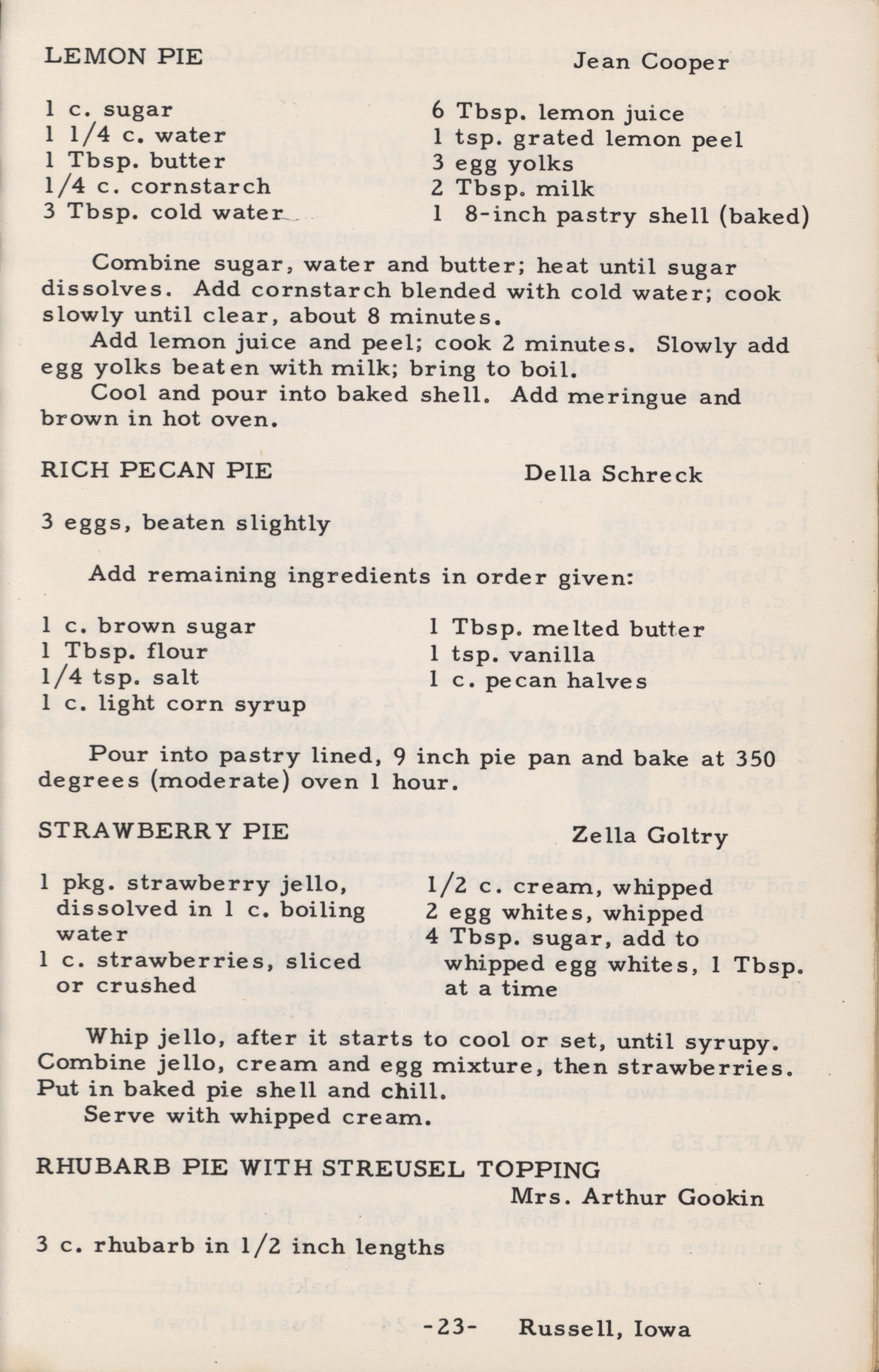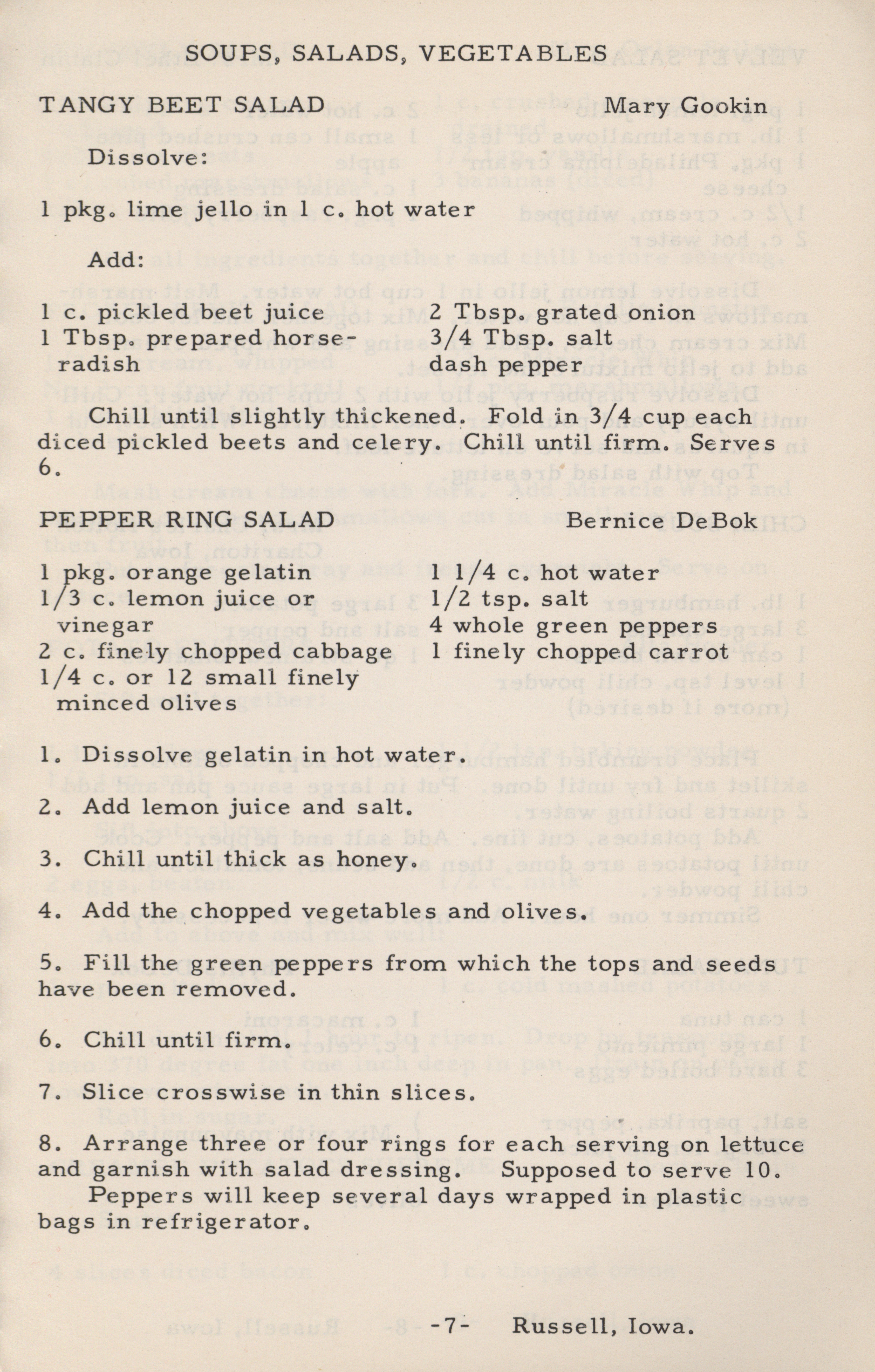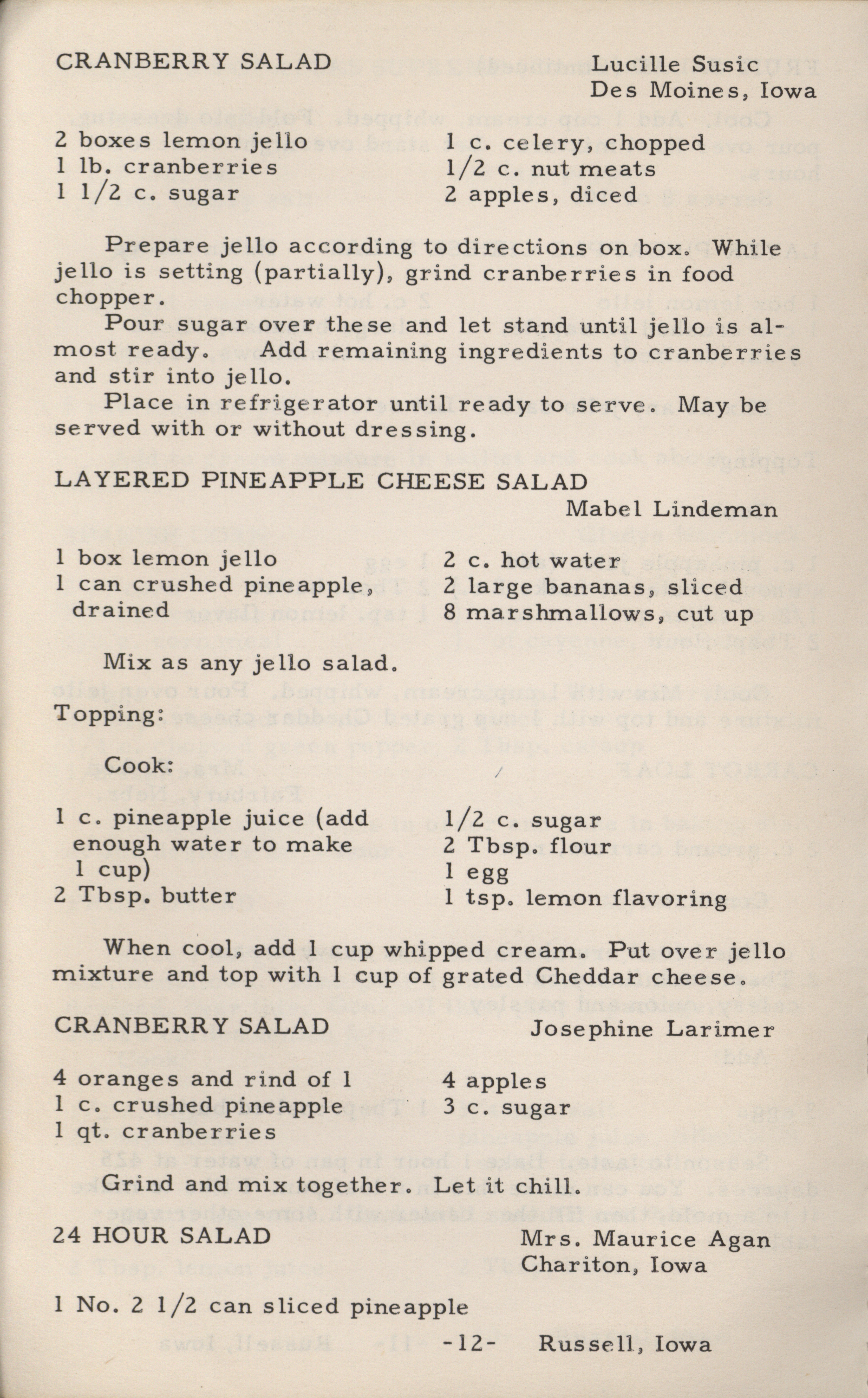 - A community cookbook compiled in 1952 by the Bethel Aid Society of the Evangelical United Brethren Church in Russell, Iowa. This volume features a diverse array of recipes contributed by church members, highlighting local culinary traditions, particularly those involving preserved foods and wild game recipes. It also features advertisements from local businesses, reflecting mid-century rural life in southern Iowa.