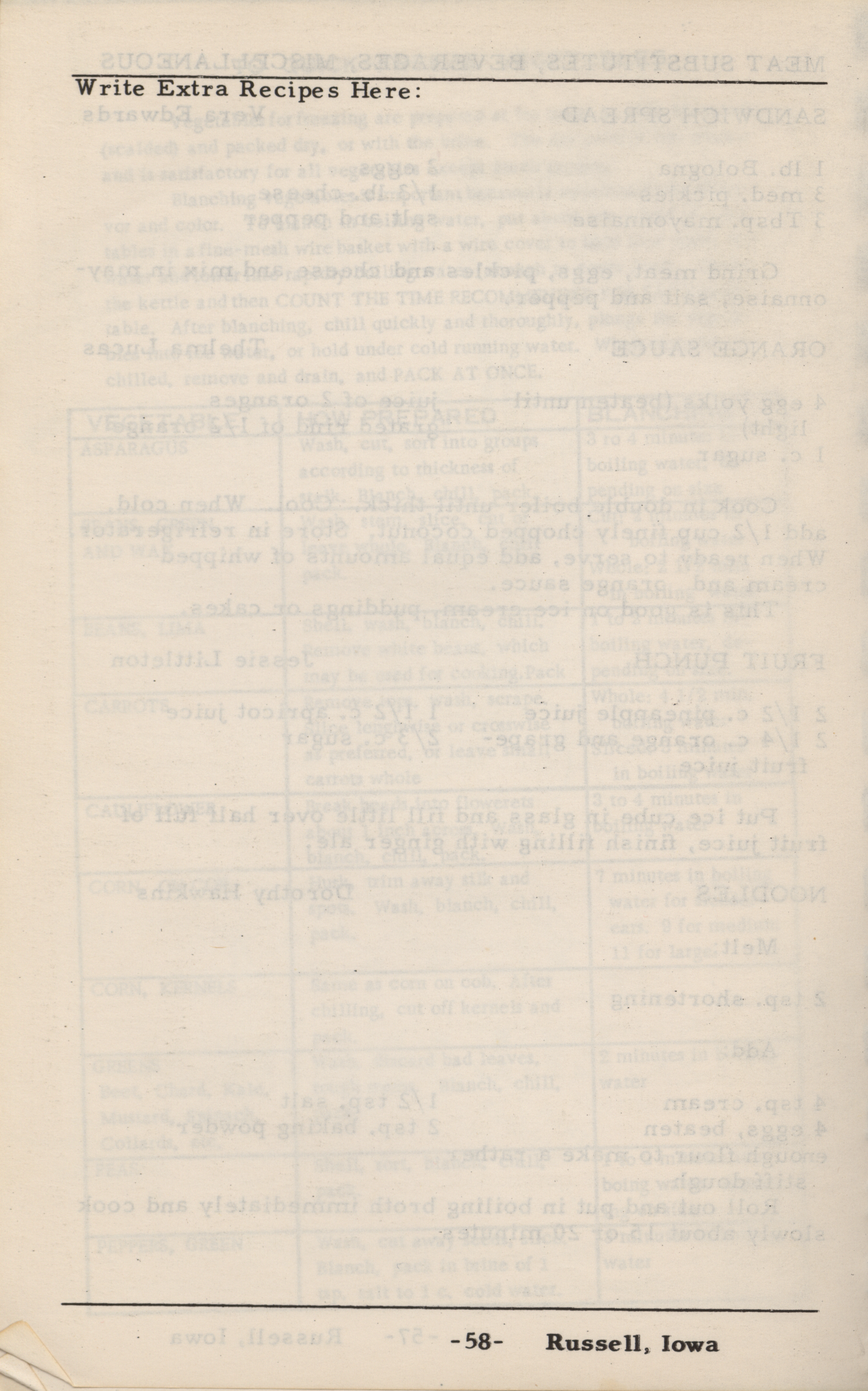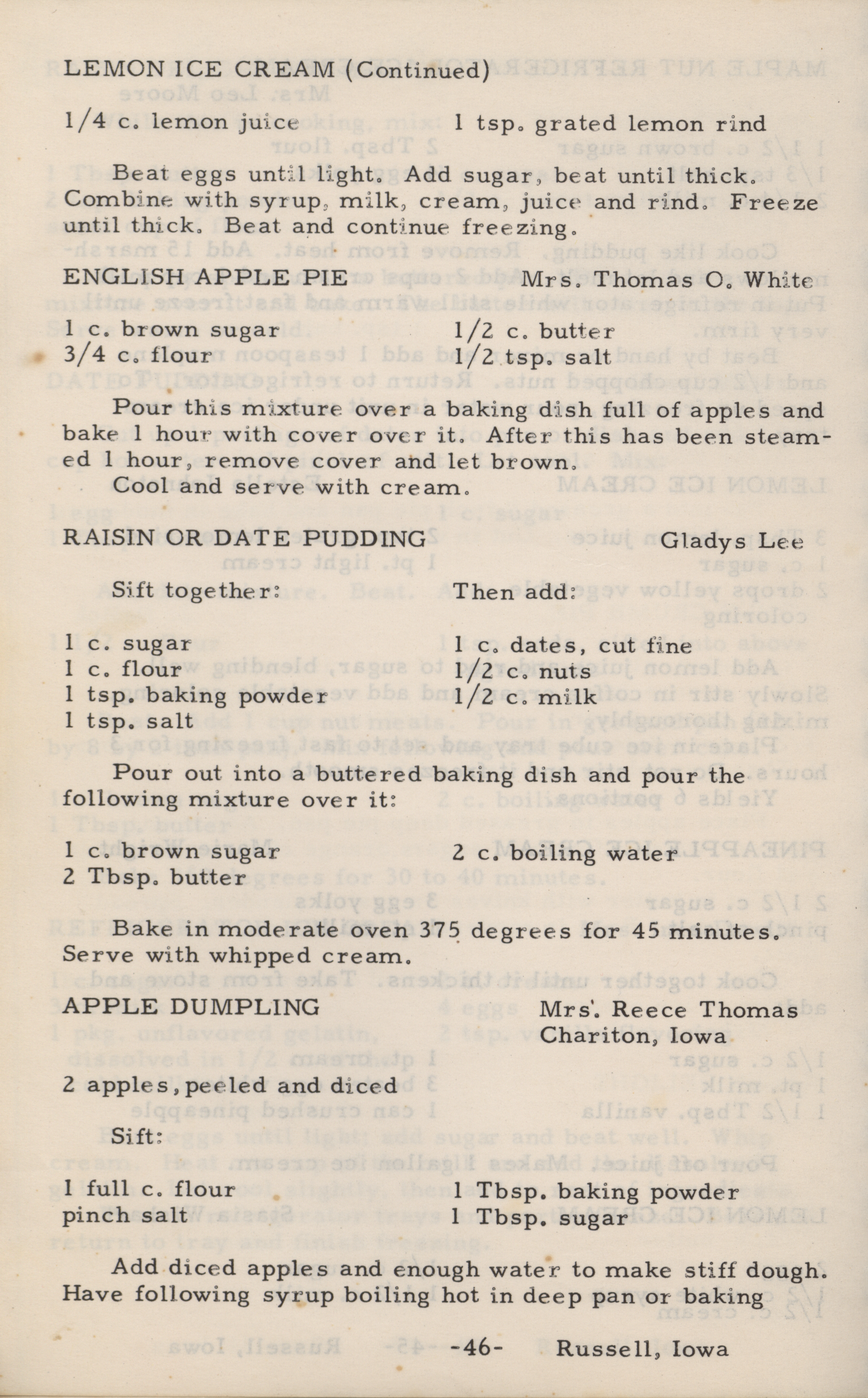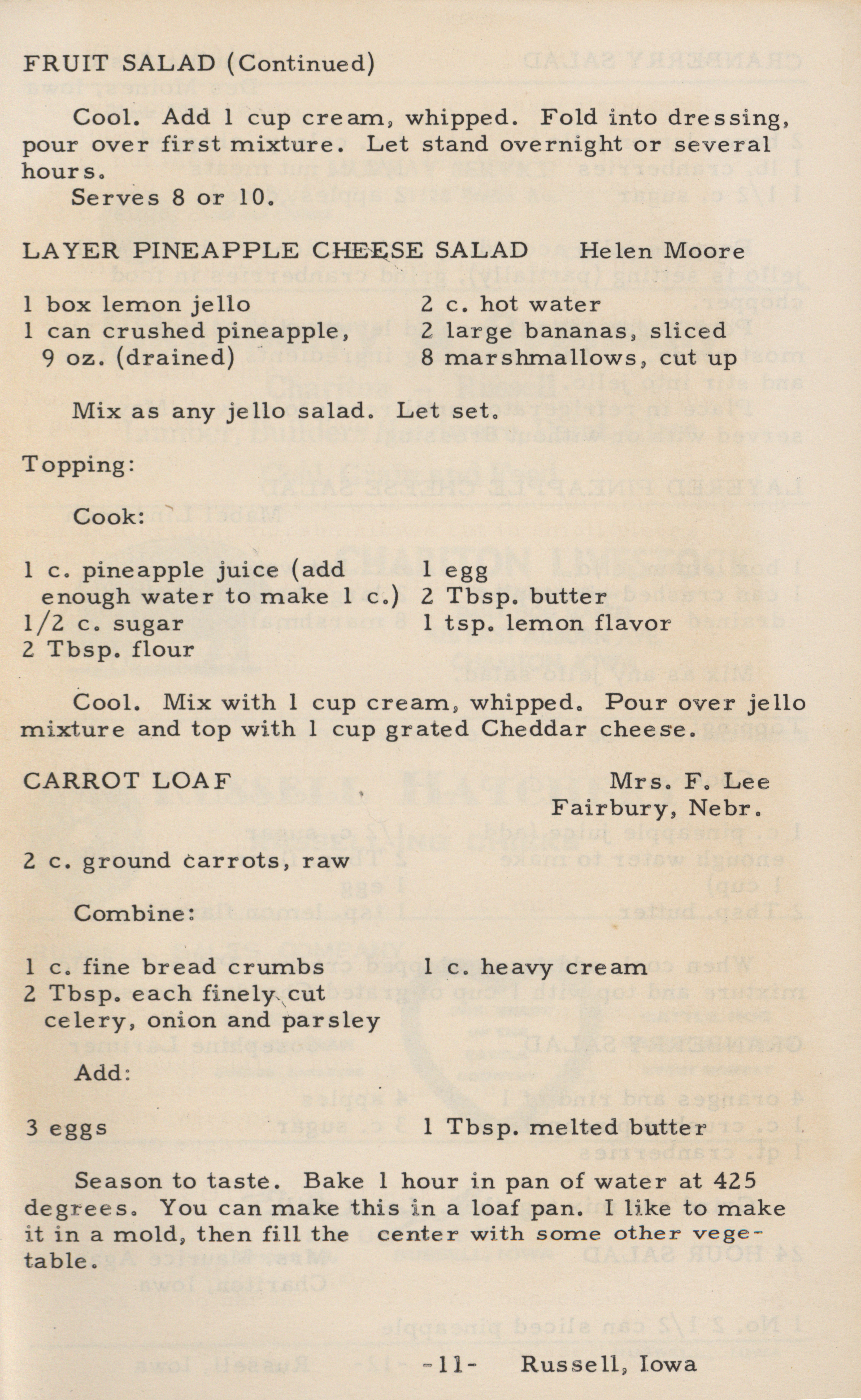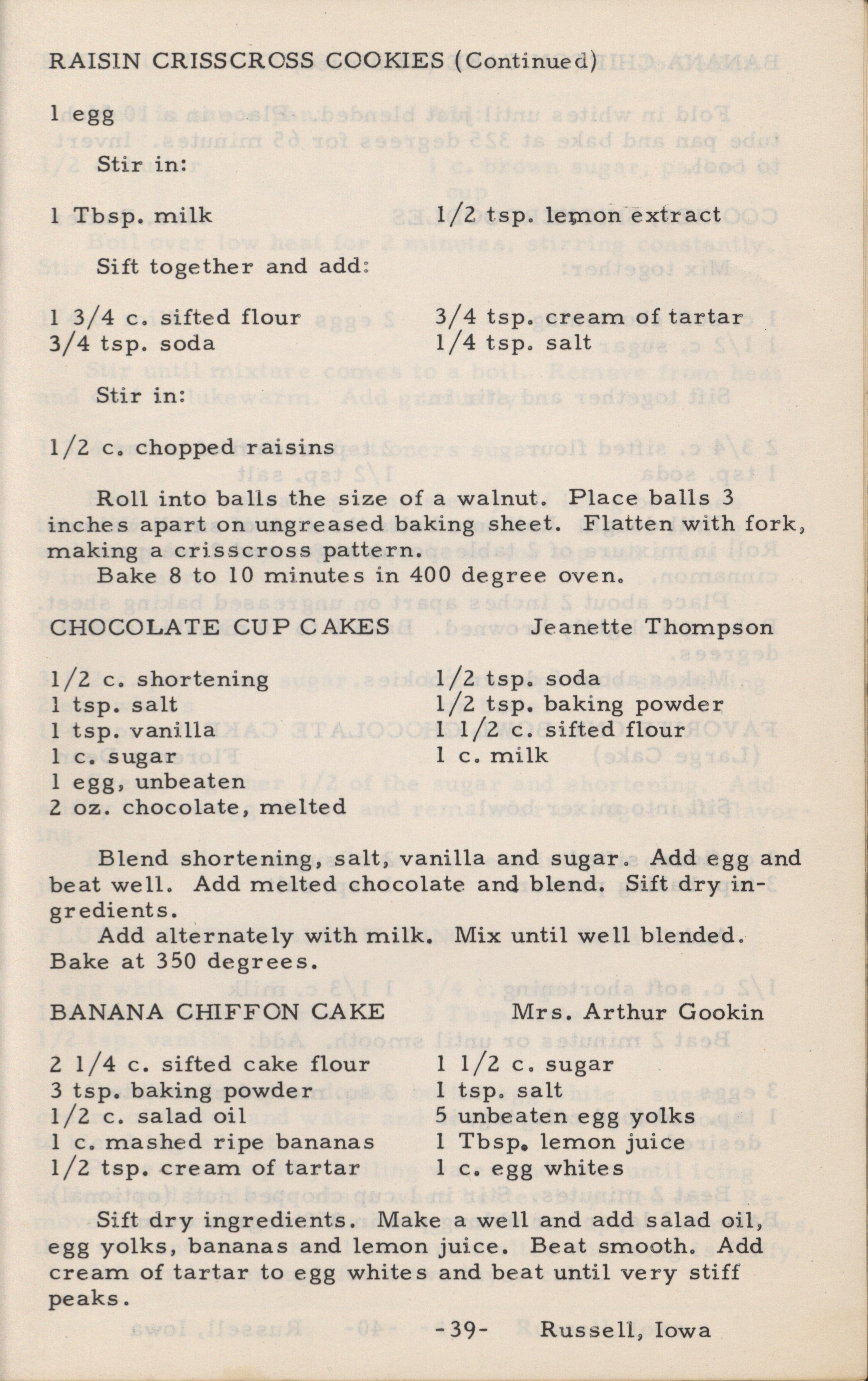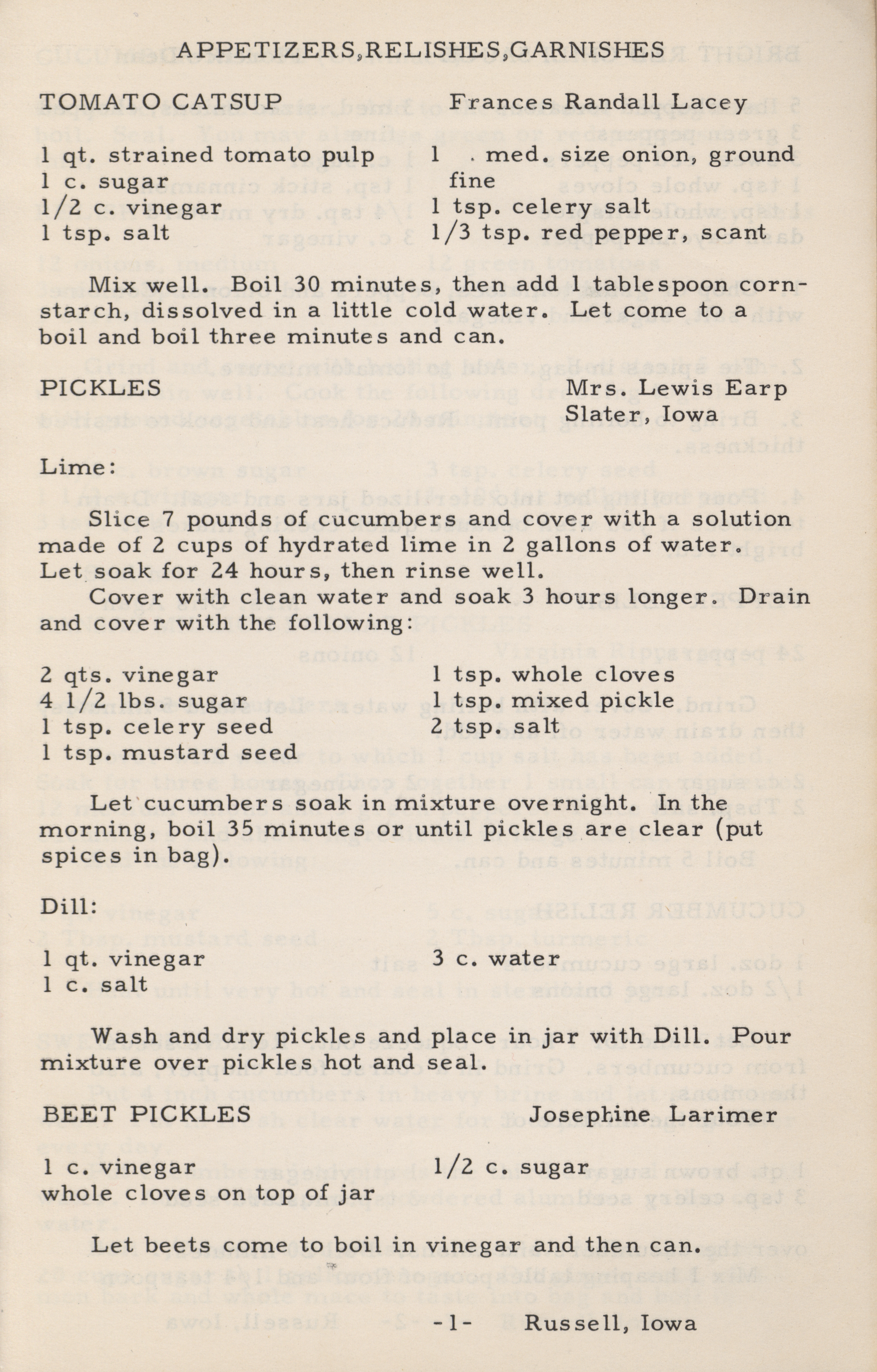 - A community cookbook compiled in 1952 by the Bethel Aid Society of the Evangelical United Brethren Church in Russell, Iowa. This volume features a diverse array of recipes contributed by church members, highlighting local culinary traditions, particularly those involving preserved foods and wild game recipes. It also features advertisements from local businesses, reflecting mid-century rural life in southern Iowa.