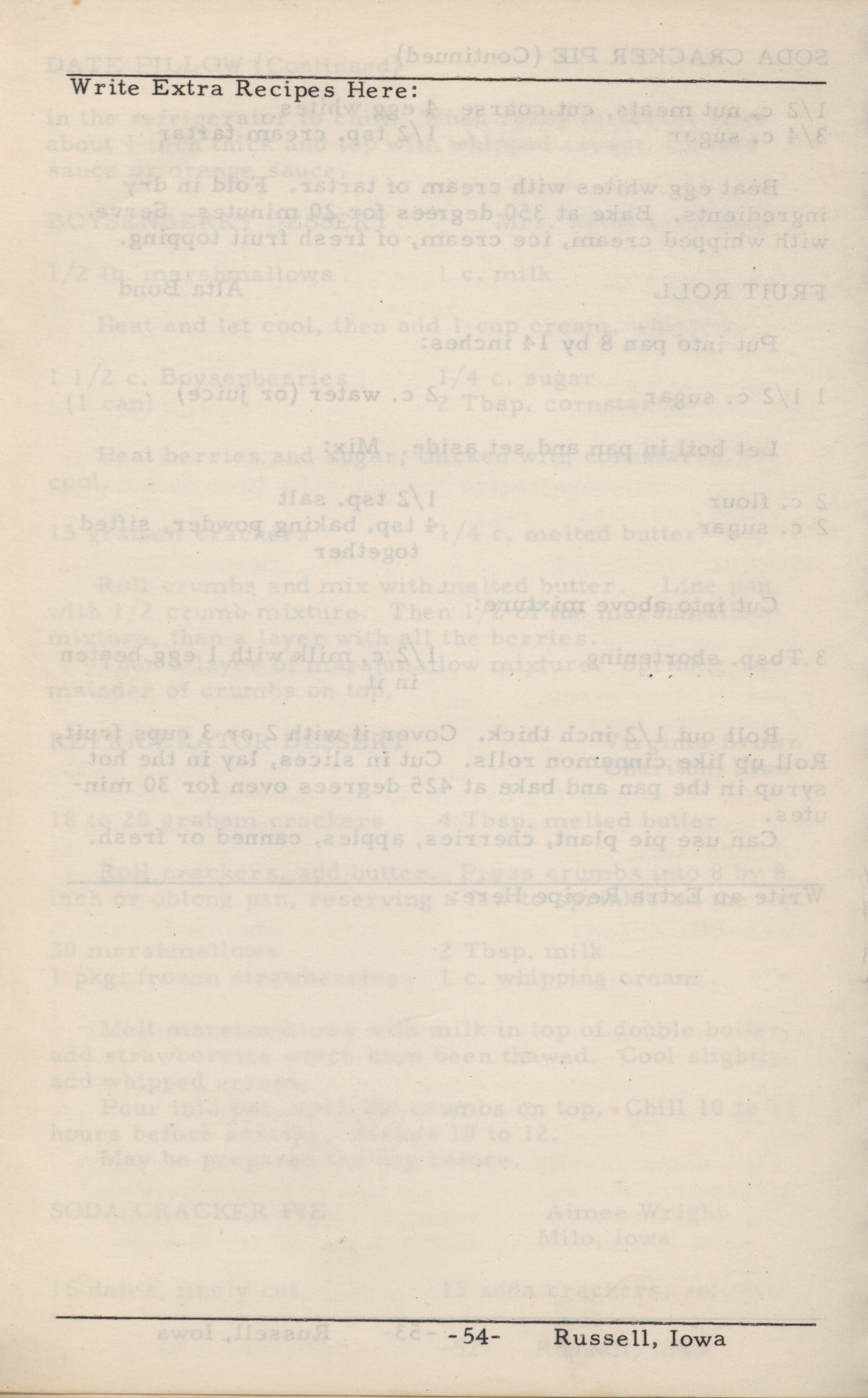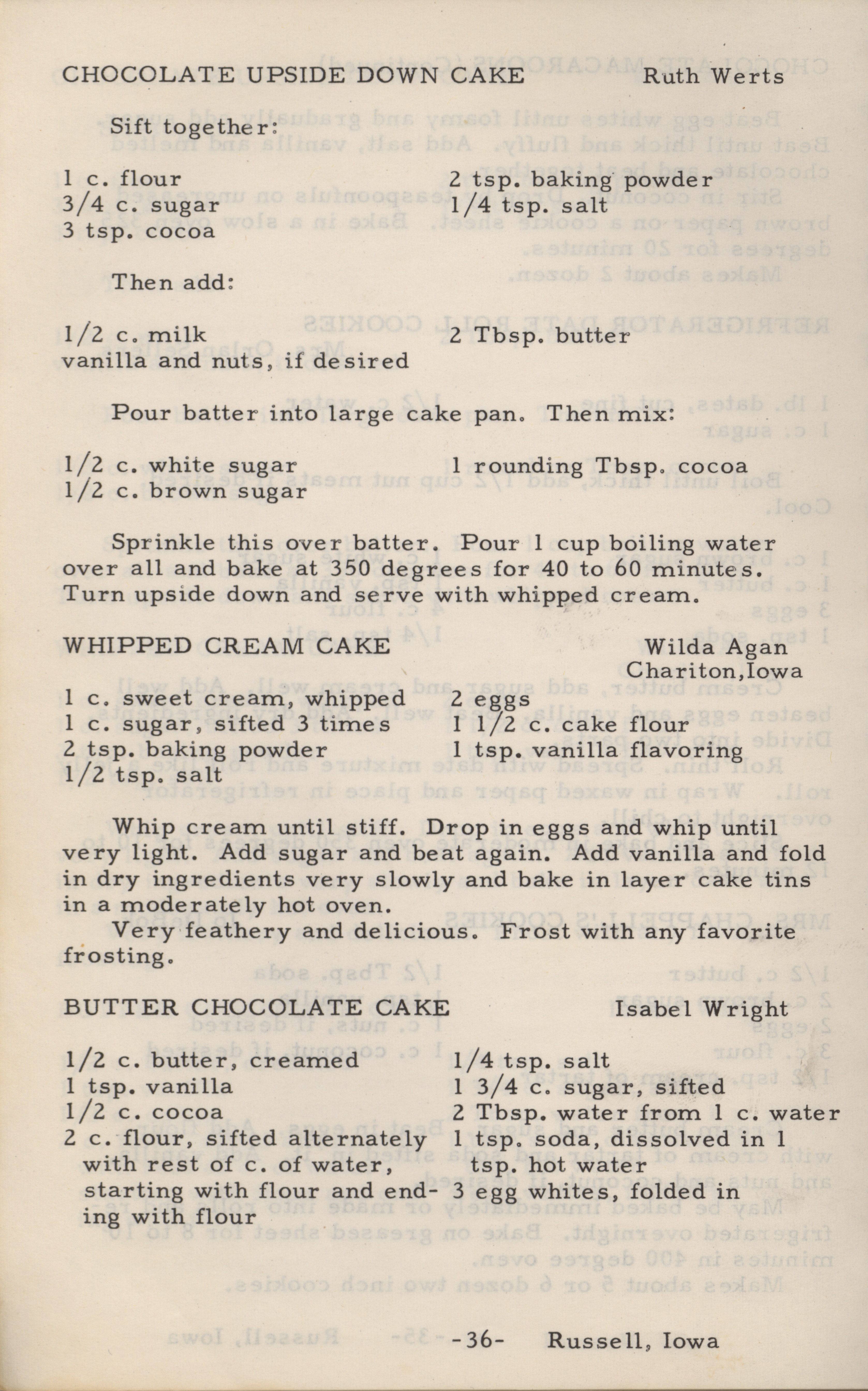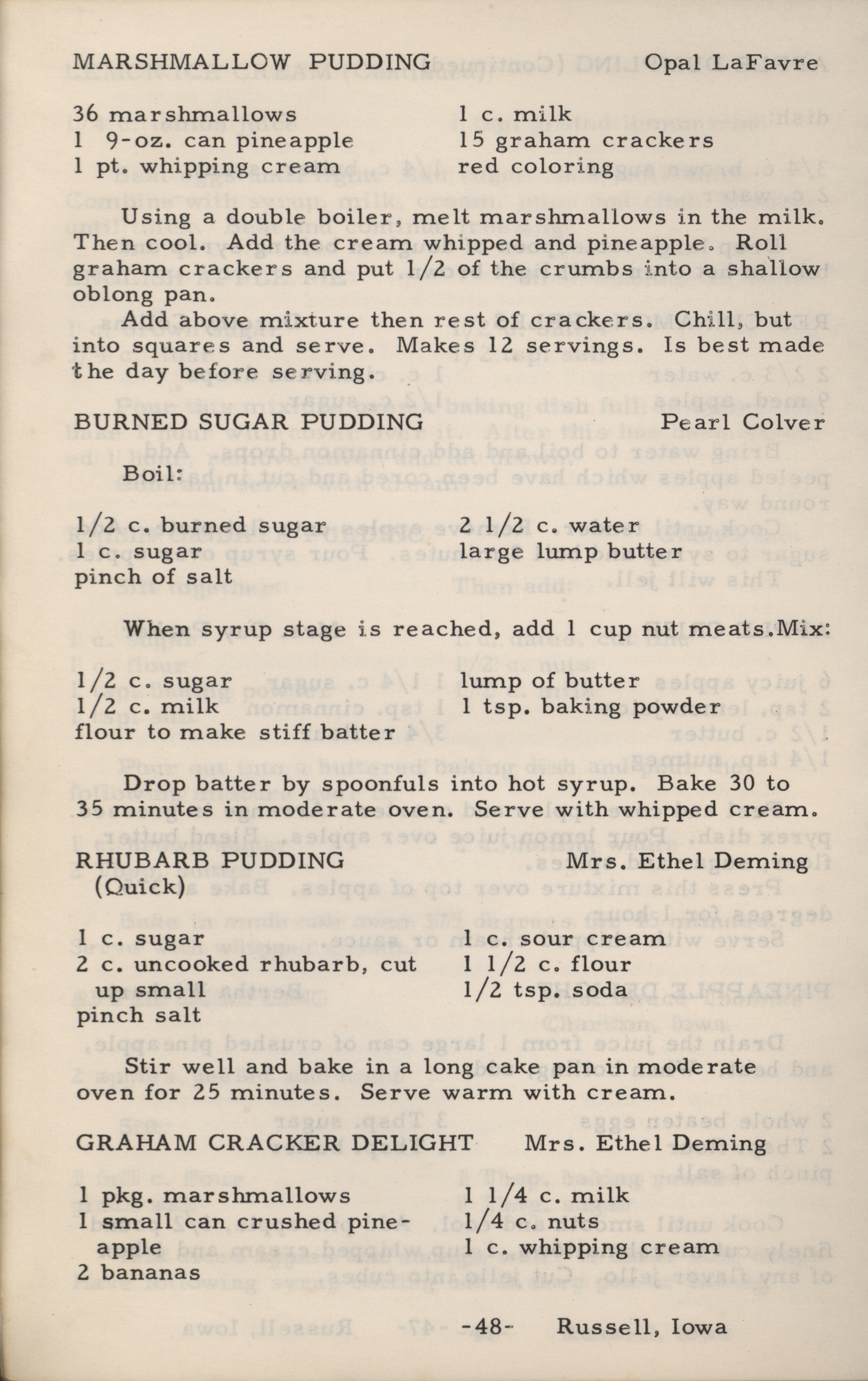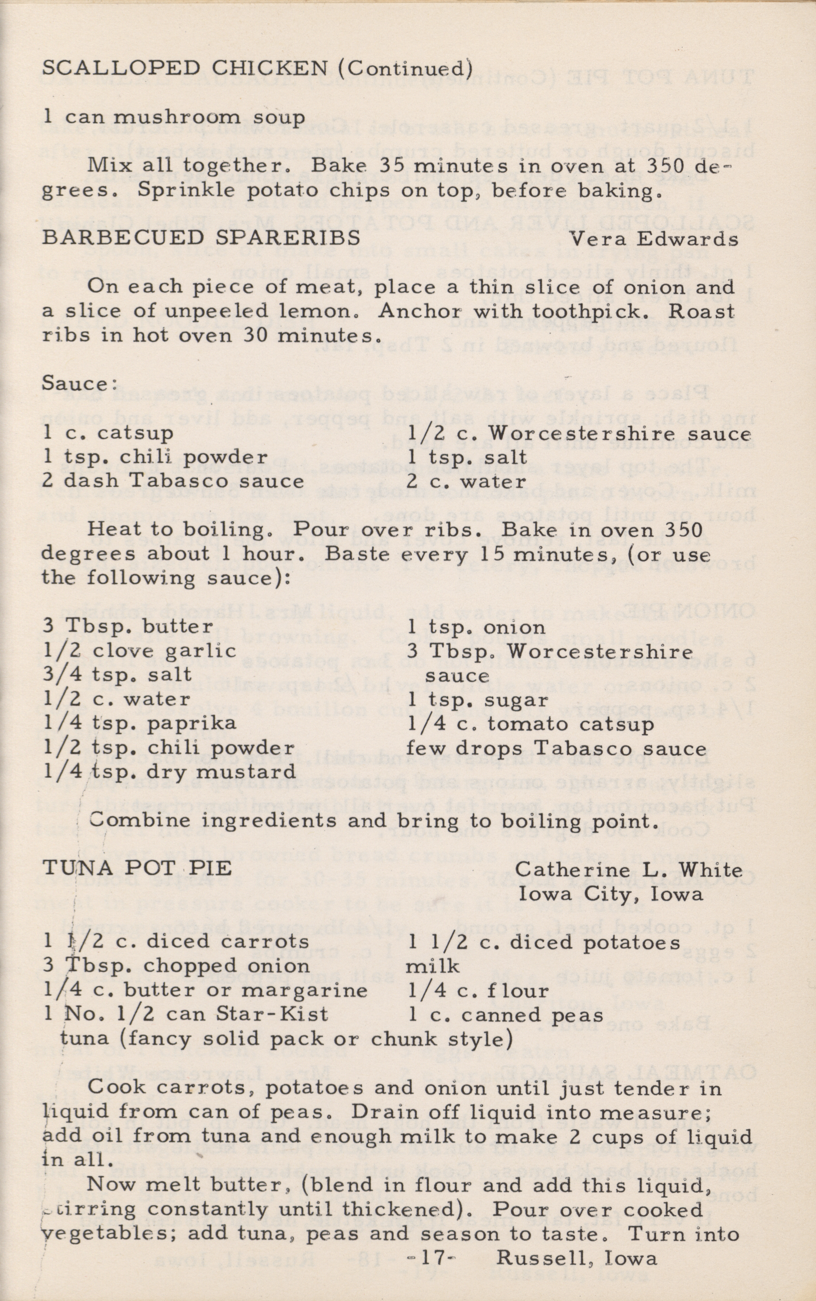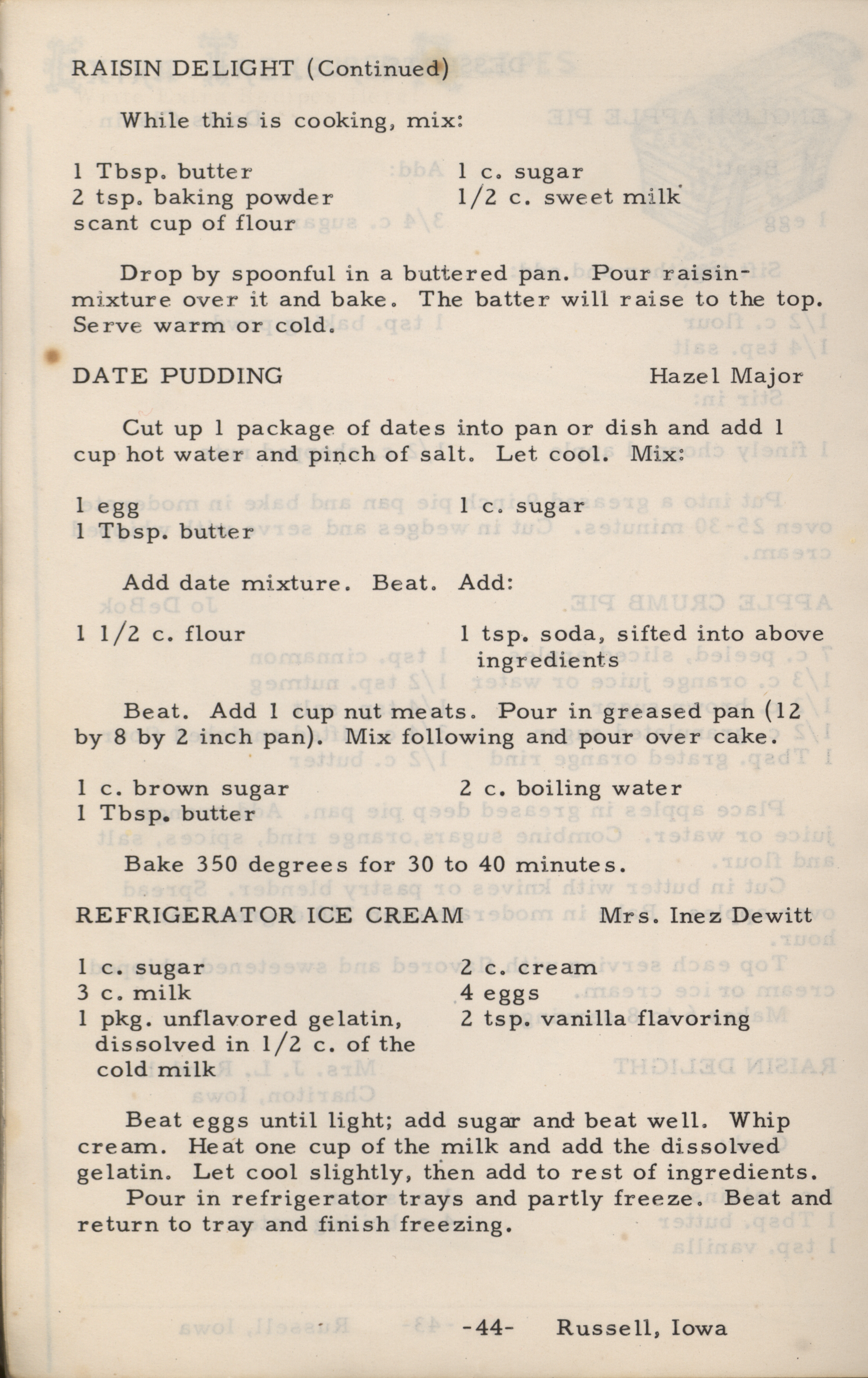 - A community cookbook compiled in 1952 by the Bethel Aid Society of the Evangelical United Brethren Church in Russell, Iowa. This volume features a diverse array of recipes contributed by church members, highlighting local culinary traditions, particularly those involving preserved foods and wild game recipes. It also features advertisements from local businesses, reflecting mid-century rural life in southern Iowa.