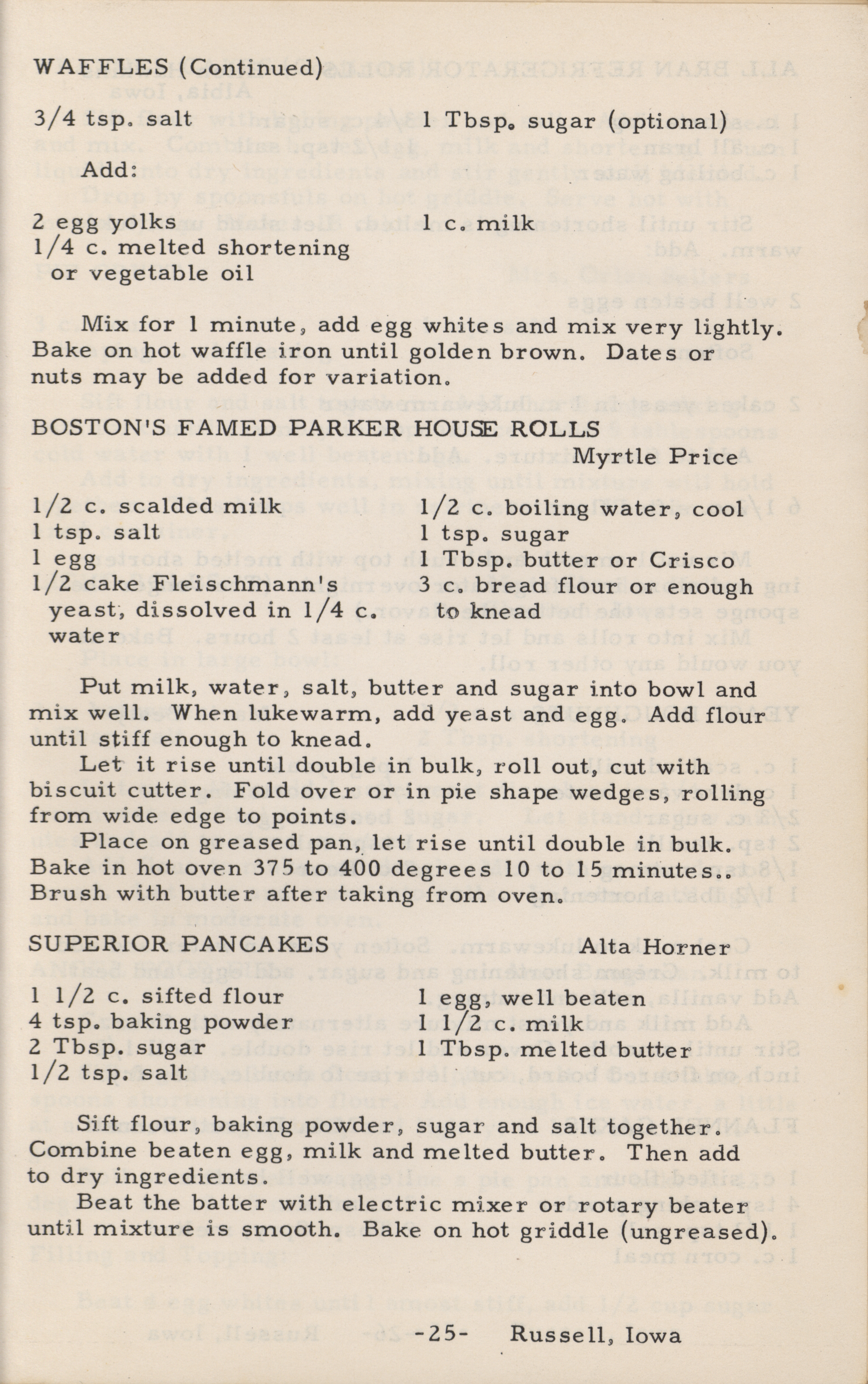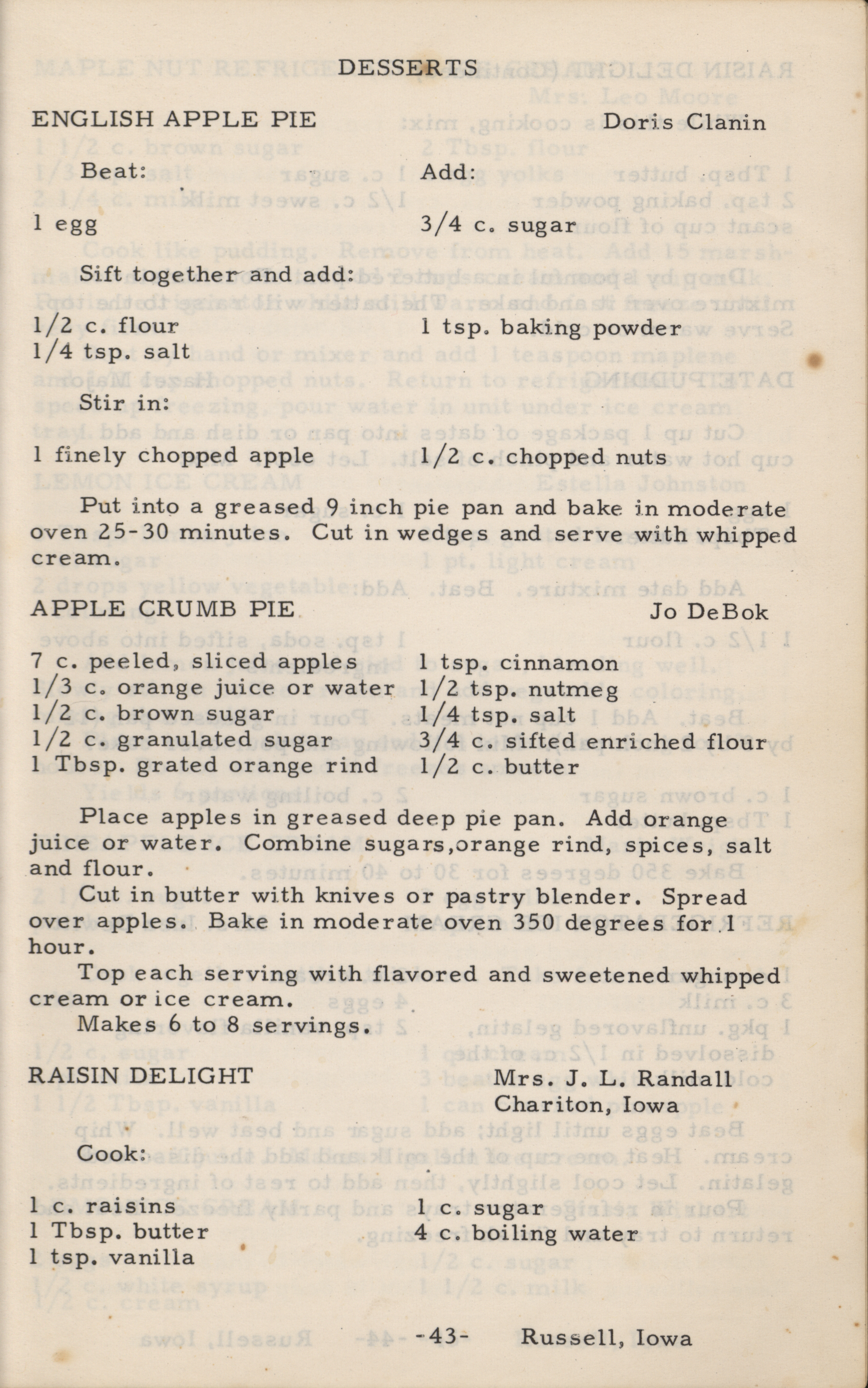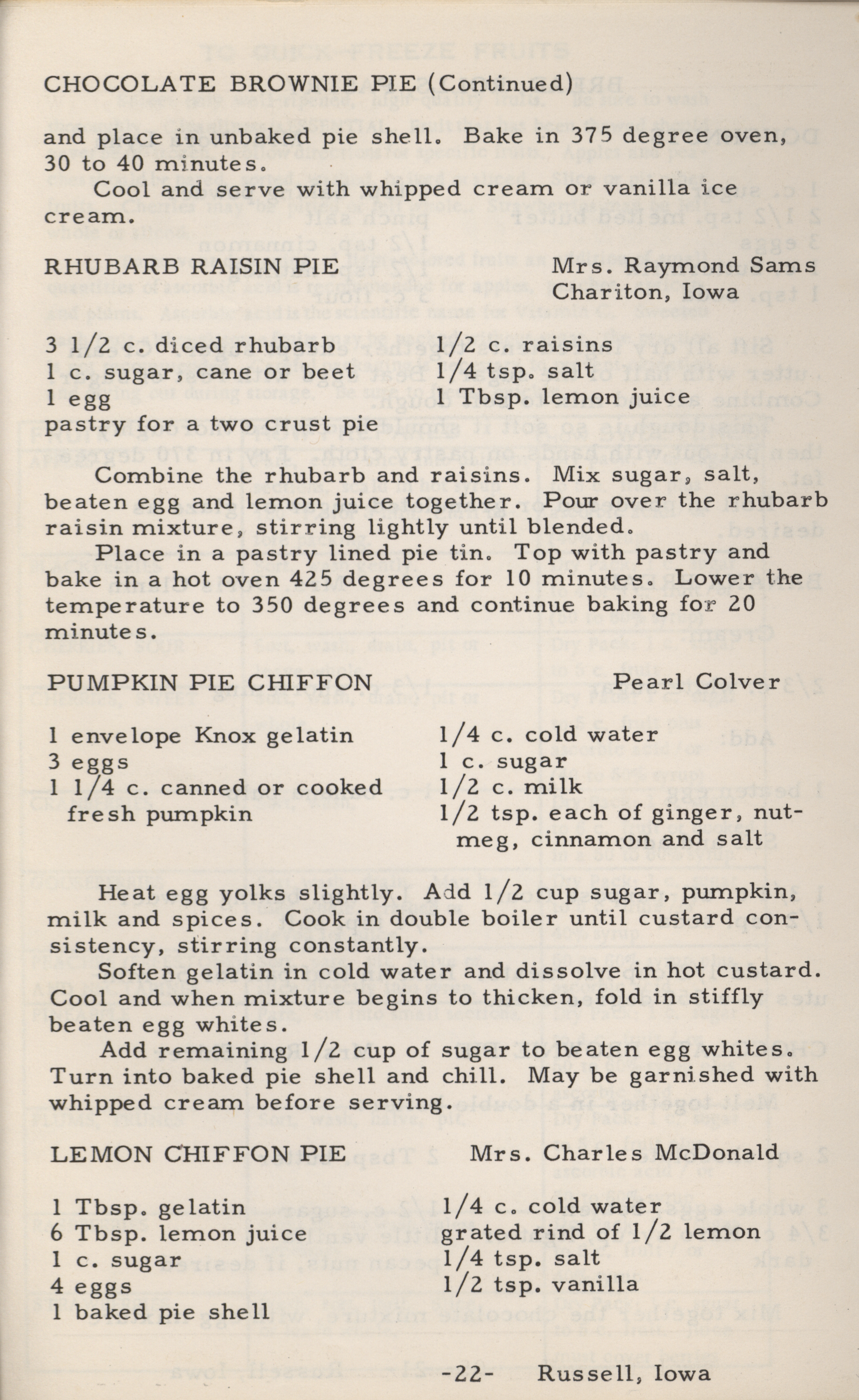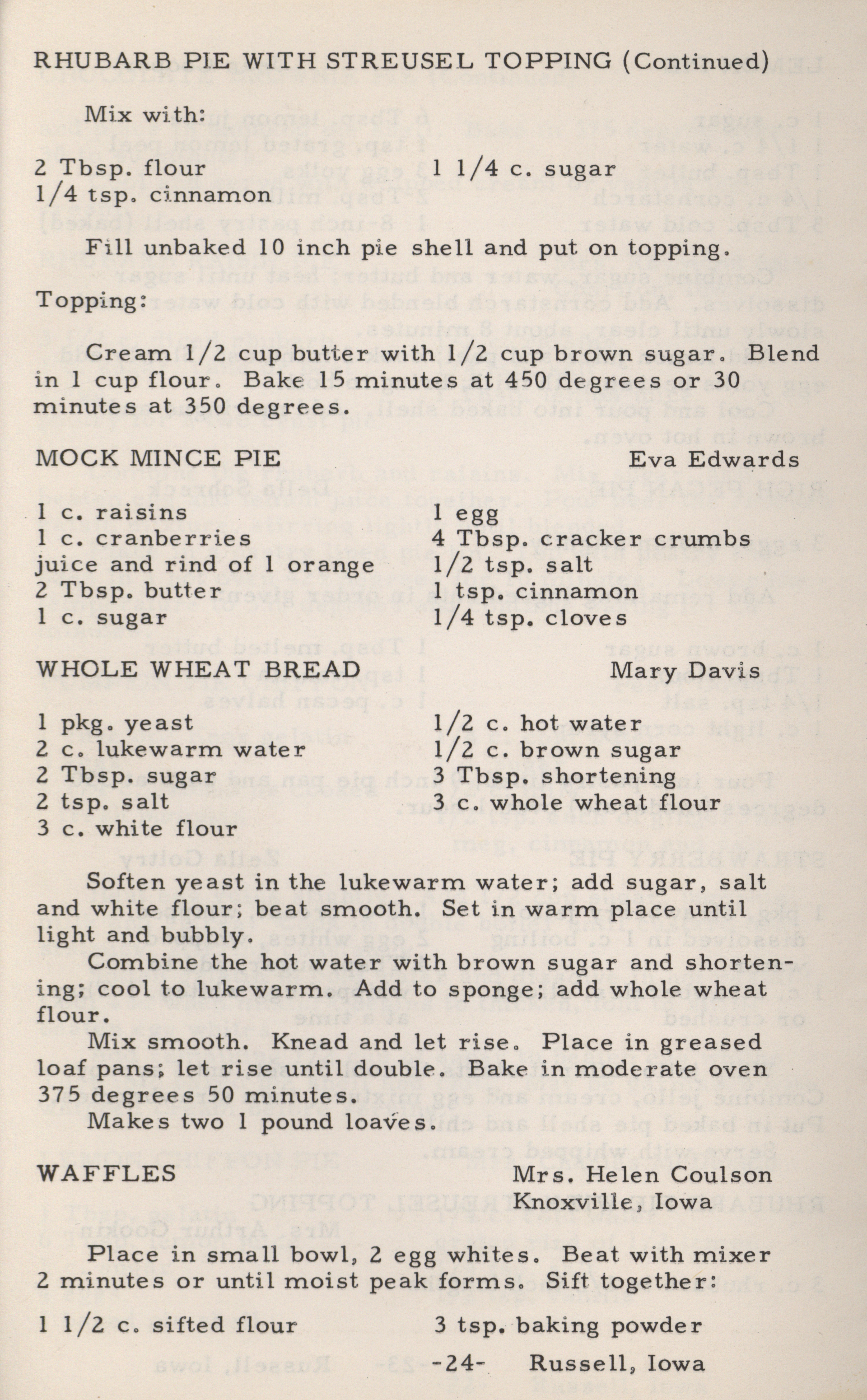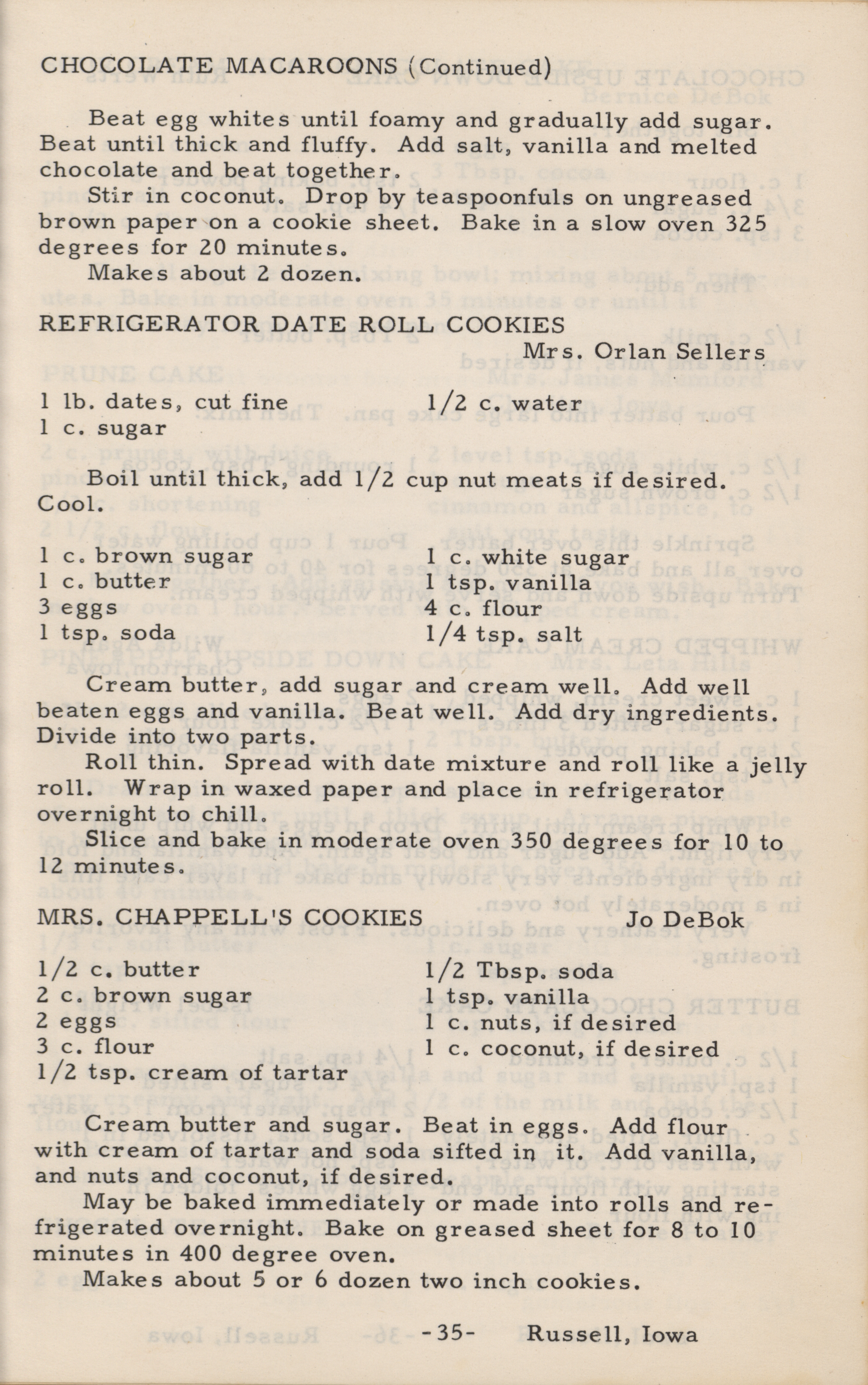 - A community cookbook compiled in 1952 by the Bethel Aid Society of the Evangelical United Brethren Church in Russell, Iowa. This volume features a diverse array of recipes contributed by church members, highlighting local culinary traditions, particularly those involving preserved foods and wild game recipes. It also features advertisements from local businesses, reflecting mid-century rural life in southern Iowa.