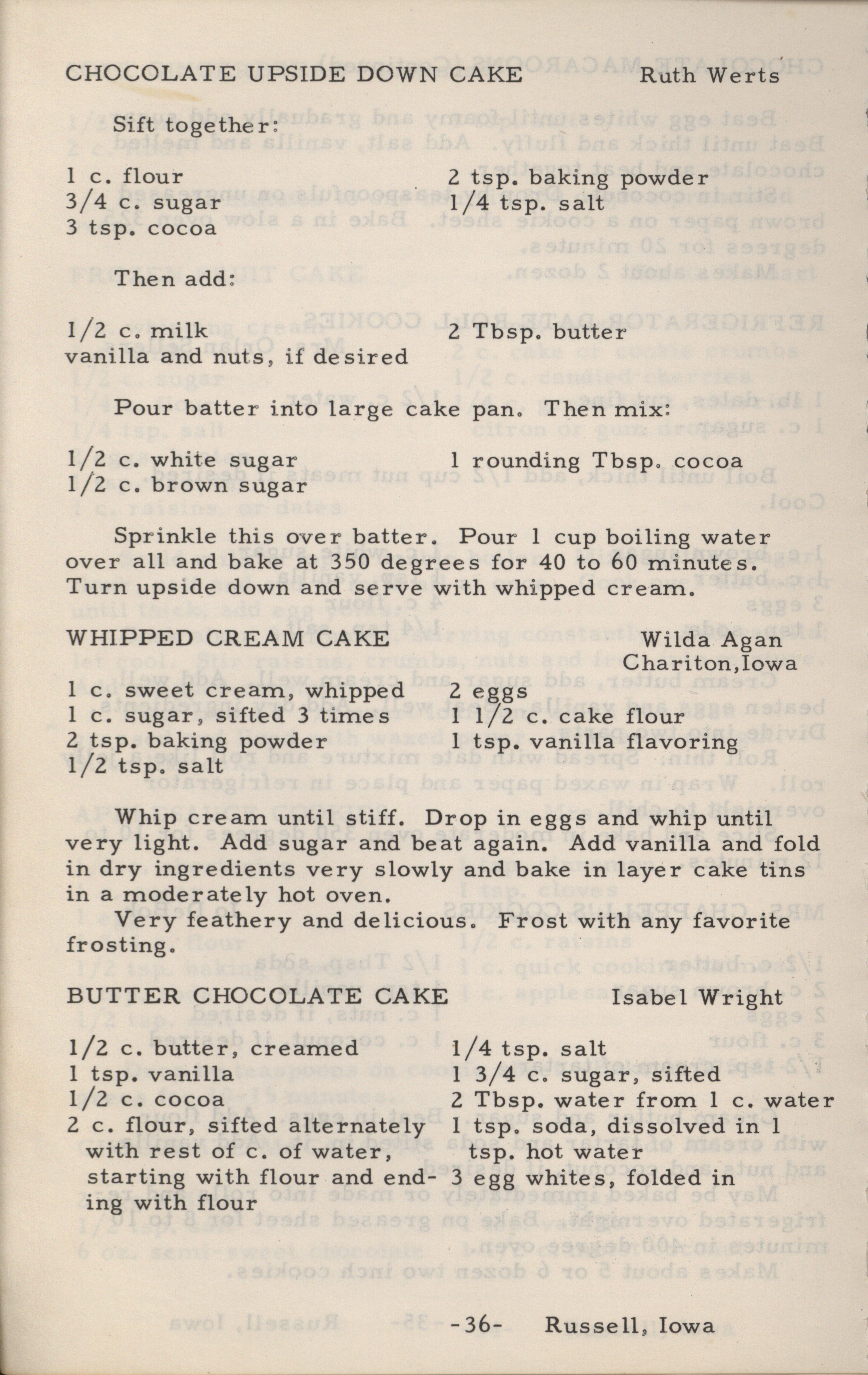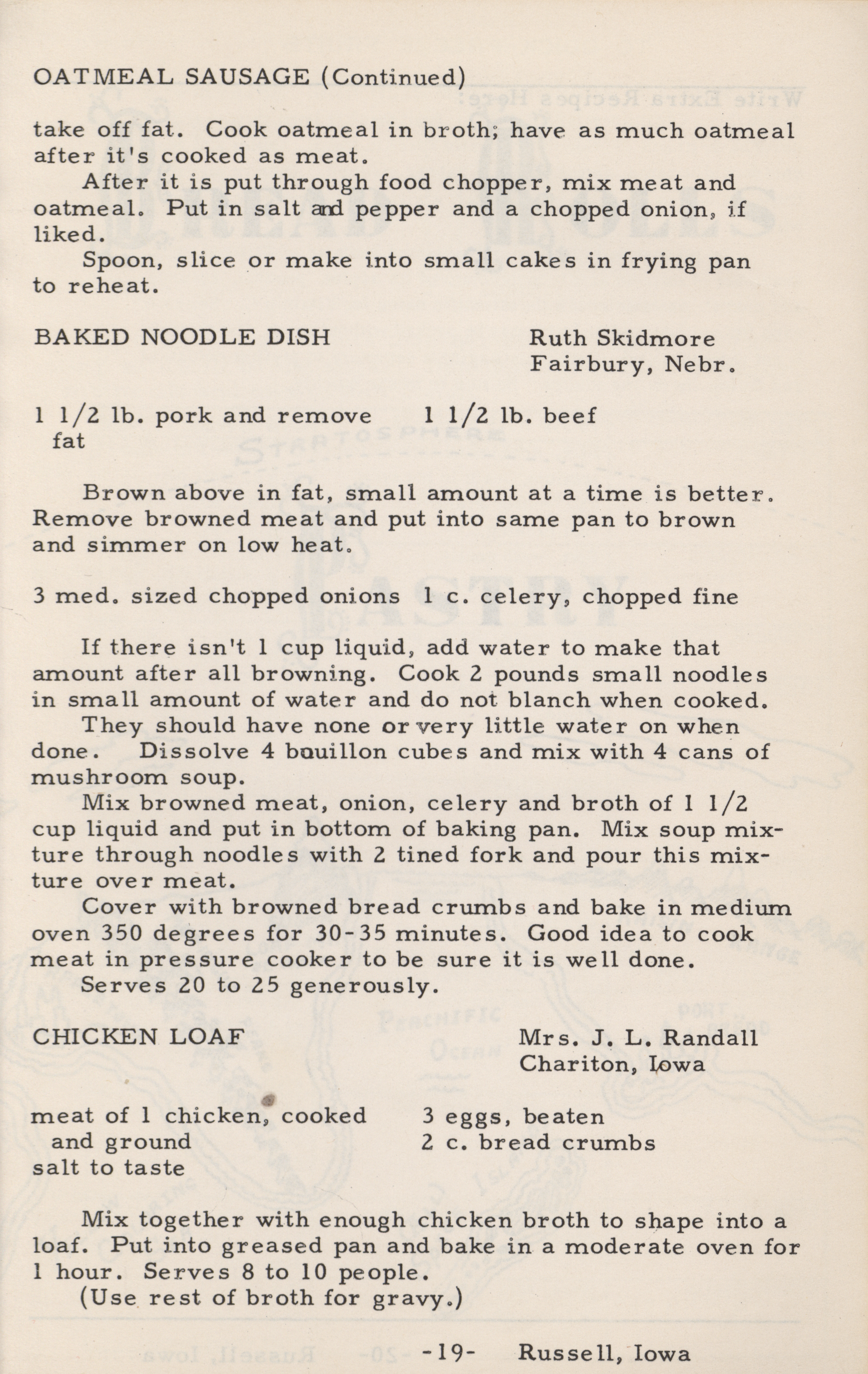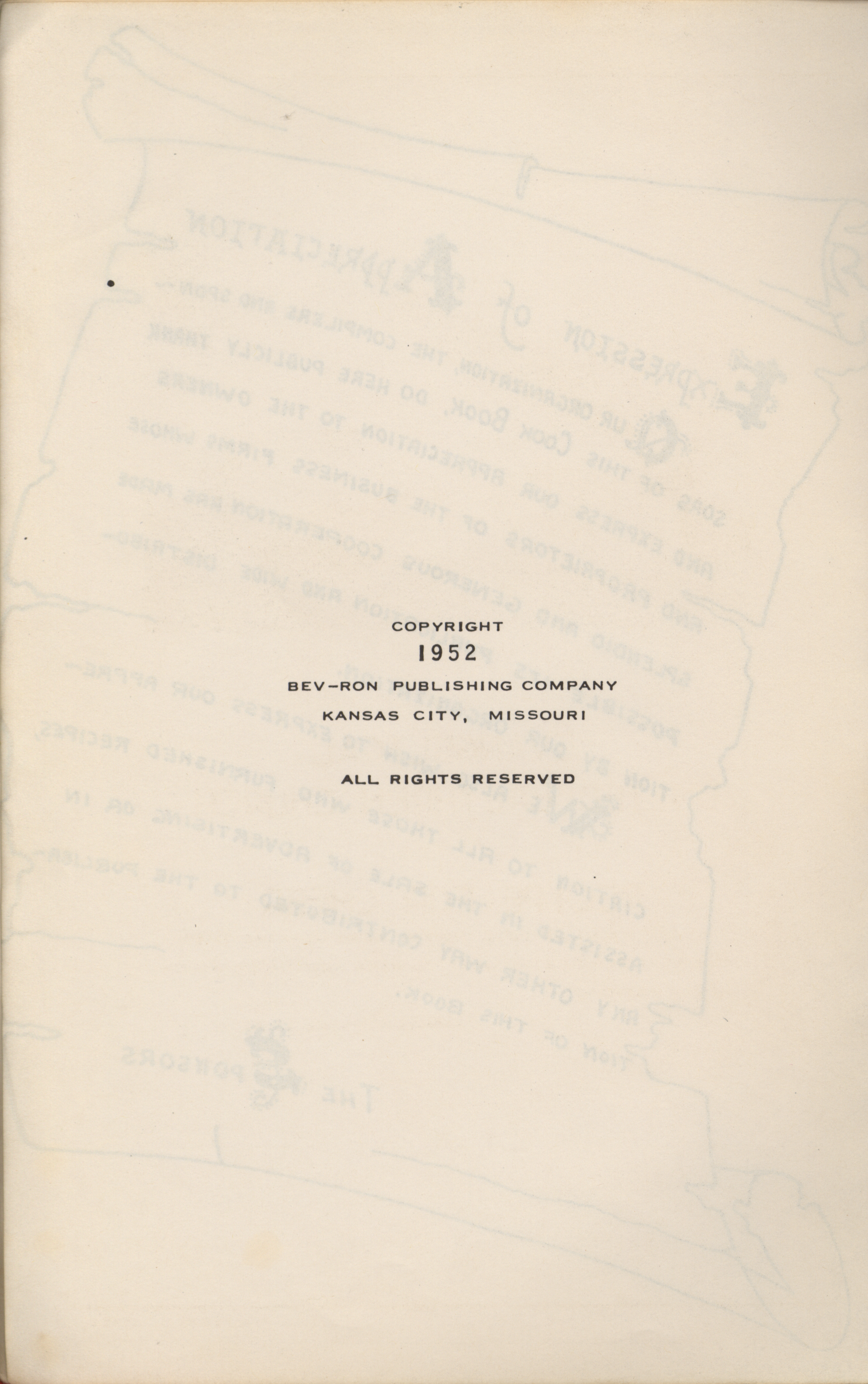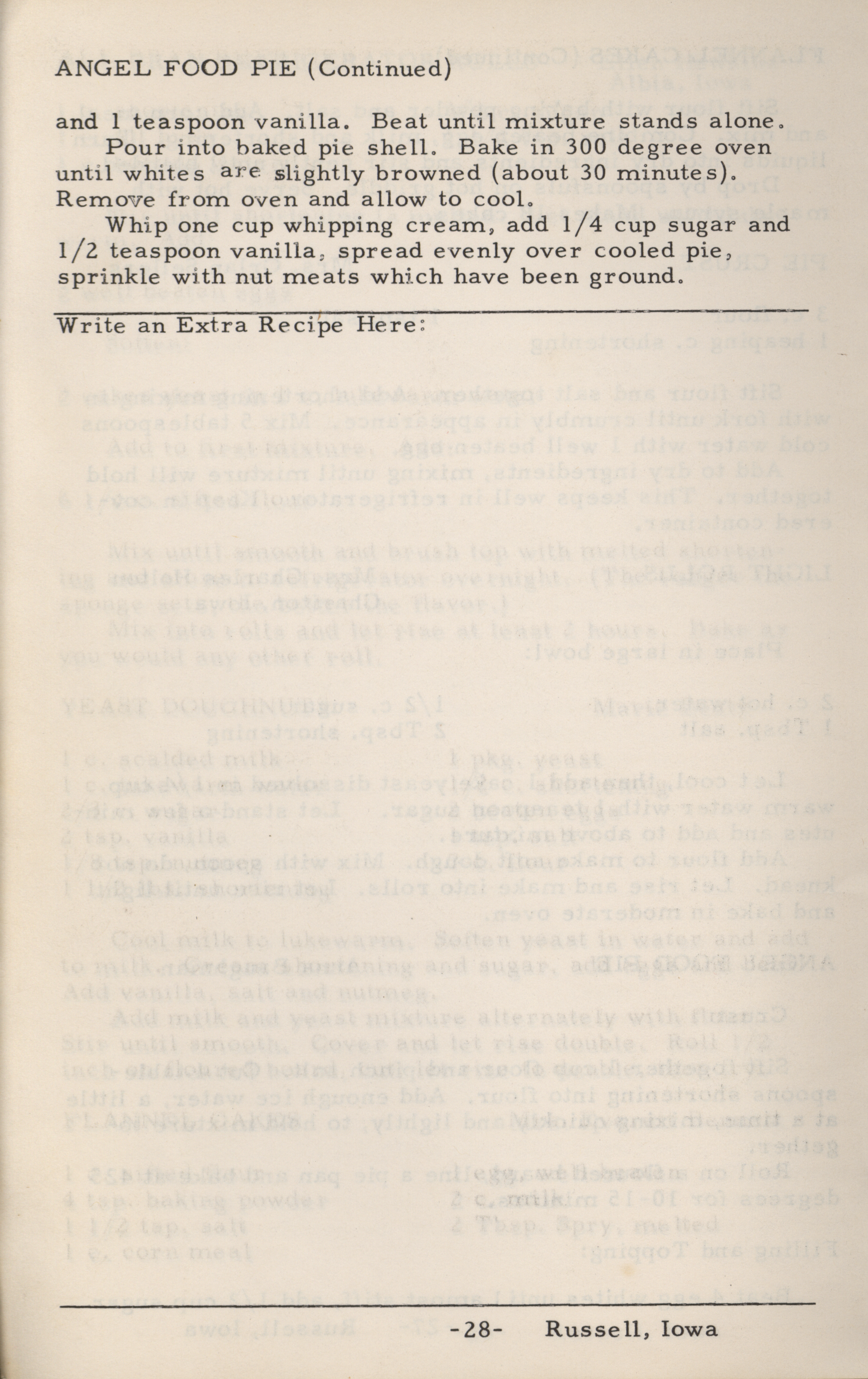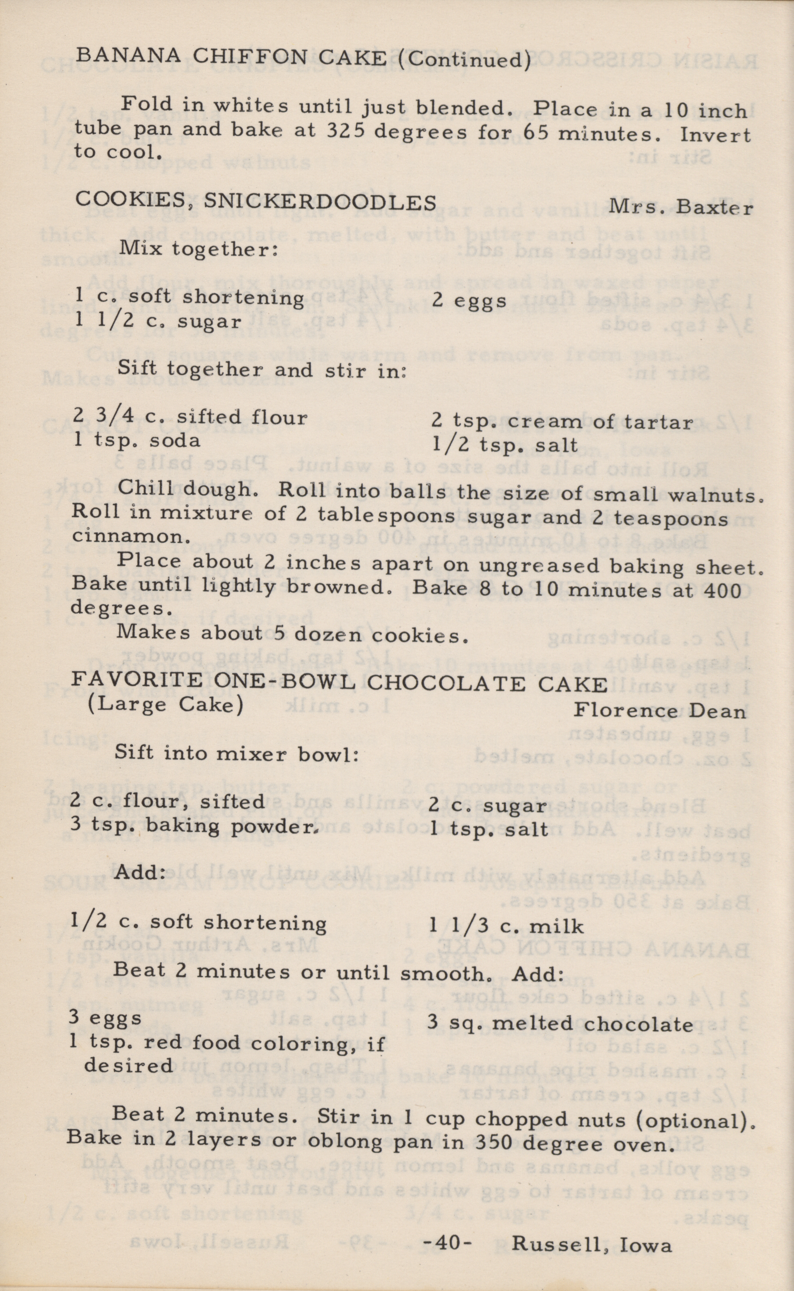 - A community cookbook compiled in 1952 by the Bethel Aid Society of the Evangelical United Brethren Church in Russell, Iowa. This volume features a diverse array of recipes contributed by church members, highlighting local culinary traditions, particularly those involving preserved foods and wild game recipes. It also features advertisements from local businesses, reflecting mid-century rural life in southern Iowa.