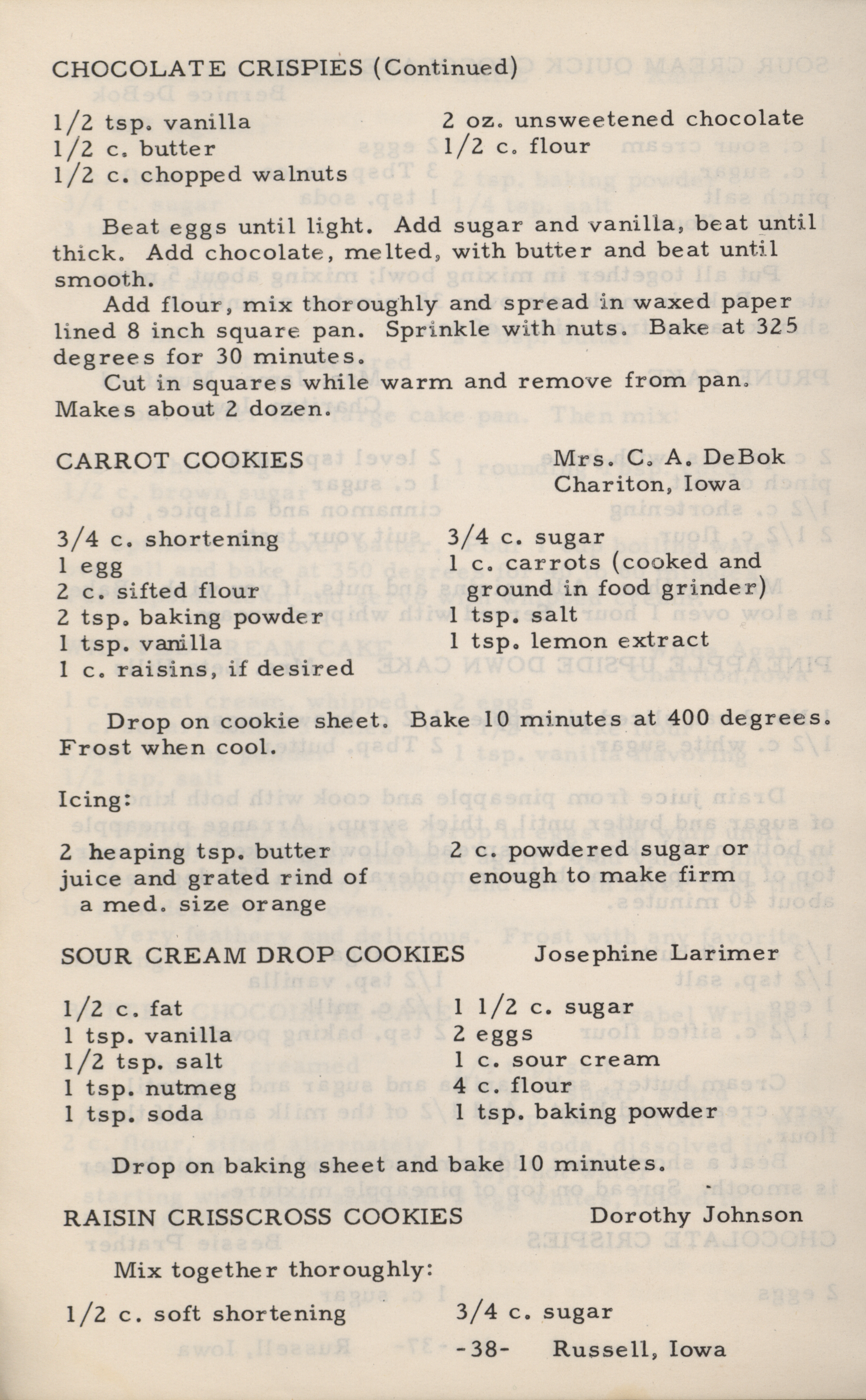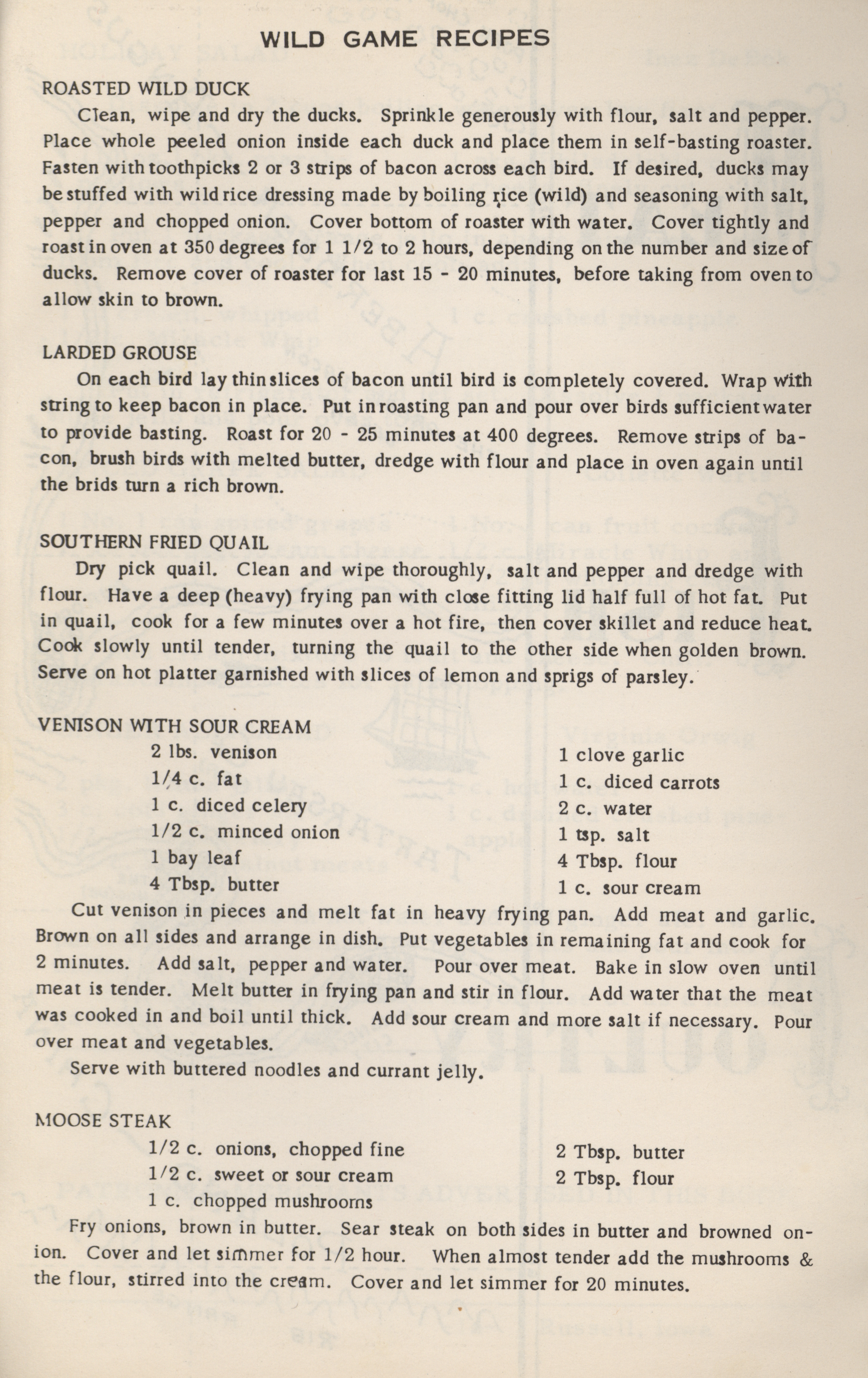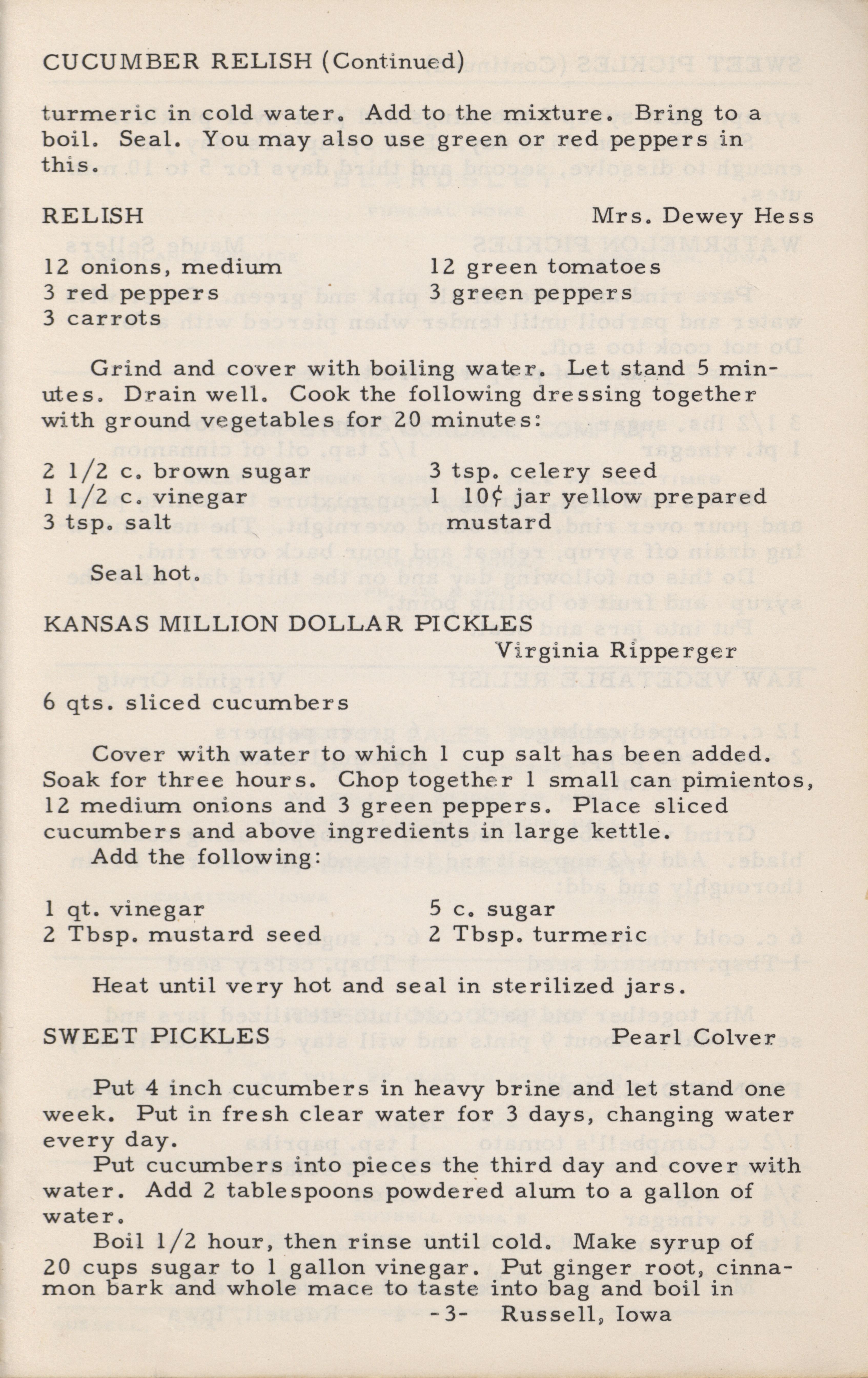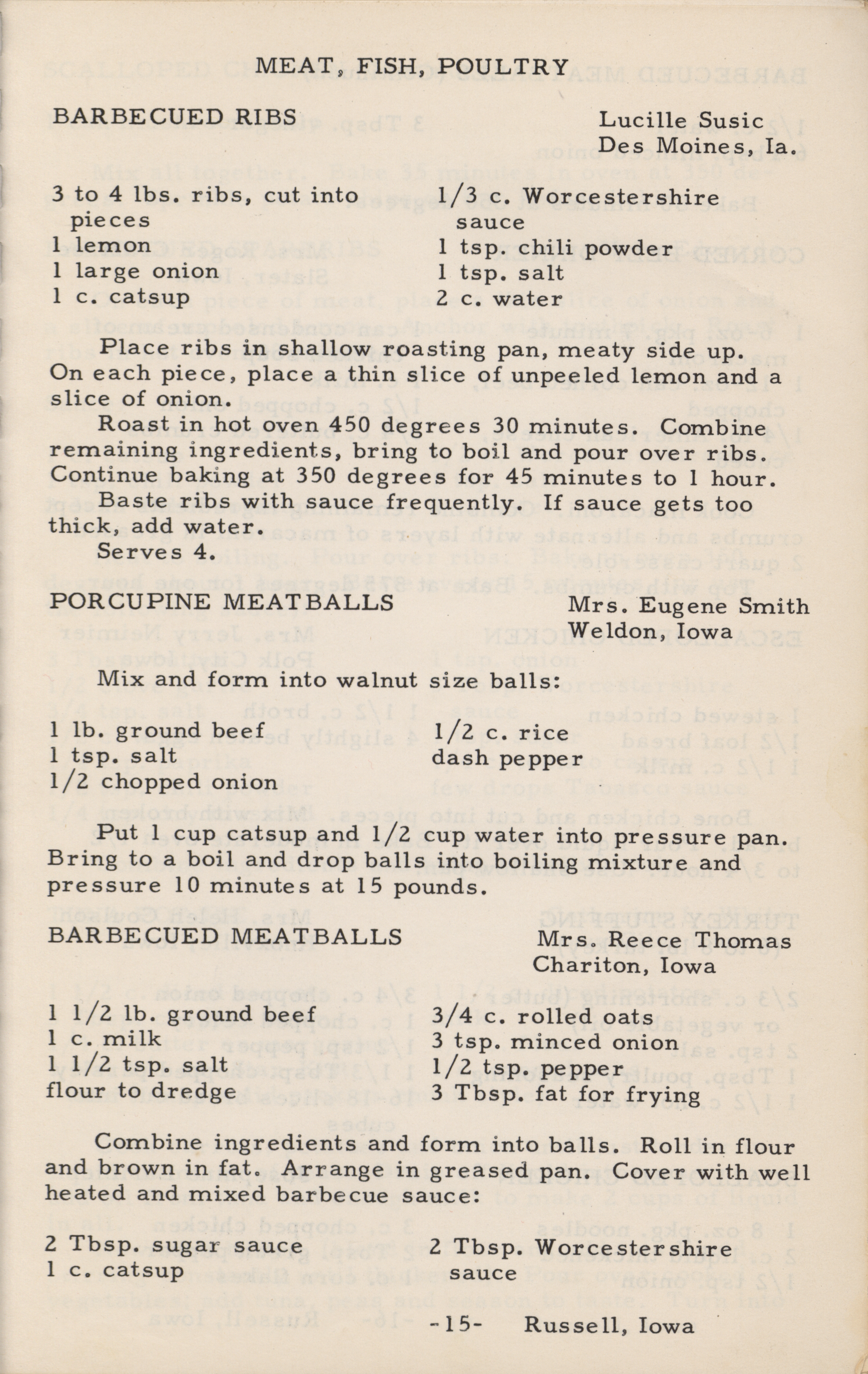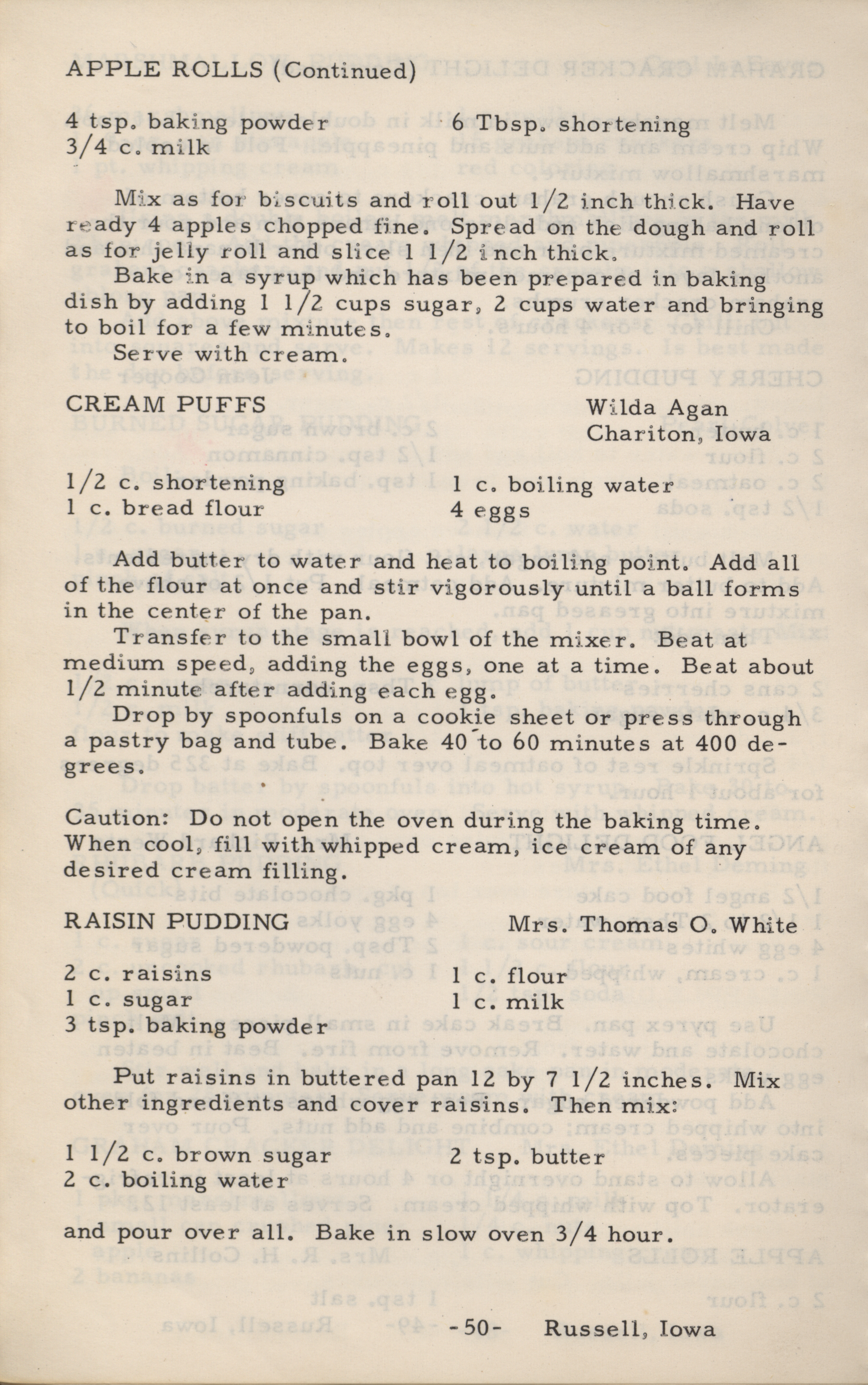 - A community cookbook compiled in 1952 by the Bethel Aid Society of the Evangelical United Brethren Church in Russell, Iowa. This volume features a diverse array of recipes contributed by church members, highlighting local culinary traditions, particularly those involving preserved foods and wild game recipes. It also features advertisements from local businesses, reflecting mid-century rural life in southern Iowa.