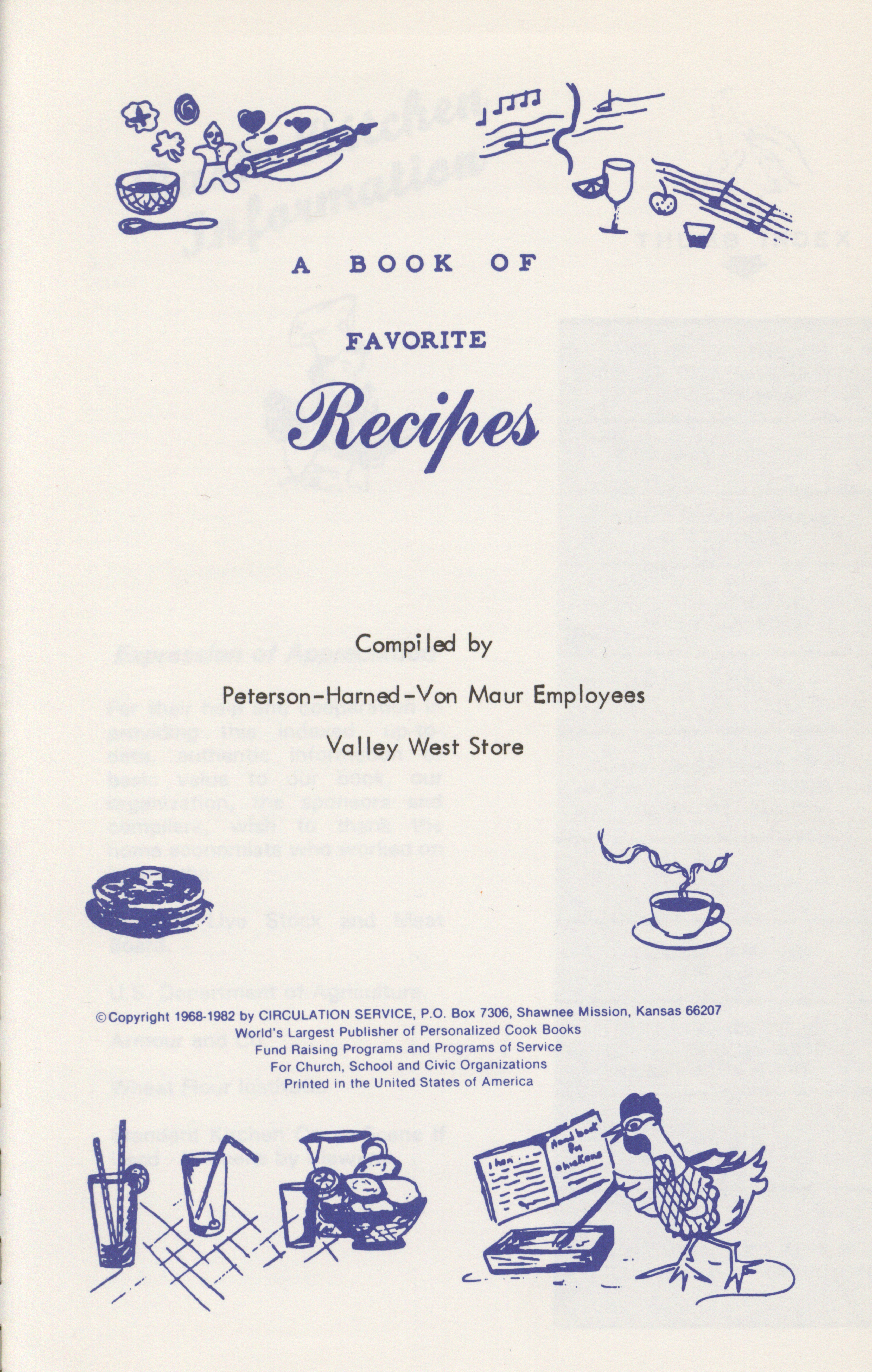 - A community cookbook compiled by employees of the Peterson [Petersen]-Harned-Von Maur department store at the Valley West location, featuring family recipes, cooking tips, food preparation charts, and entertaining guides.