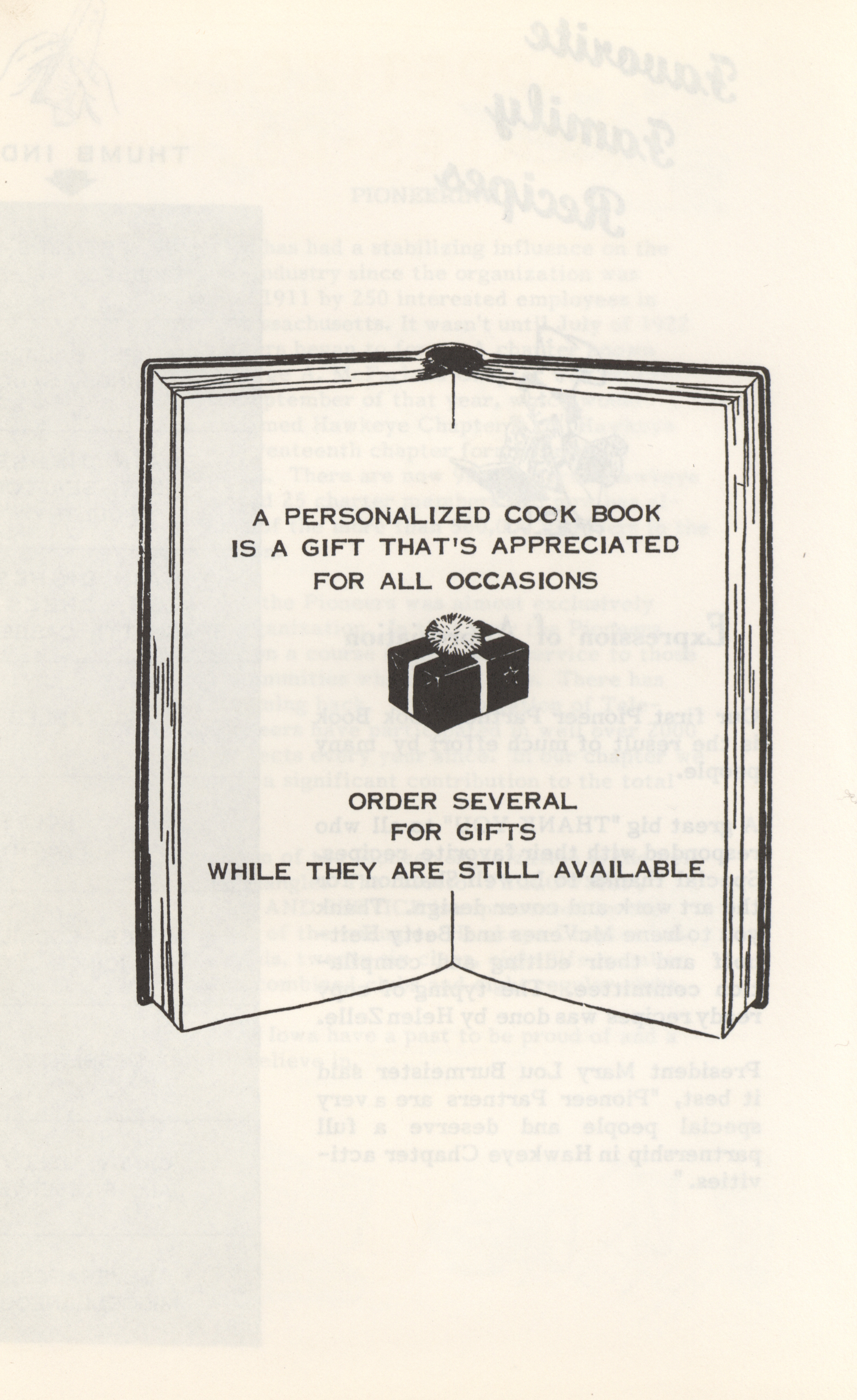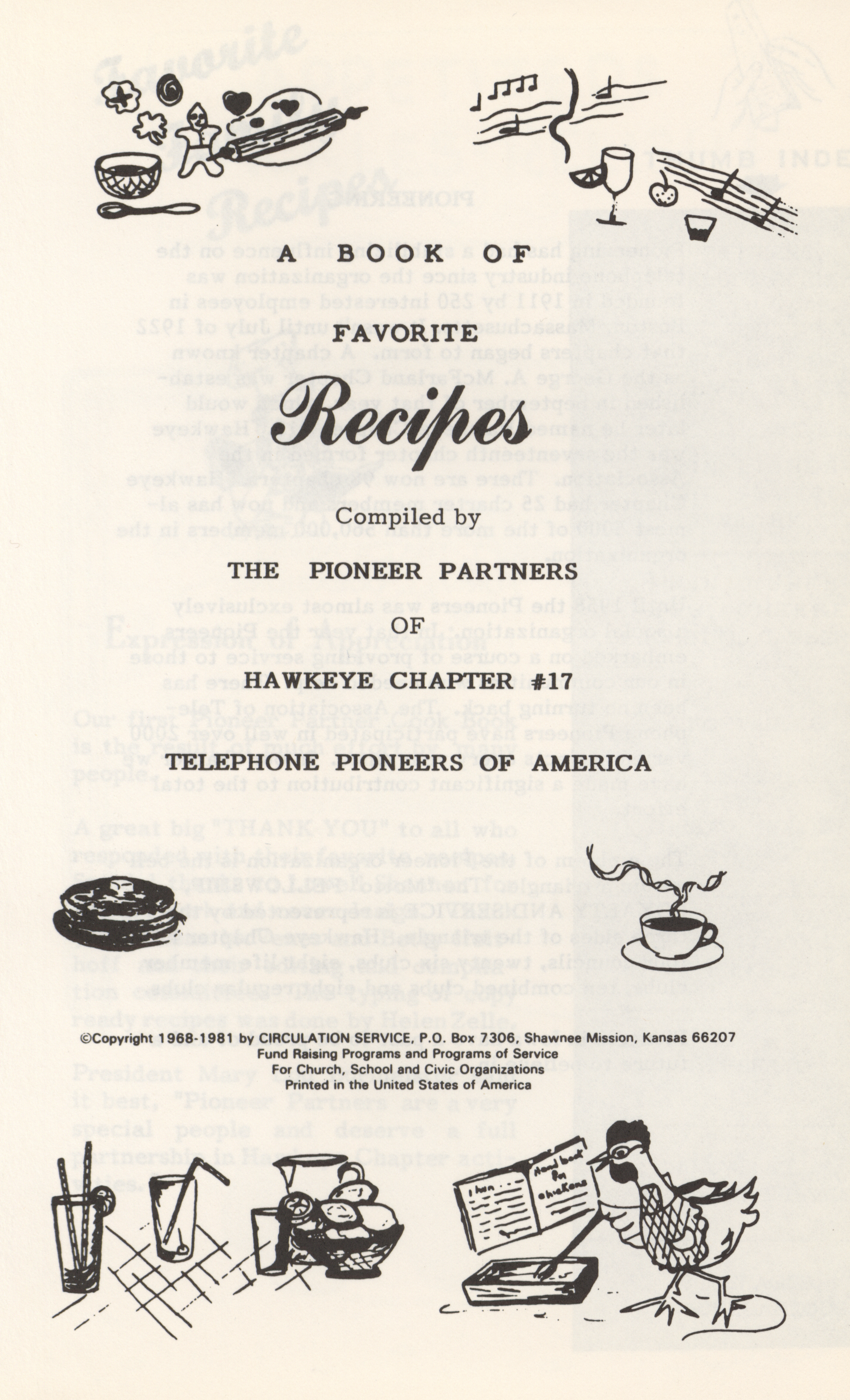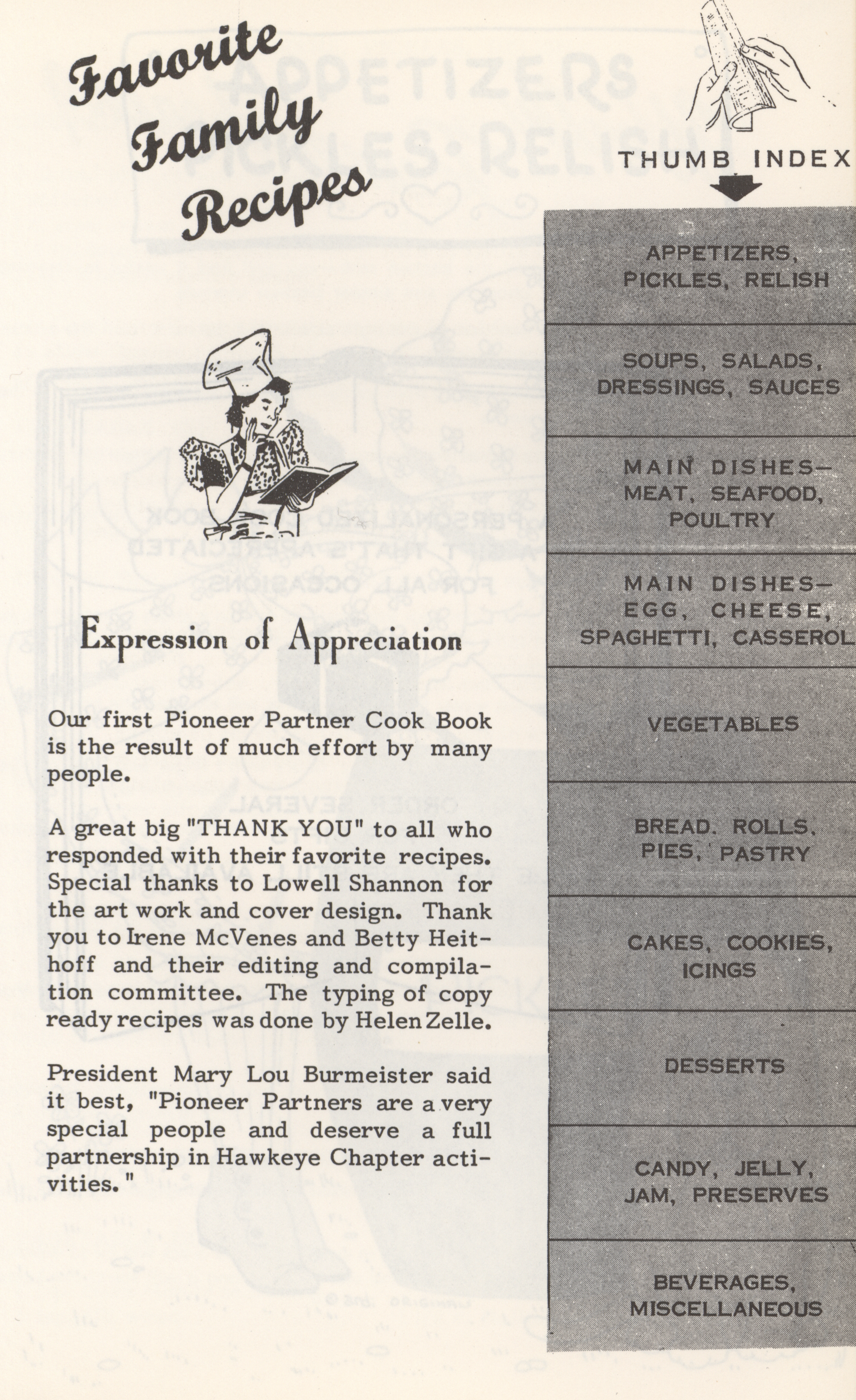 - A community cookbook compiled by the Pioneer Partners of the Hawkeye Chapter #17, Telephone Pioneers of America. It includes a variety of recipes submitted by members, categorized into appetizers, main dishes, vegetables, breads, desserts, and beverages. The book also reflects the chapter’s history and its involvement in community service.