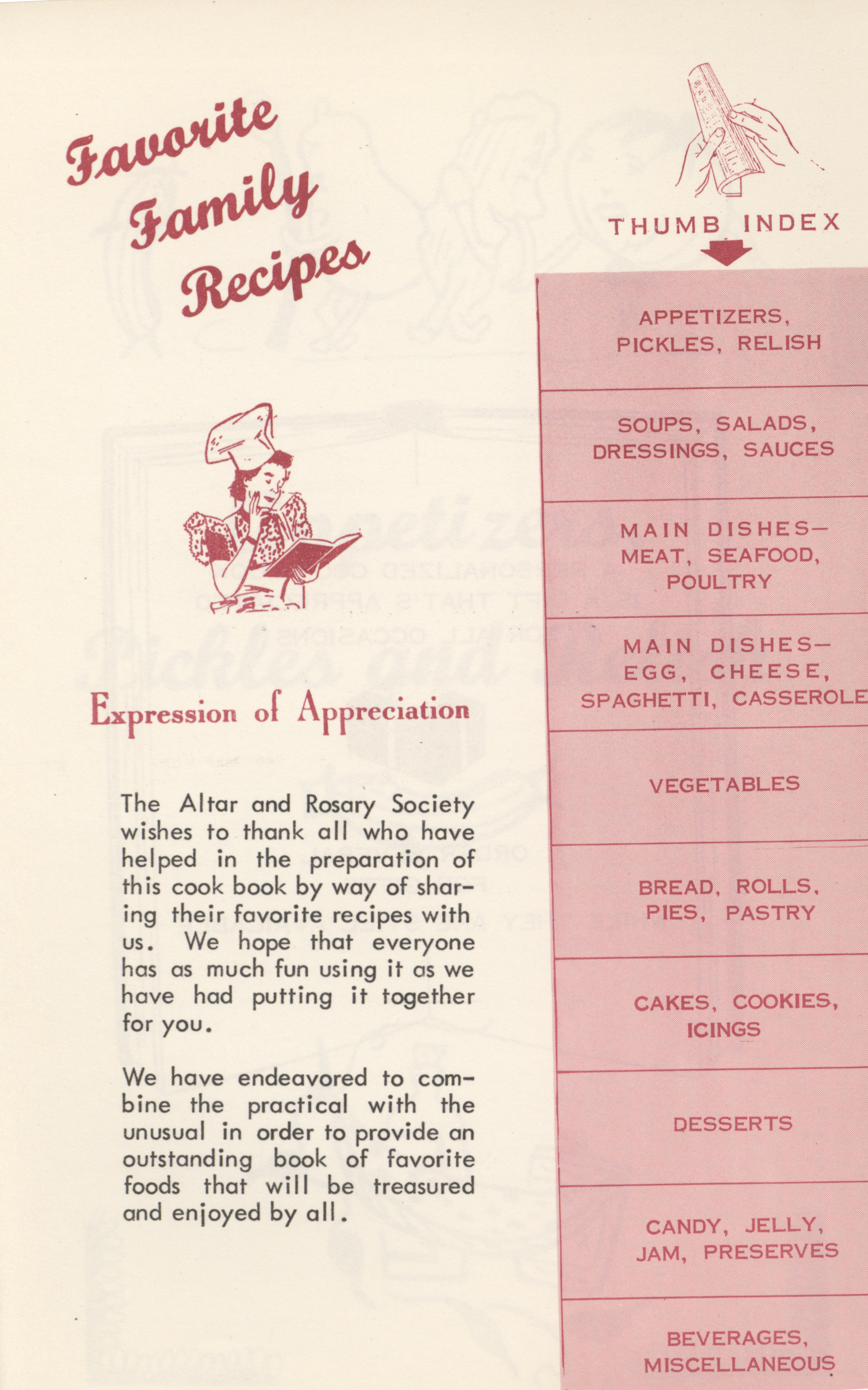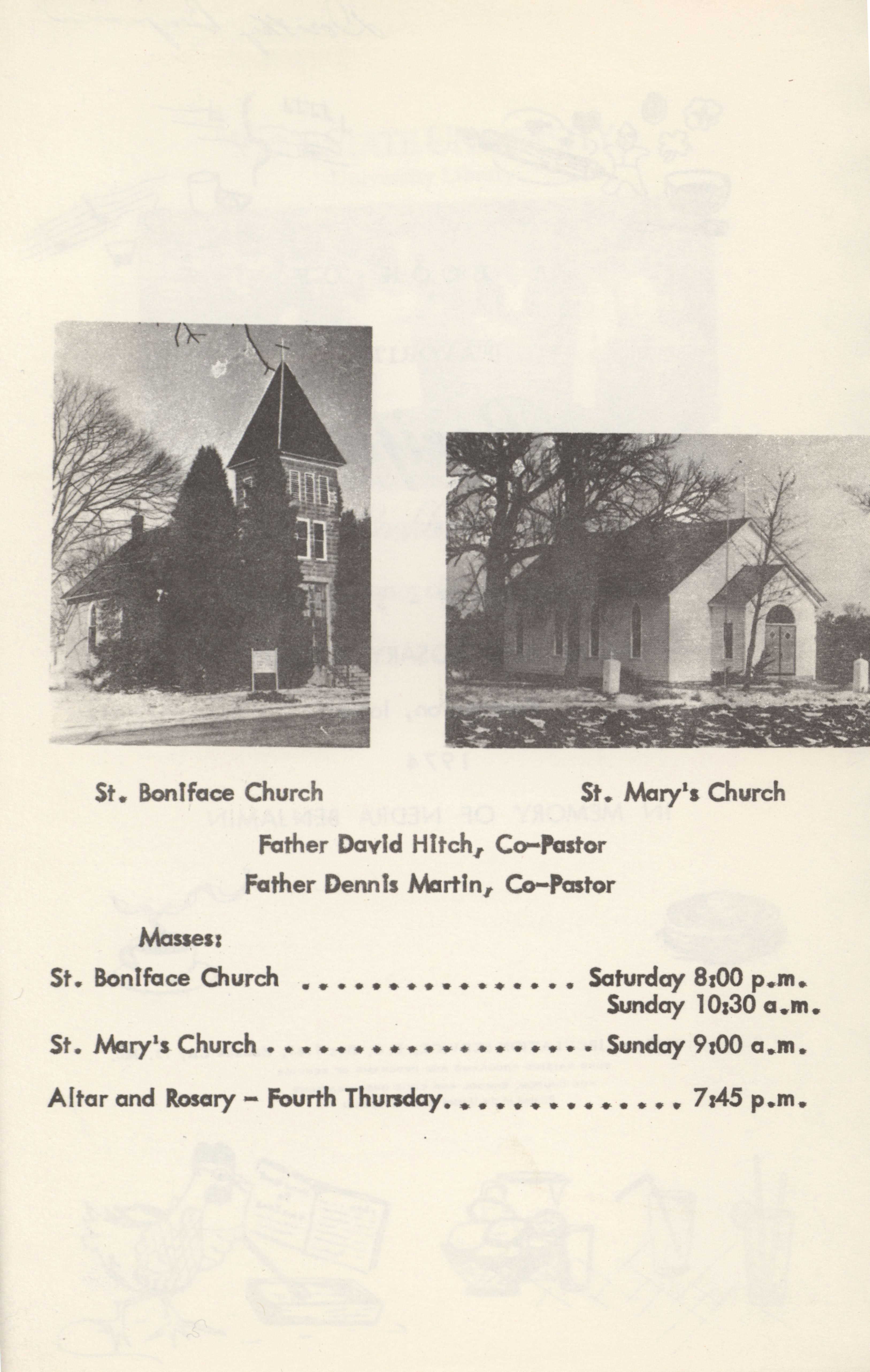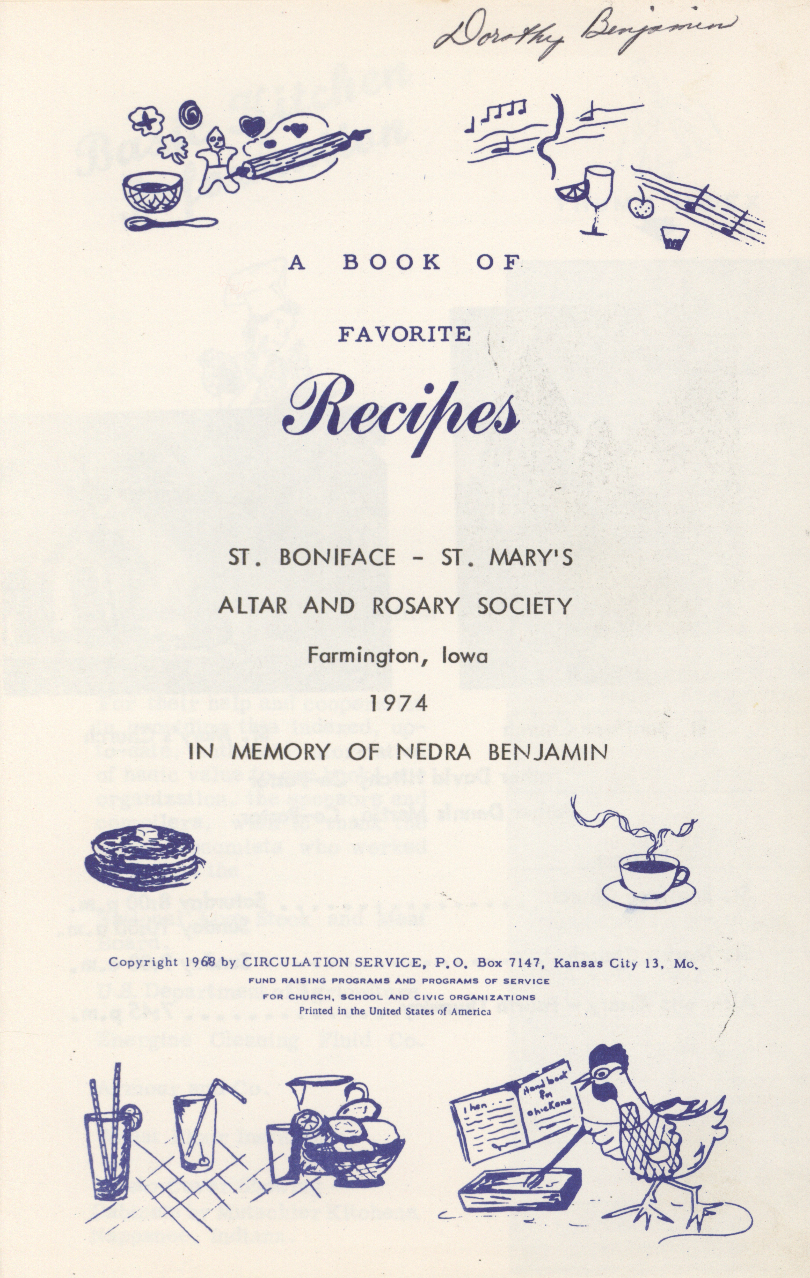 - Community cookbook created by the St. Boniface – St. Mary's Altar and Rosary Society in Farmington, Iowa. Includes recipes, cooking guides, household tips, and charts on food preparation. Published in memory of Nedra Benjamin.