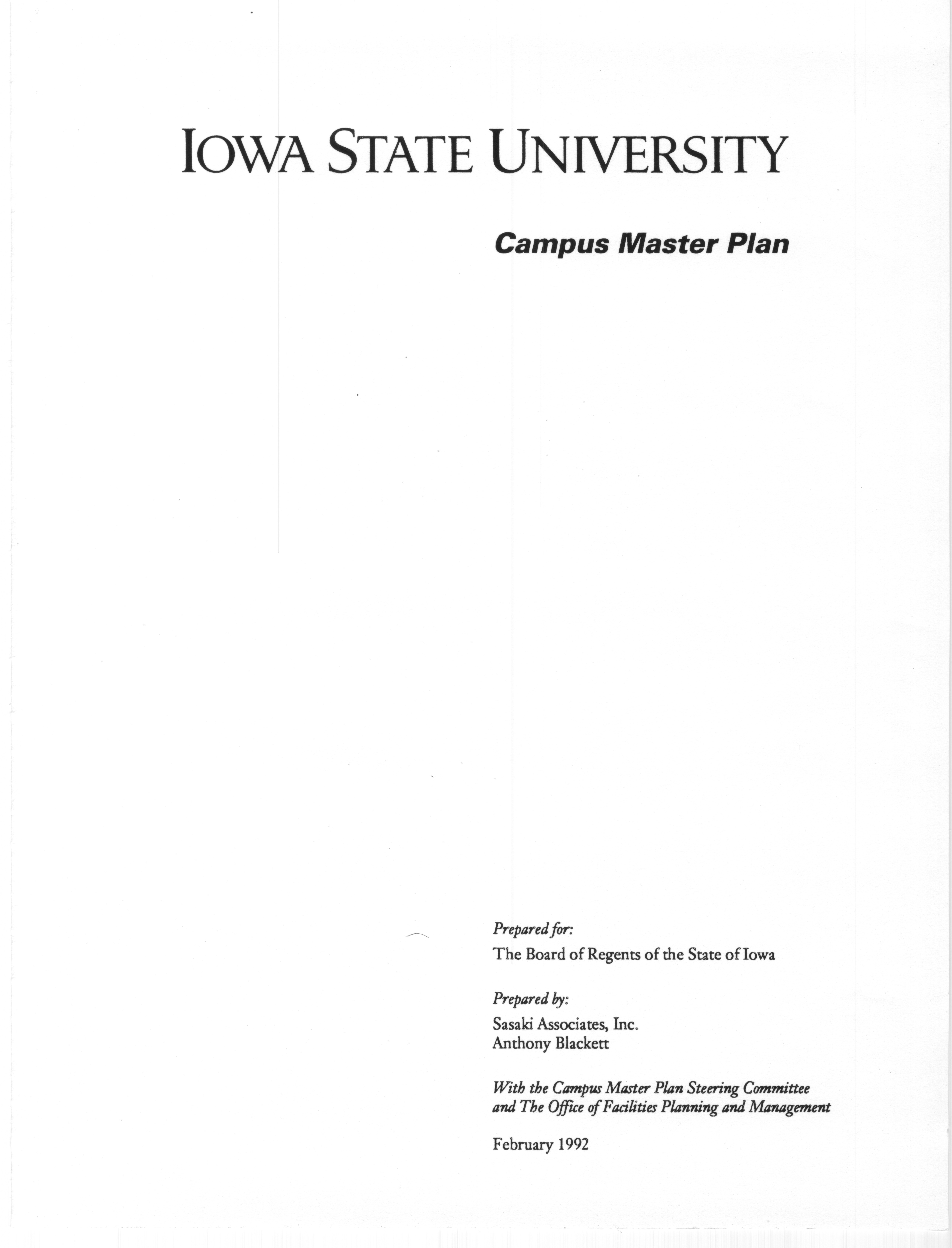 - Iowa State University campus master plan. Prepared for the Board of Regents of the State of Iowa by Sasaki Associates, Inc., and Anthony Blackett with the Campus Master Plan Steering Committee and the Office of Facilities Planning and Management. February 1992.