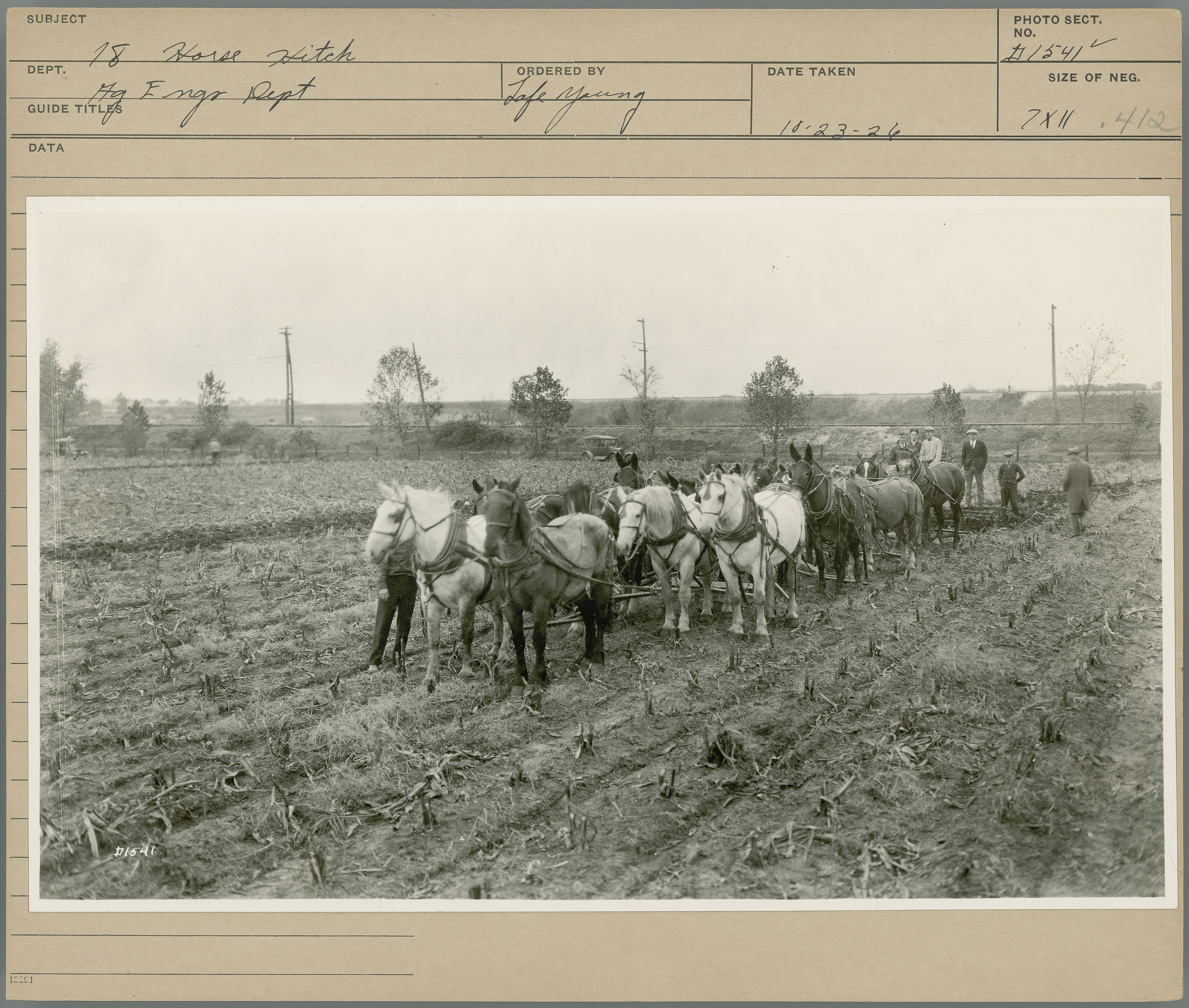 - 18 Horse Hitch. Agricultural Engineering Department. Ordered by Lafe Young. 10-23-26.