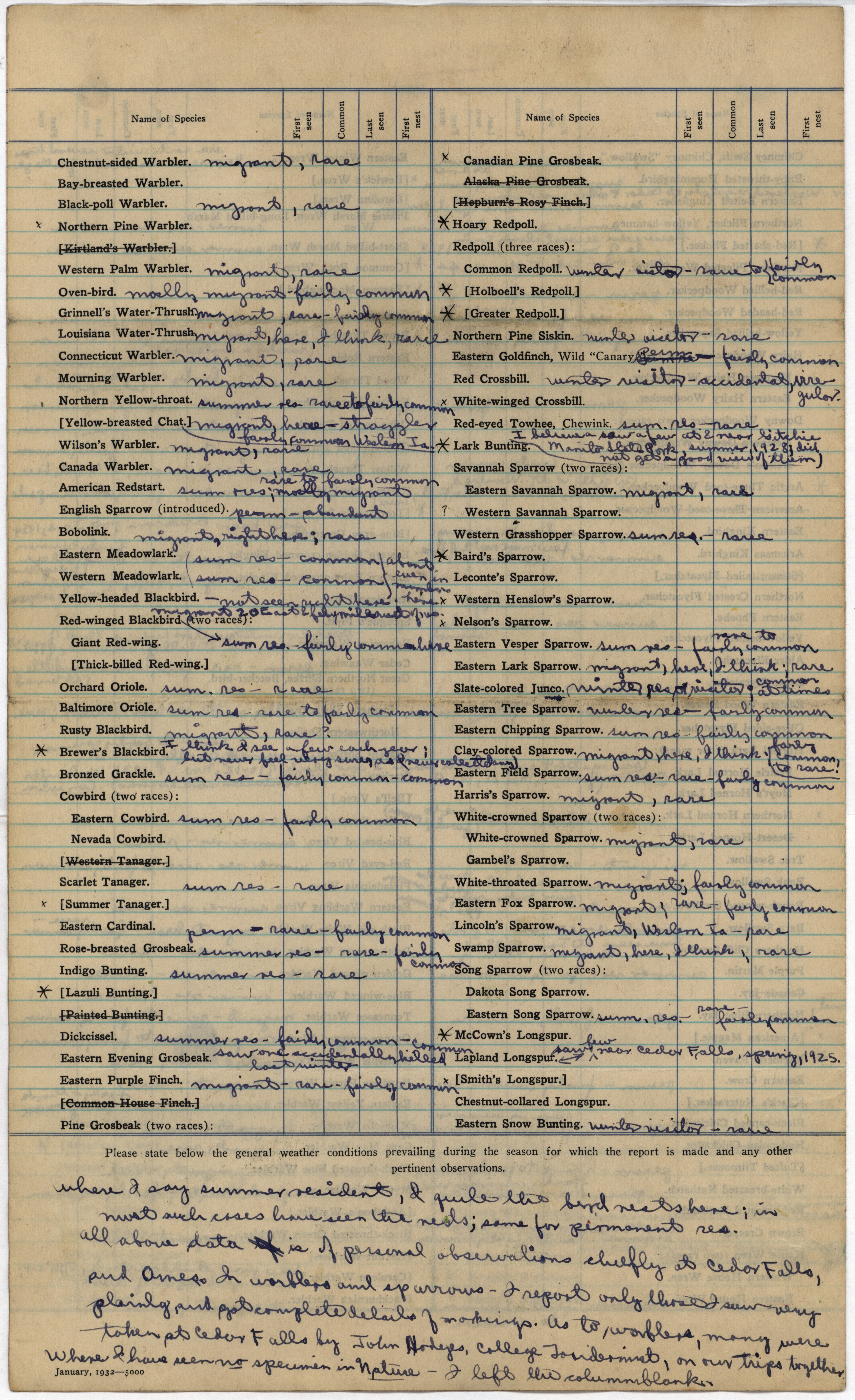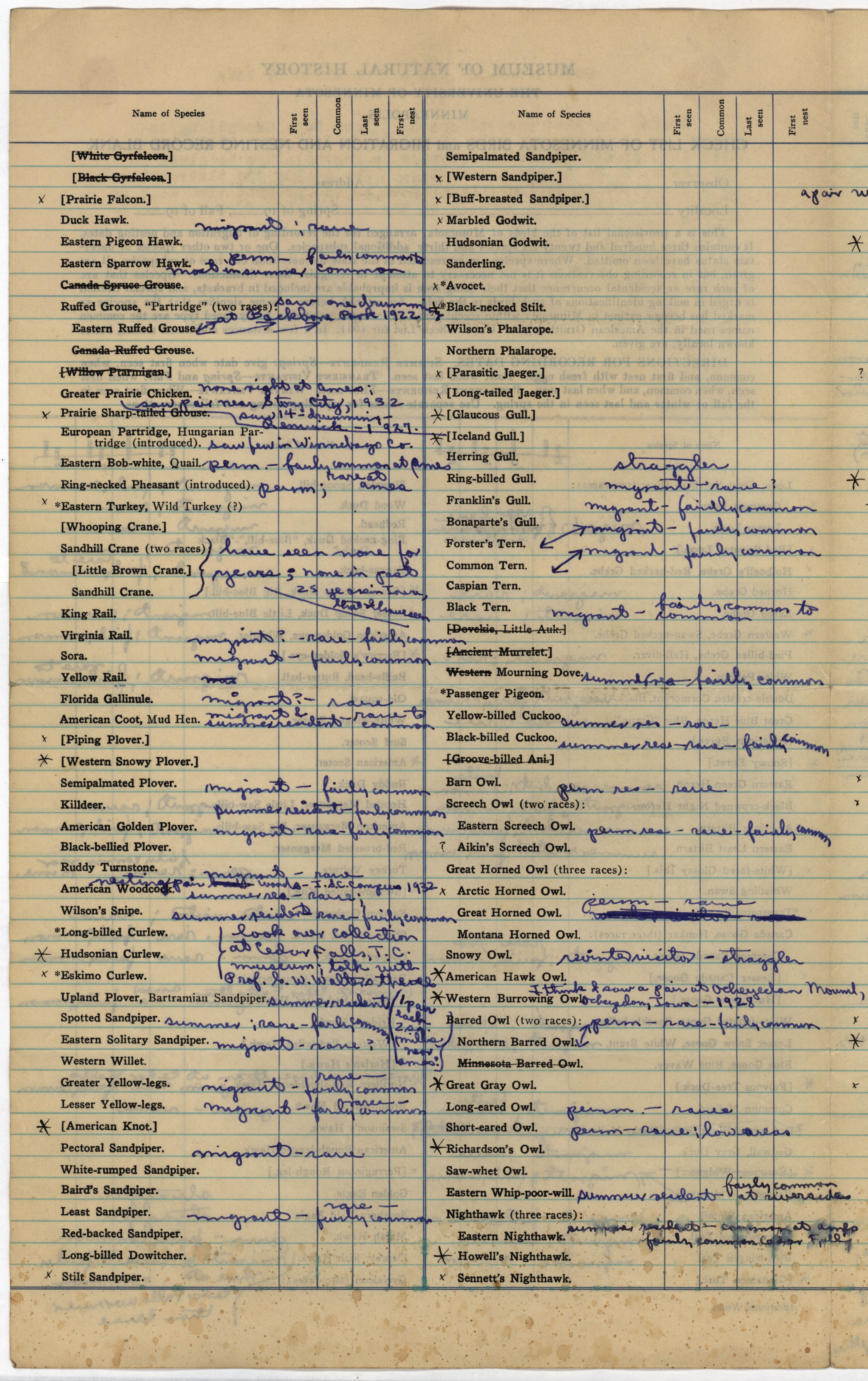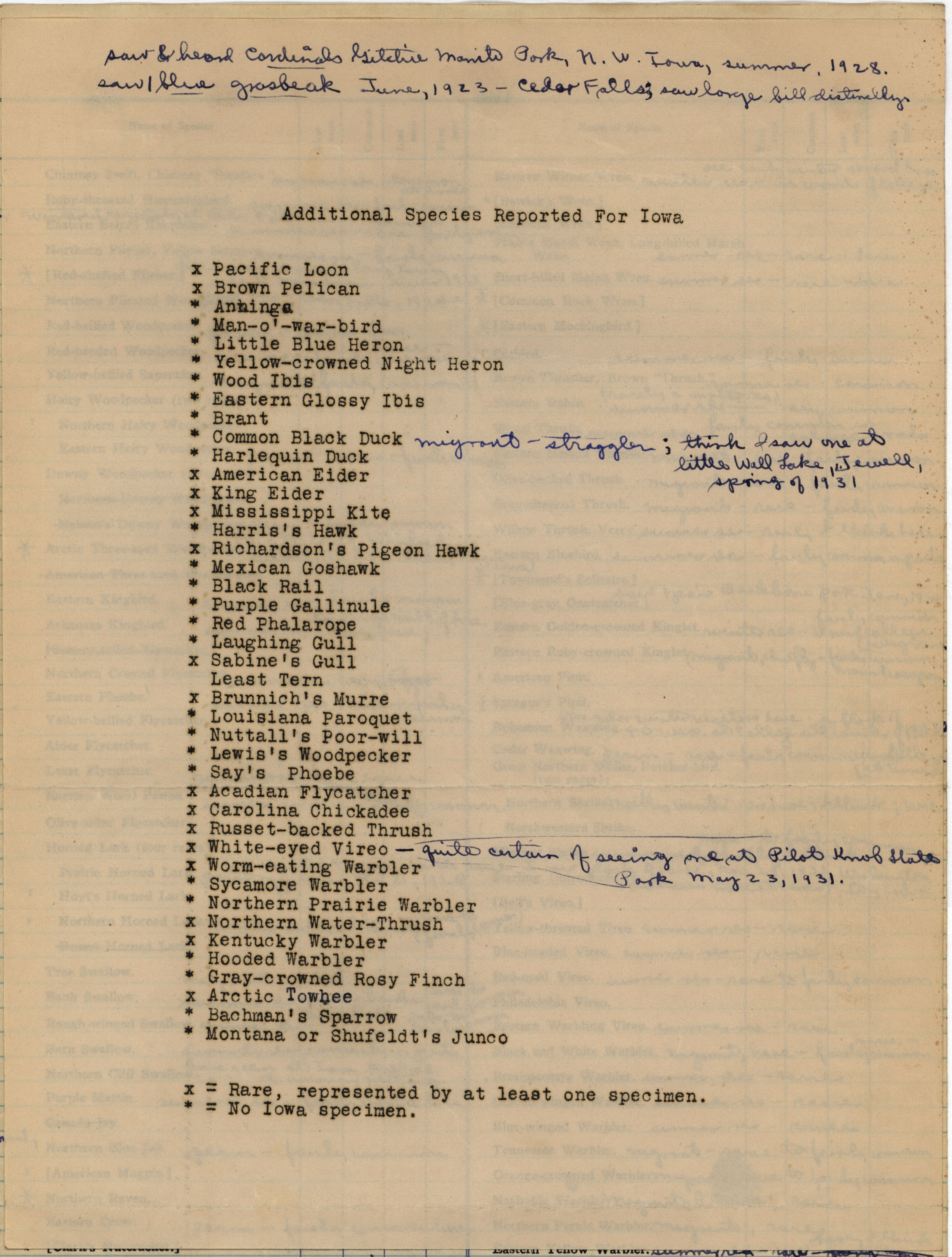 - Annotated checklist of birds. George Hendrickson responds to Philip DuMont's questionnaire requesting specimens and sight records needed for his revised list of the birds of Iowa. Hendrickson reports on whether the species is present, if it breeds in state, how common or rare the bird is, and if there is a specimen available.