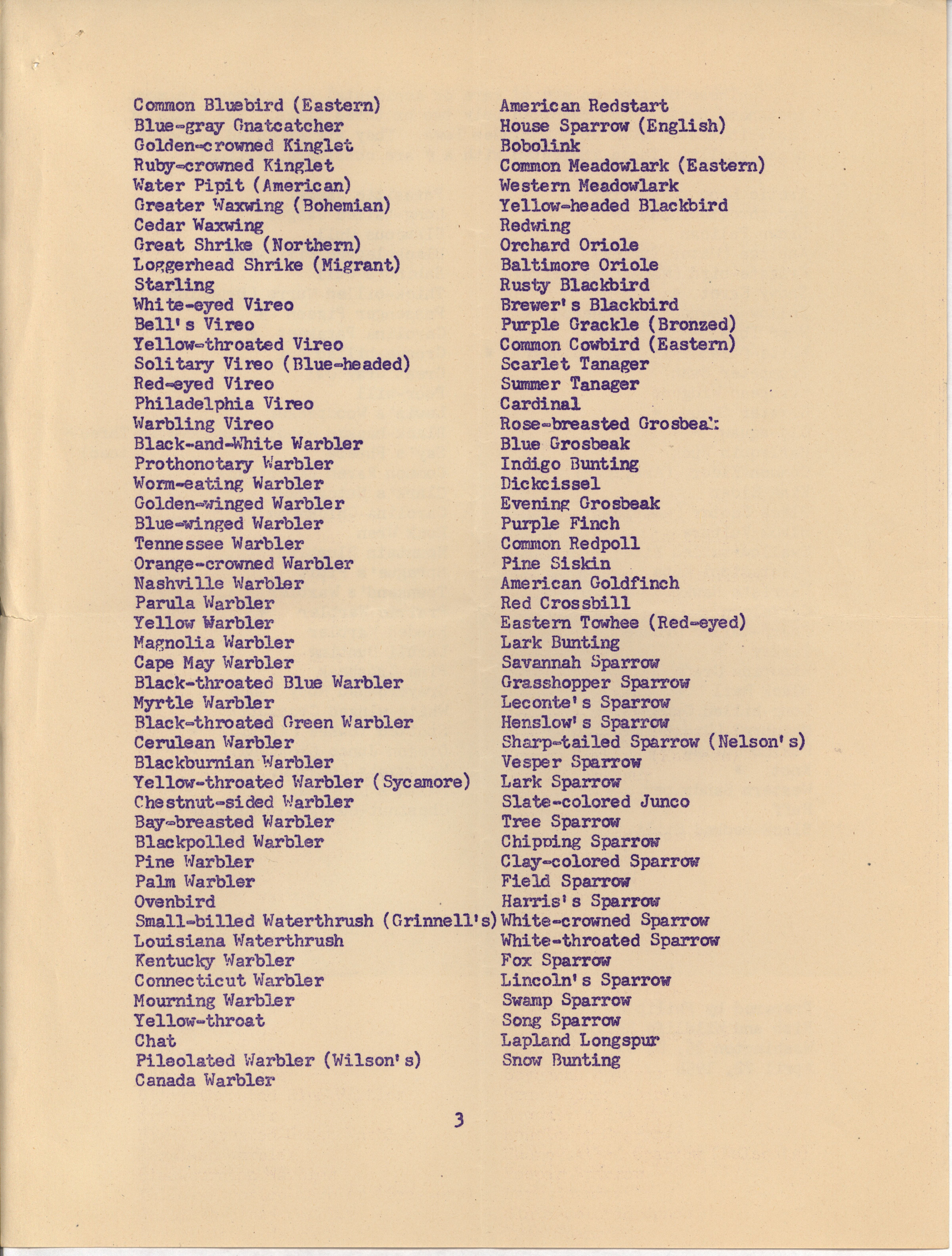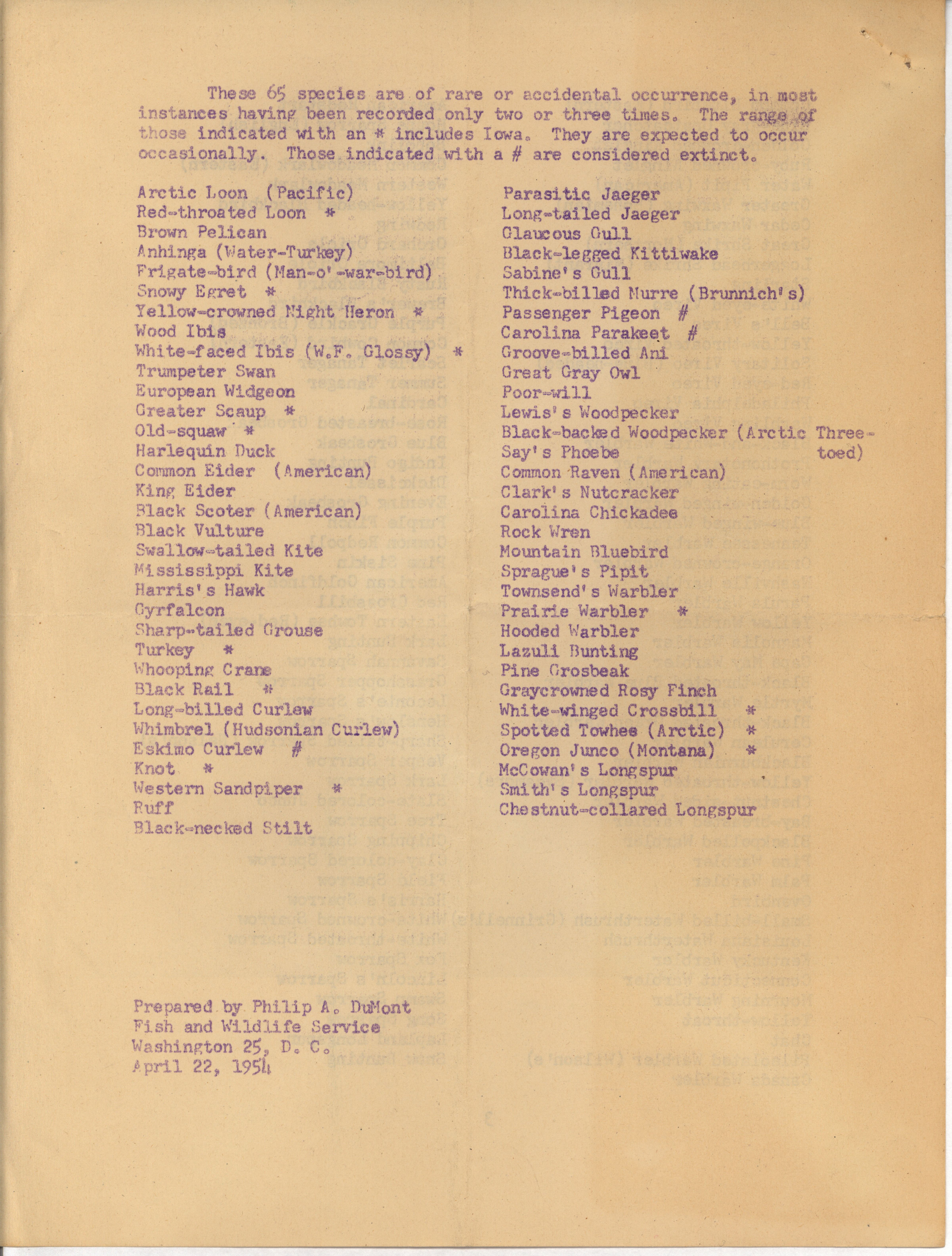 - Checklist dated April 22, 1954. A list prepared by Philip DuMont of the 275 species commonly found in Iowa, with an additional 65 species that are rare or accidental in the state.