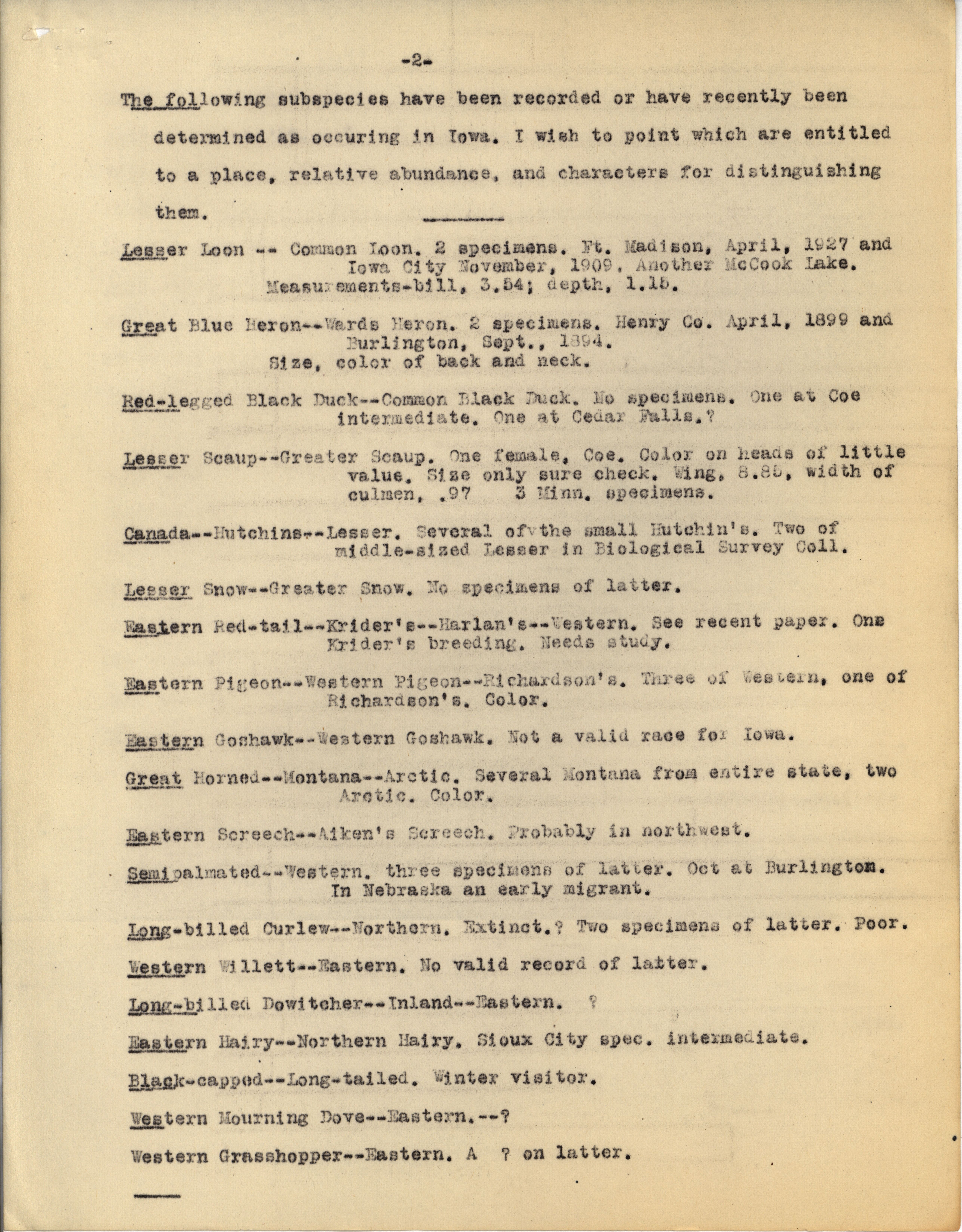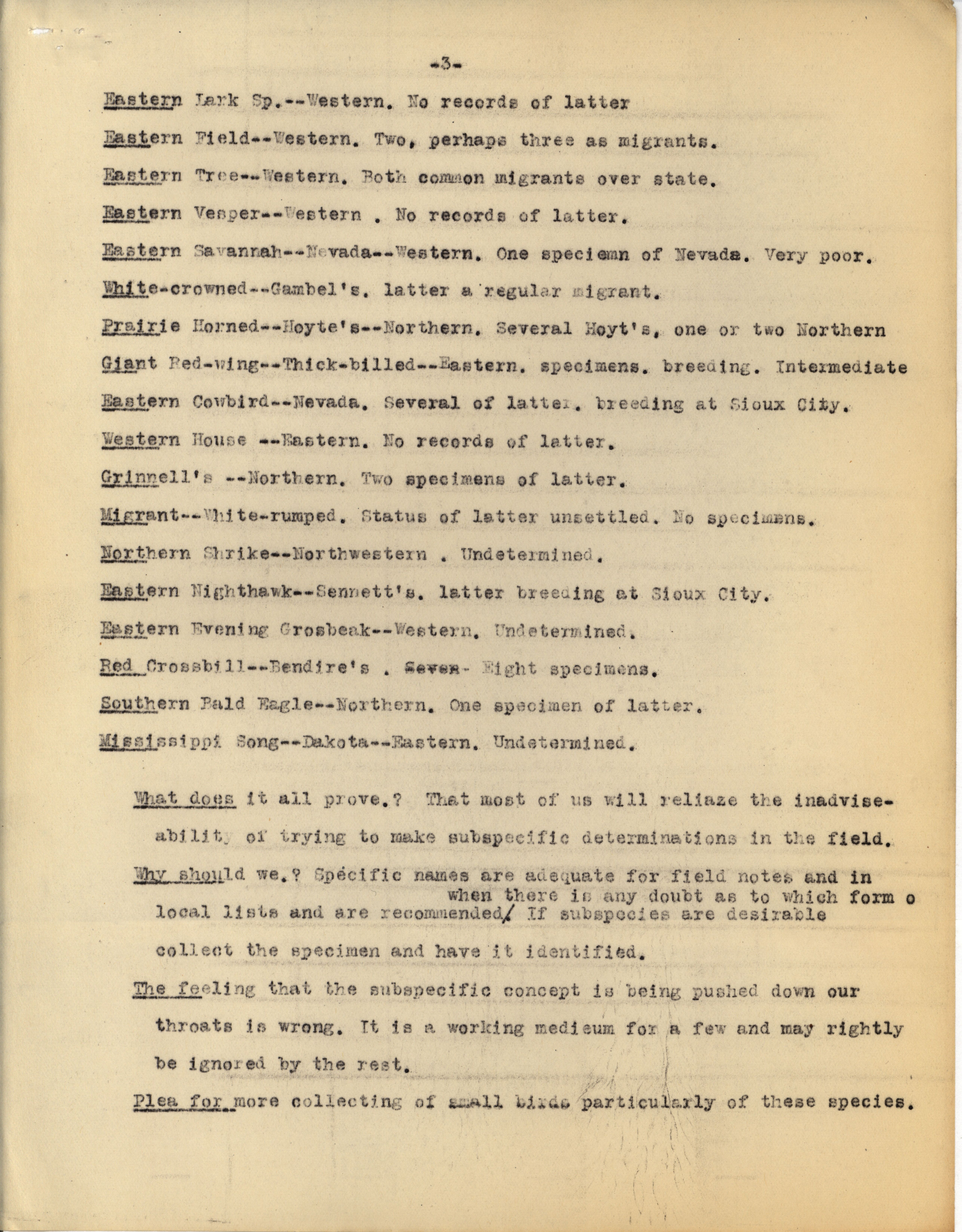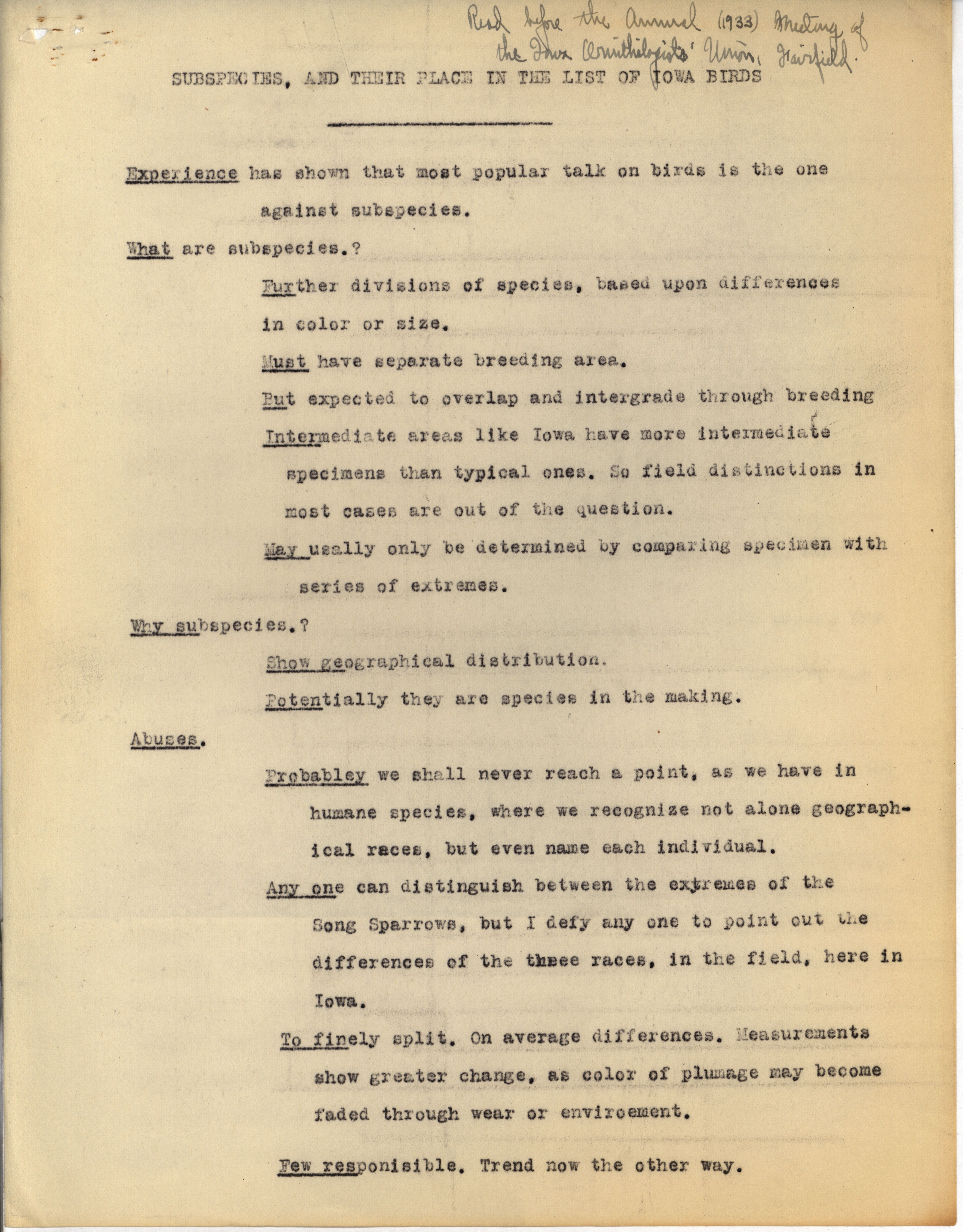 - Lecture notes delivered May 5, 1933. Notes for a presentation given by Philip DuMont during the 1933 annual meeting of the Iowa Ornithologists' Union discusses that while some ornithologists may be interested in subspecies, field notes should only record the species since determining a subspecies in the field is not reliable and should be only undertaken by the close study of collected specimens.