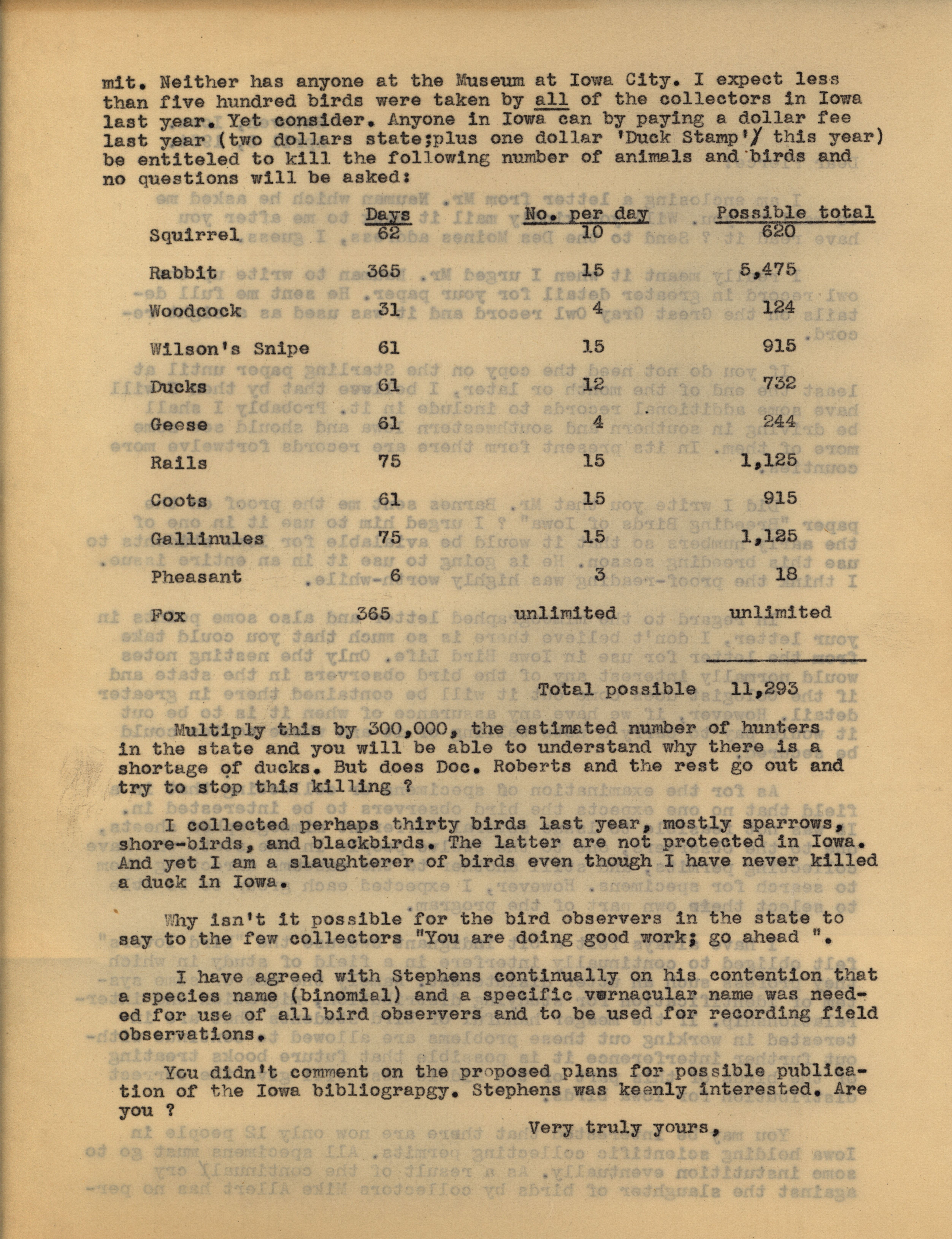- Letter from Philip DuMont to Fred Pierce dated April 5, 1934. DuMont discusses possible articles for Iowa Bird Life and complains about the lack of support for specimen collectors.