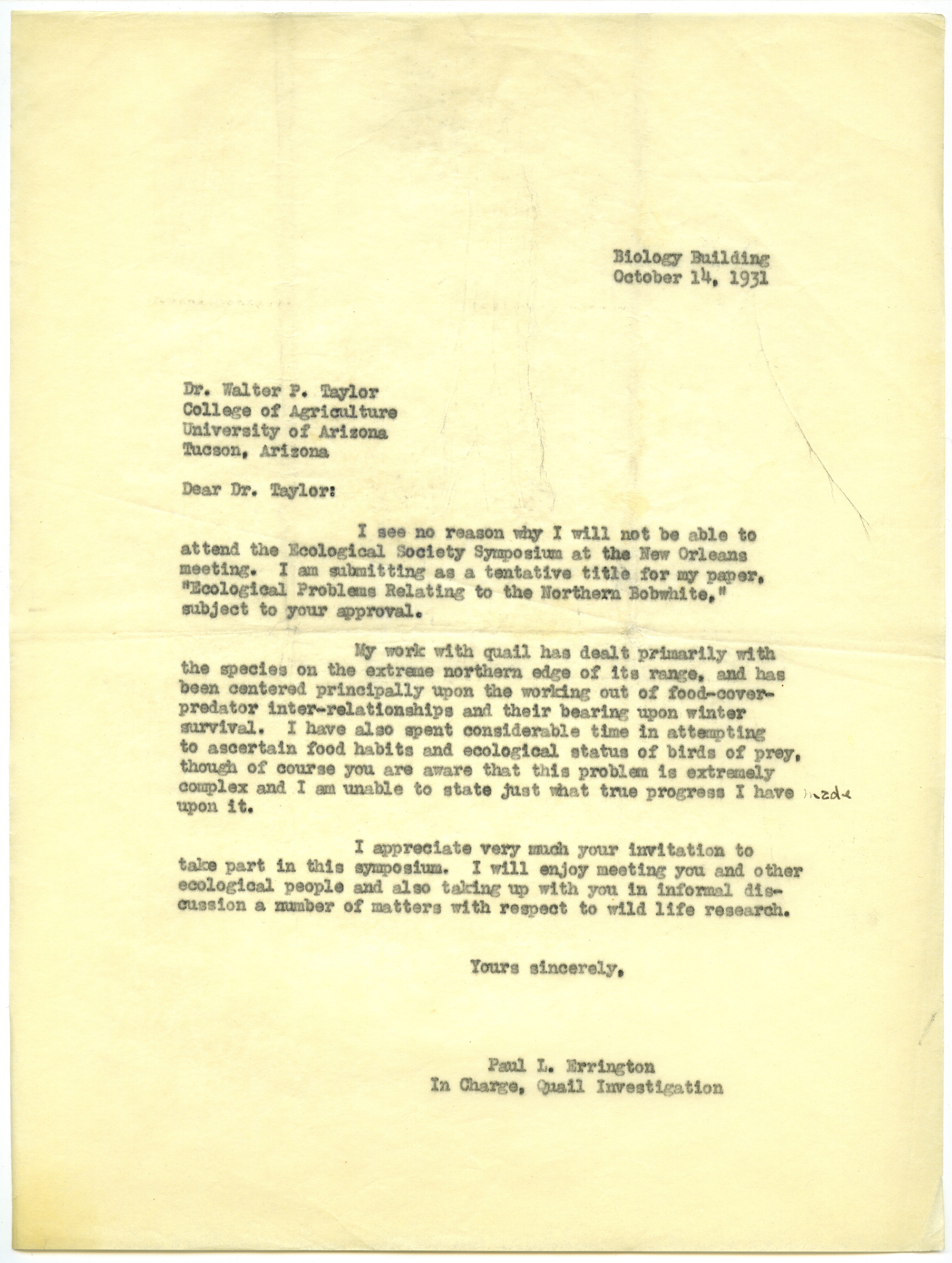 - "Paul L. Errington letter, October 14, 1931", Paul L. Errington Collection, Iowa State University Library Digital Collections
