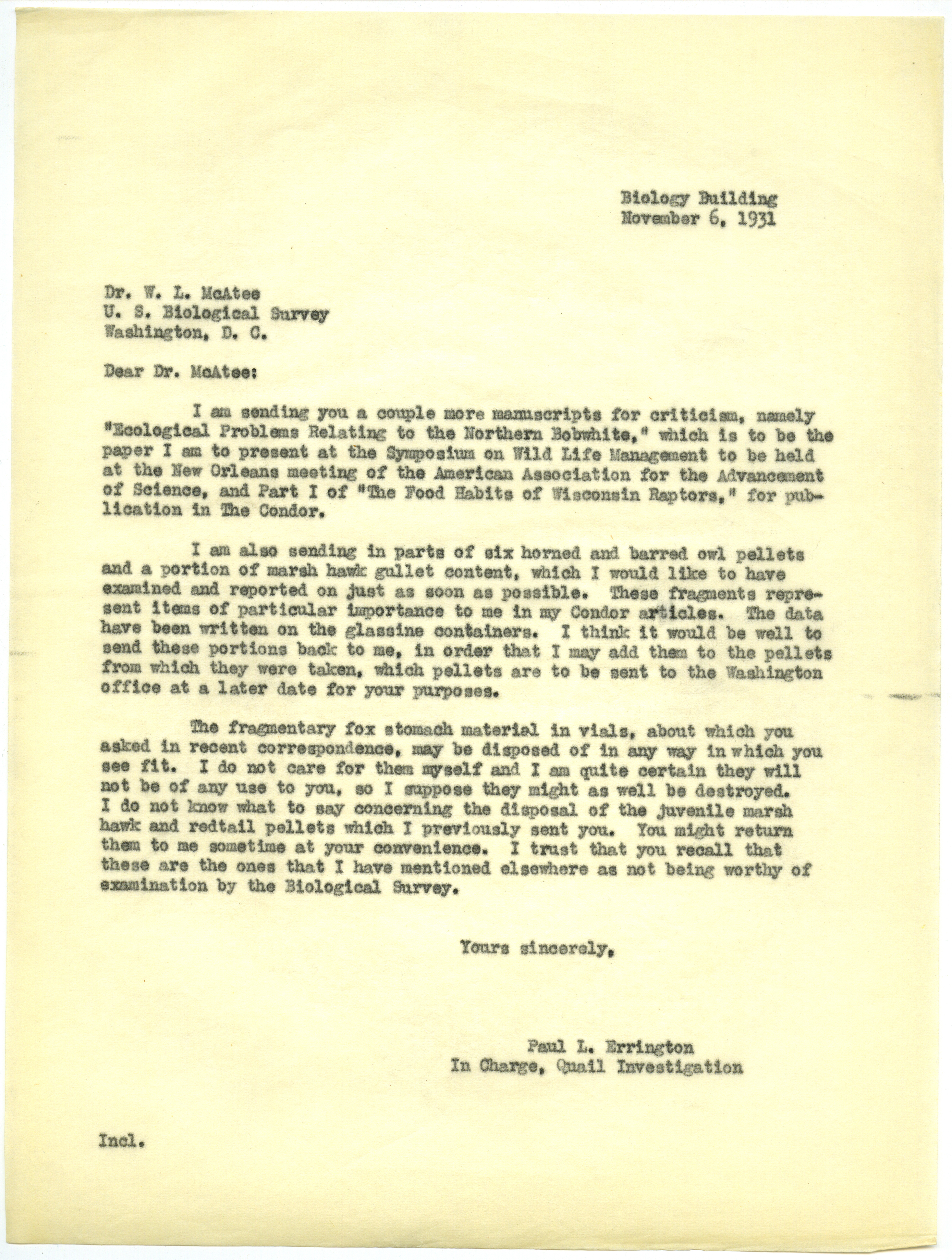 - "Paul L. Errington letter, November 6, 1931", Paul L. Errington Collection, Iowa State University Library Digital Collections