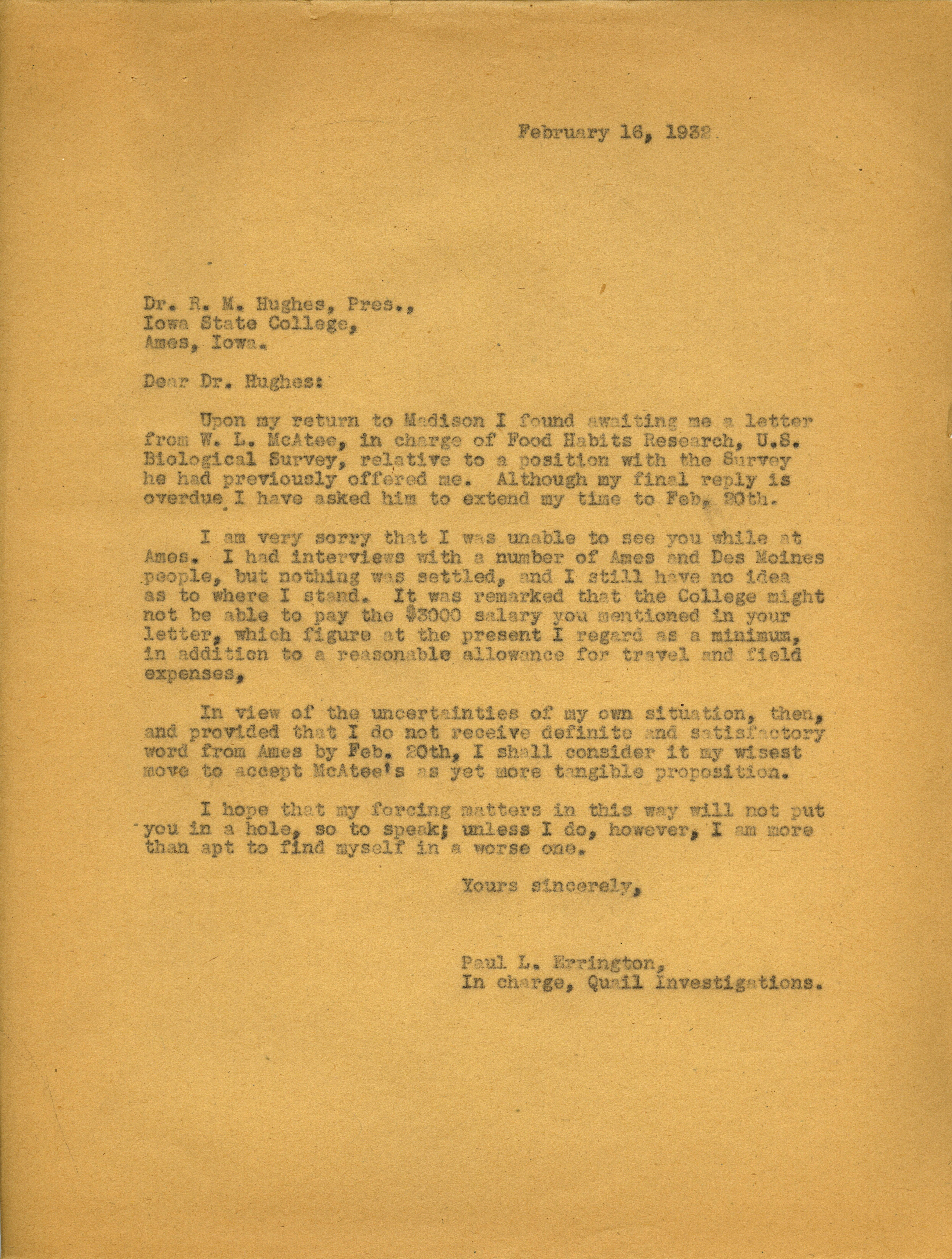 - Paul L. Errington letter, February 16, 1932