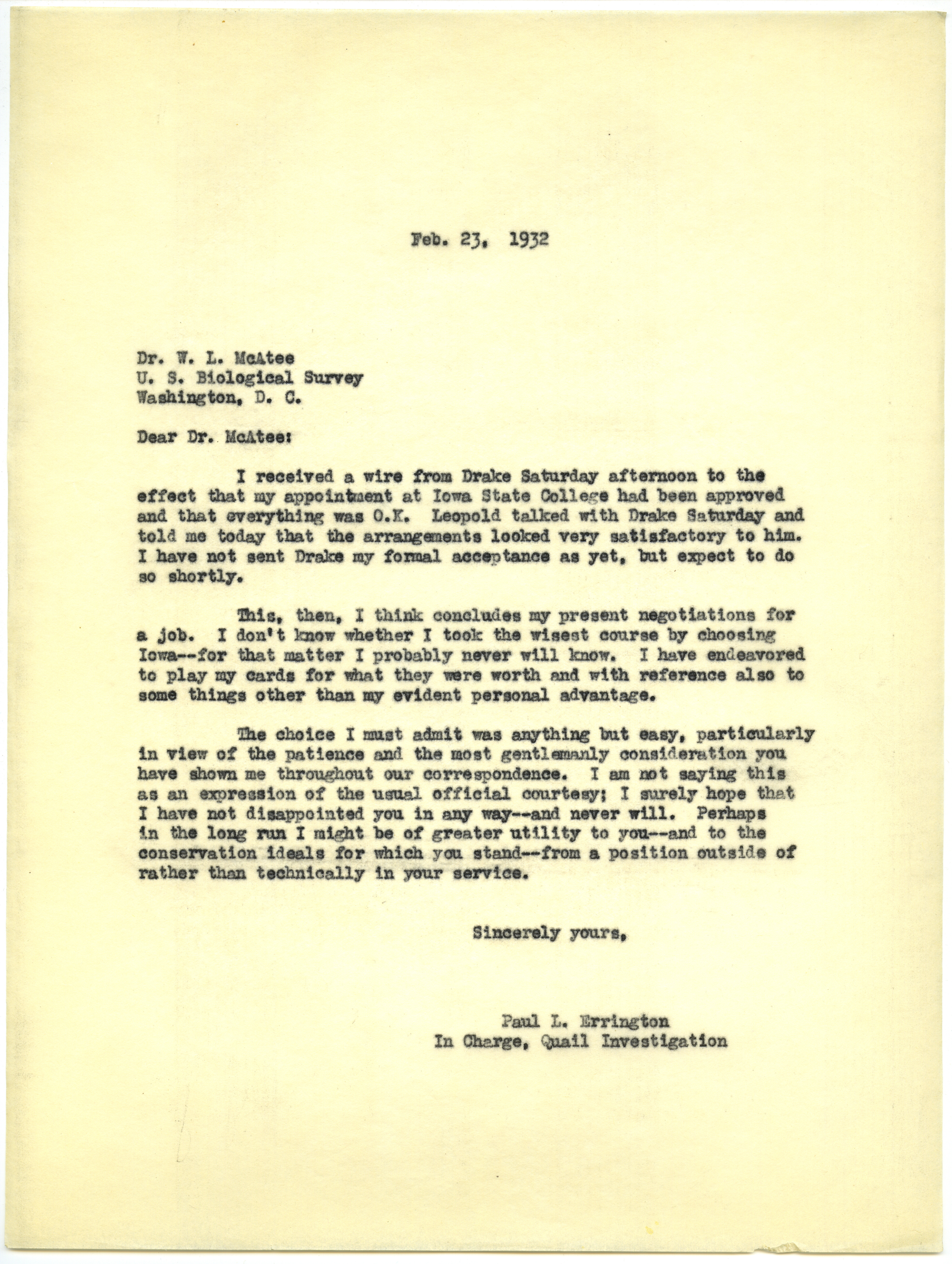 - "Paul L. Errington letter, February 23, 1932", Paul L. Errington Collection, Iowa State University Library Digital Collections