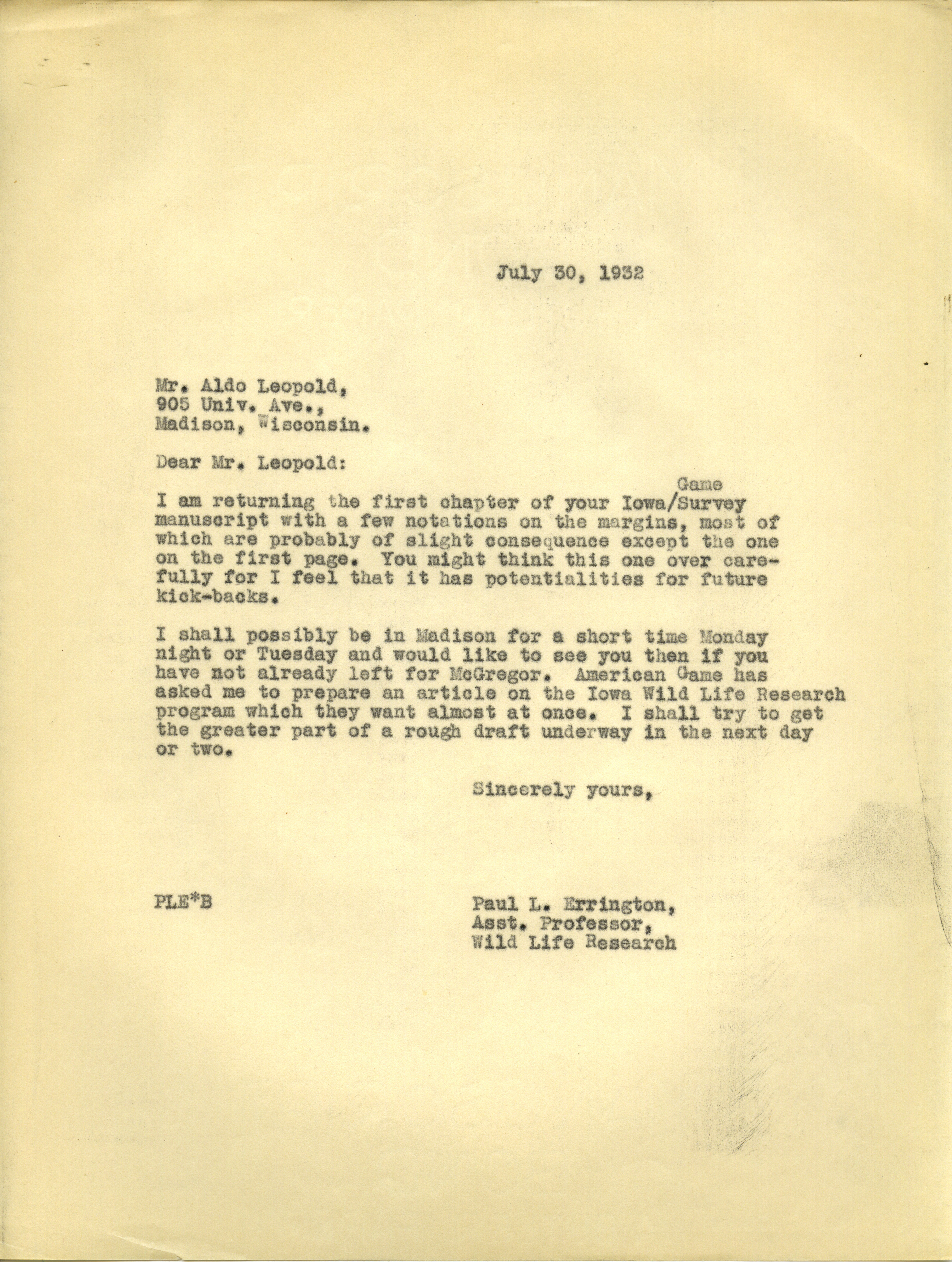 - "Paul L. Errington letter, July 30, 1932", Paul L. Errington Collection, Iowa State University Library Digital Collections