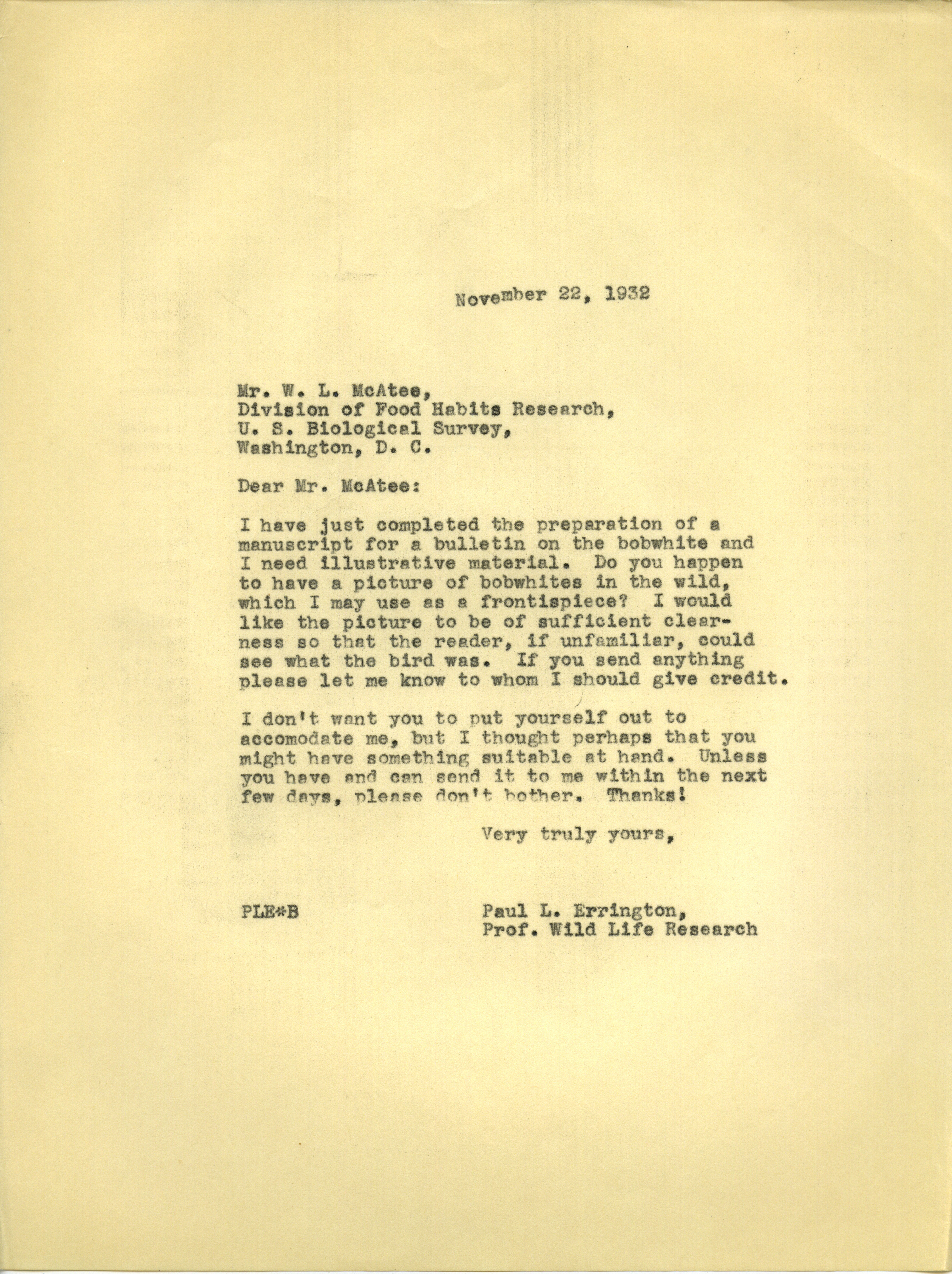 - "Paul L. Errington letter, November 22, 1932", Paul L. Errington Collection, Iowa State University Library Digital Collections