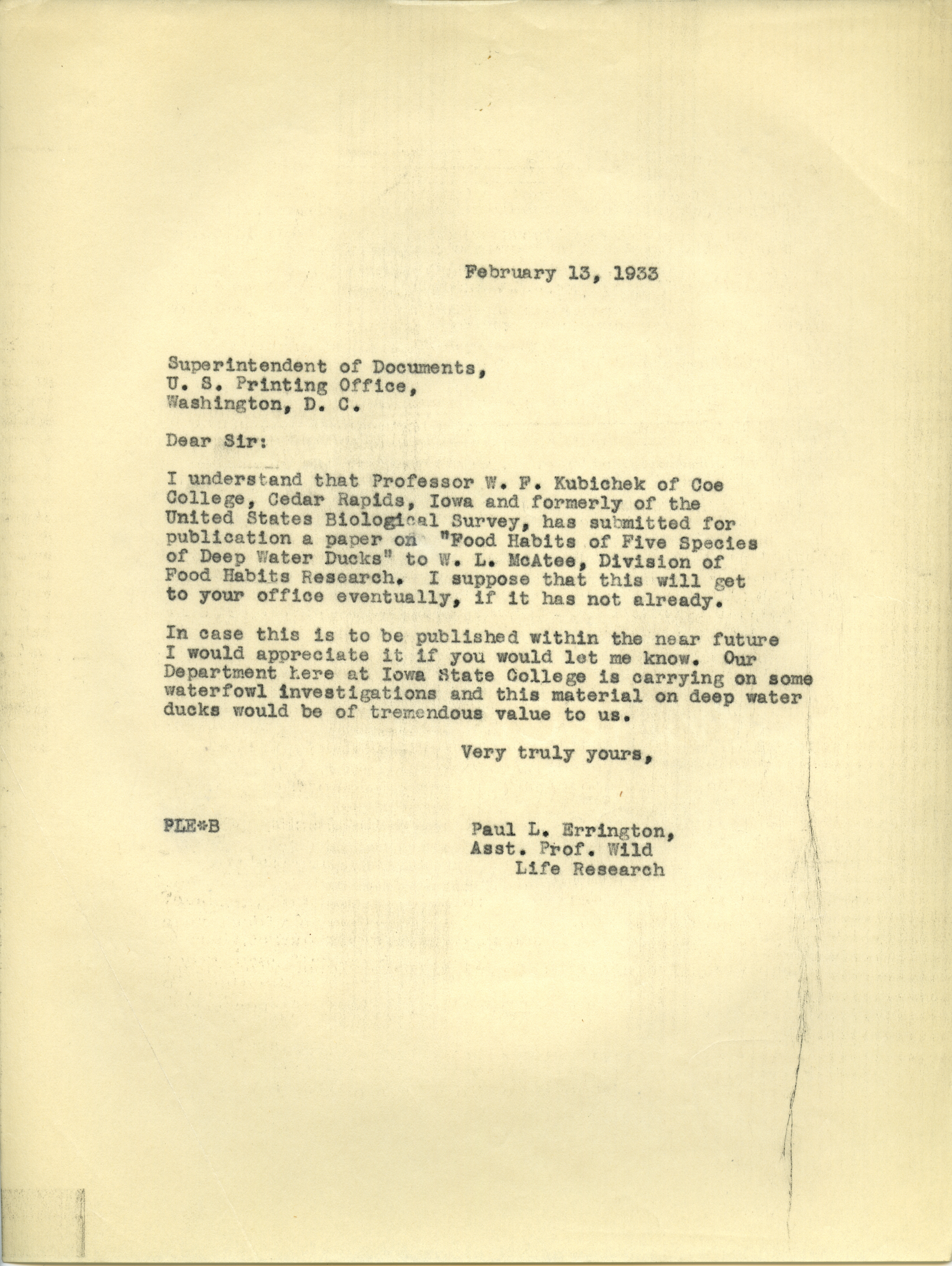 - Paul L. Errington letter, February 13, 1933