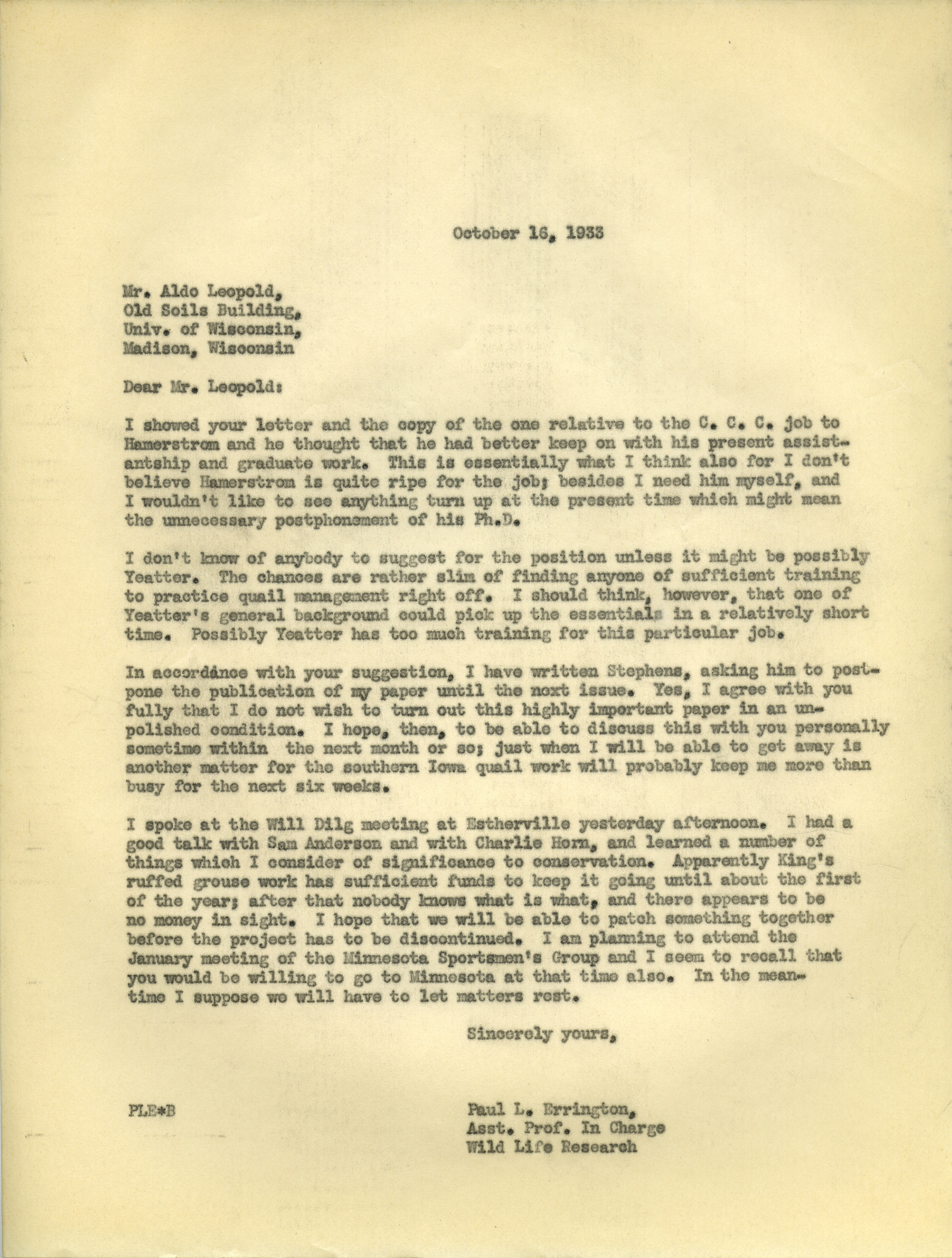 - Paul L. Errington letter, October 16, 1933