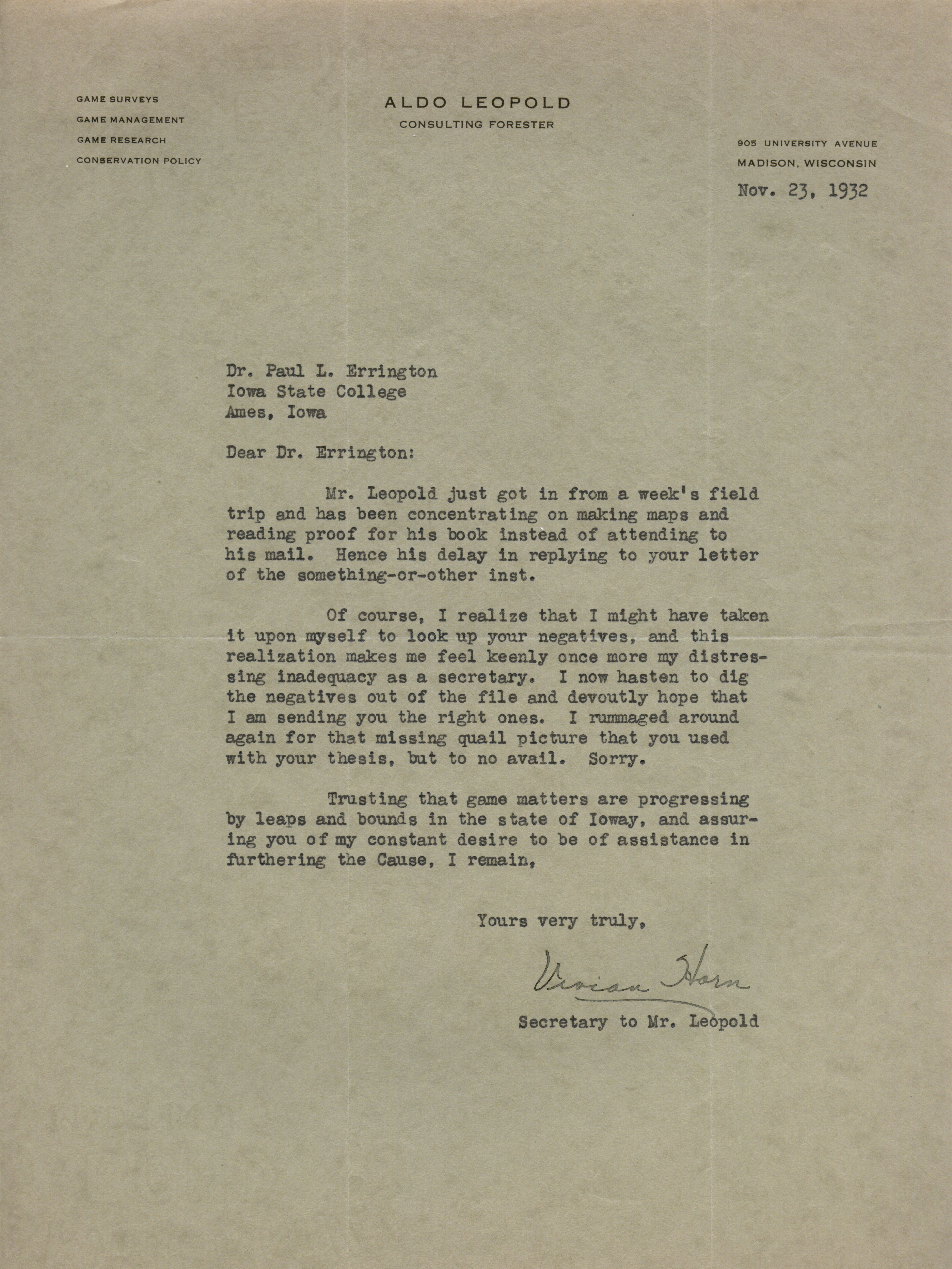 - "Aldo Leopold letter to Paul Errington, November 23, 1932", Paul L. Errington Collection, Iowa State University Library Digital Collections